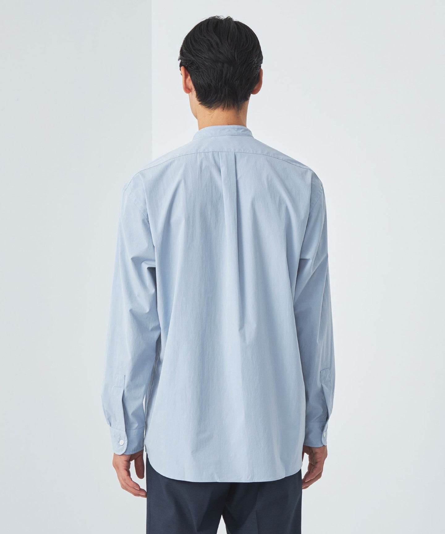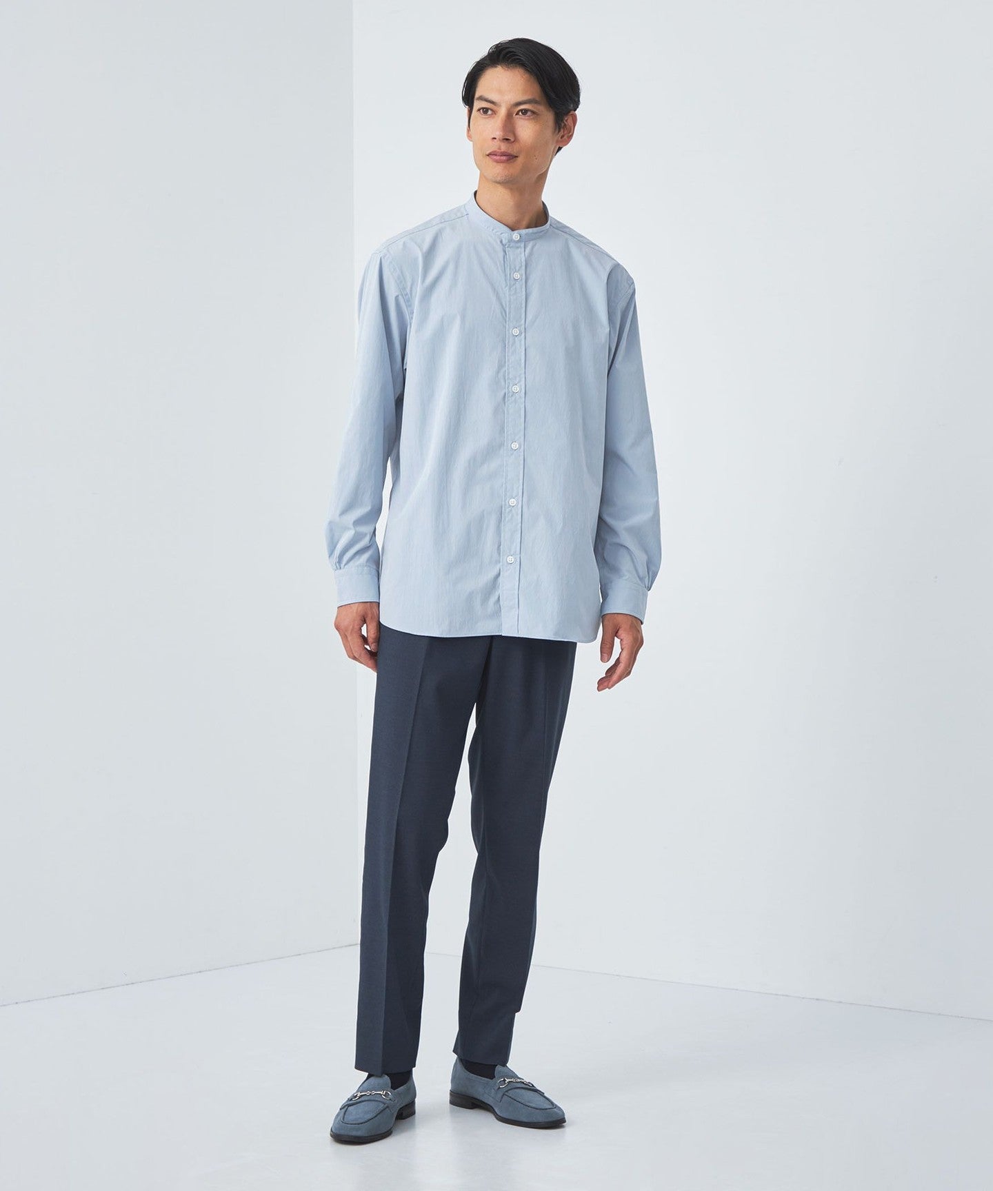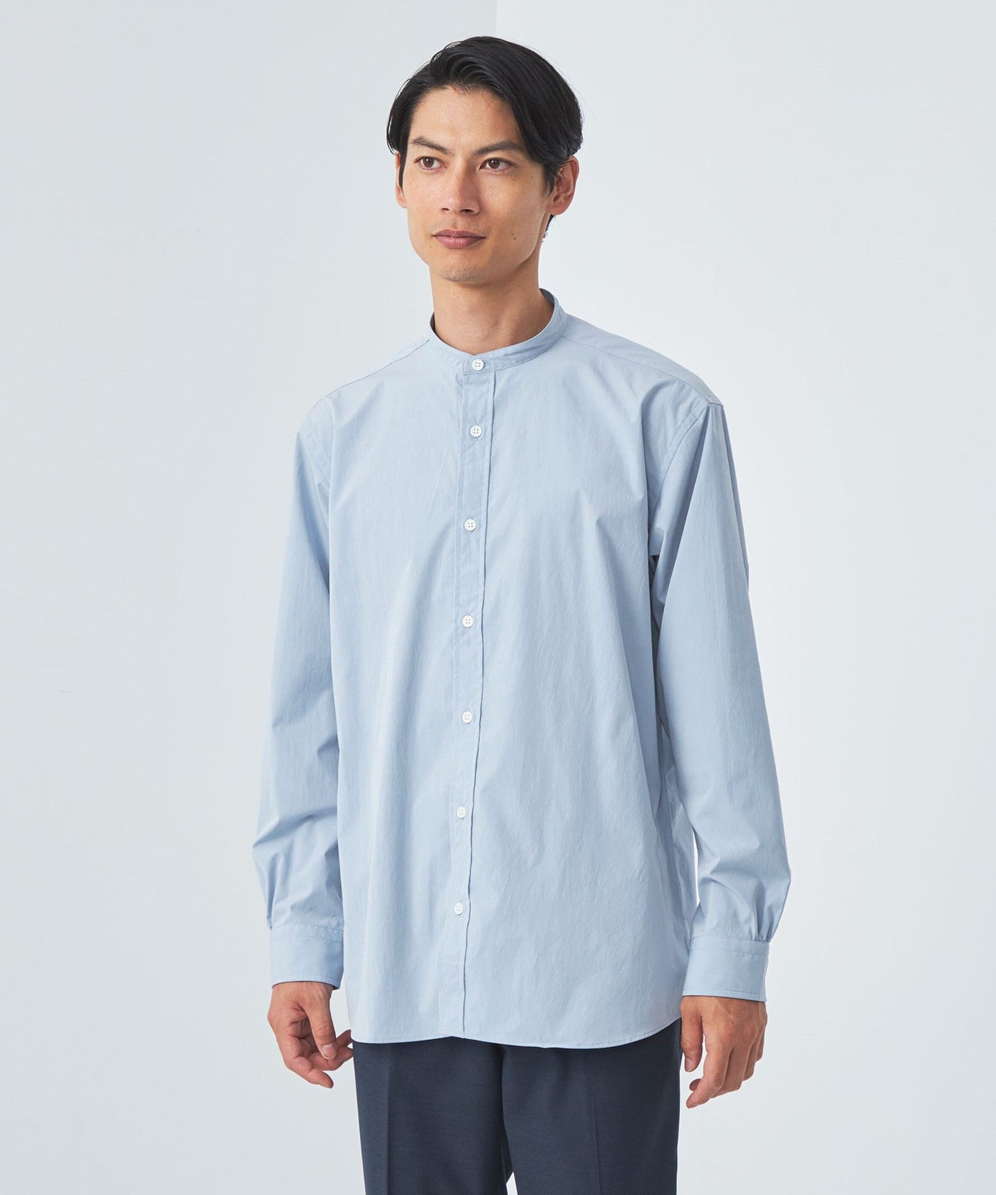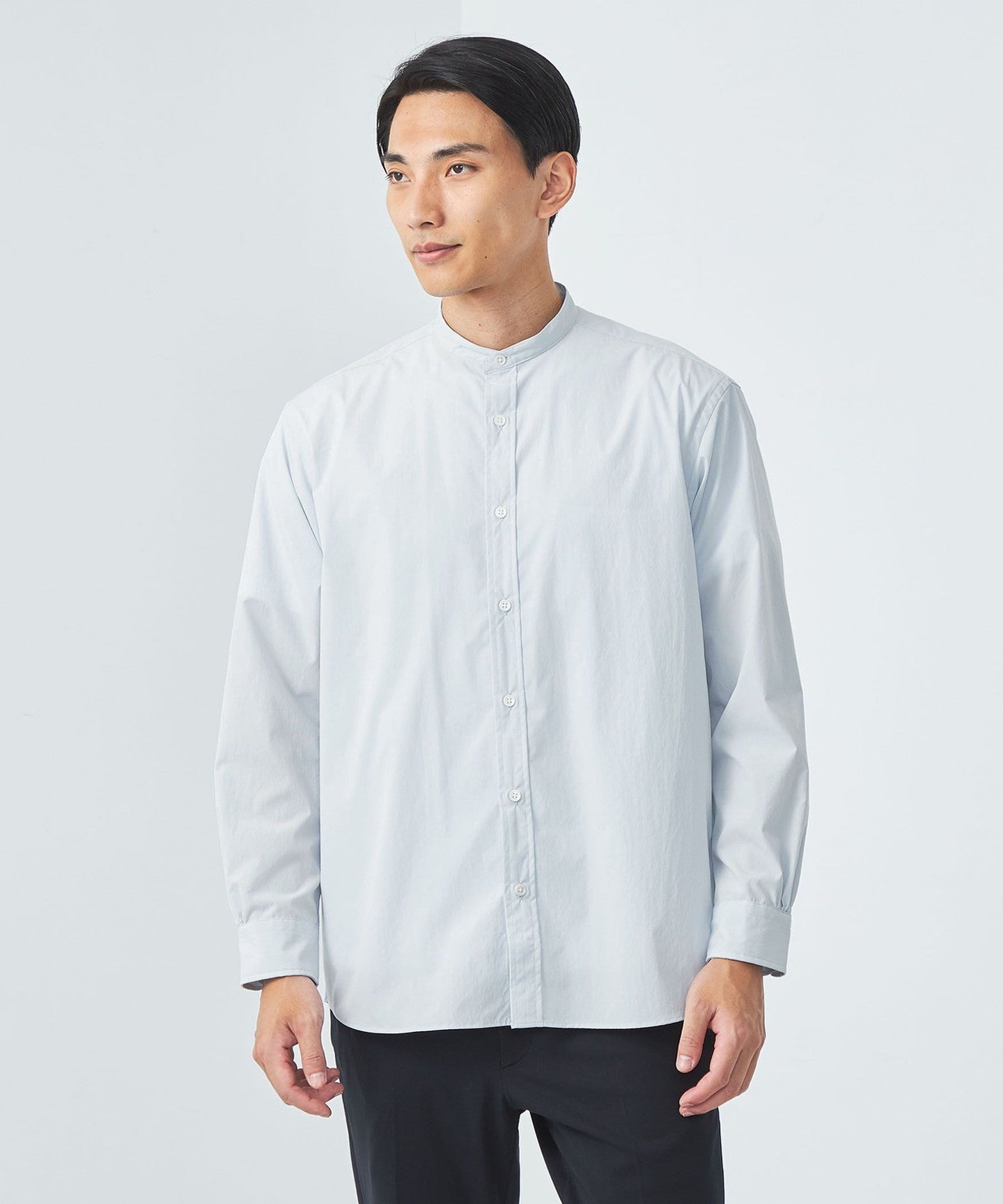 A functional band collar shirt that can be worn both on and off the job.