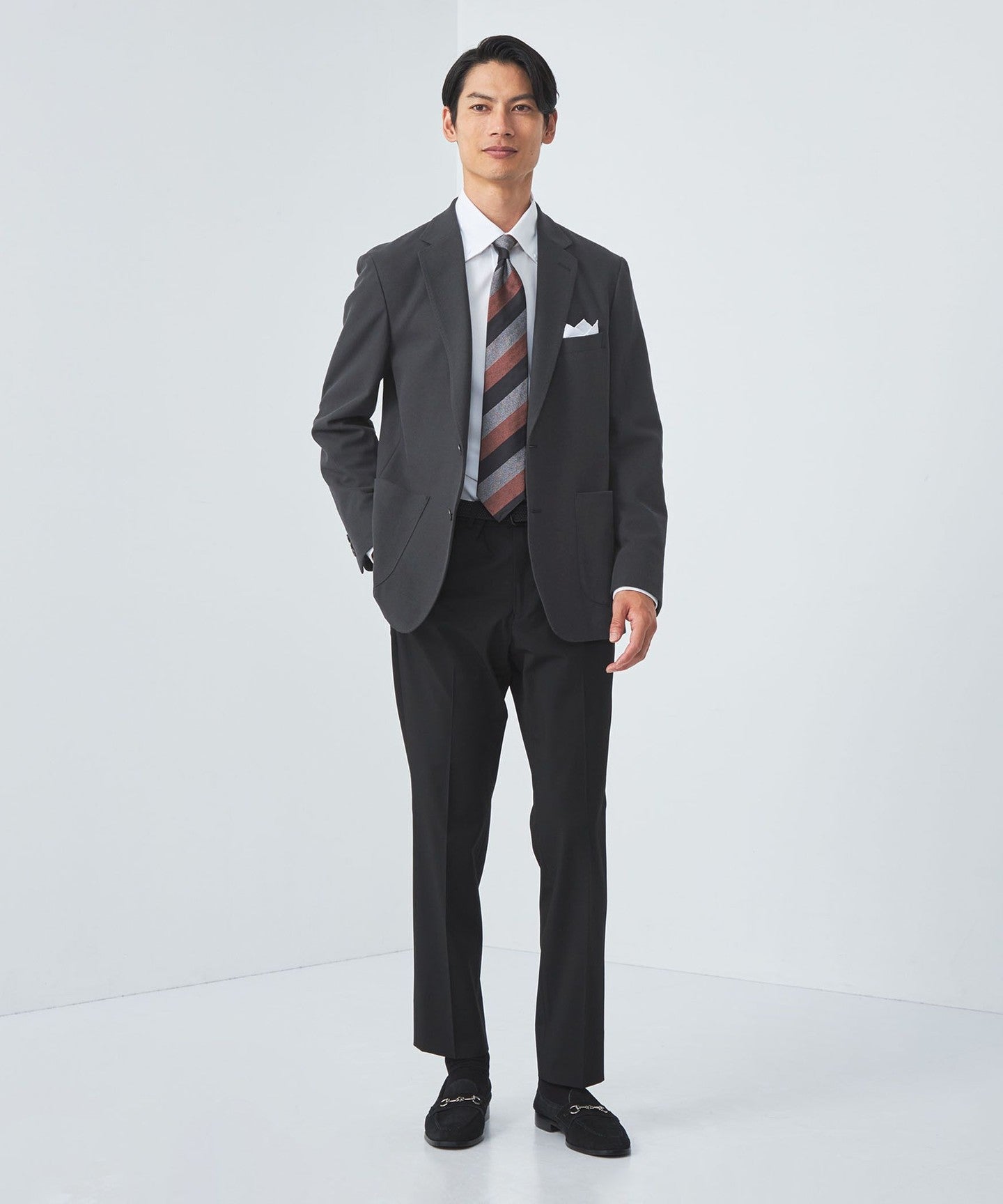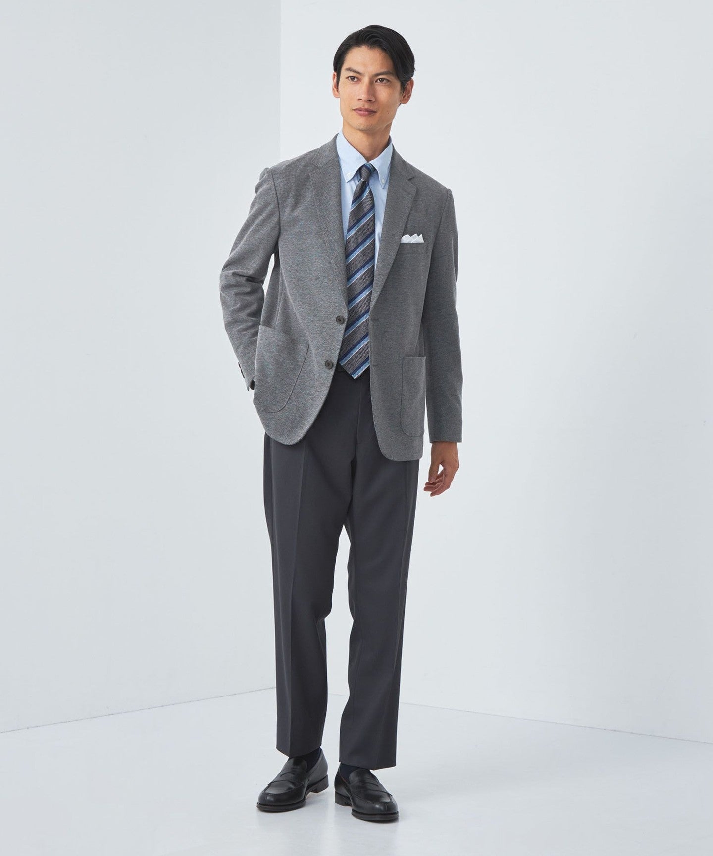It goes well with a variety of items, from ties to cut-and-sew tops and knitwear.