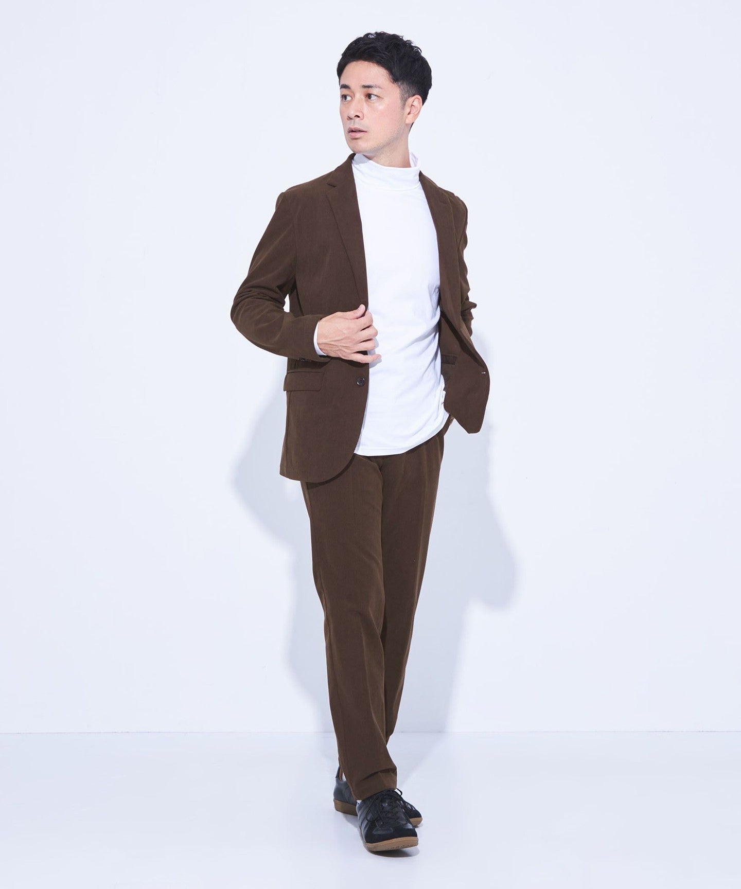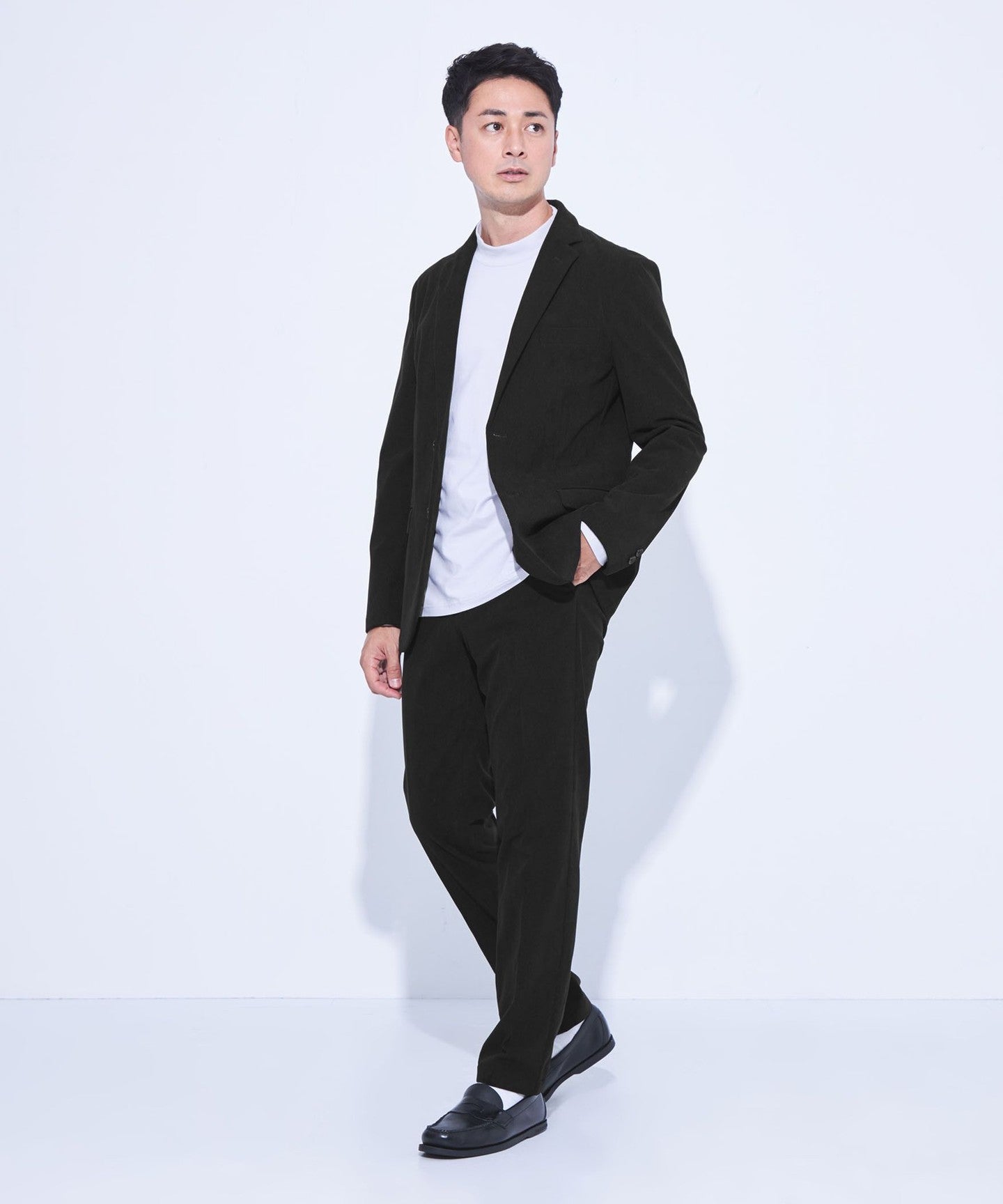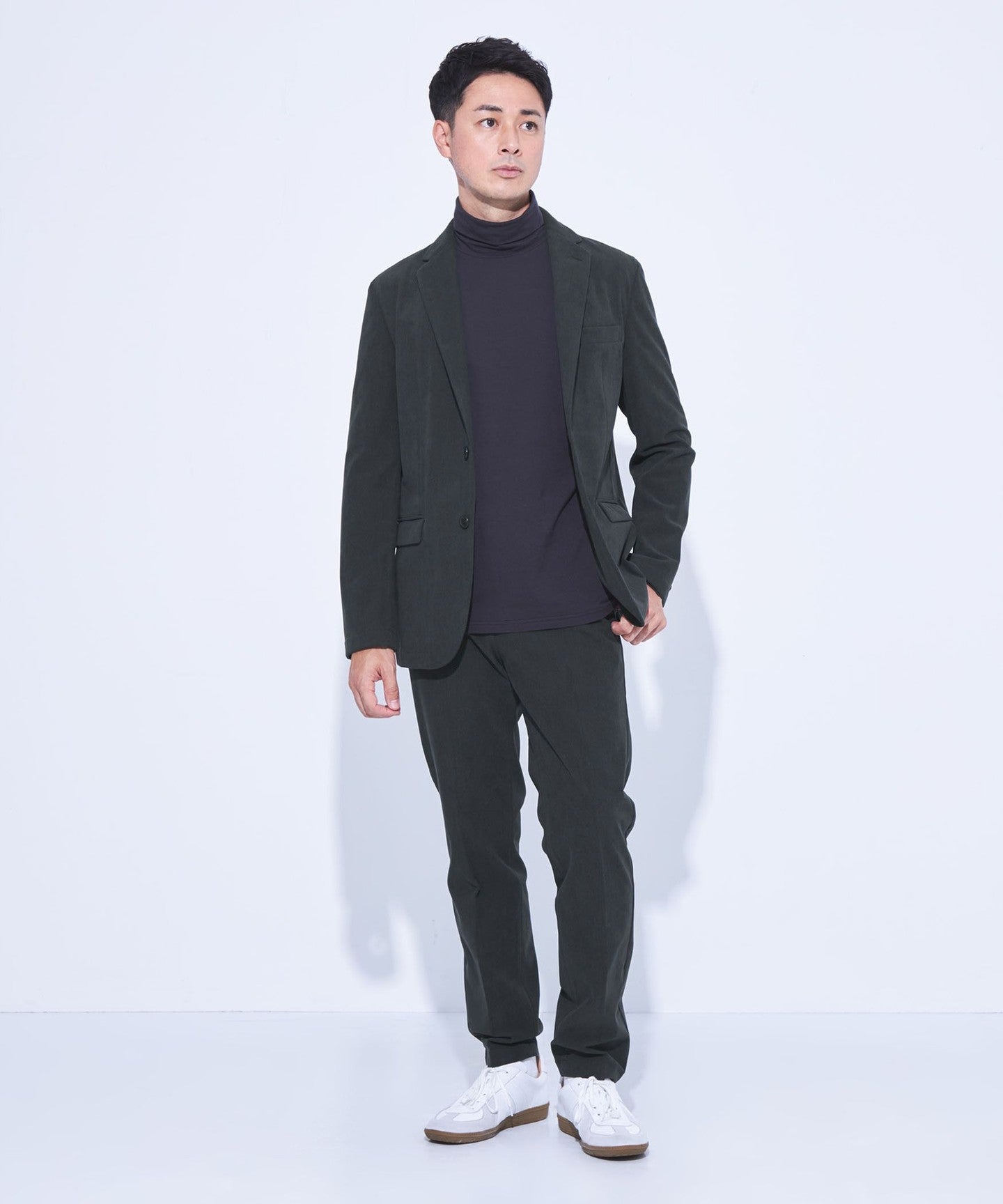 Both the top and bottom have a slim silhouette, making them versatile for a wide range of occasions, from casual wear to dressy casual.