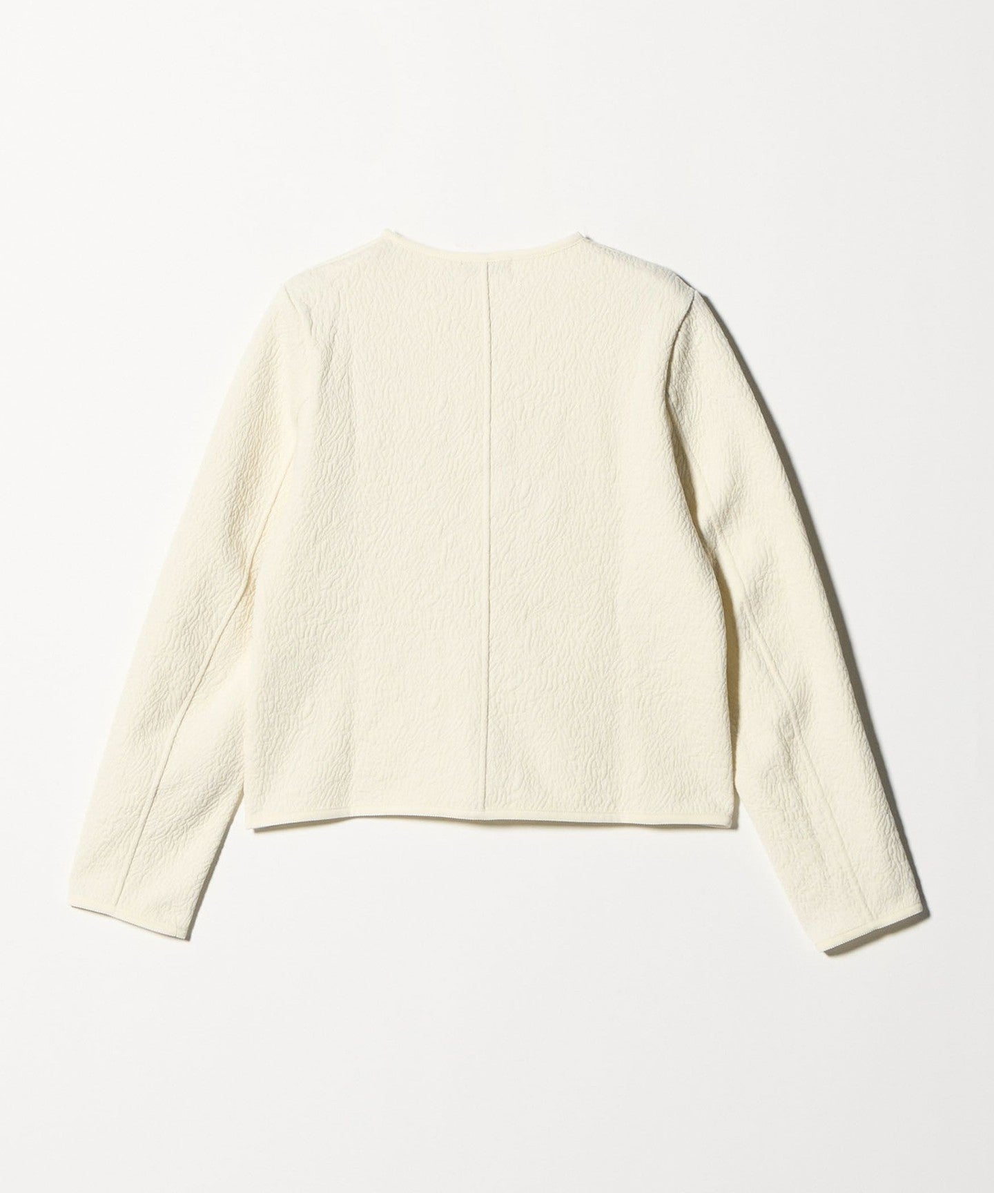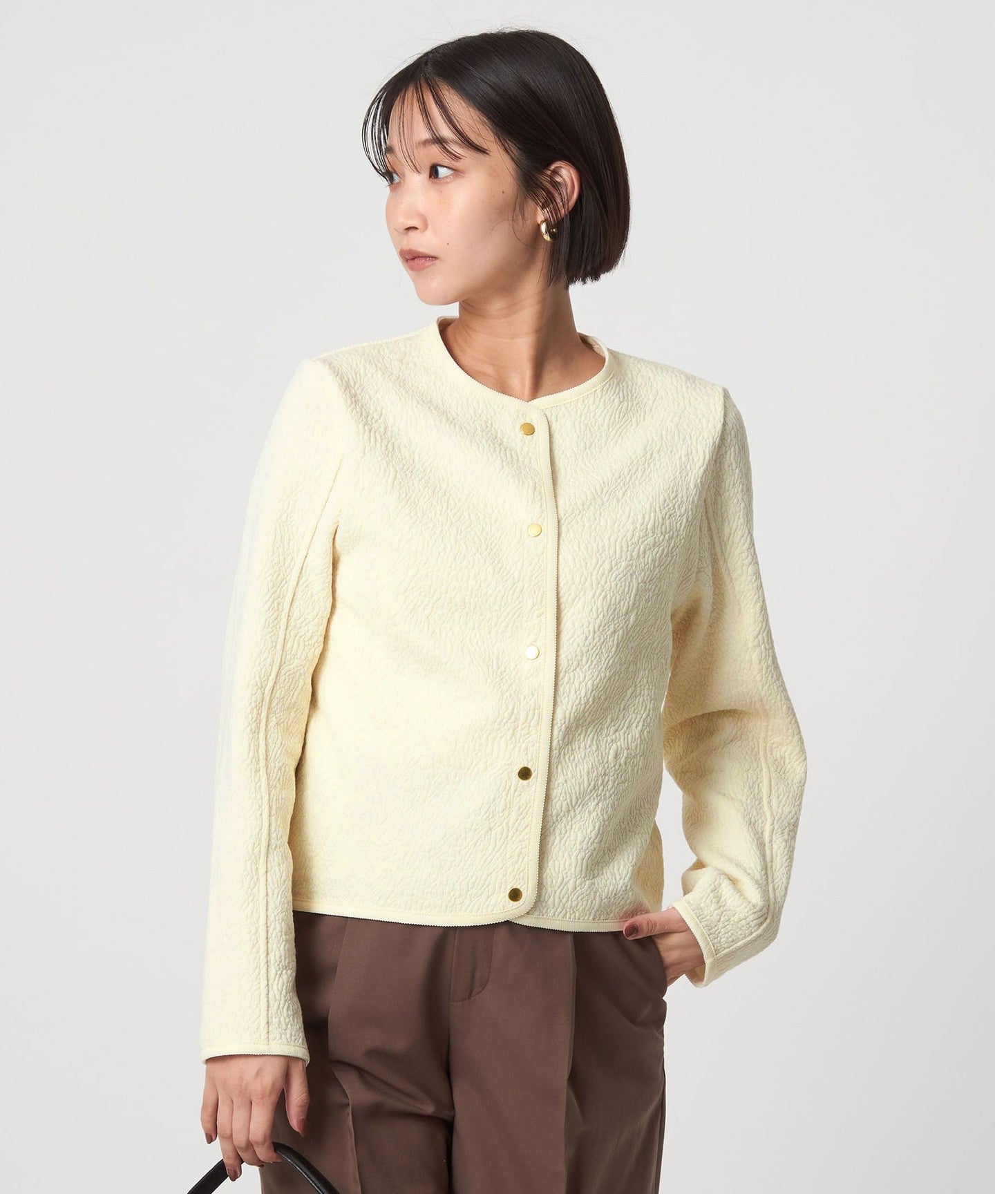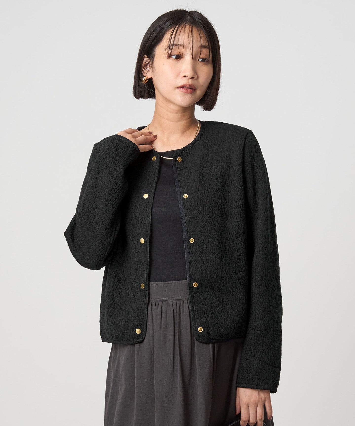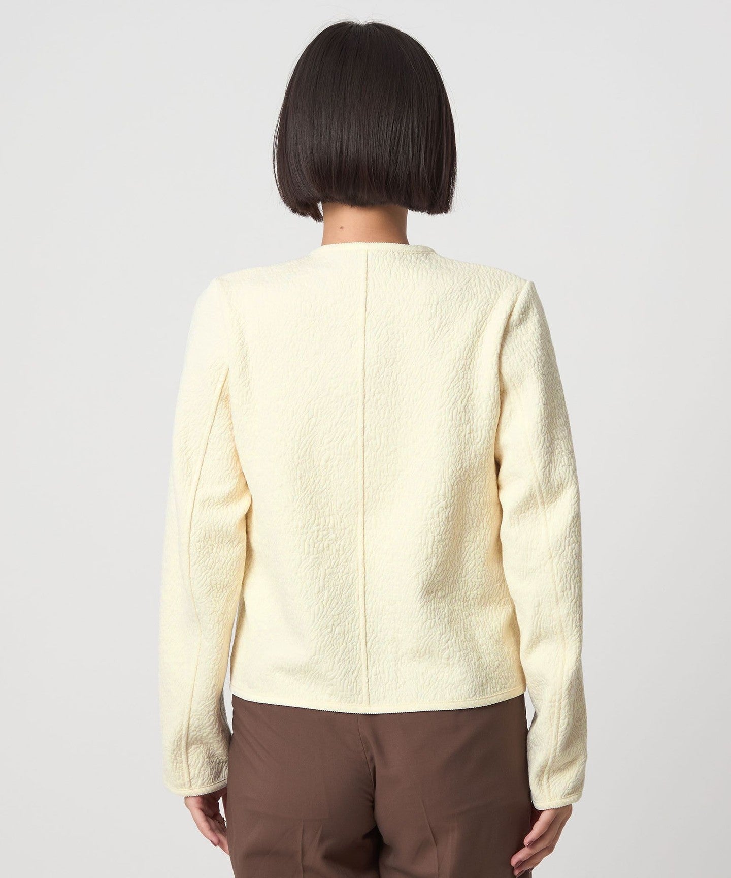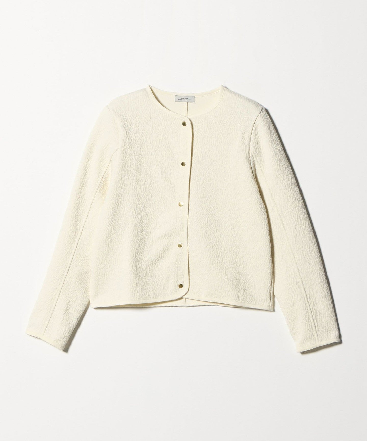 Ein Jacquard-Cut-and-Sew-Cardigan, der lässig wie eine Jacke getragen werden kann.