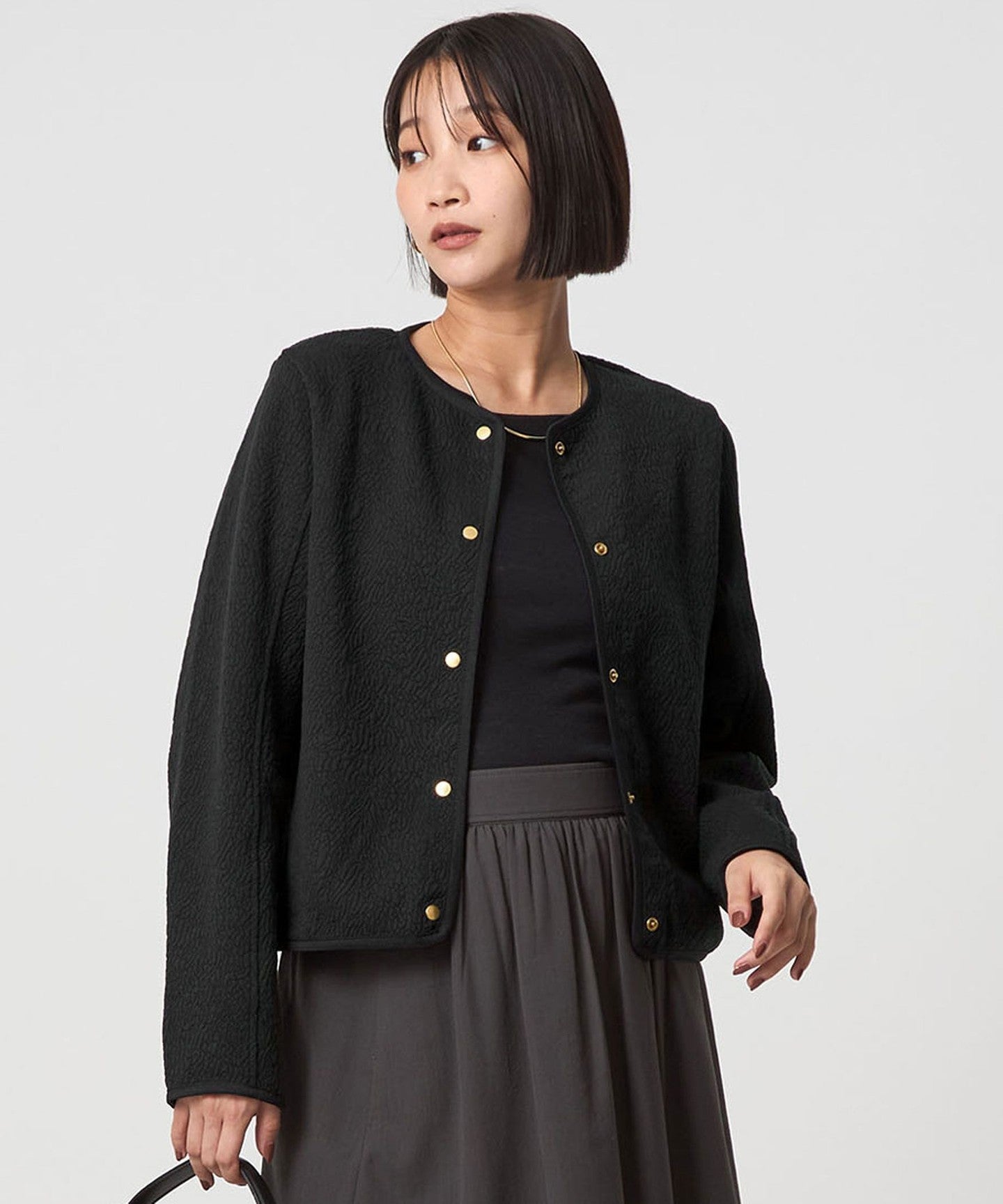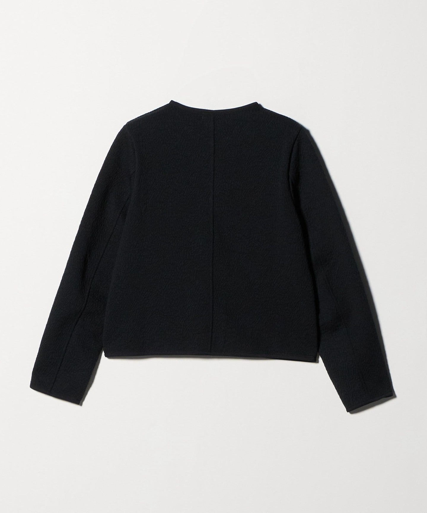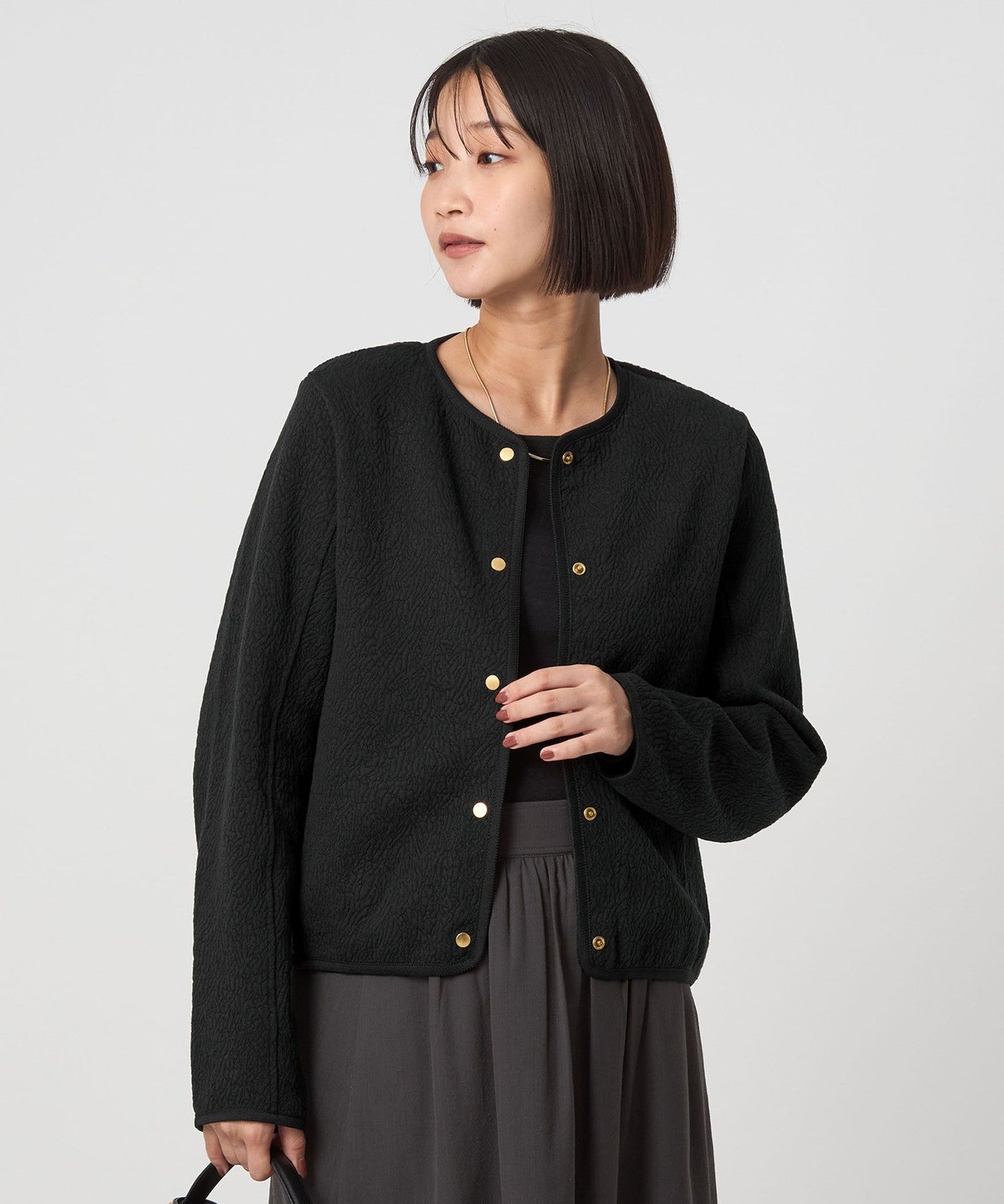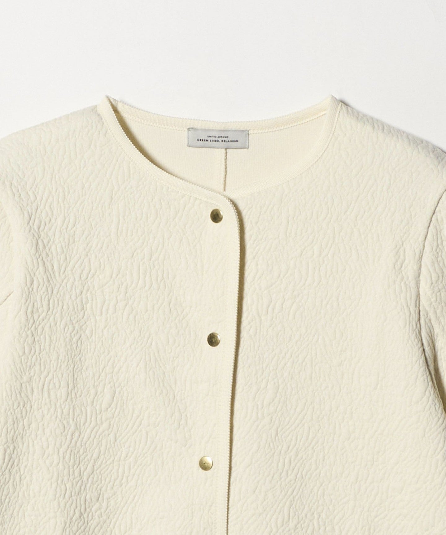 Ein Jacquard-Cut-and-Sew-Cardigan, der lässig wie eine Jacke getragen werden kann.