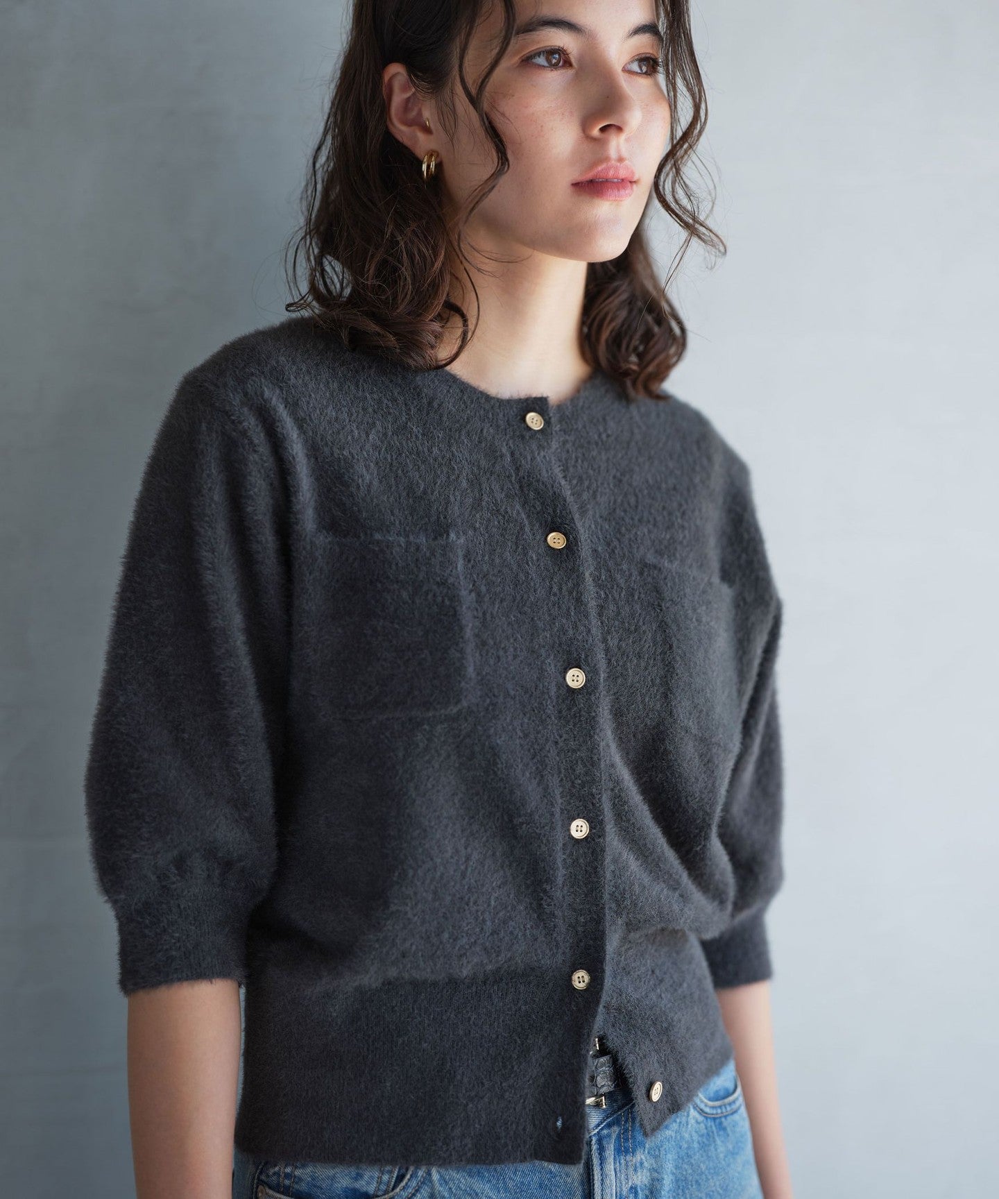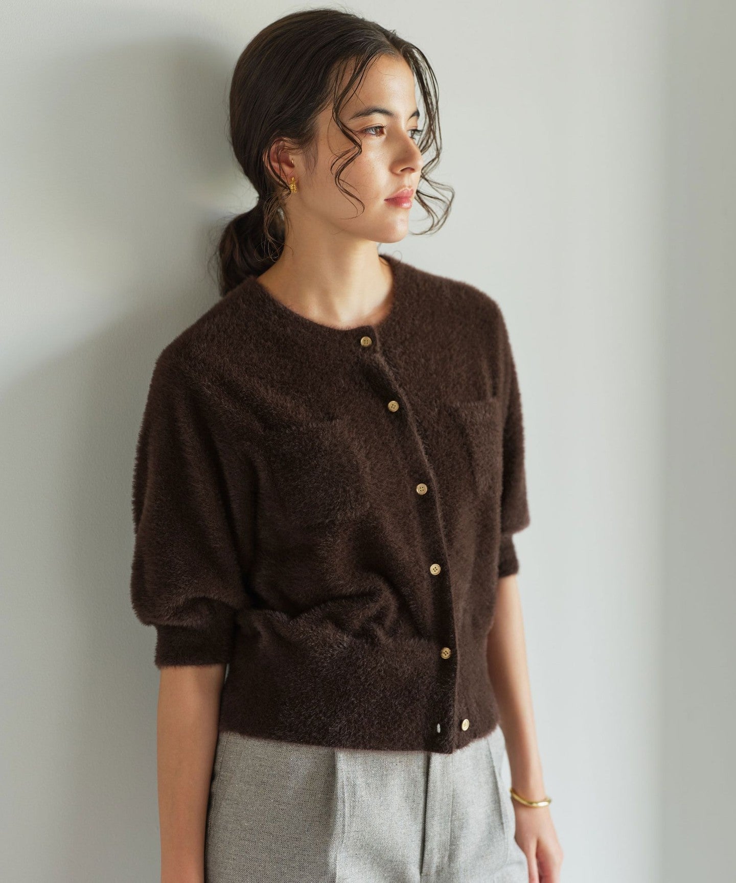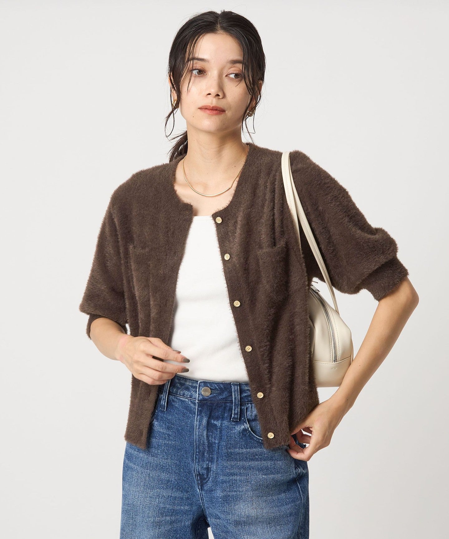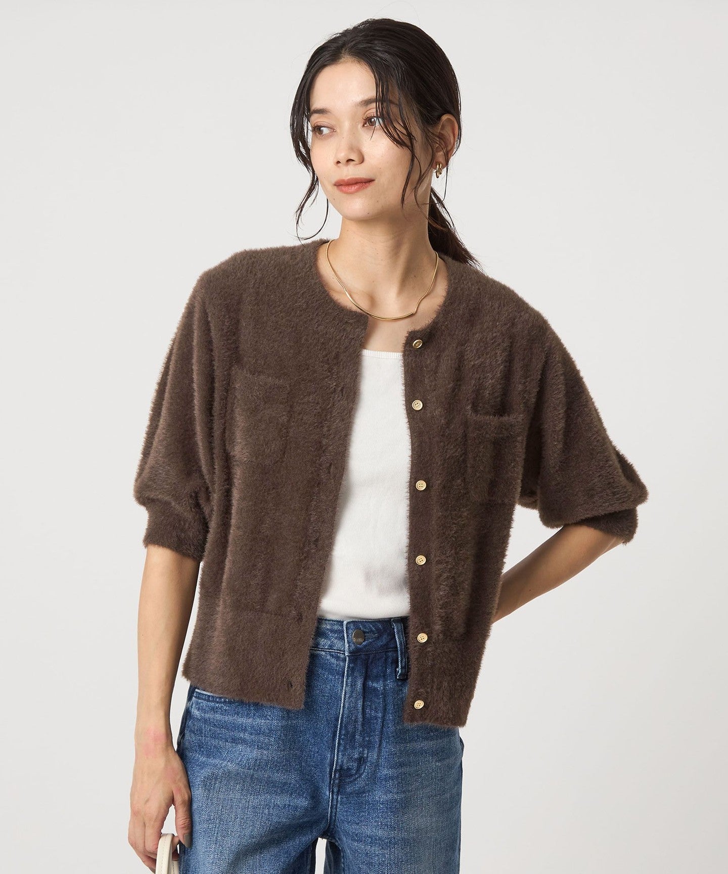 A short-sleeve knit cardigan made of soft, fuzzy material for a mature, feminine look.