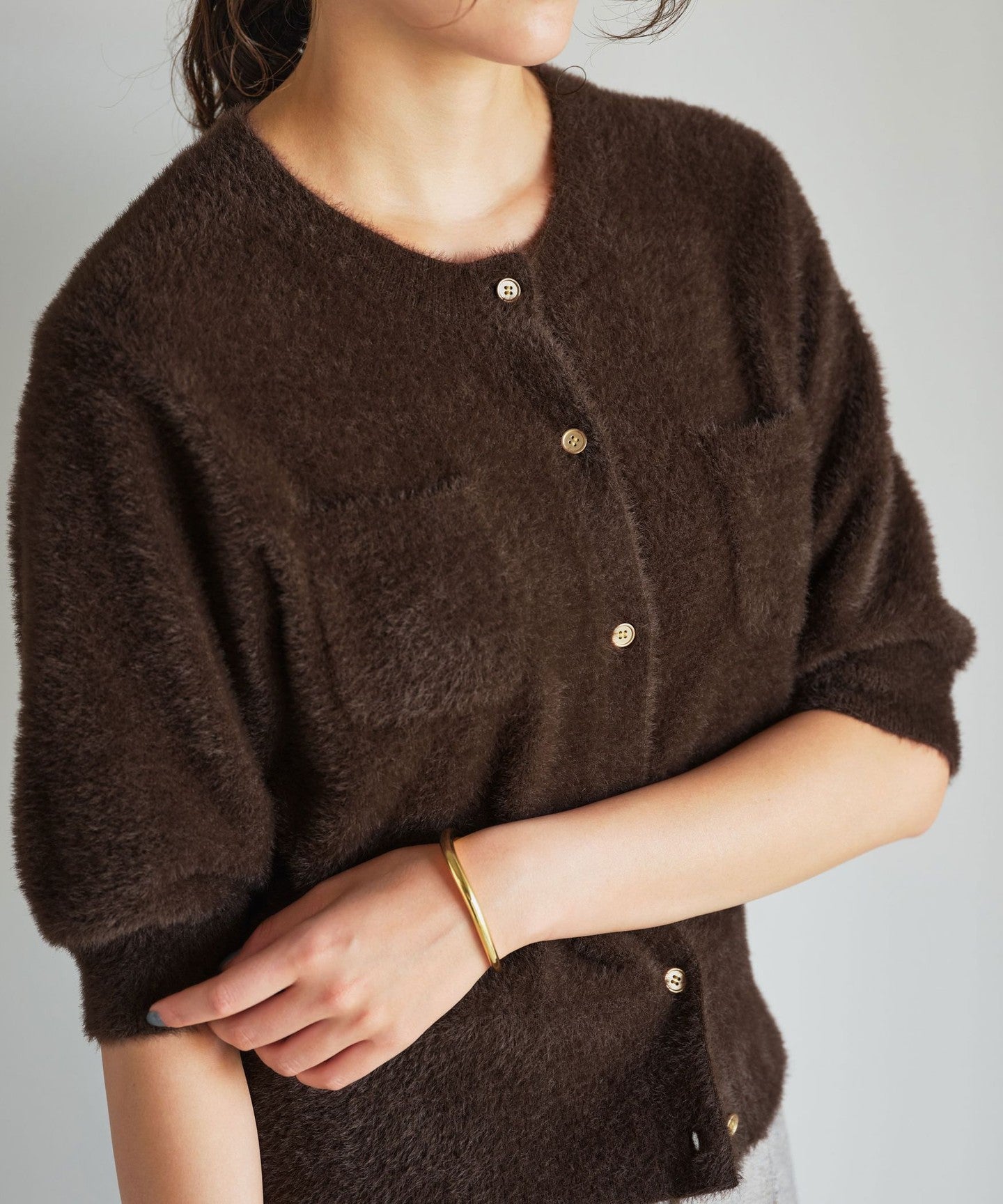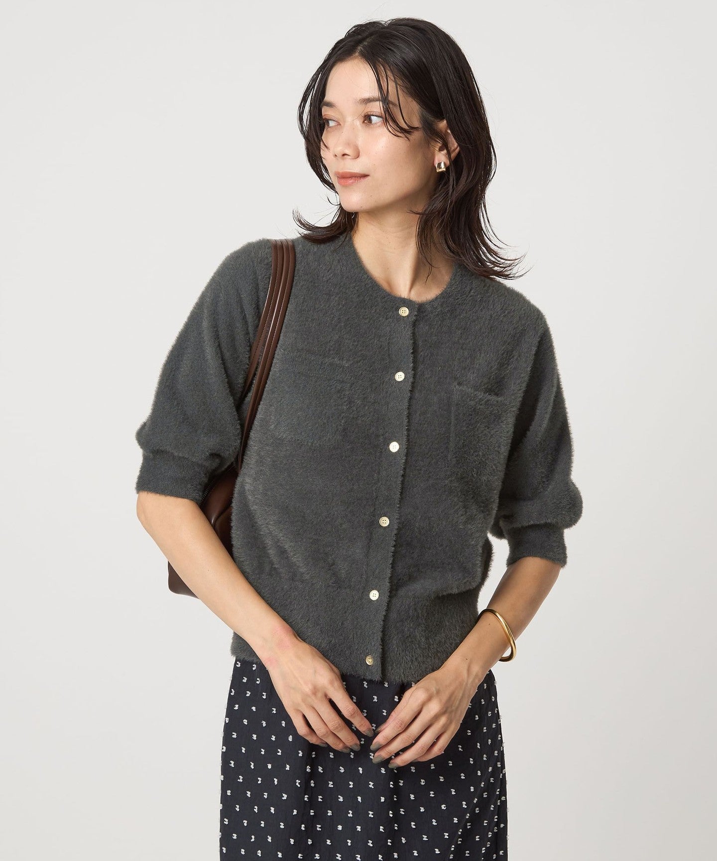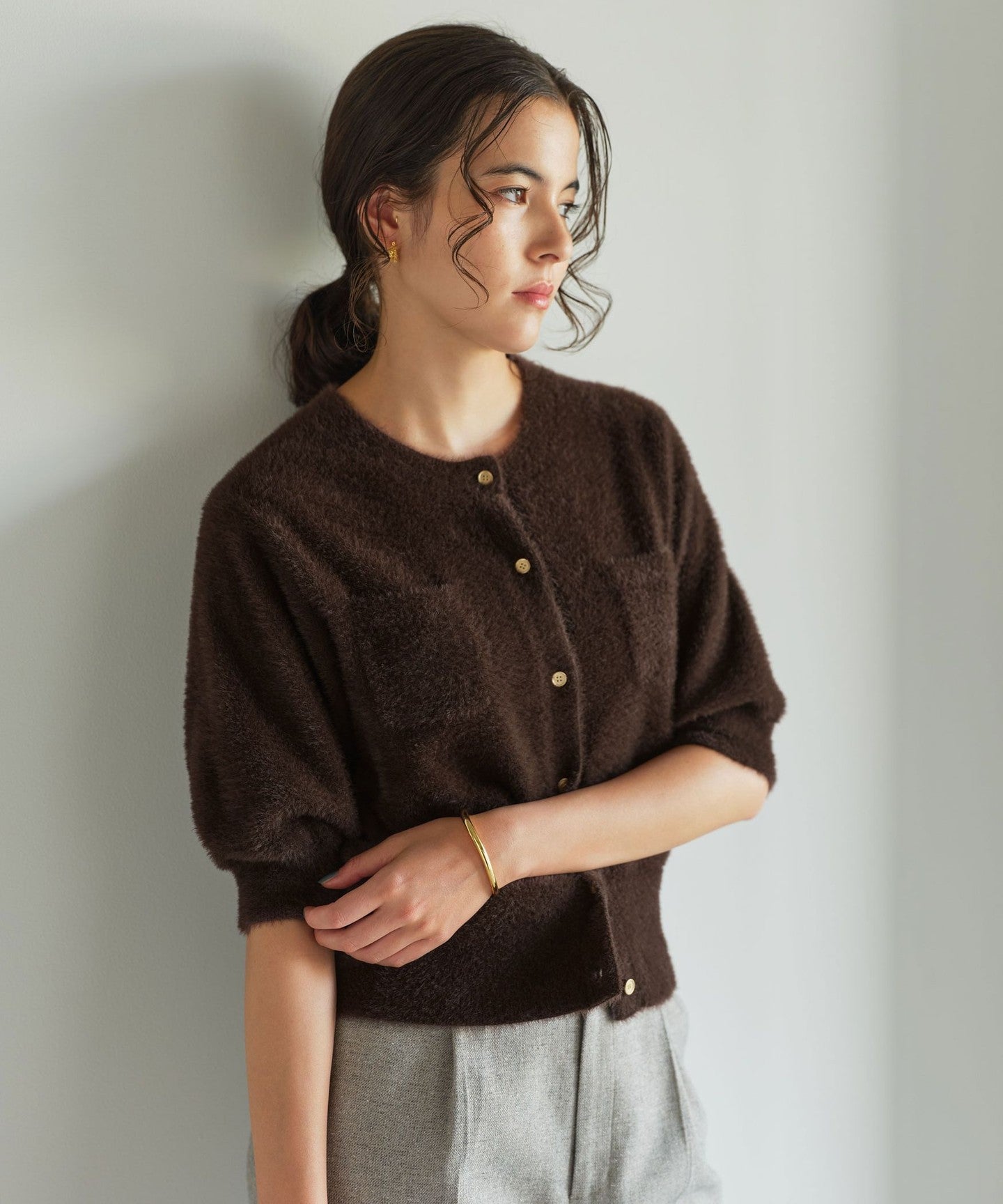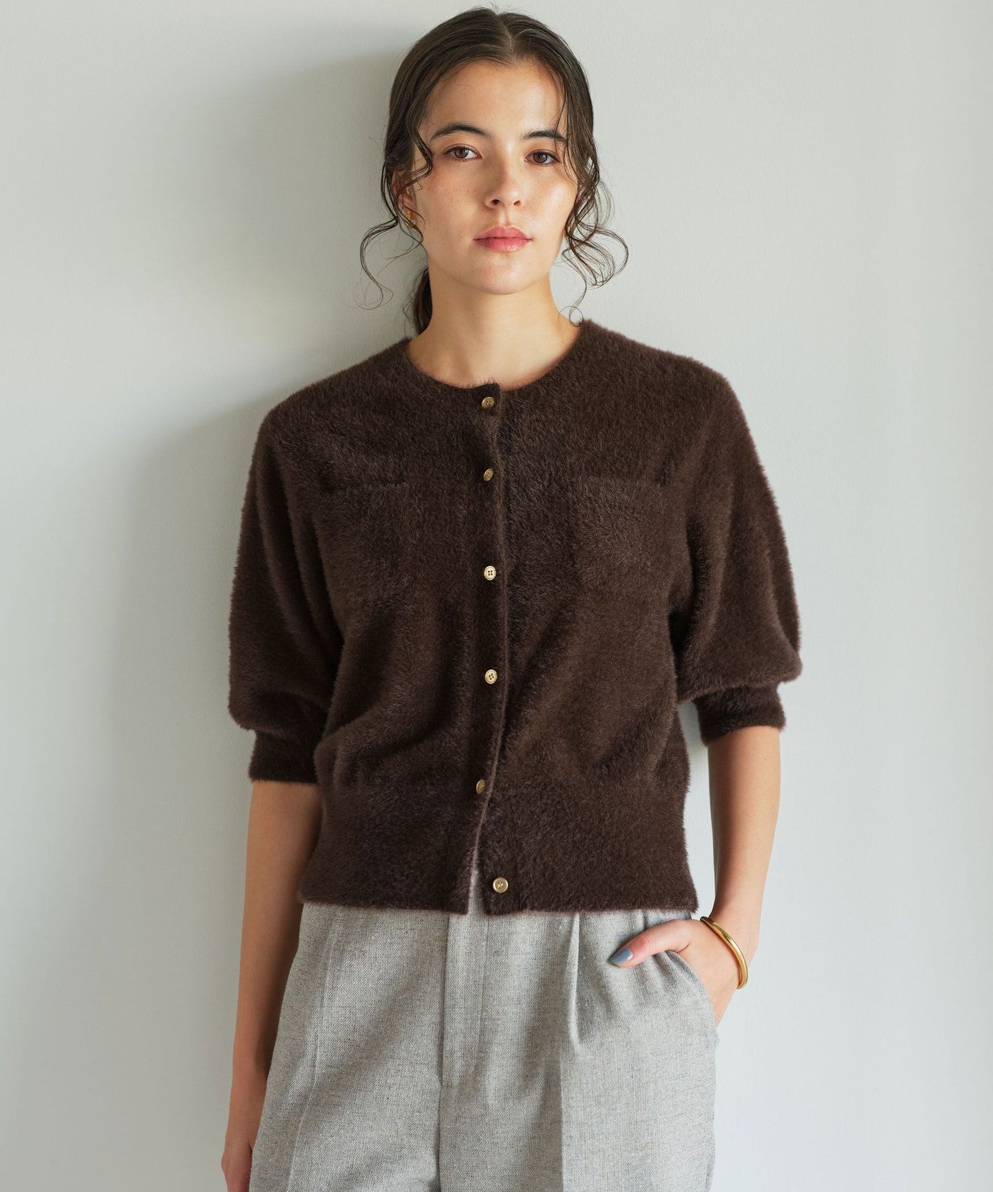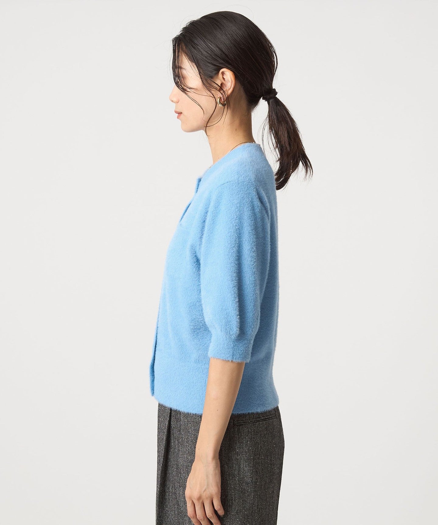 A short-sleeve knit cardigan made of soft, fuzzy material for a mature, feminine look.