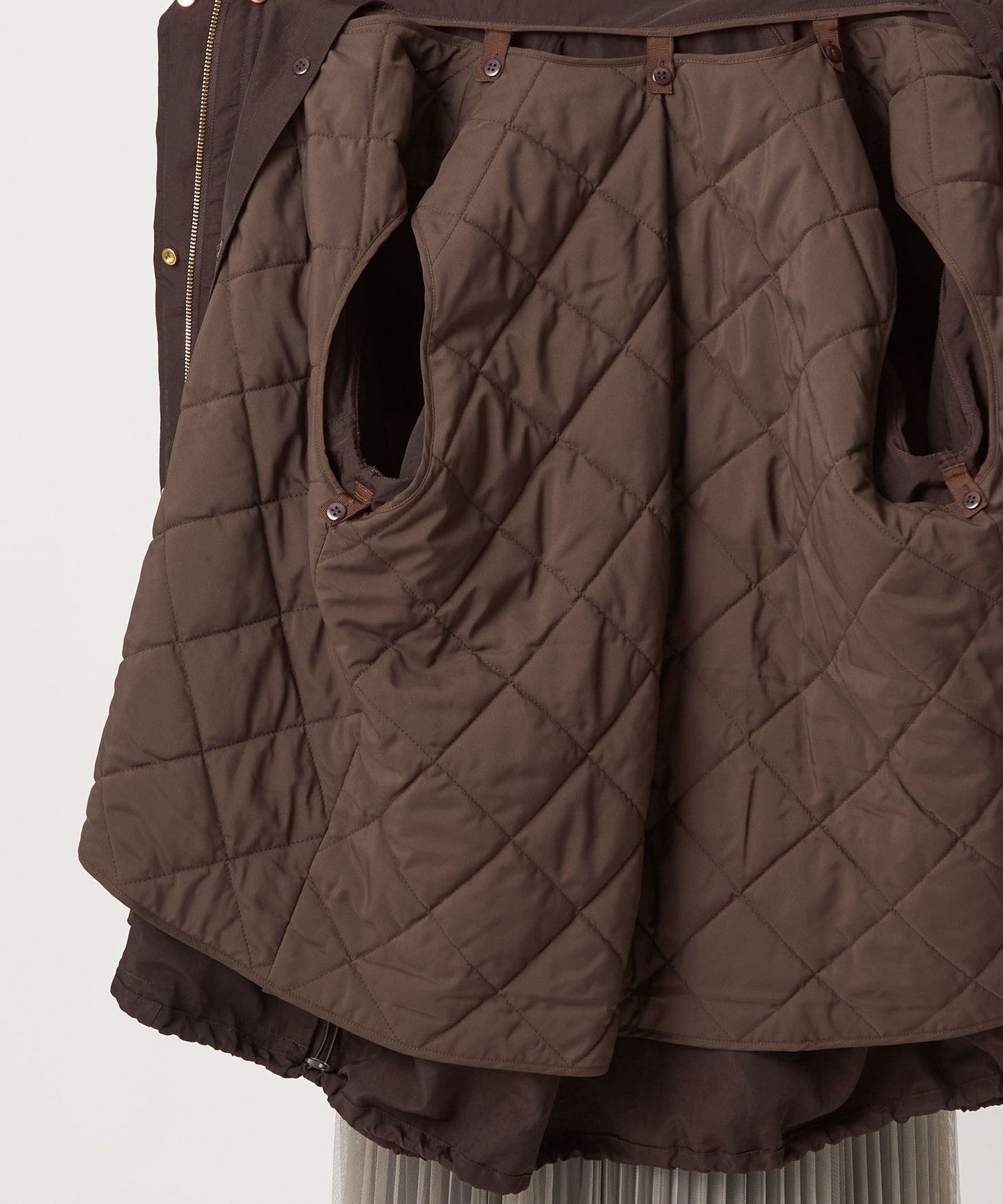 Die gepunkteten Knöpfe, Reißverschlüsse und Stopper sind goldfarben und verleihen ihm einen femininen Look.