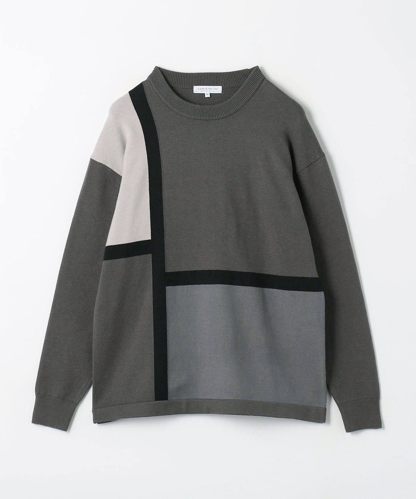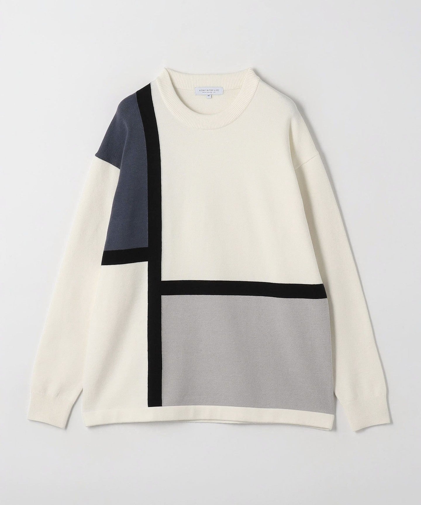 A knit pullover with an asymmetrical color block design for a modern look.