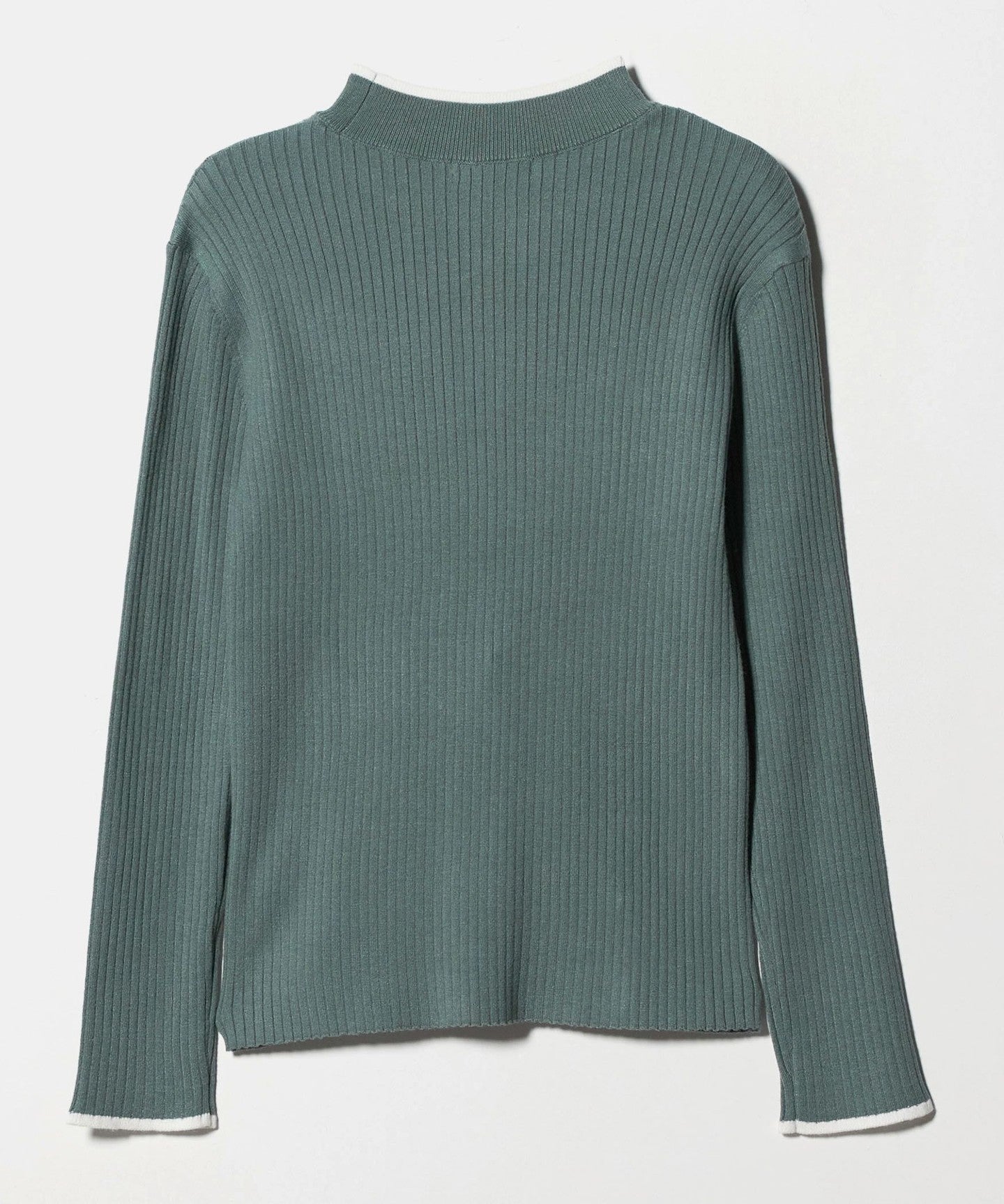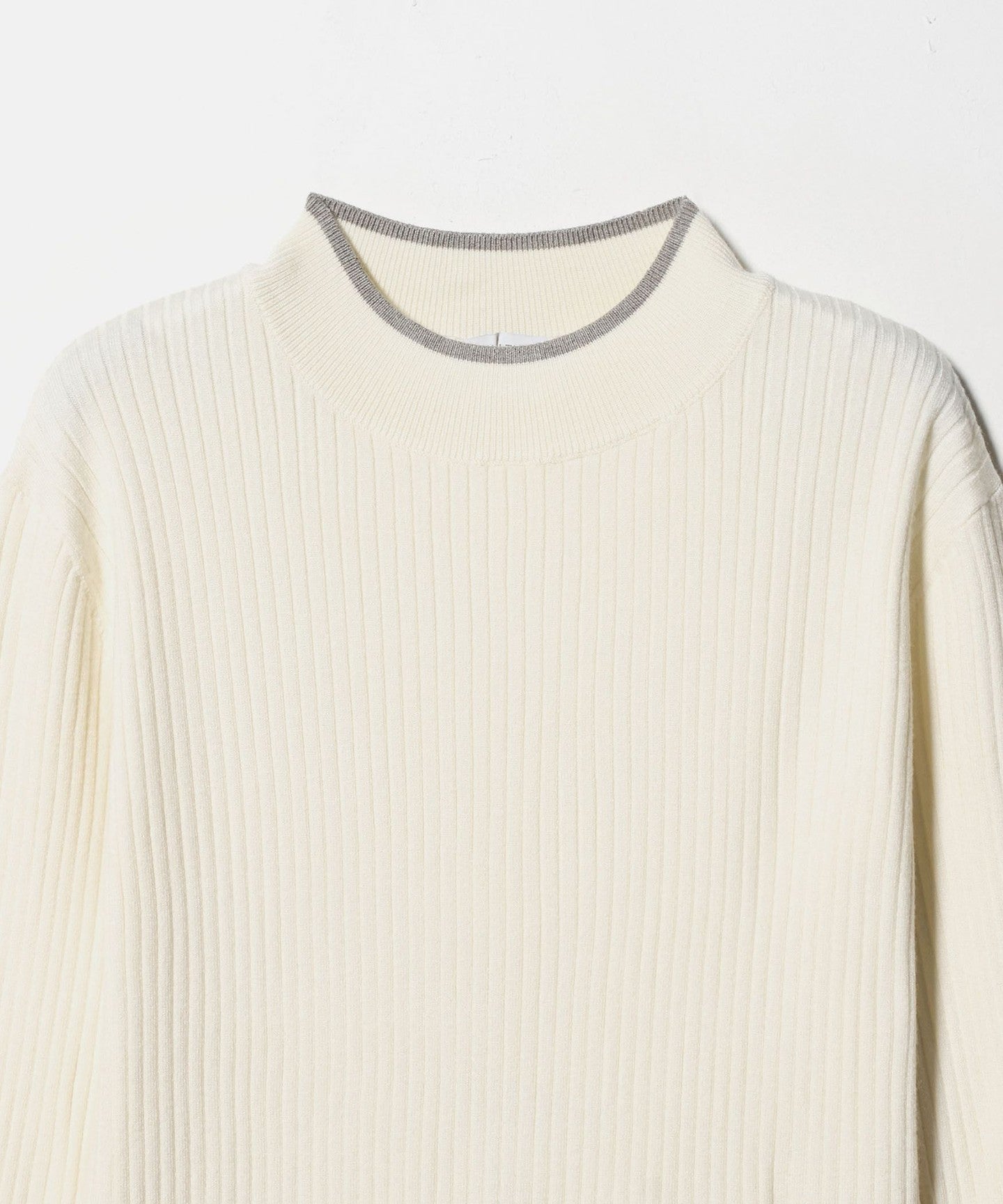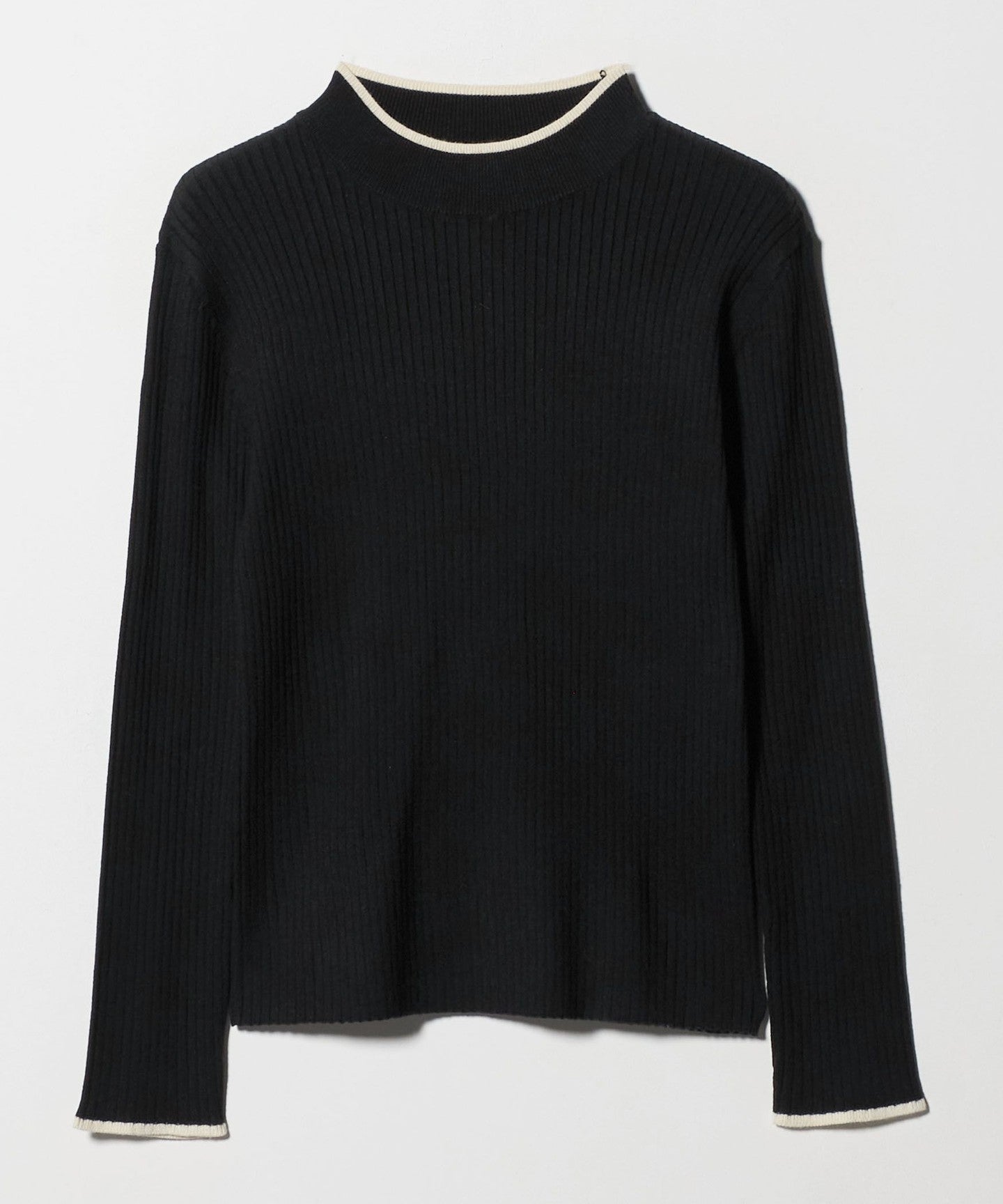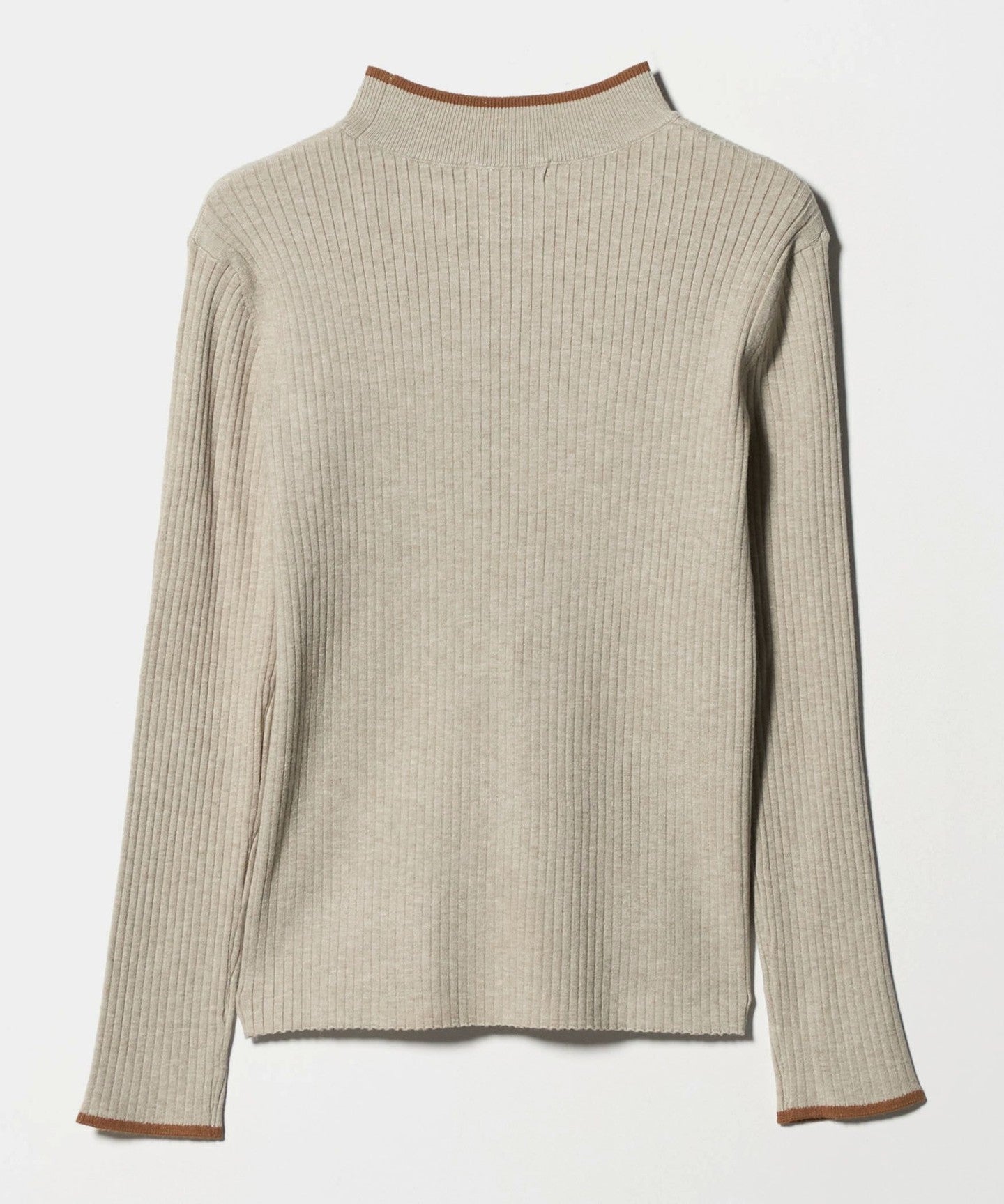 Ein hochgeschlossener Strickpullover mit kontrastierenden Farblinien an Kragen und Bündchen.