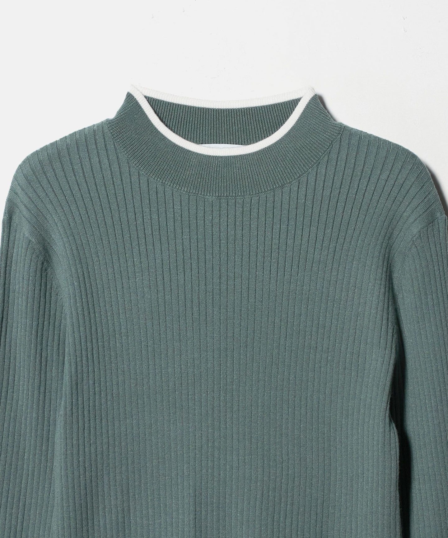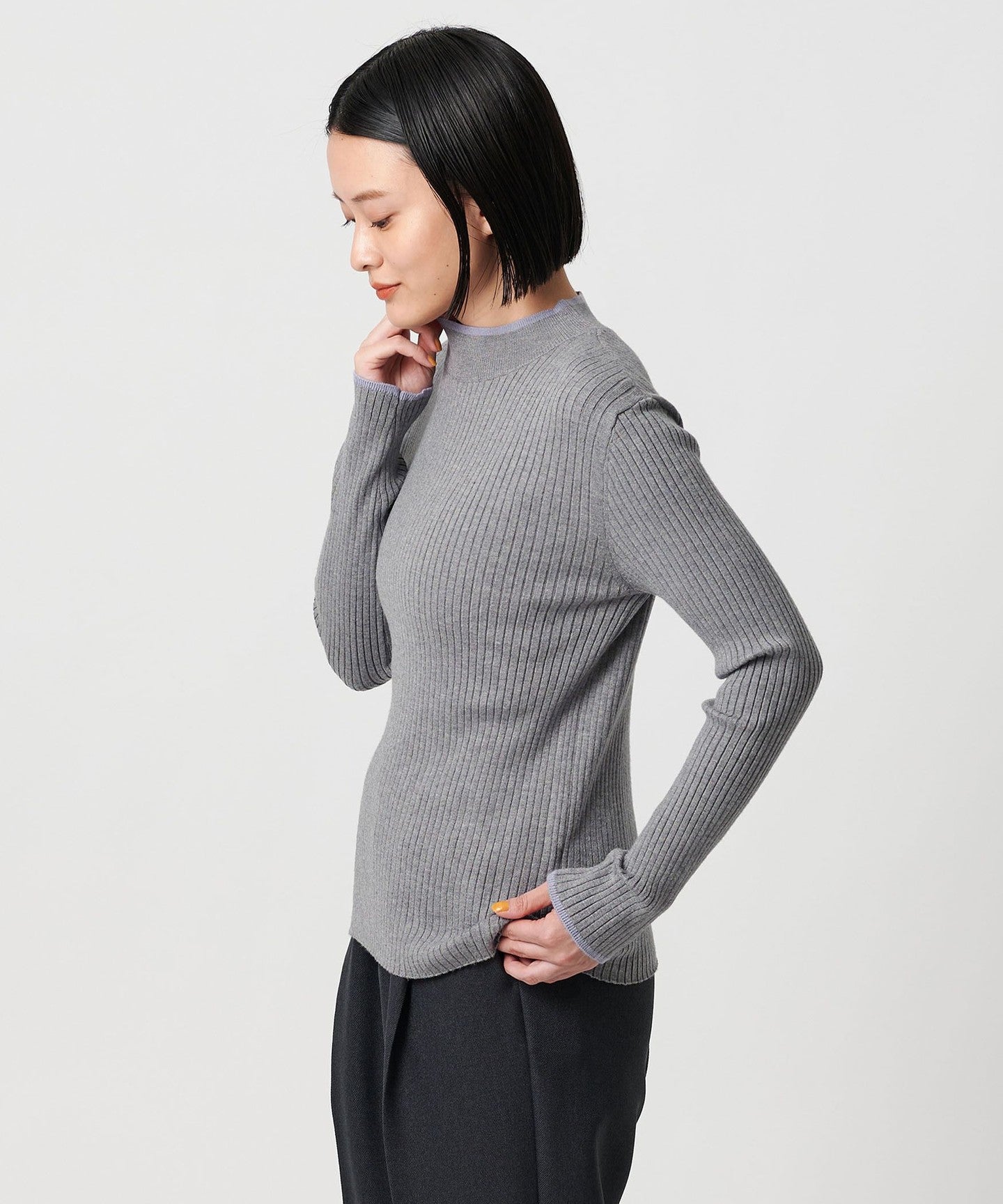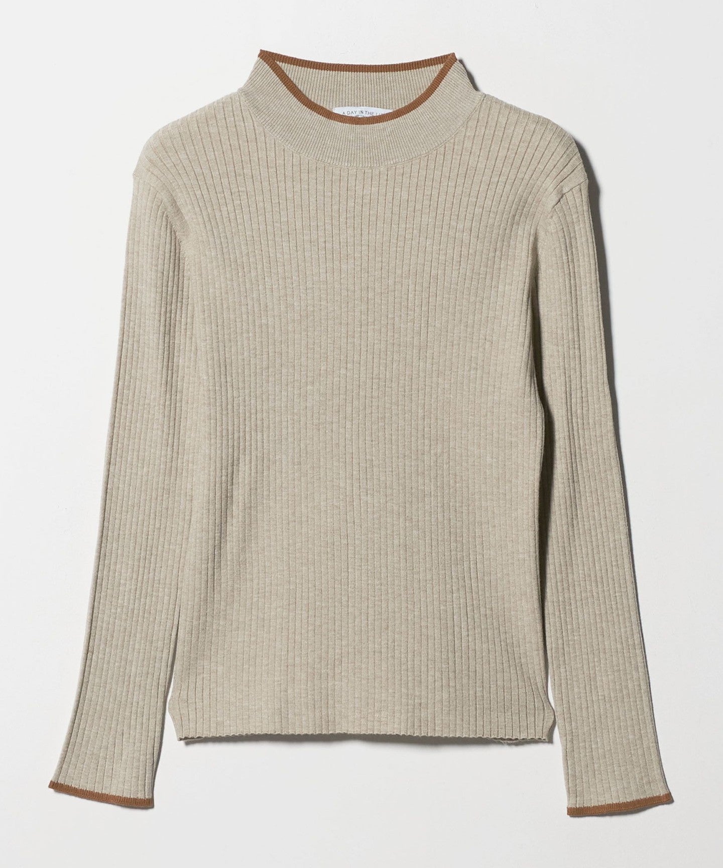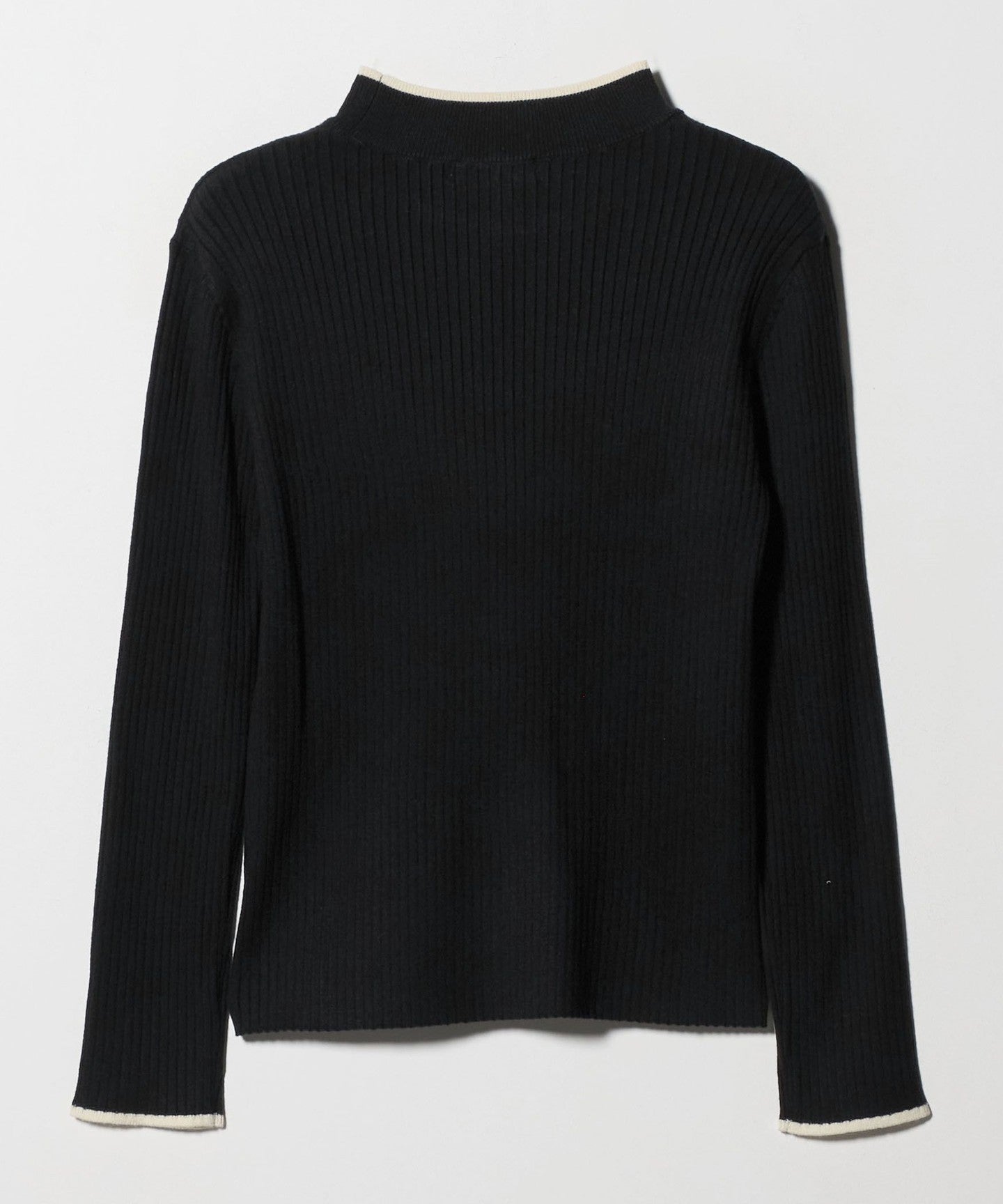 Ein hochgeschlossener Strickpullover mit kontrastierenden Farblinien an Kragen und Bündchen.
