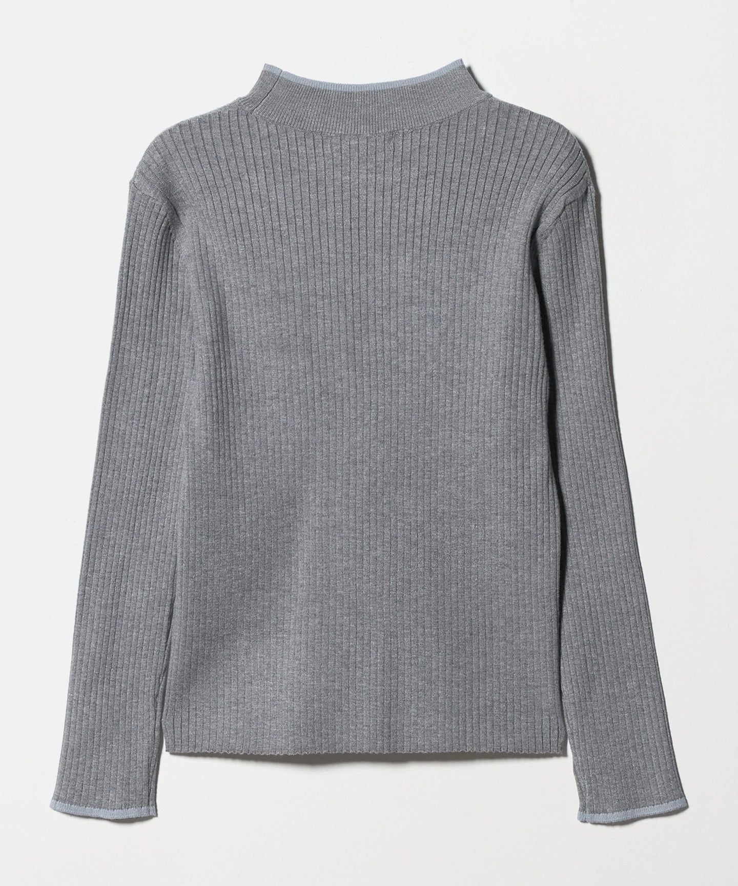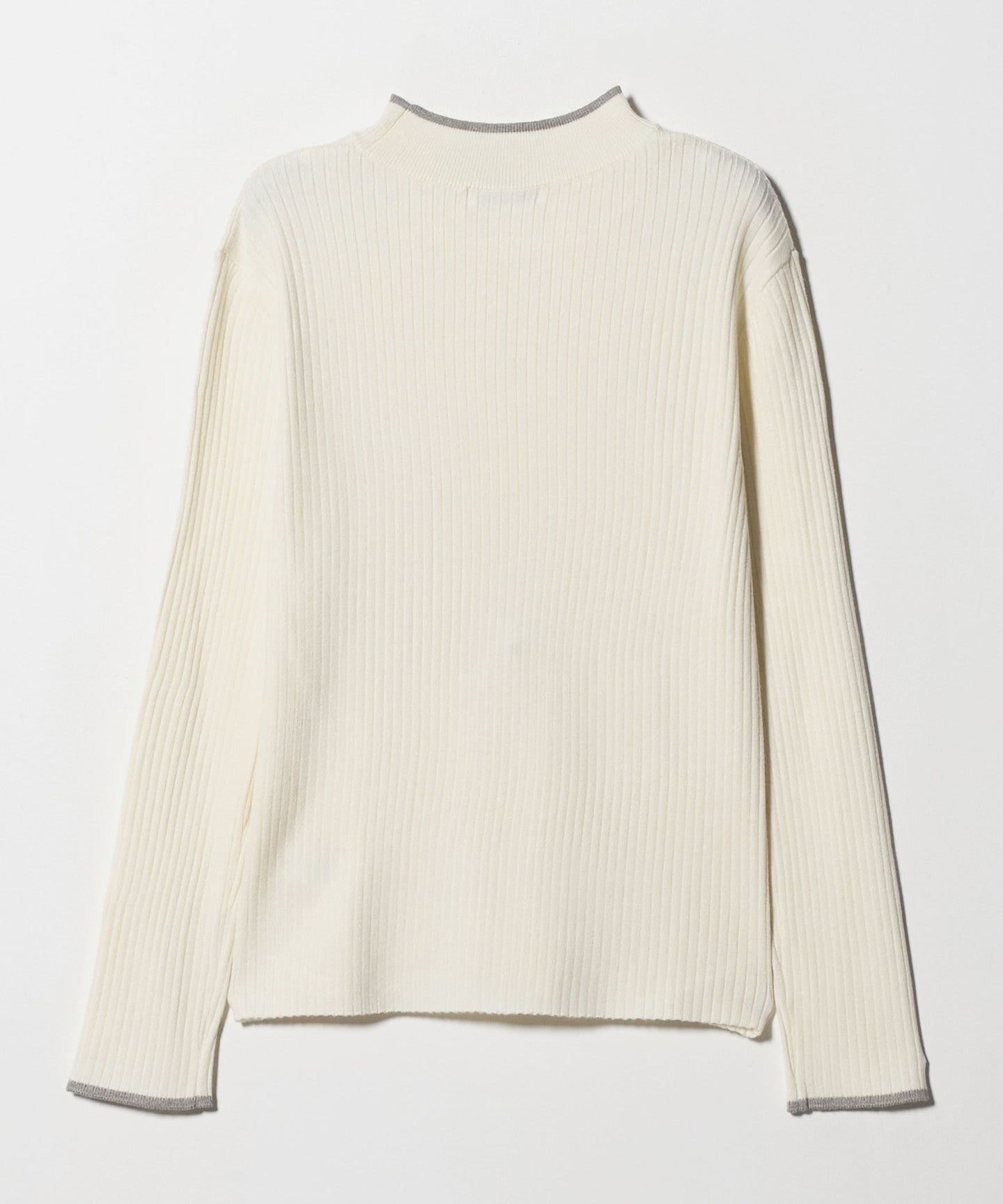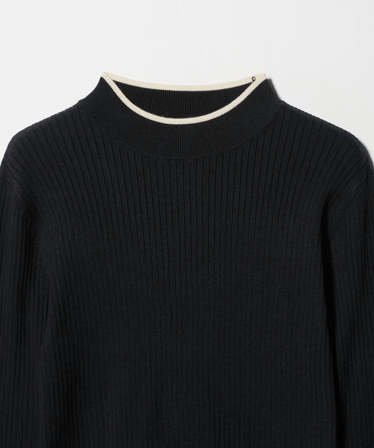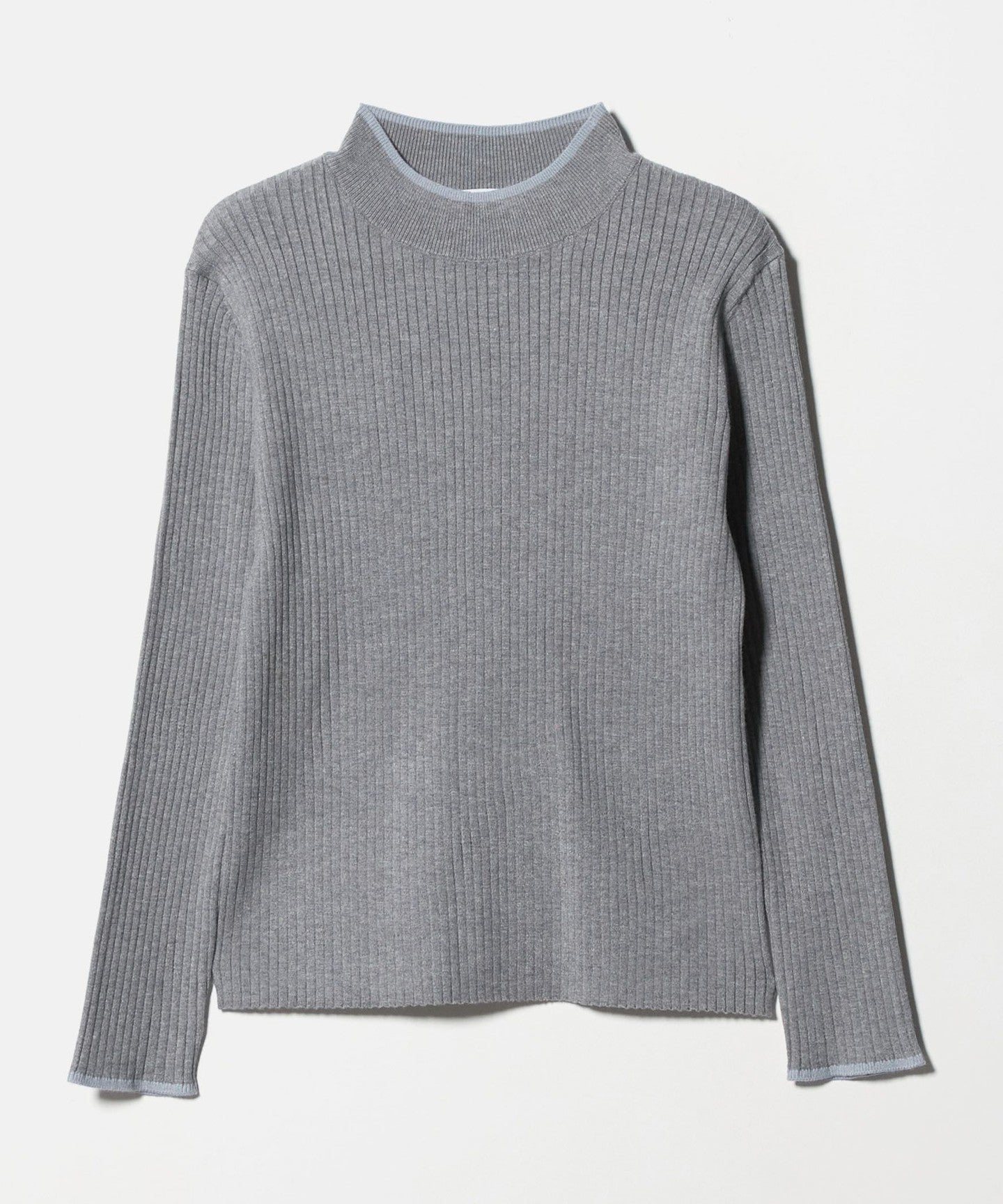 Ein hochgeschlossener Strickpullover mit kontrastierenden Farblinien an Kragen und Bündchen.