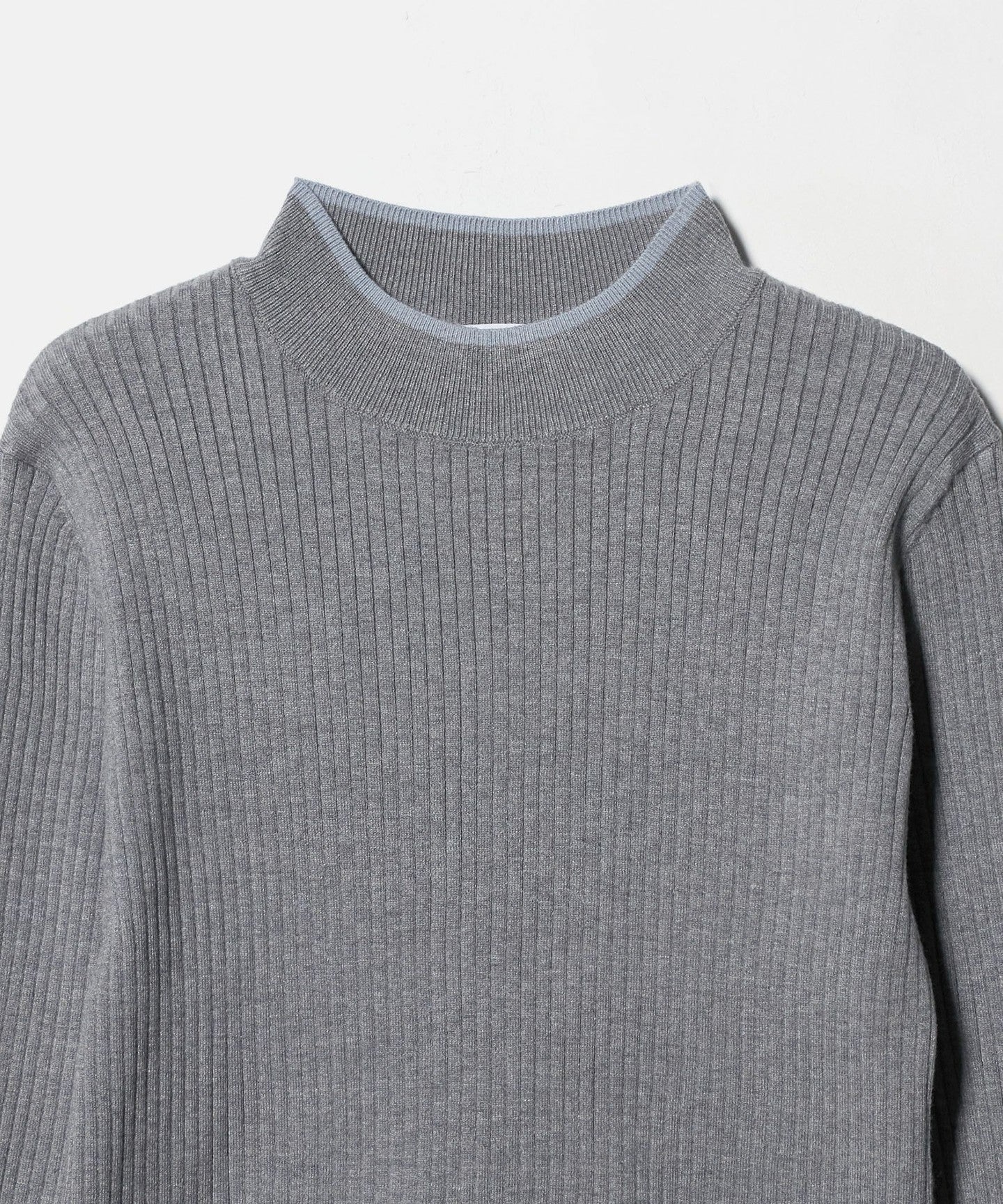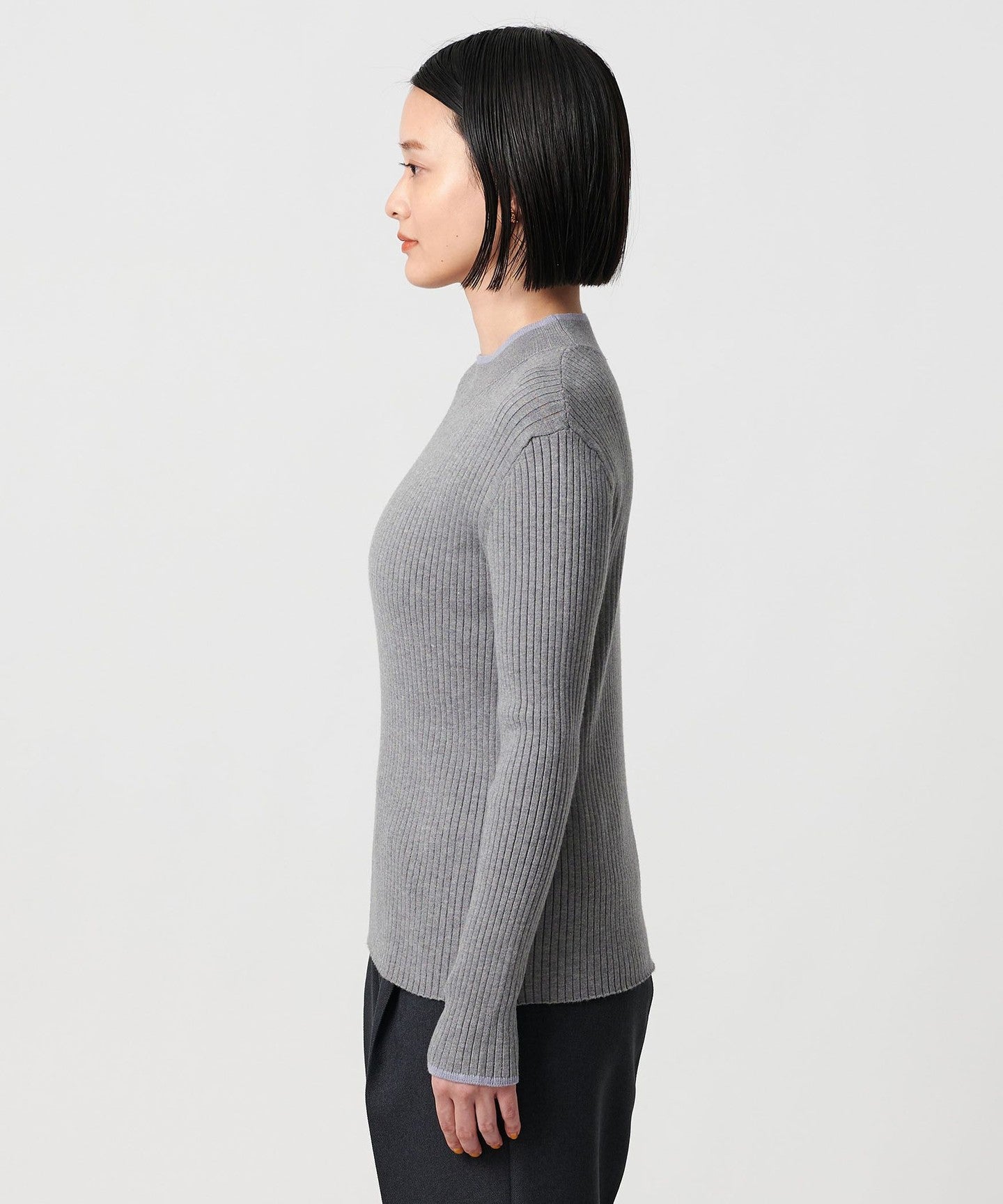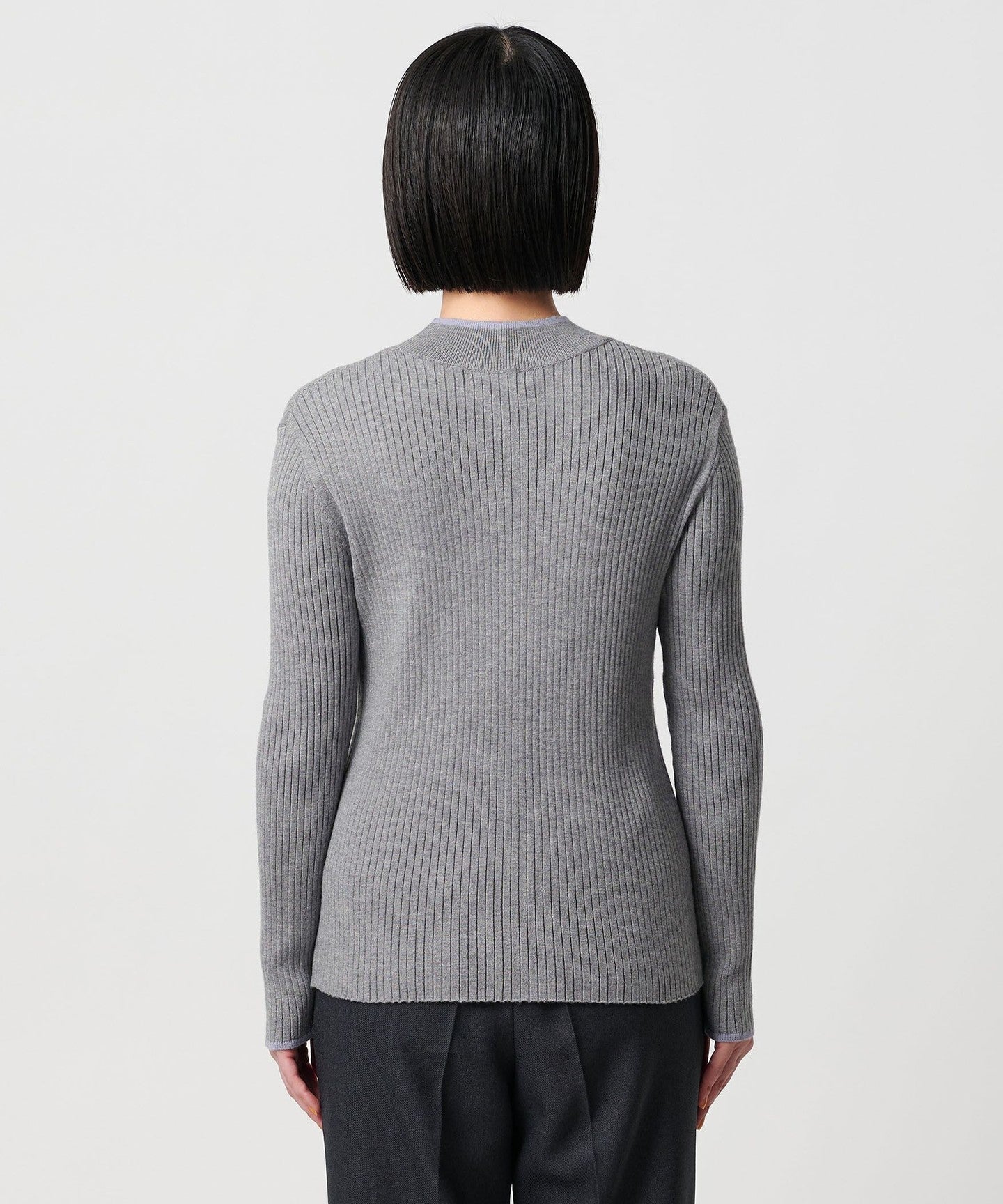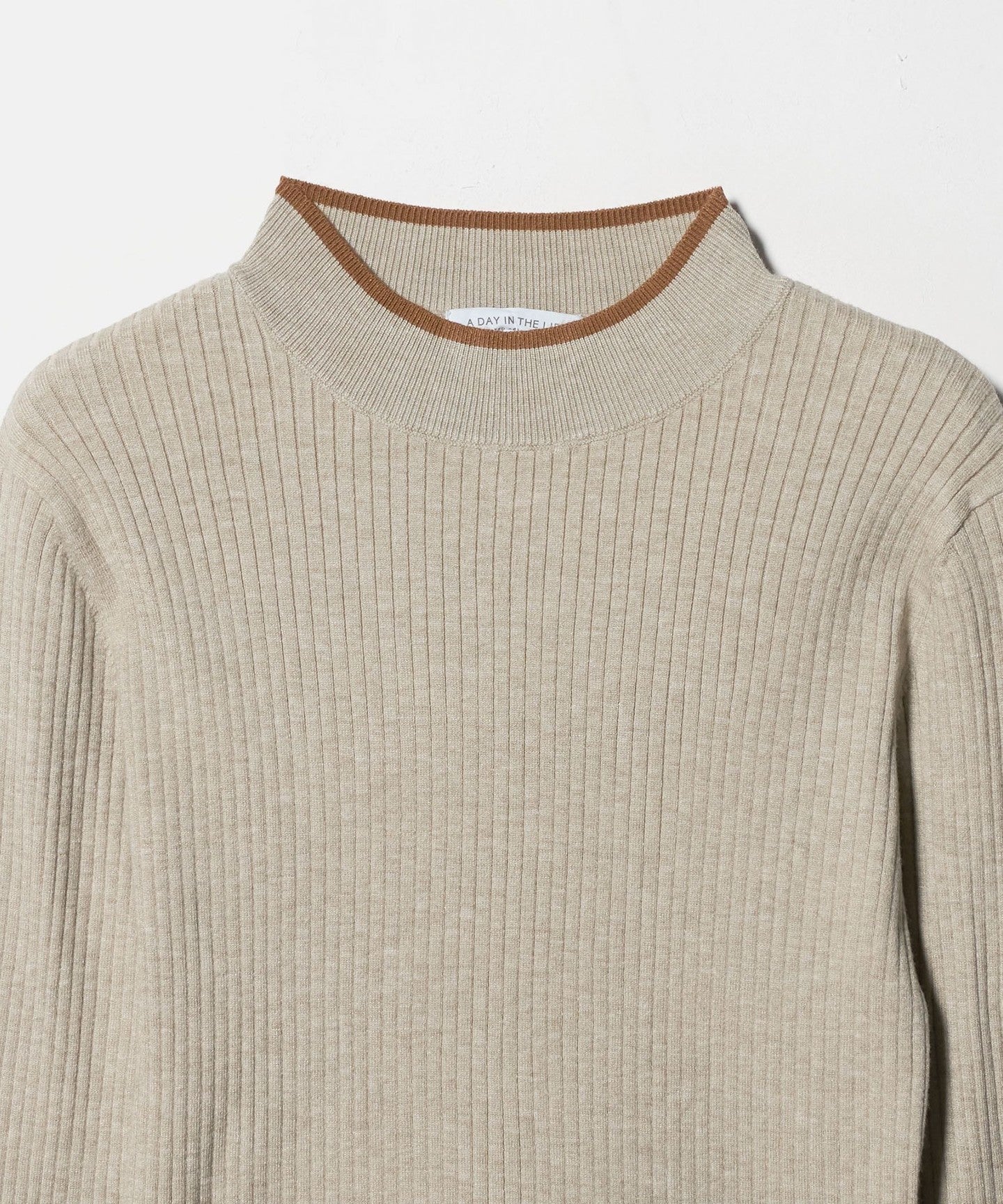 Ein hochgeschlossener Strickpullover mit kontrastierenden Farblinien an Kragen und Bündchen.