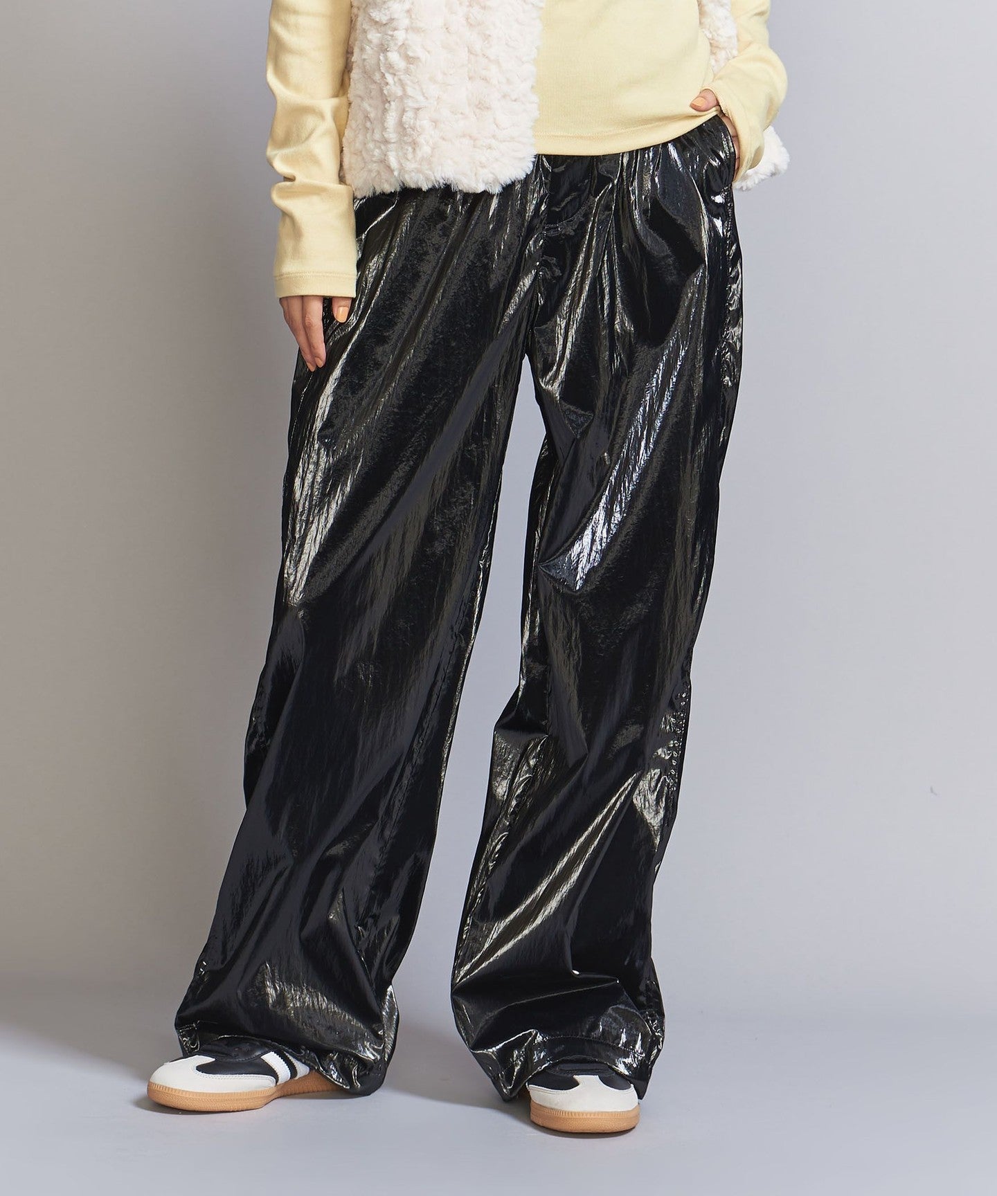 These jogger pants have an elastic waistband that creates a glamorous look with a glossy finish.
