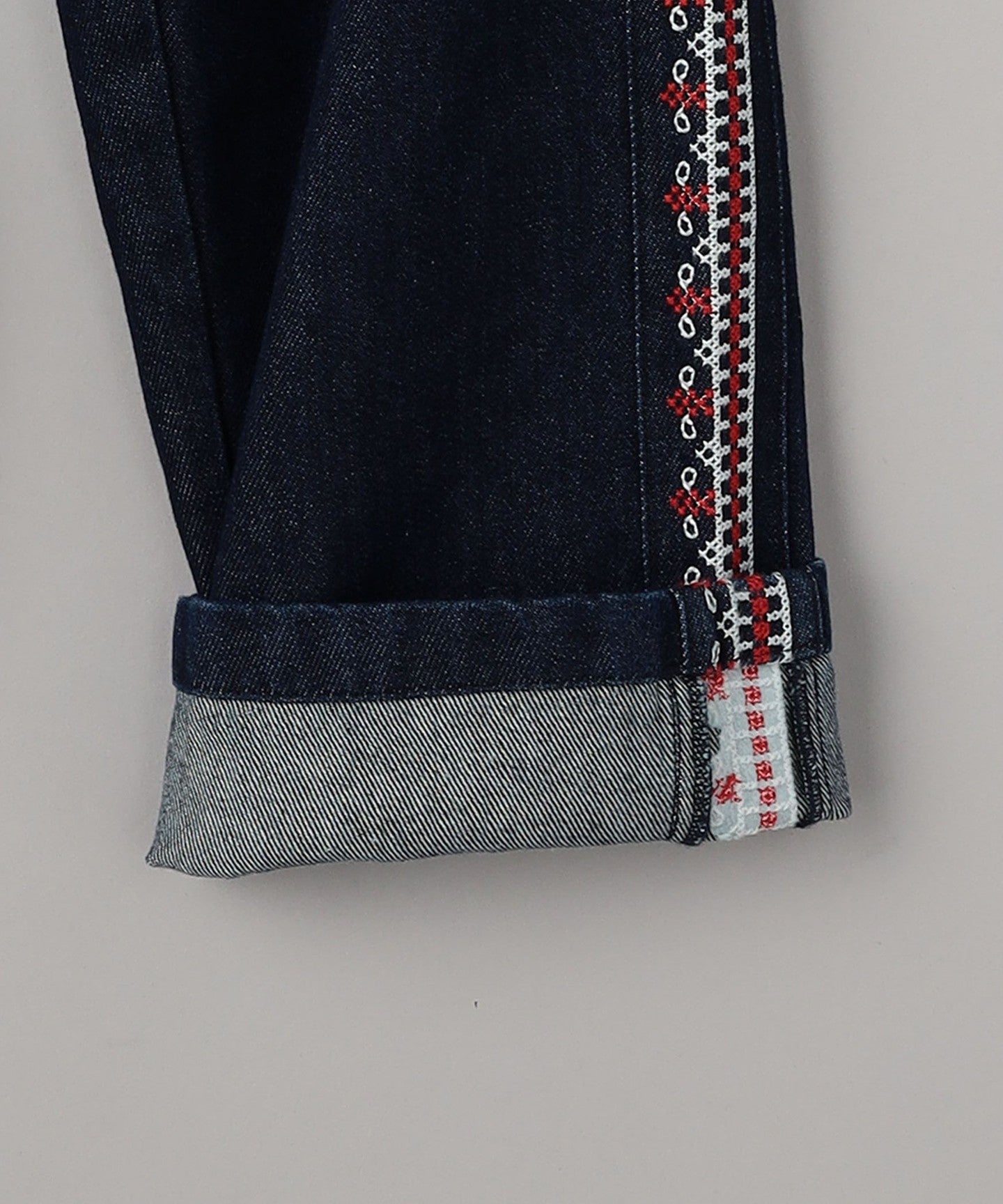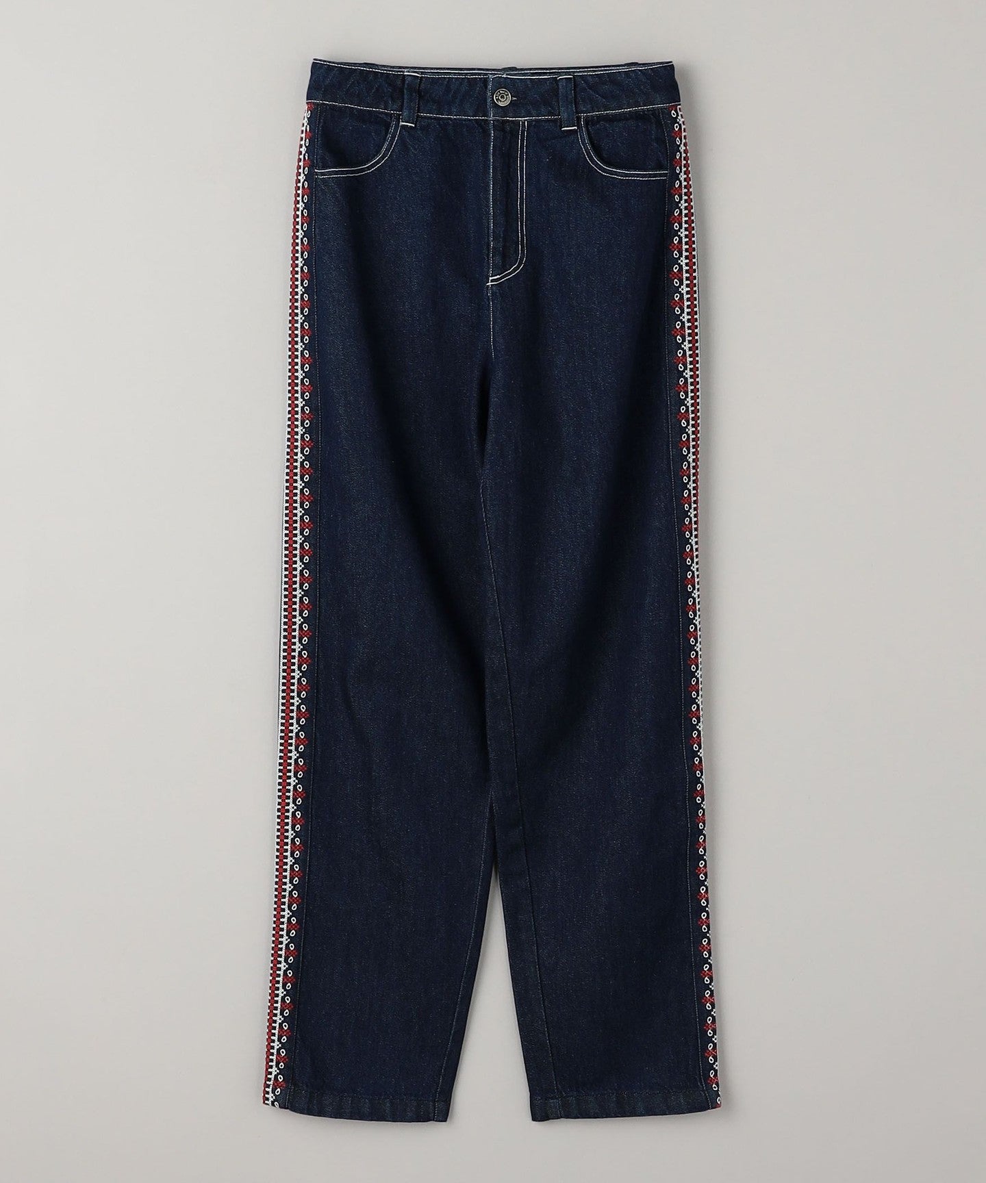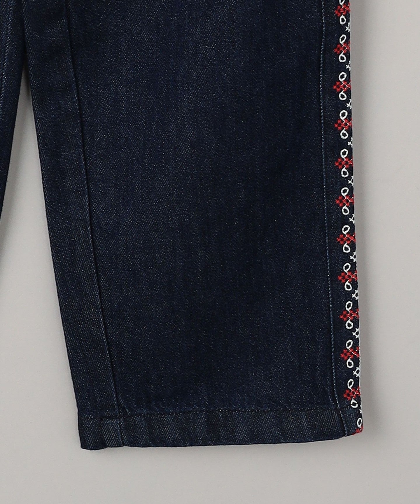 Denim pants with ecru and red embroidery on the sides.