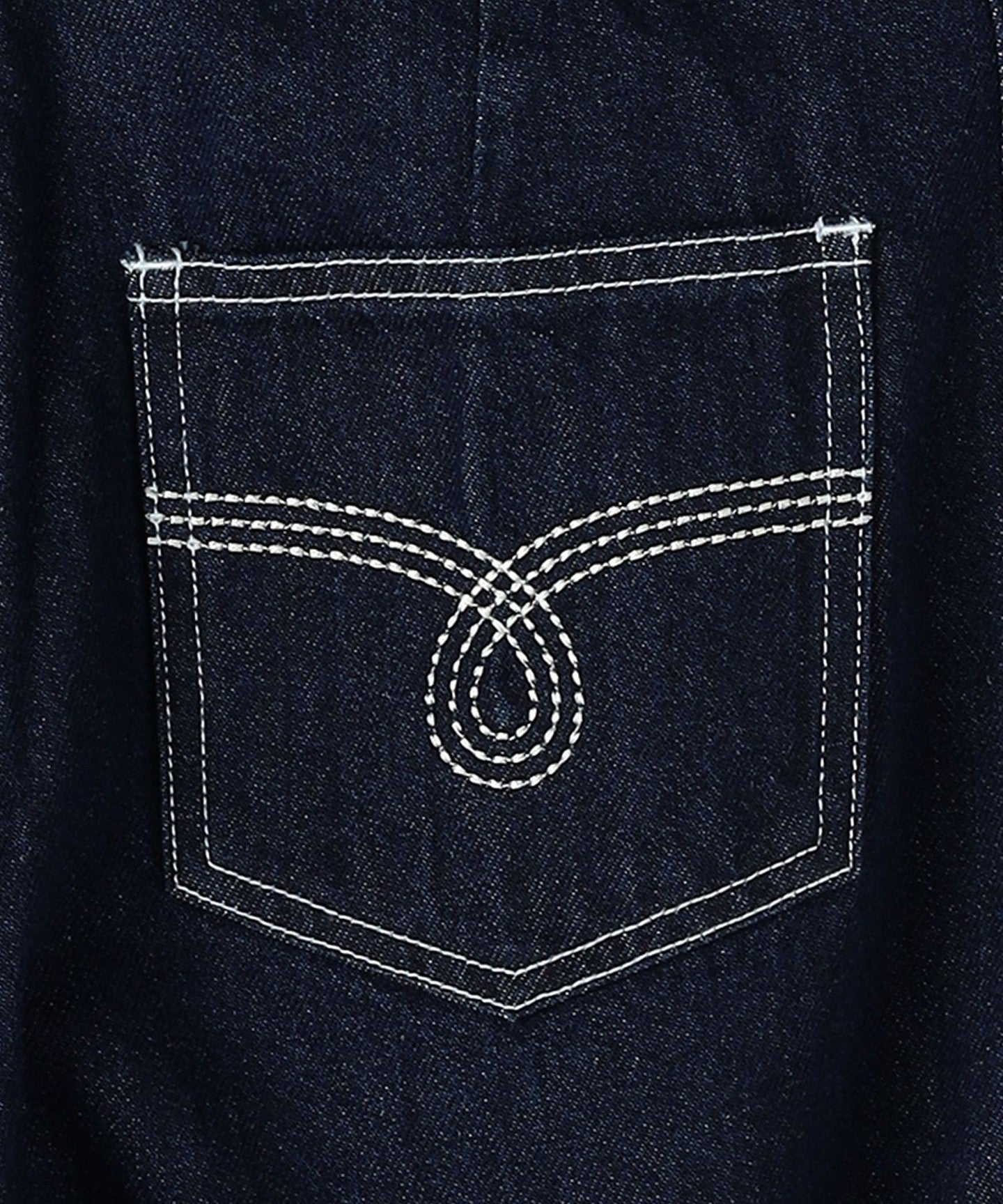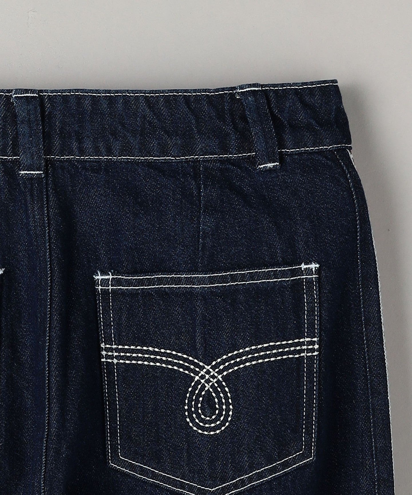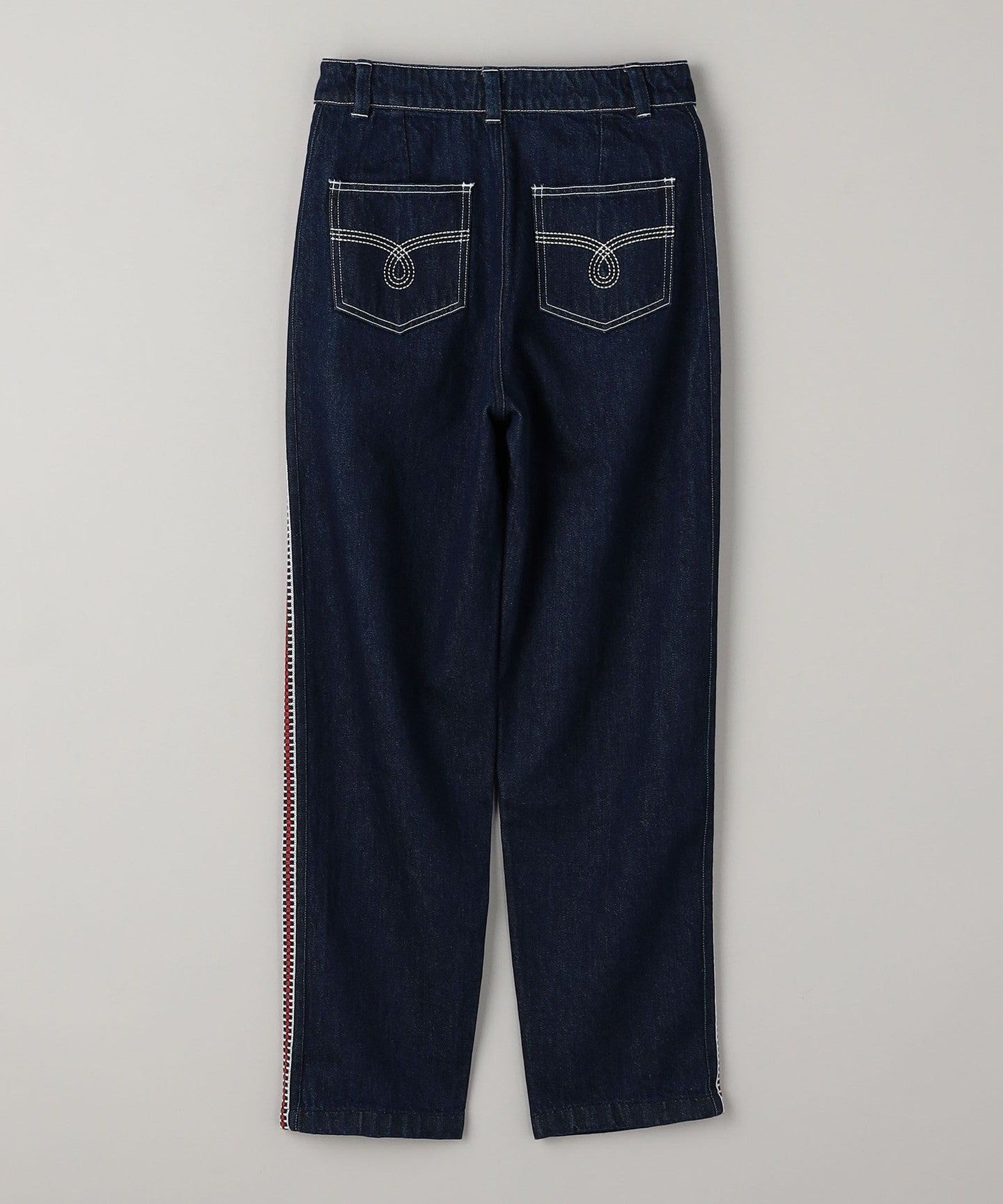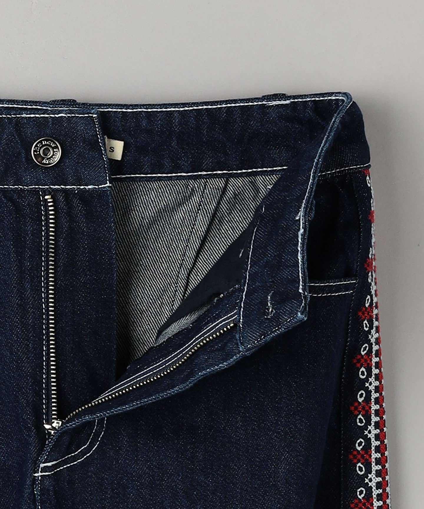 Denim pants with ecru and red embroidery on the sides.
