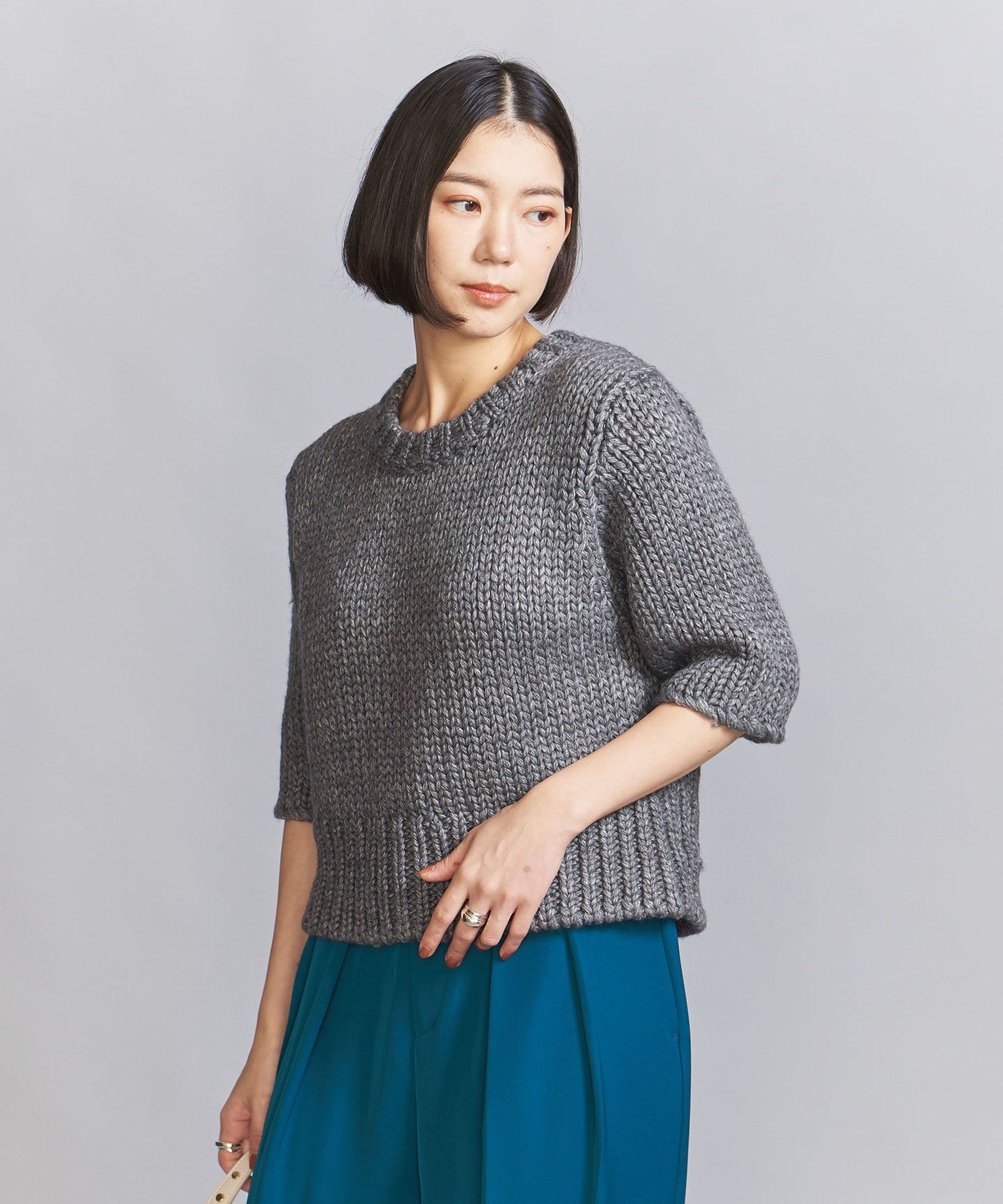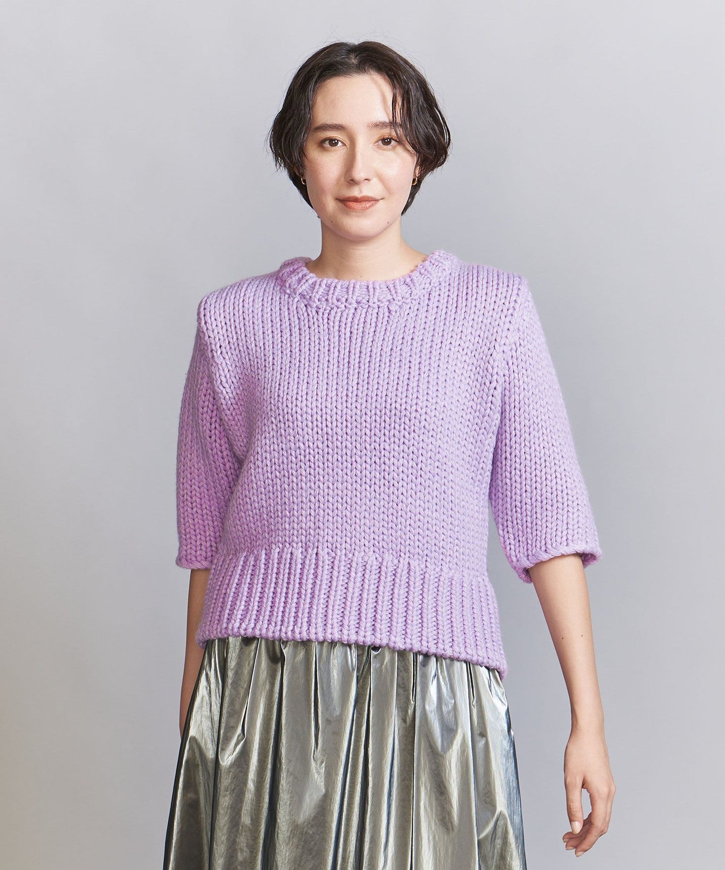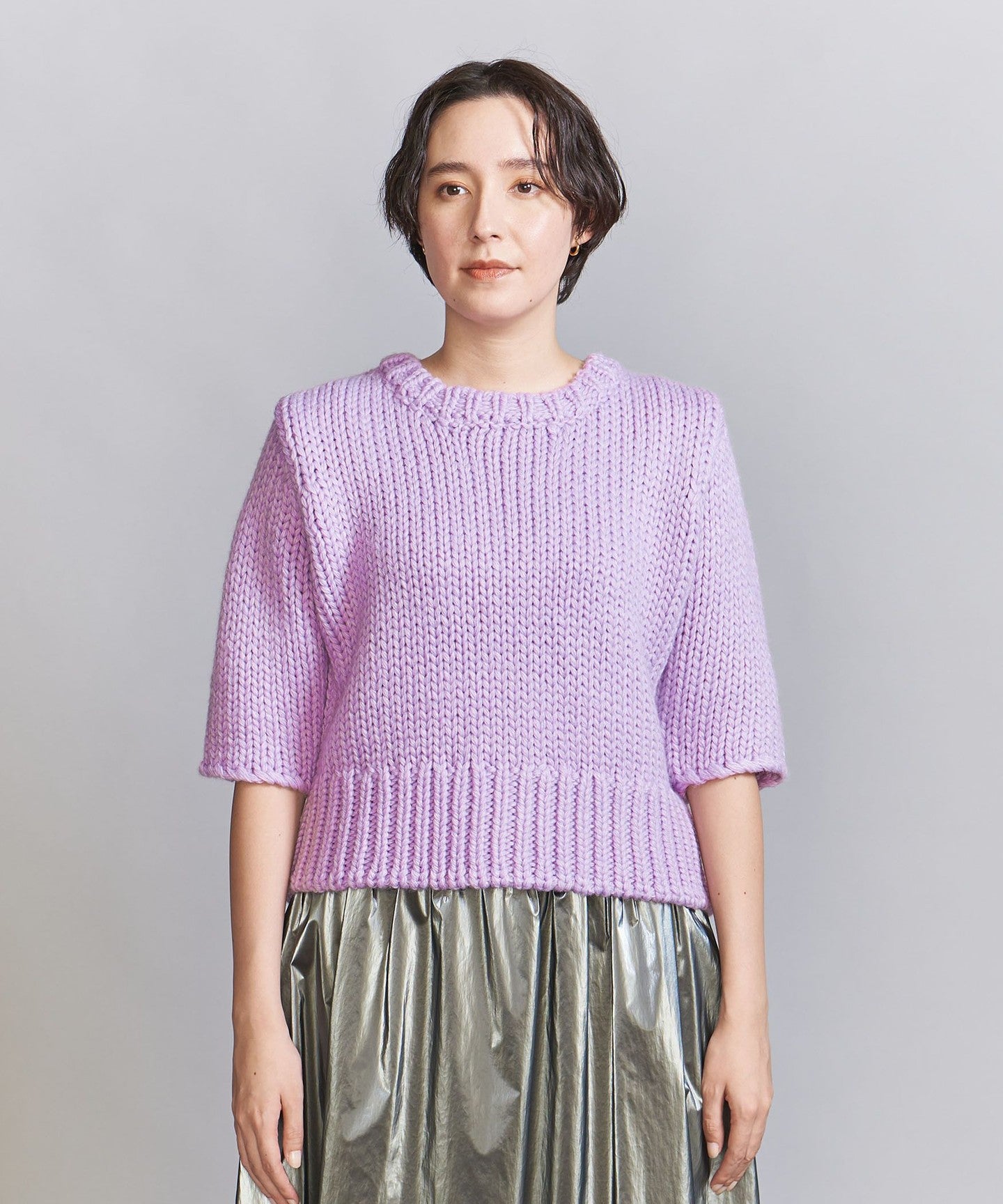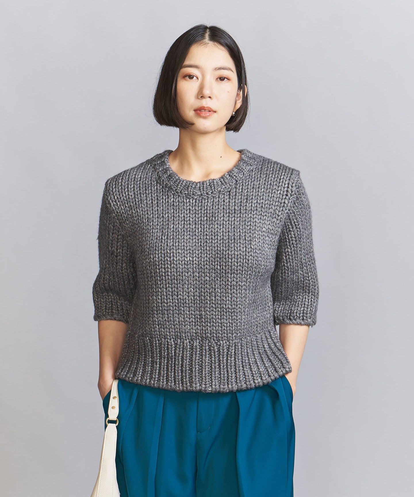 A compact silhouette is the current trend. A half-sleeve knit with a retro feel.