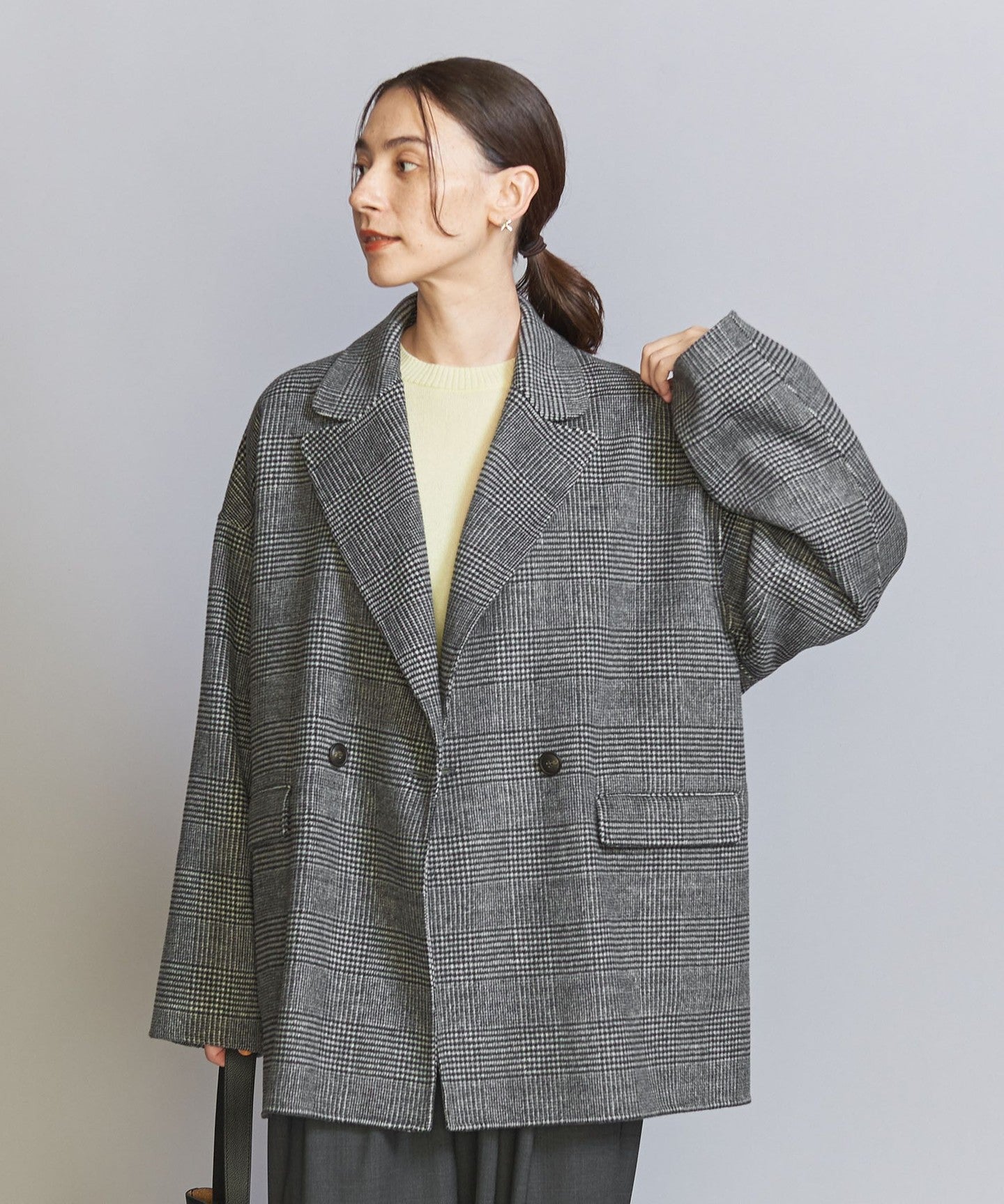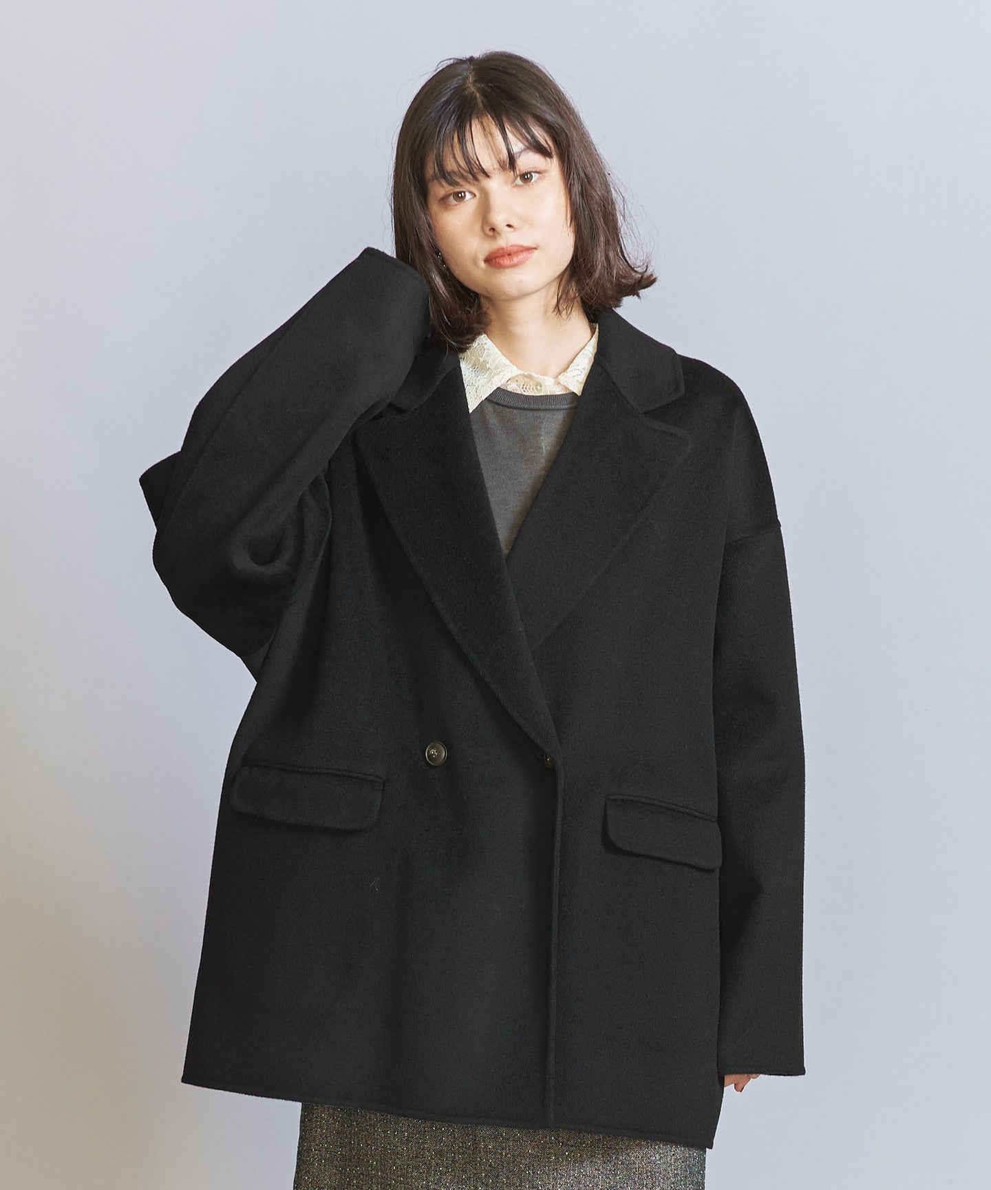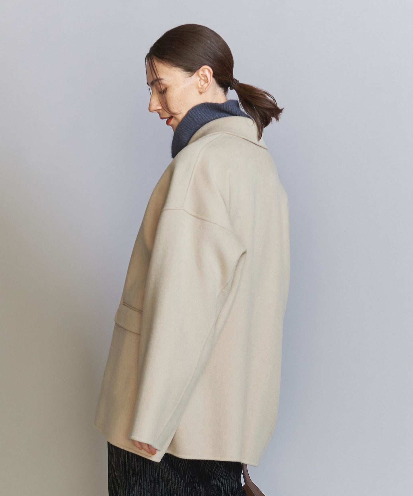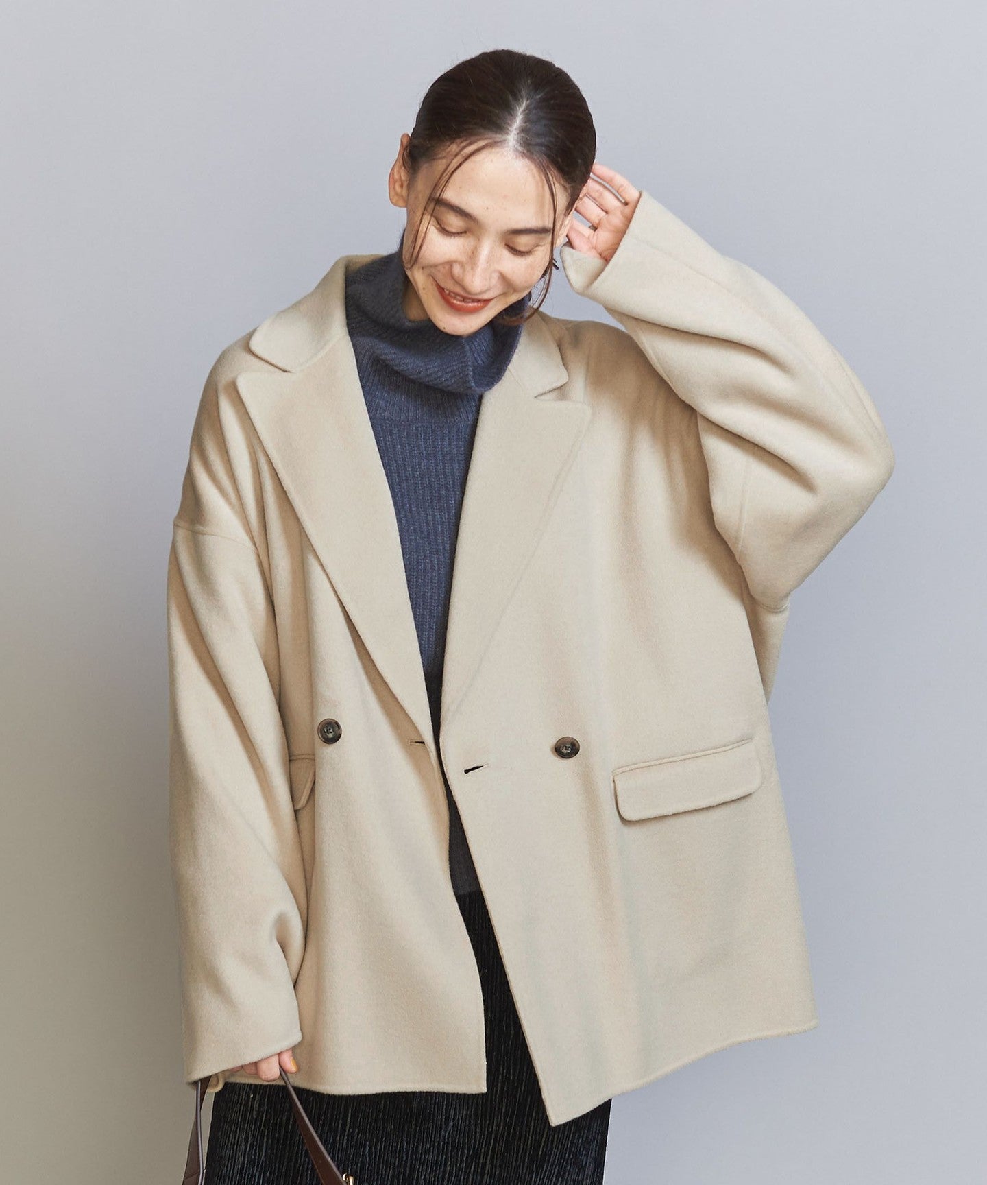 This season, we've changed the hem to a double-breasted jacket and enlarged the collar to create a design that's not too stiff.