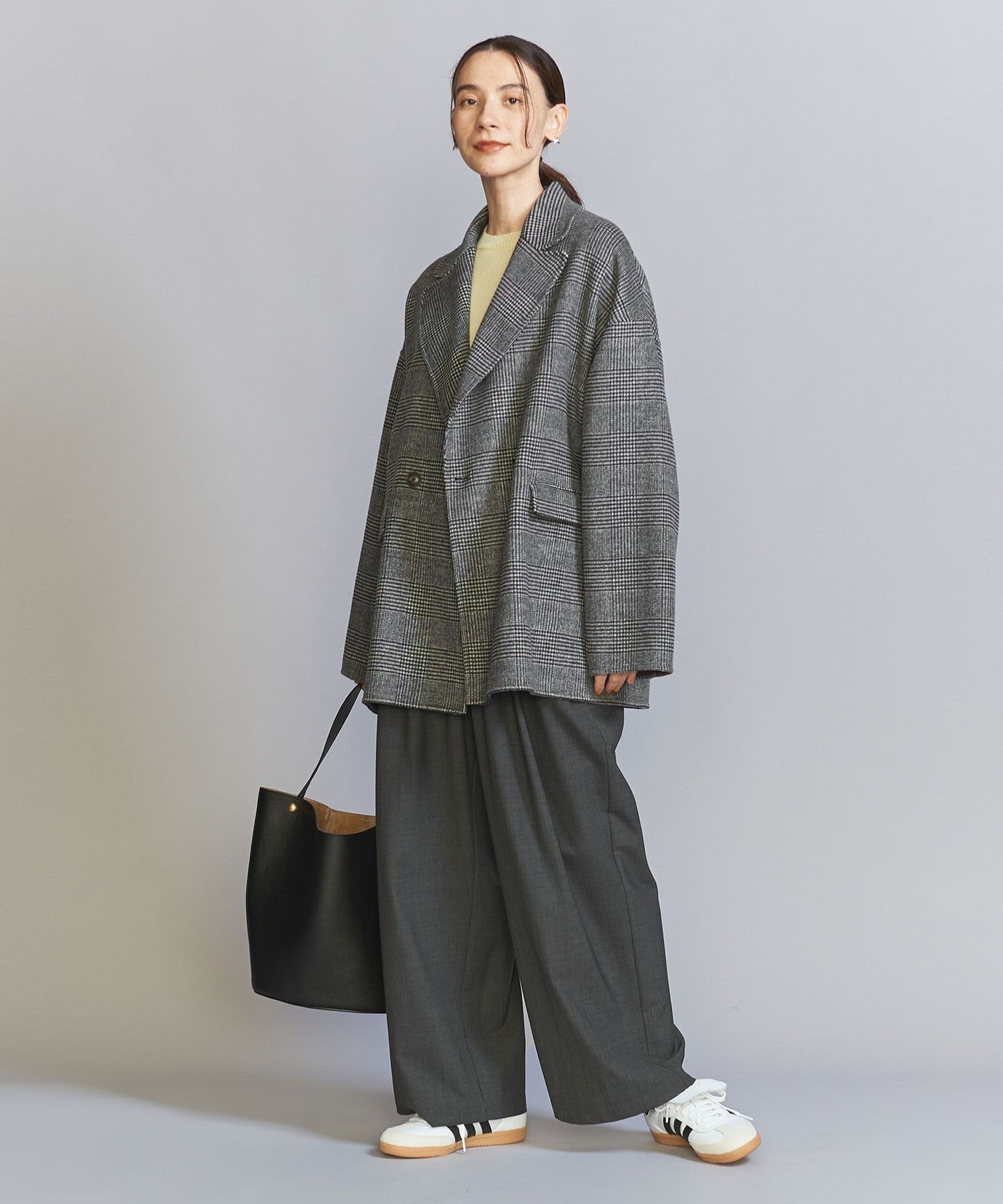 We offer three colors: the classic black, the soft natural tone, and a check pattern with a classic feel.