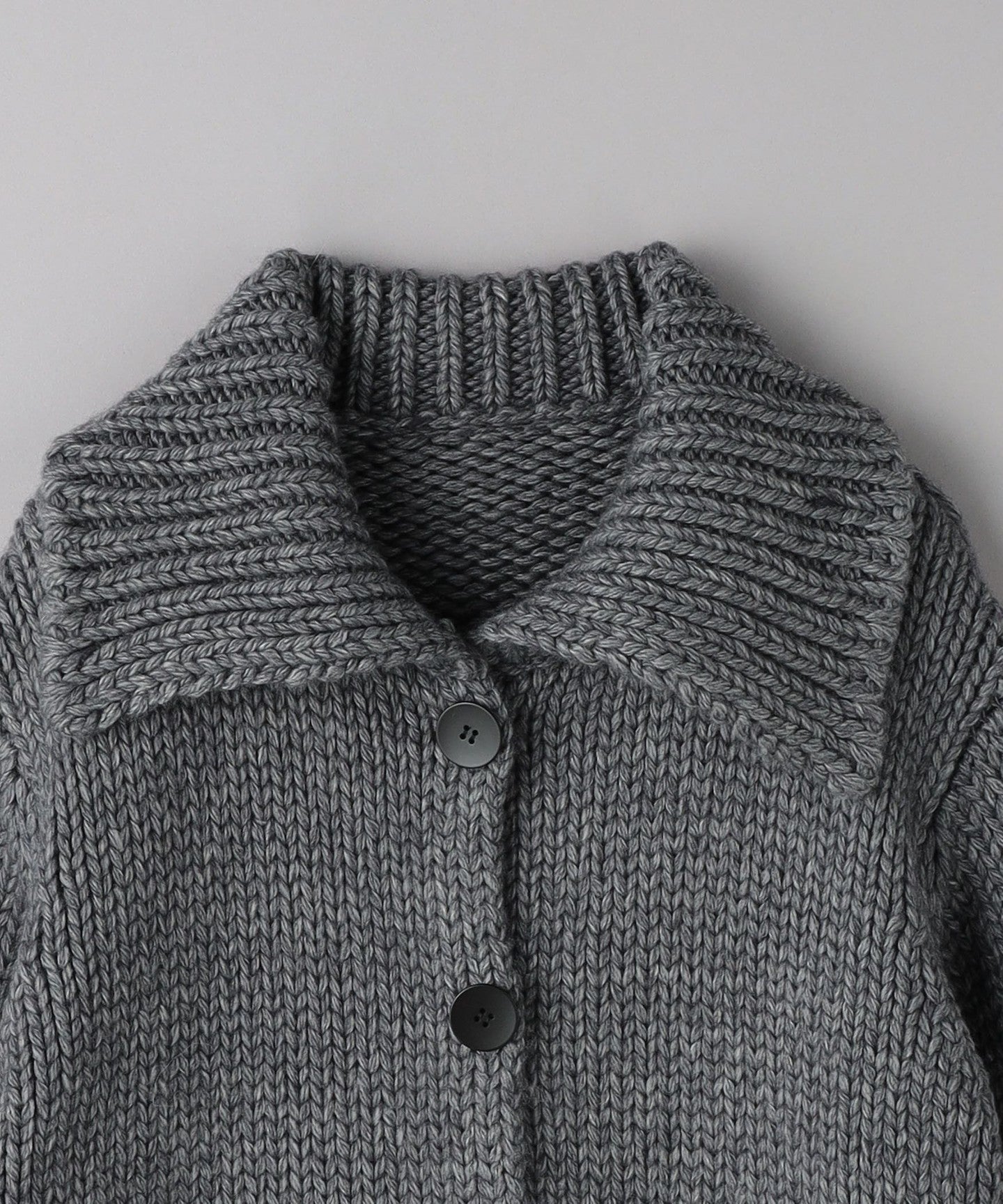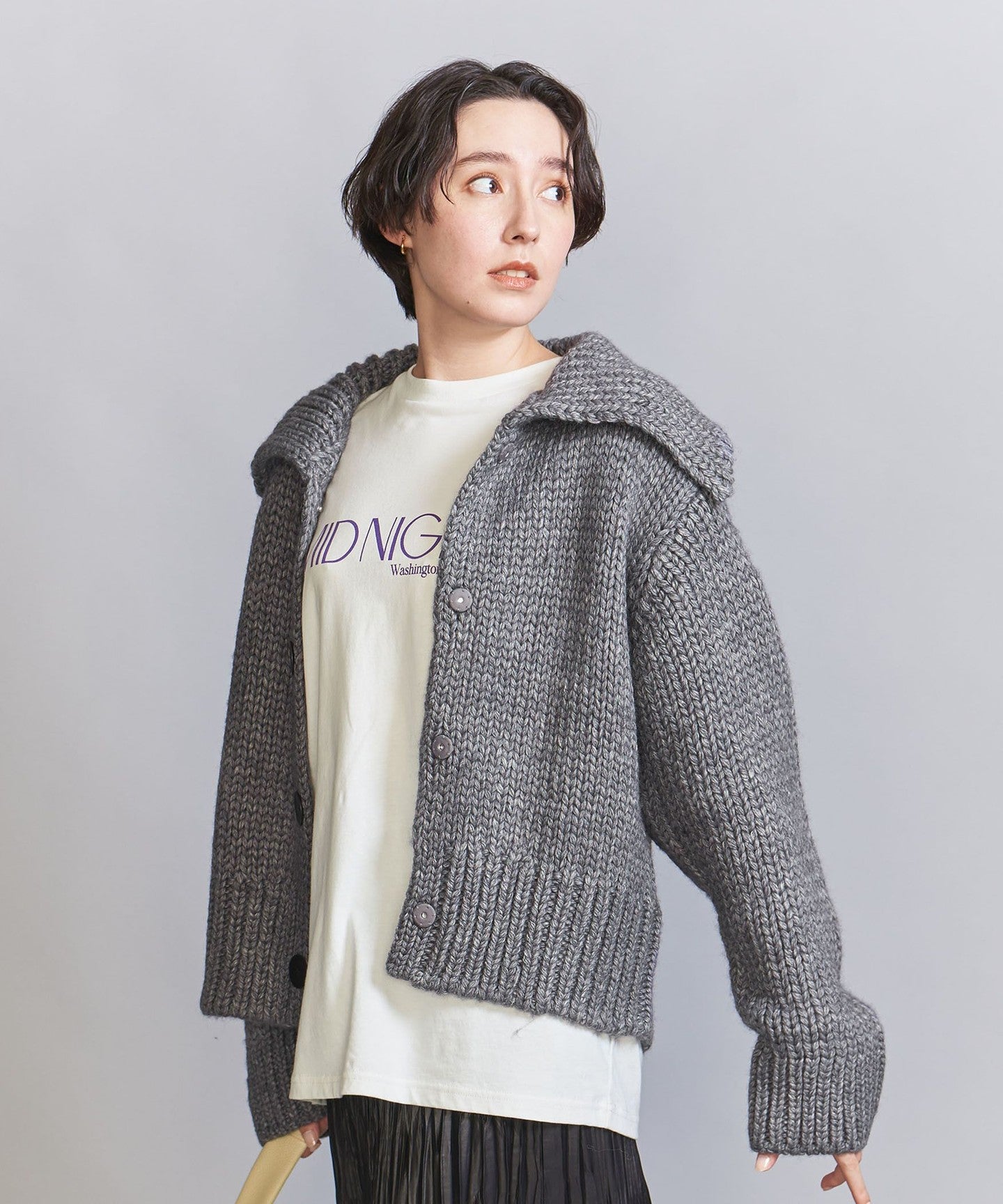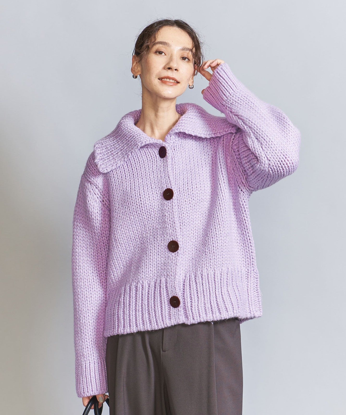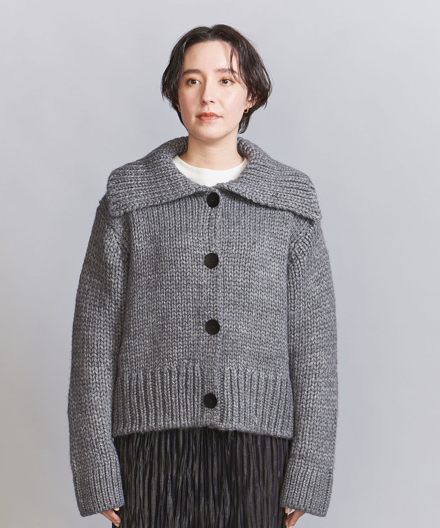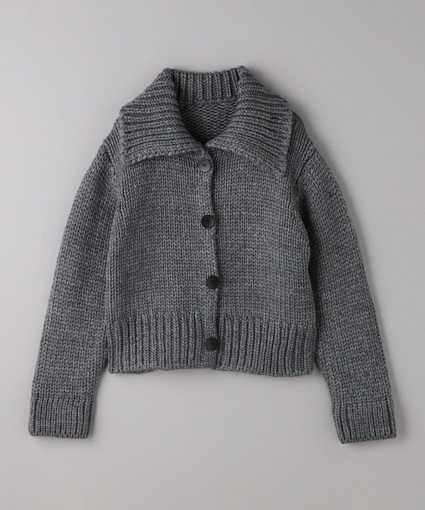 A compact silhouette is the current trend. A knit cardigan with a collar that exudes a retro vibe.