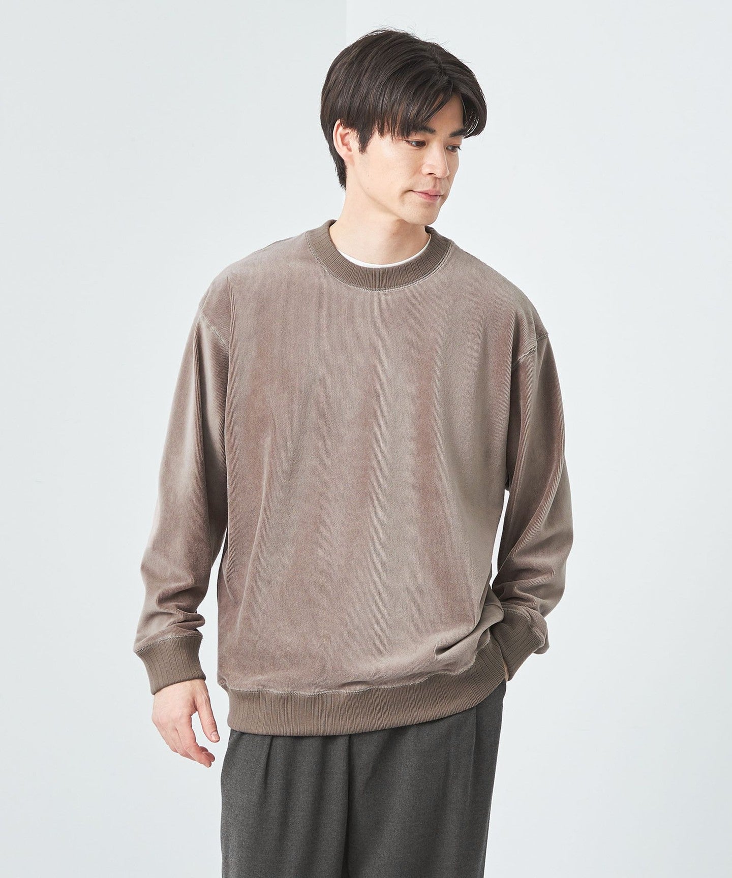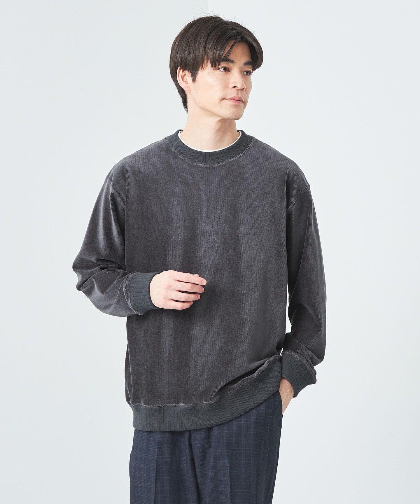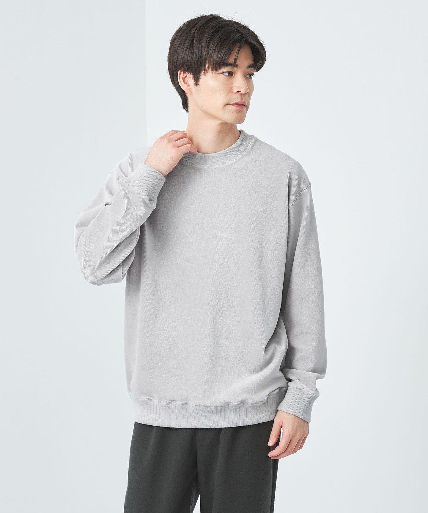 This is a crew neck cut-and-sew with a slightly loose silhouette.
