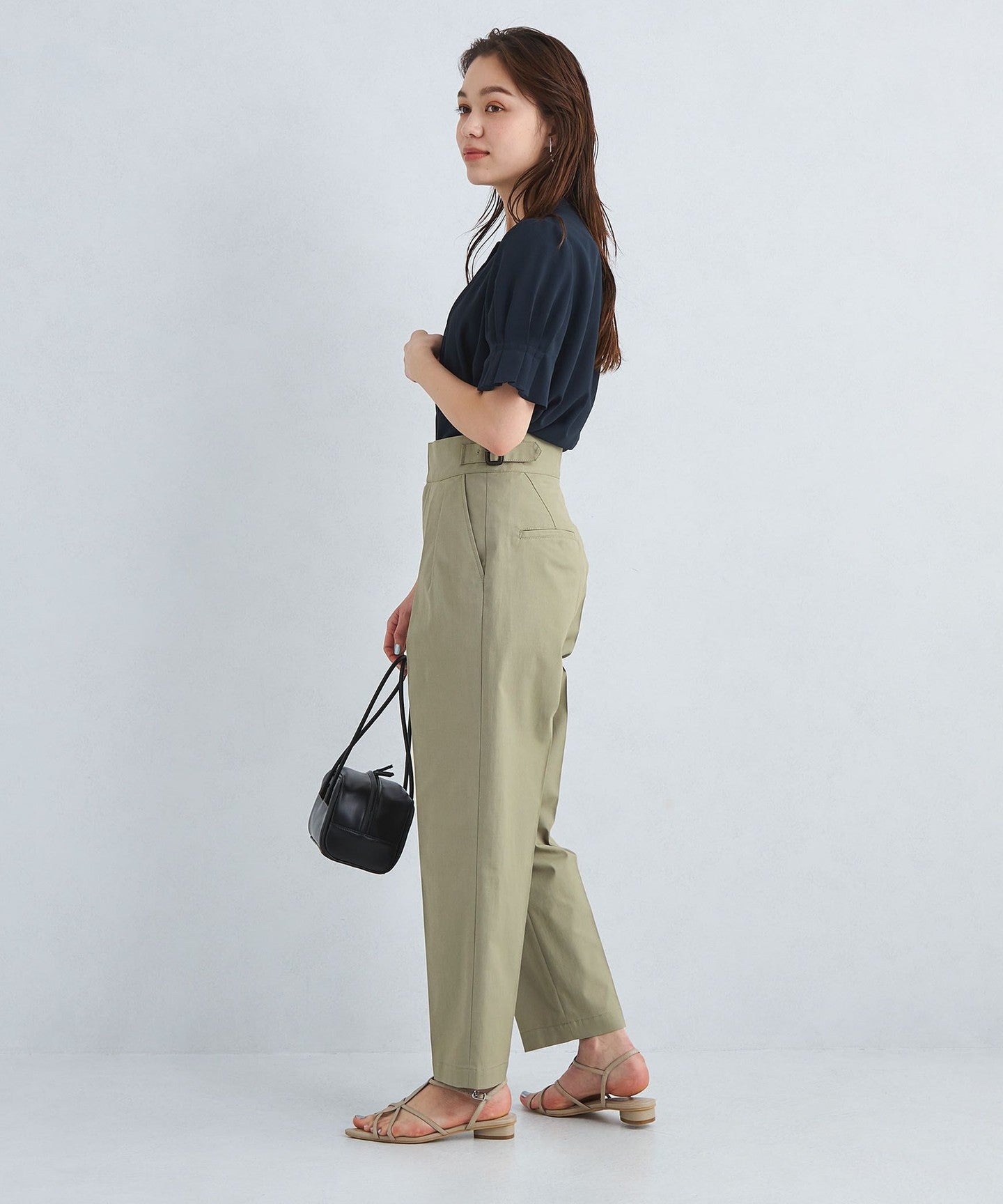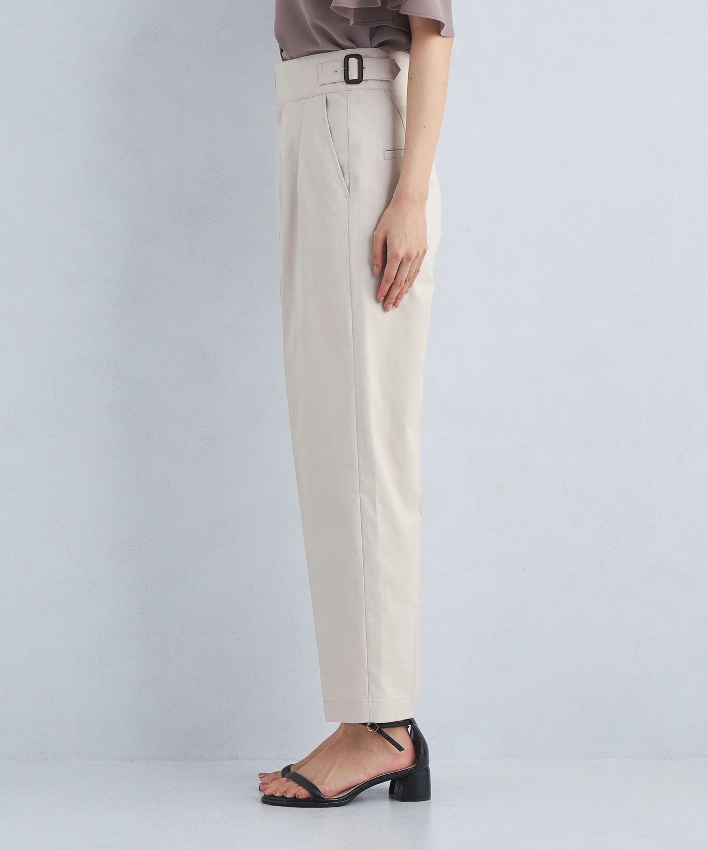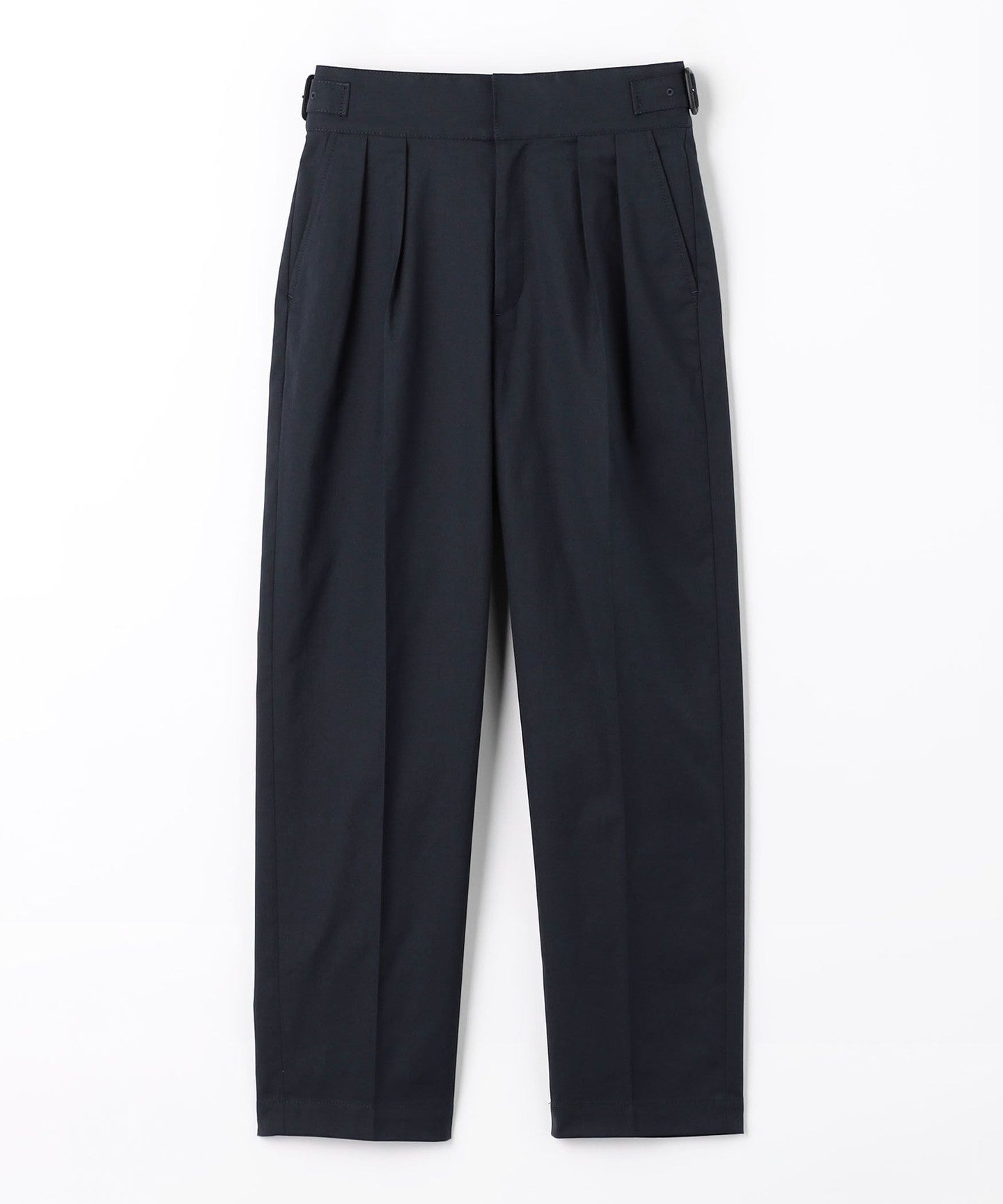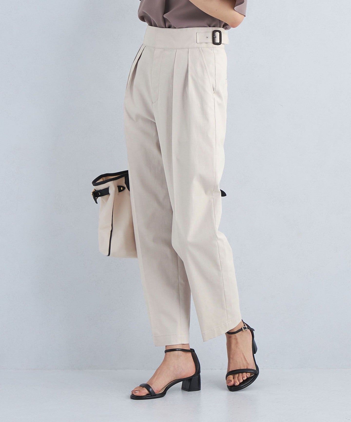 These pants have a loose fit around the waist and a silhouette that gradually tapers towards the hem.