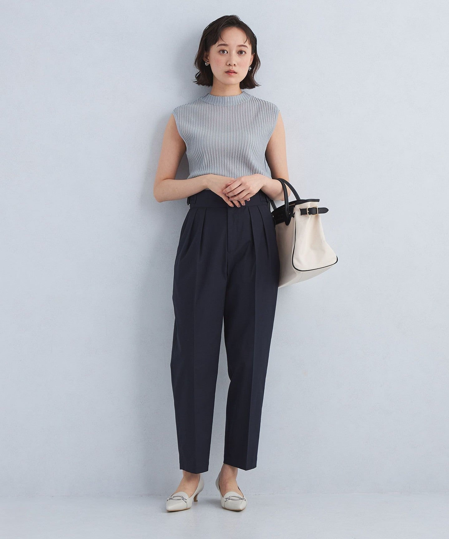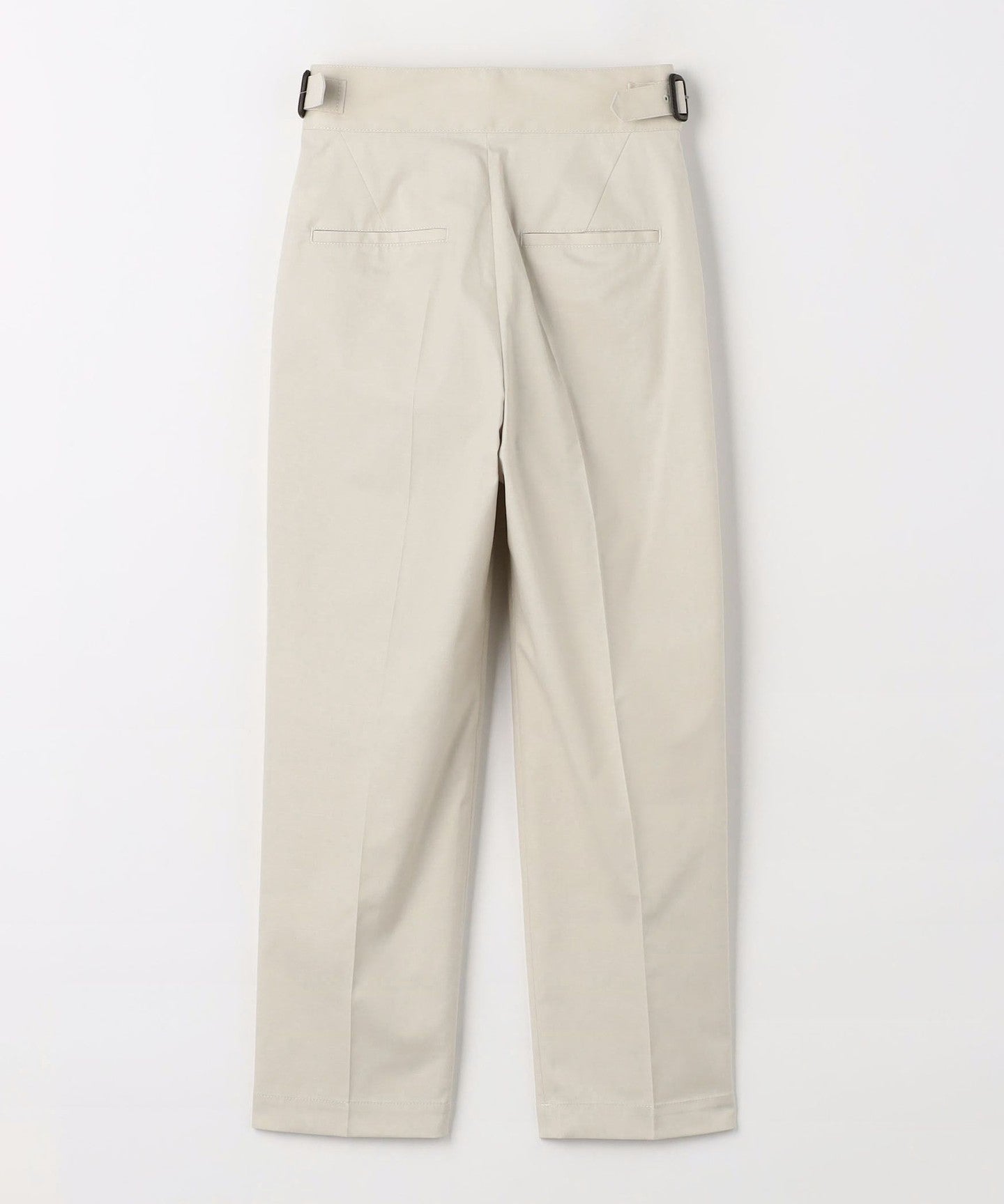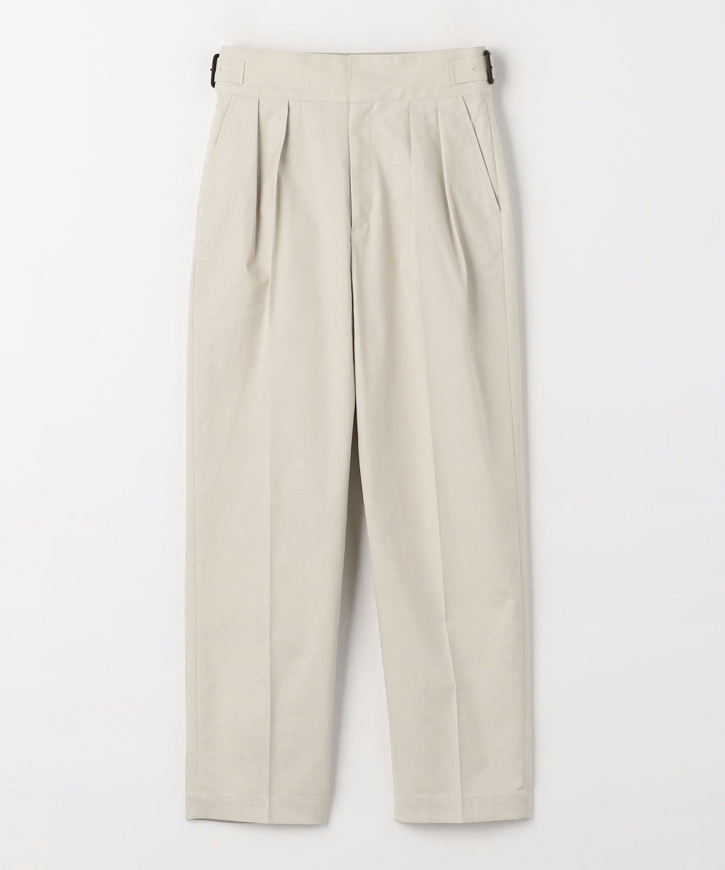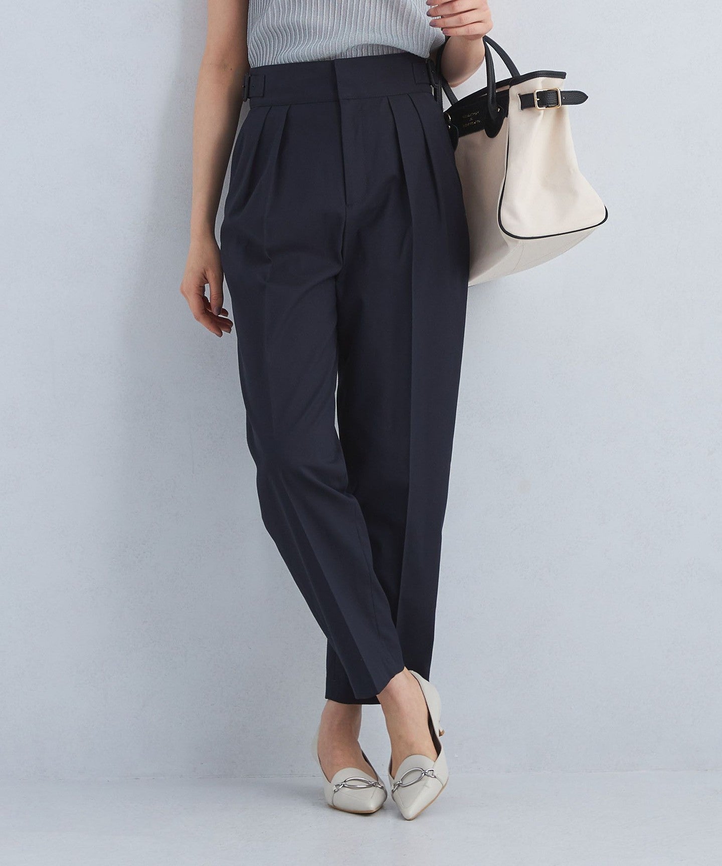These pants have a loose fit around the waist and a silhouette that gradually tapers towards the hem.