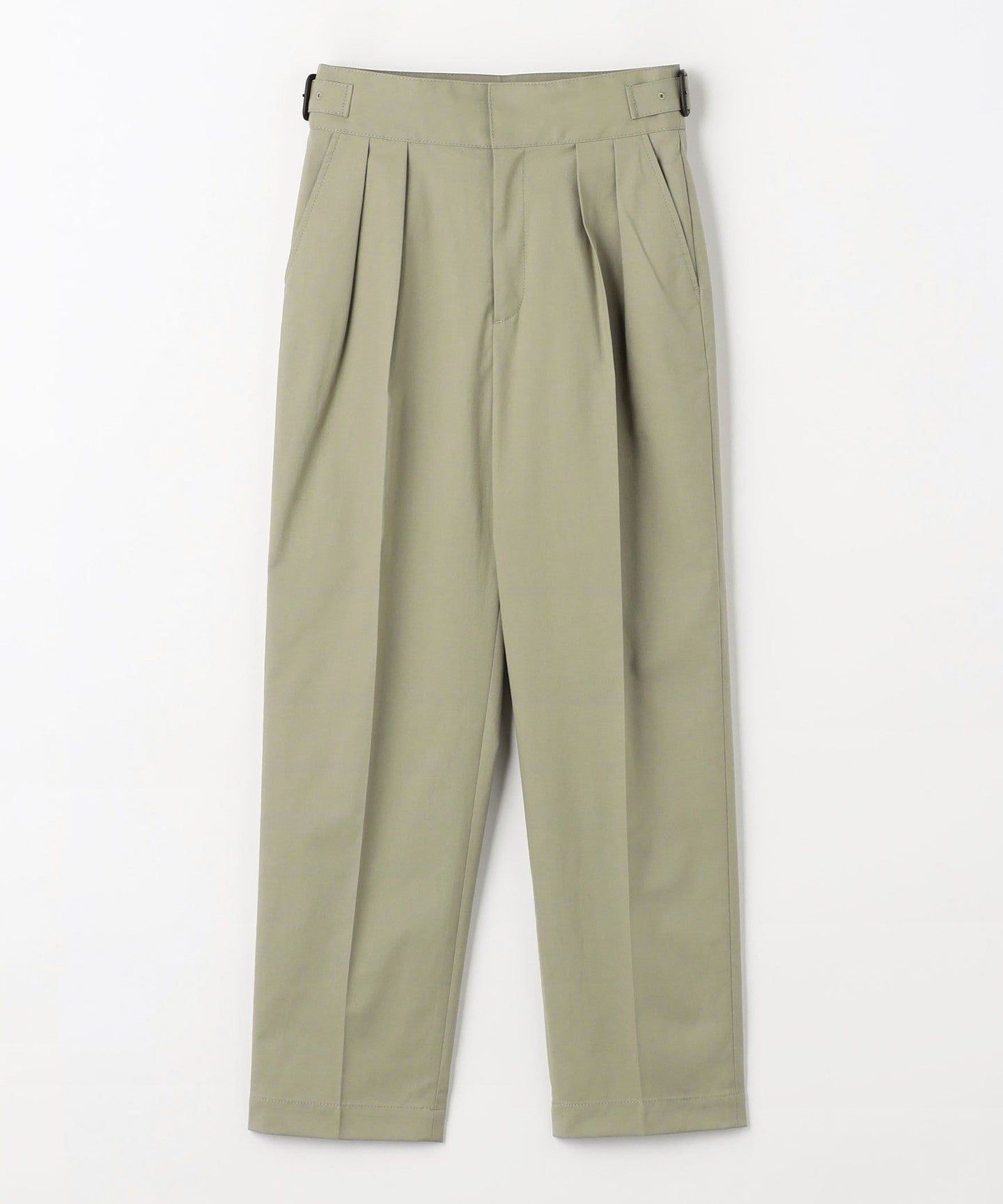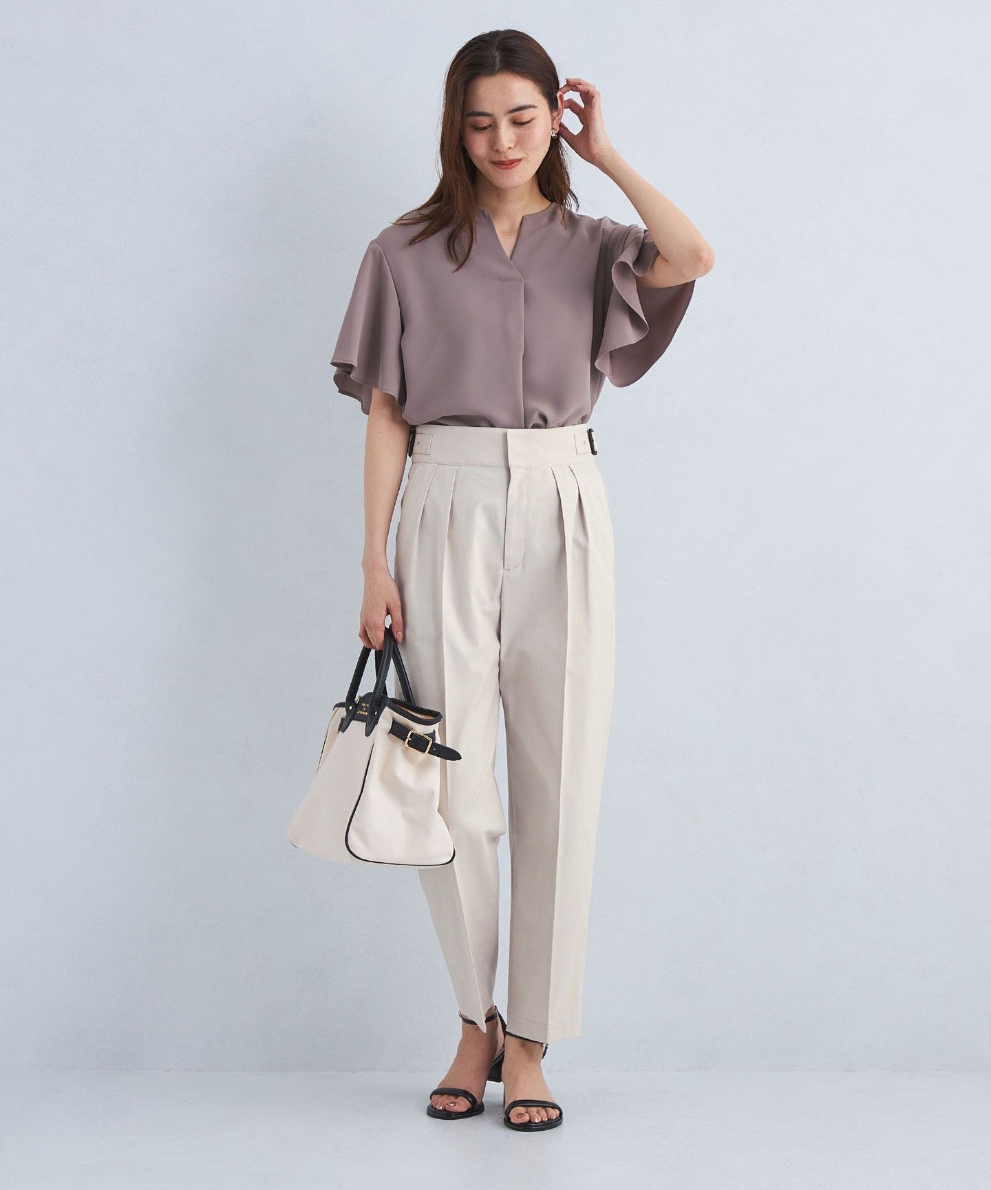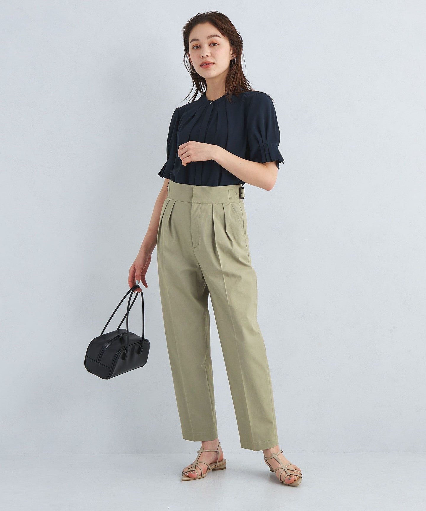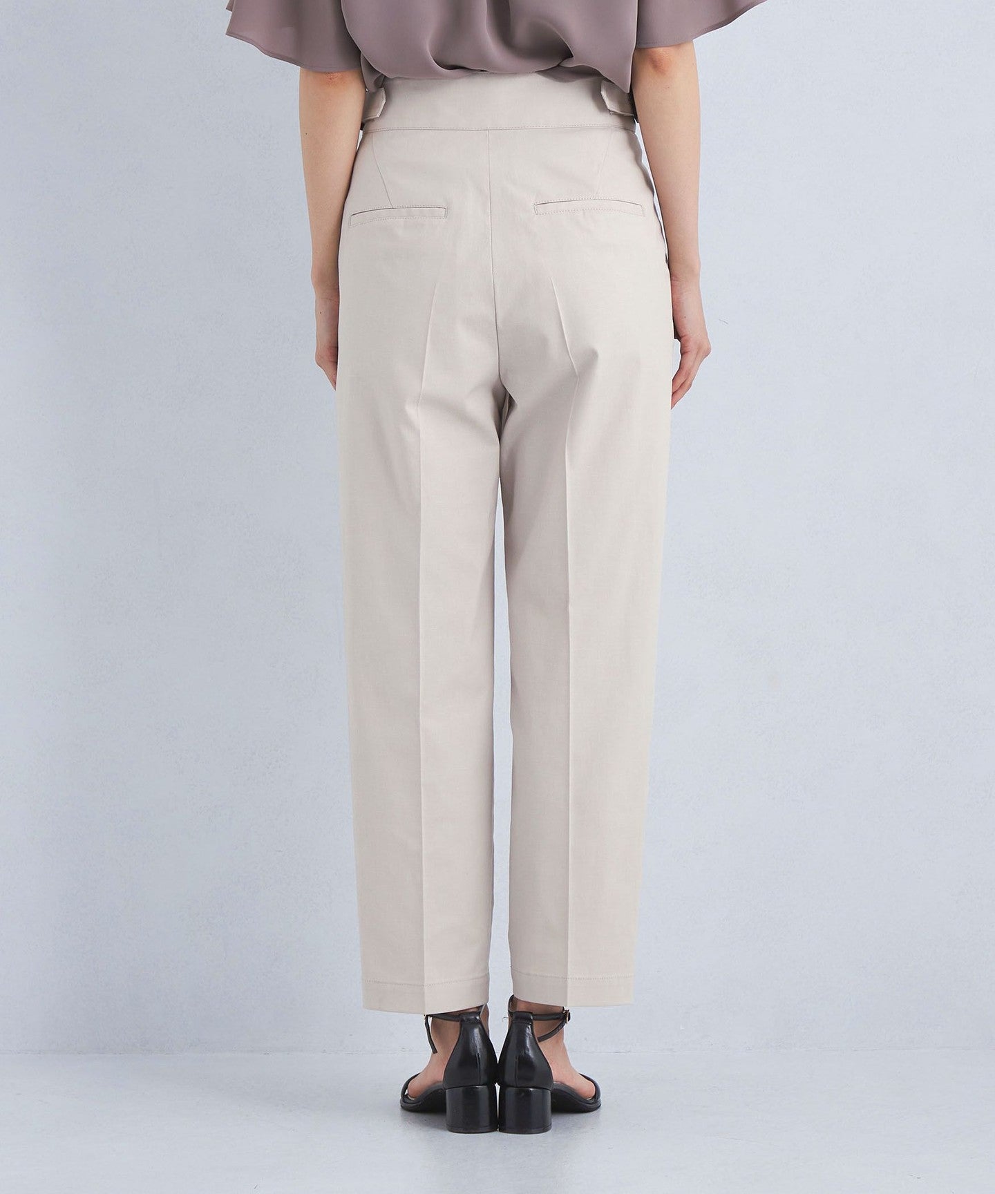 These pants have a loose fit around the waist and a silhouette that gradually tapers towards the hem.