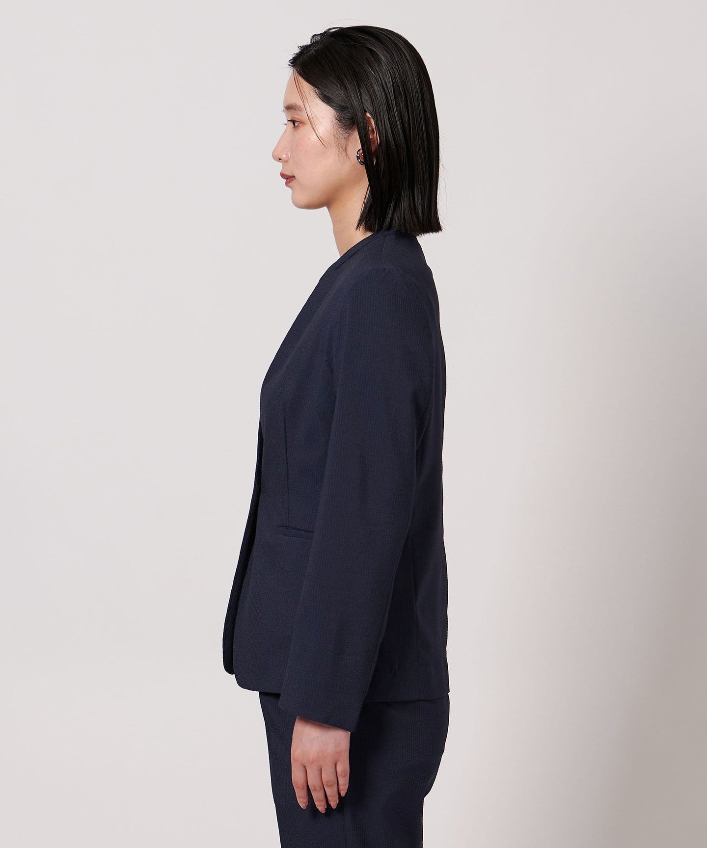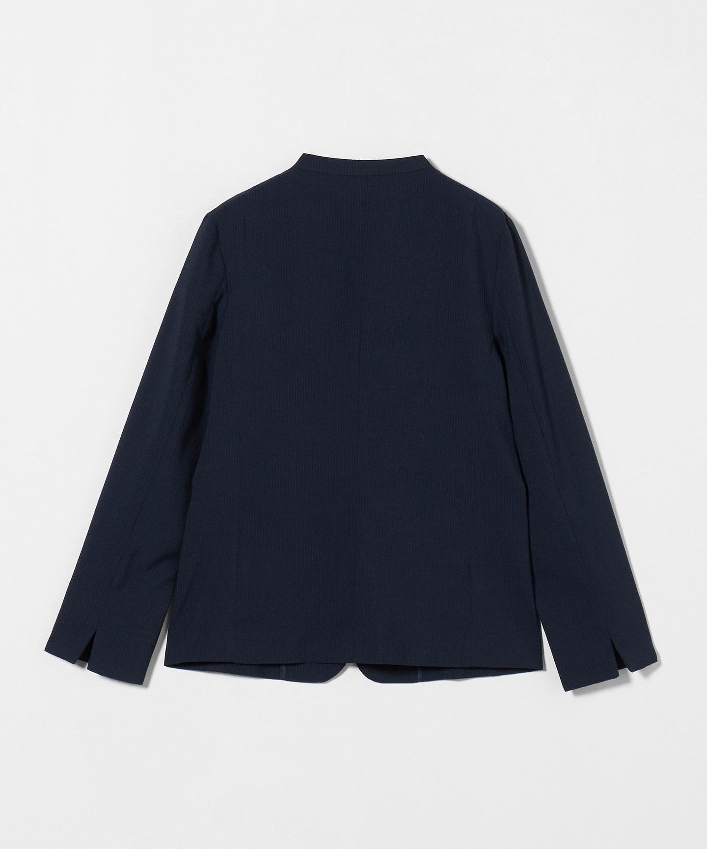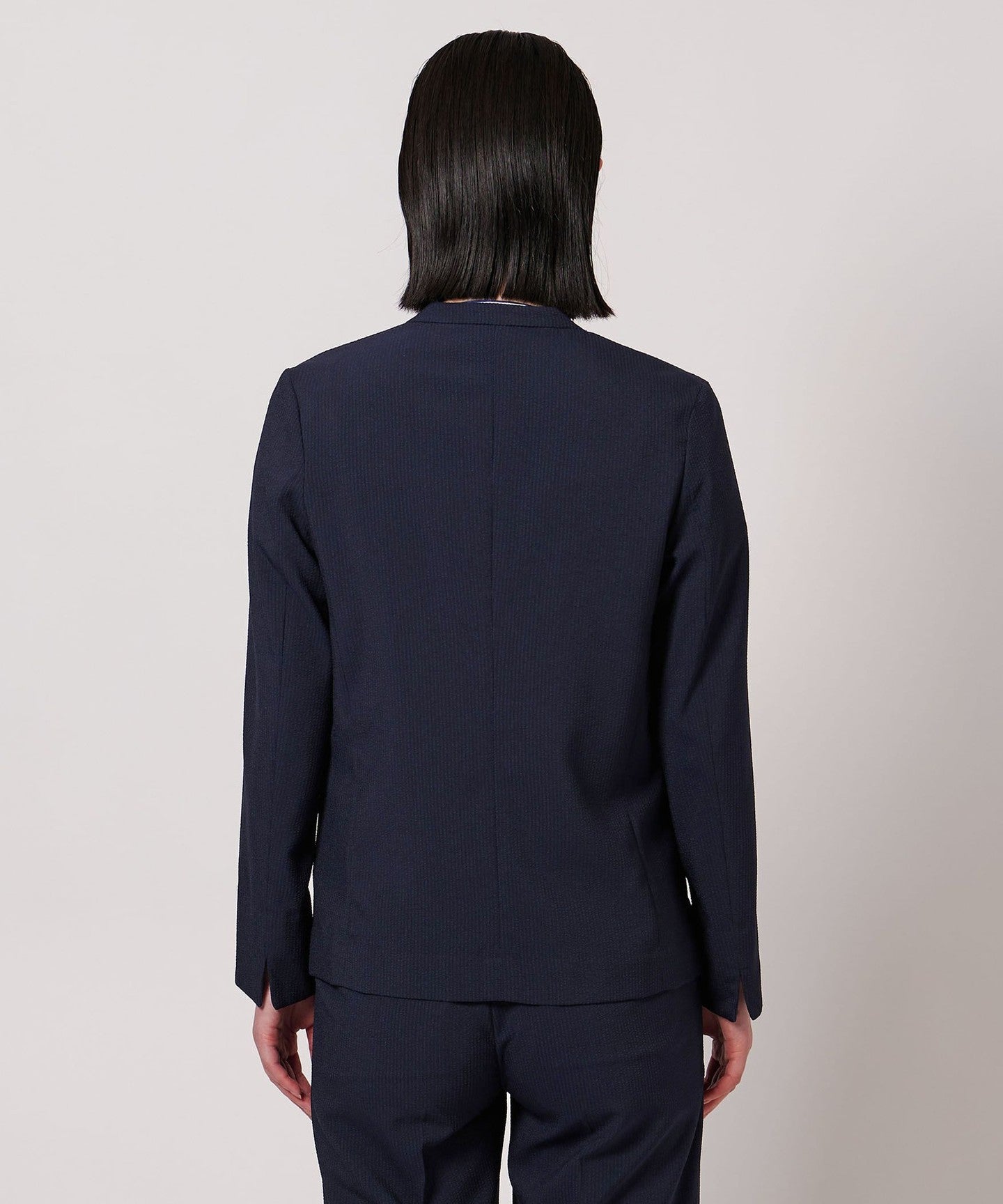 A crisp, summery seersucker collarless jacket.