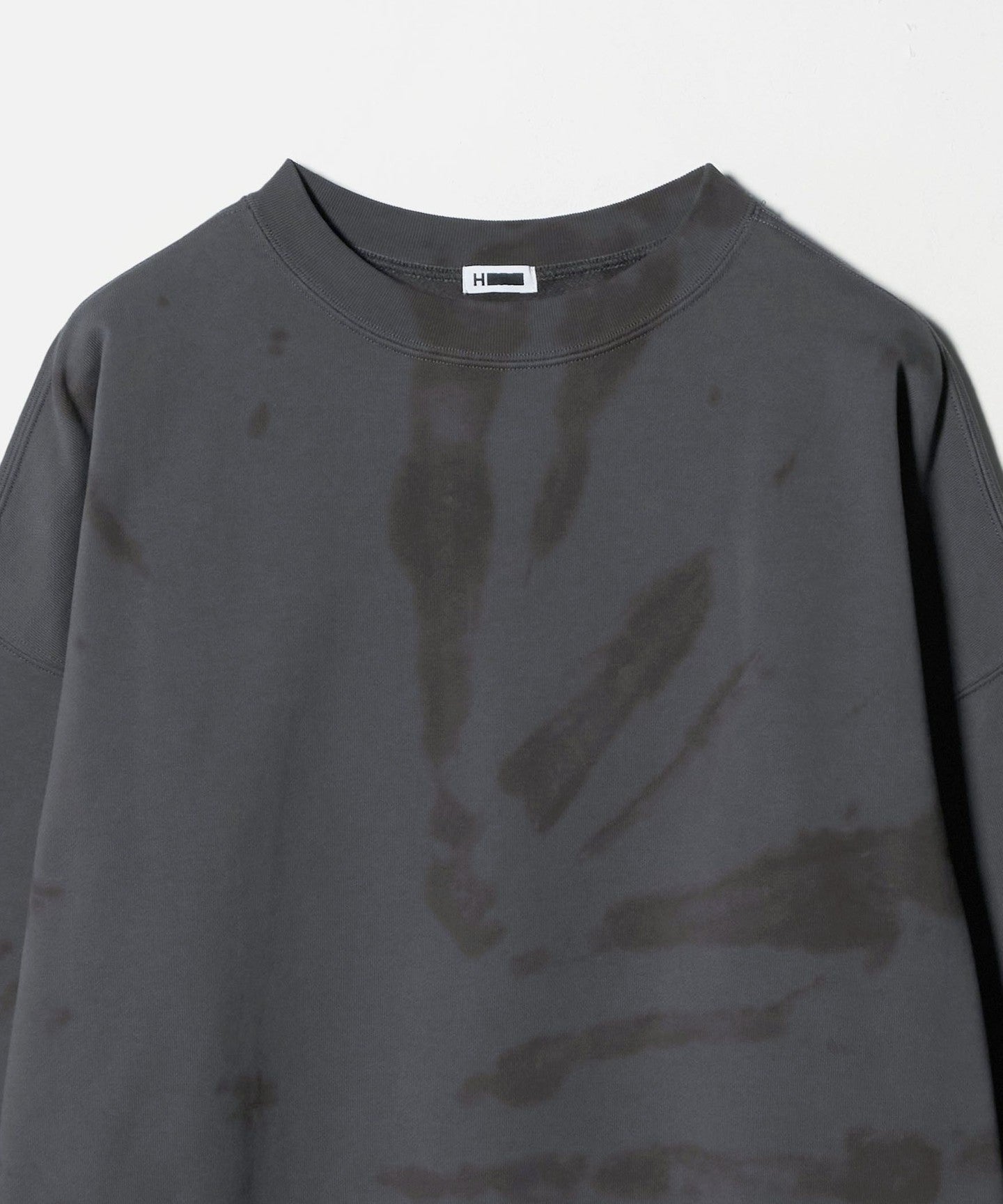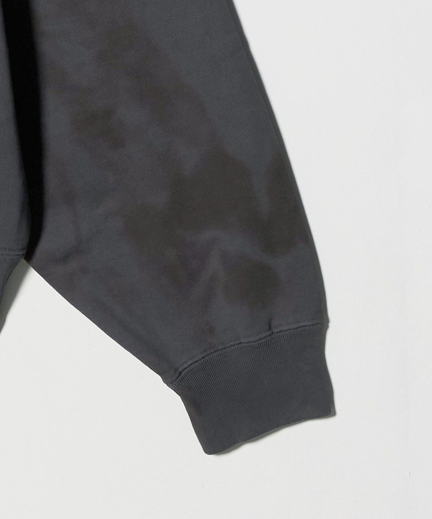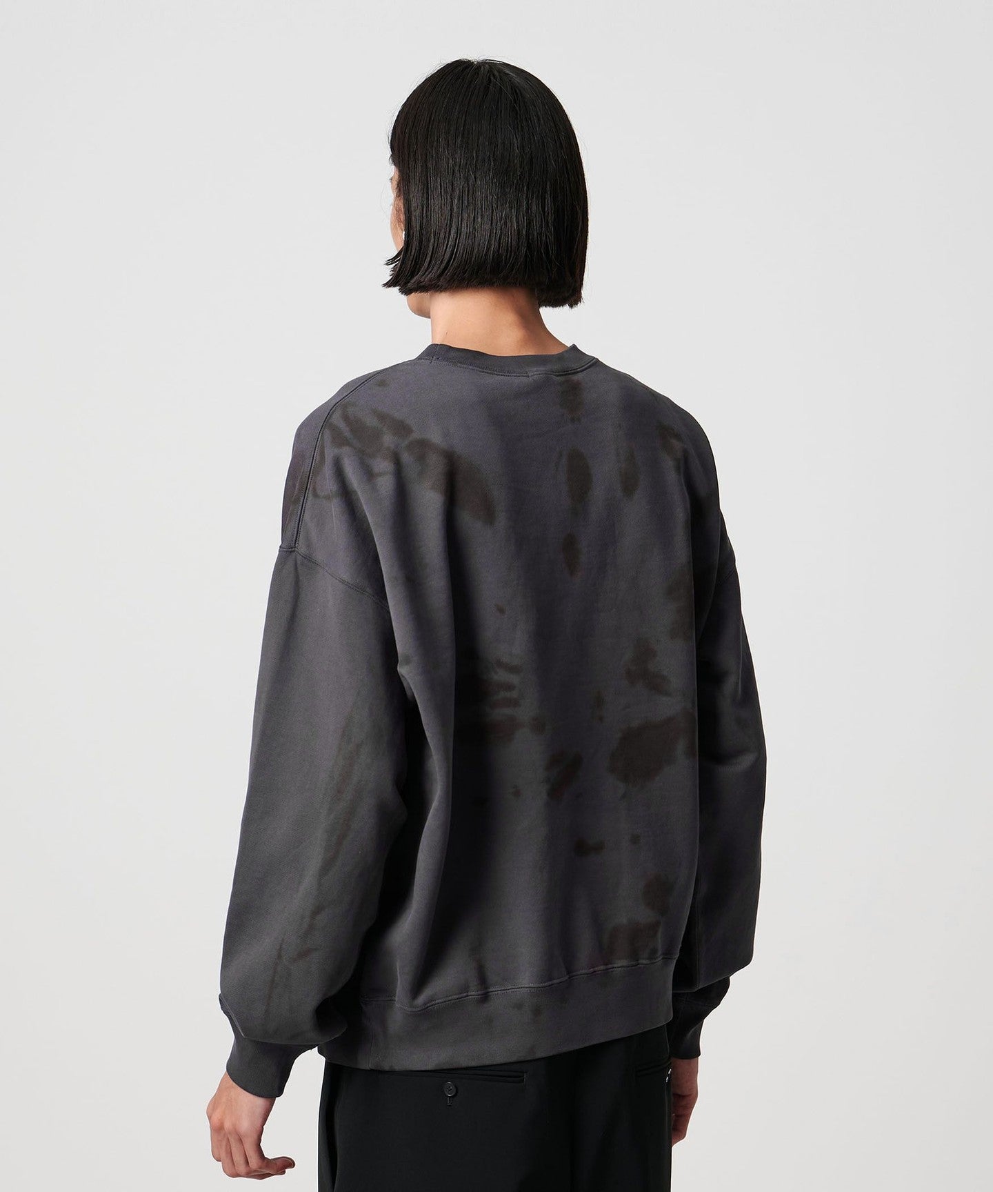 This sweatshirt pullover's eye-catching coloring and spiral pattern evokes a black hole. The clean texture of the mercerized finish and the rough dyed pattern add nuance to create a dynamic, casual feel, creating a fresh look. The relaxed, wide silhouette is cinched in with ribbing to create a rounded body, creating a comfortable balance that creates a sharp look. It adds just the right amount of casualness and impact to your outfit, leading to a free and unpretentious urban style.