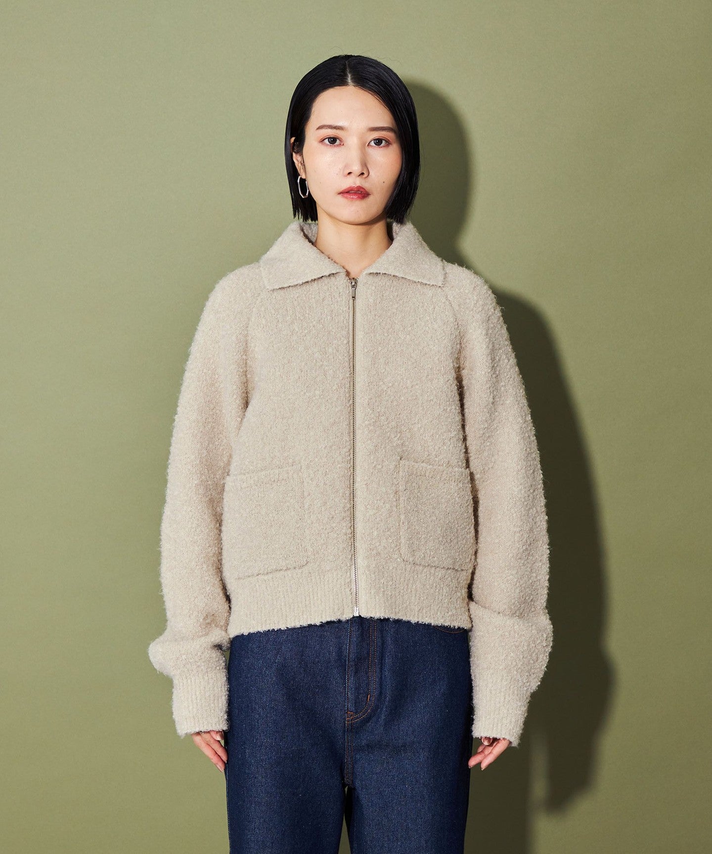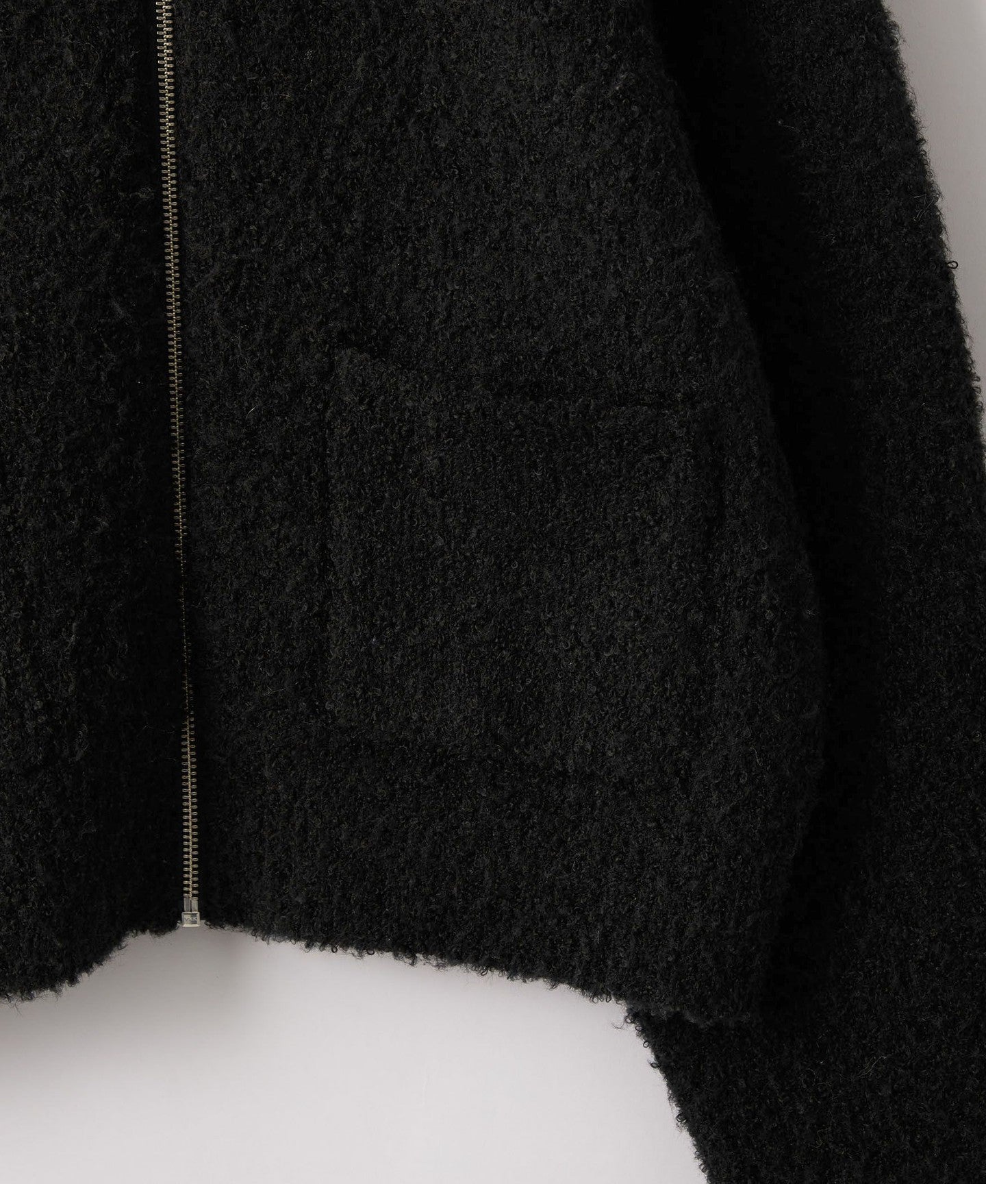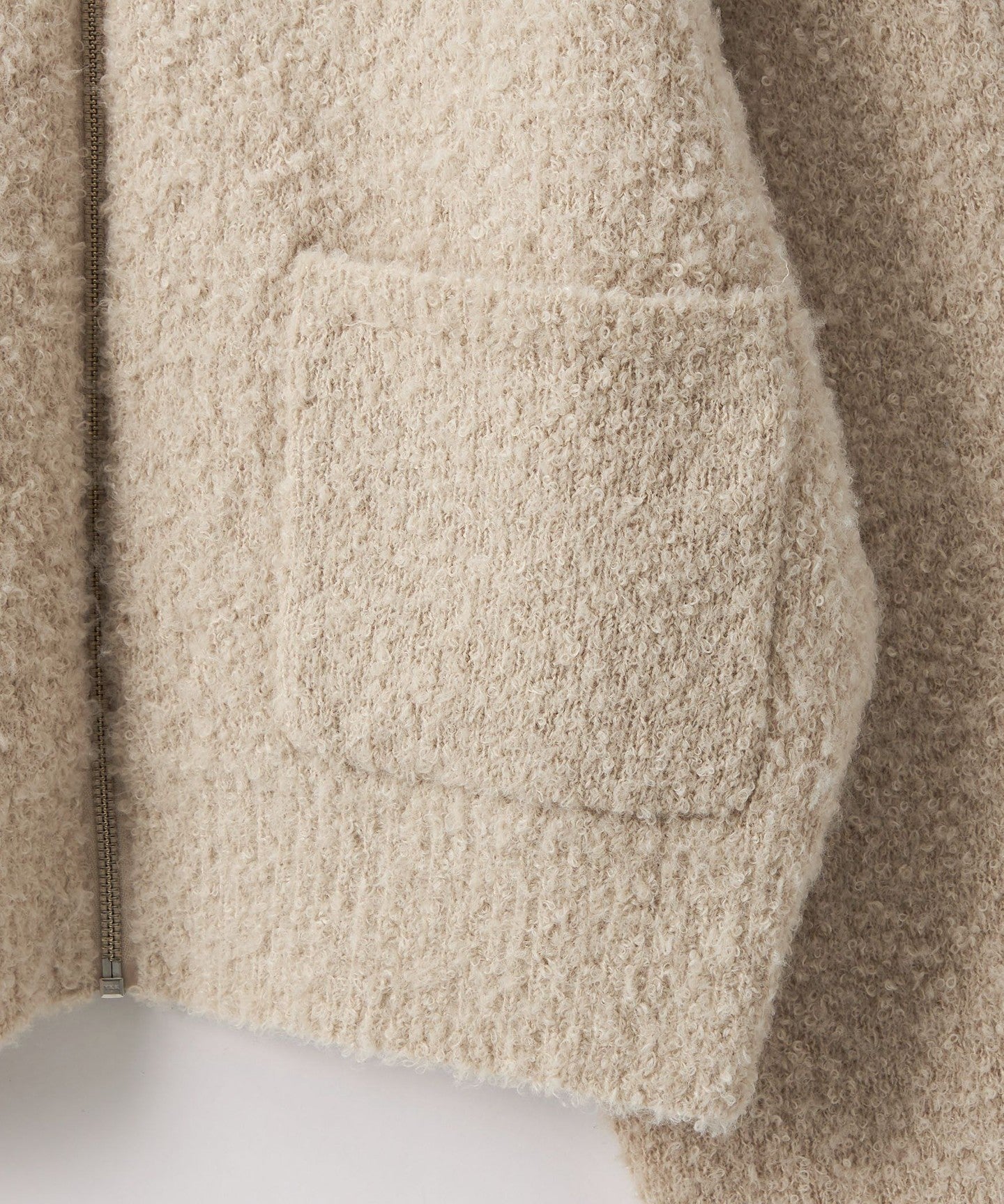 It is knitted in double phases using textured boucle yarn and straight yarn, so it is thick and the warm texture of the boucle is a highlight.
