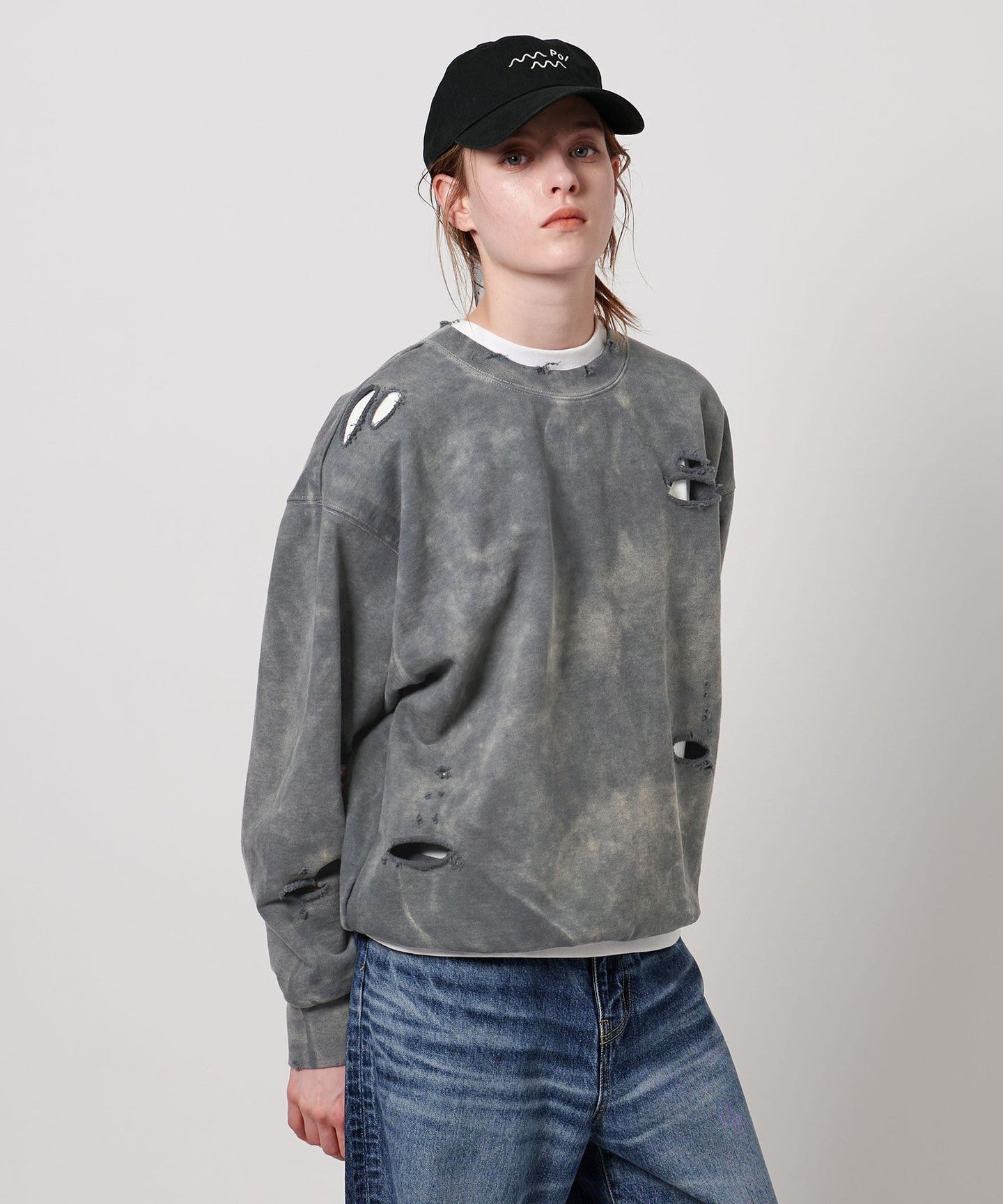 A crew neck sweatshirt featuring a unique uneven texture and distressed finish created by acid processing.