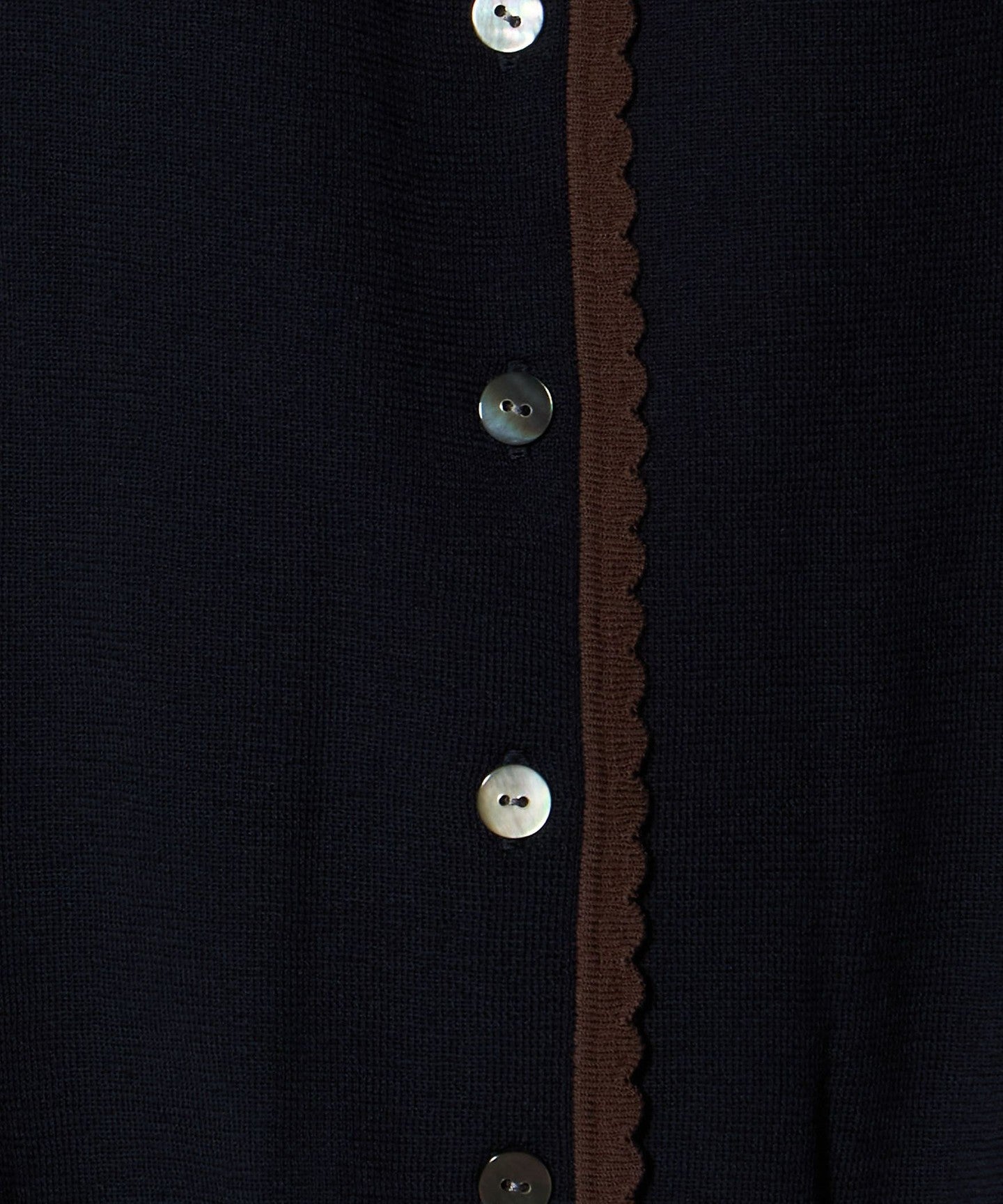 The striking design features contrasting color scallops from the collar to the edge of the placket.