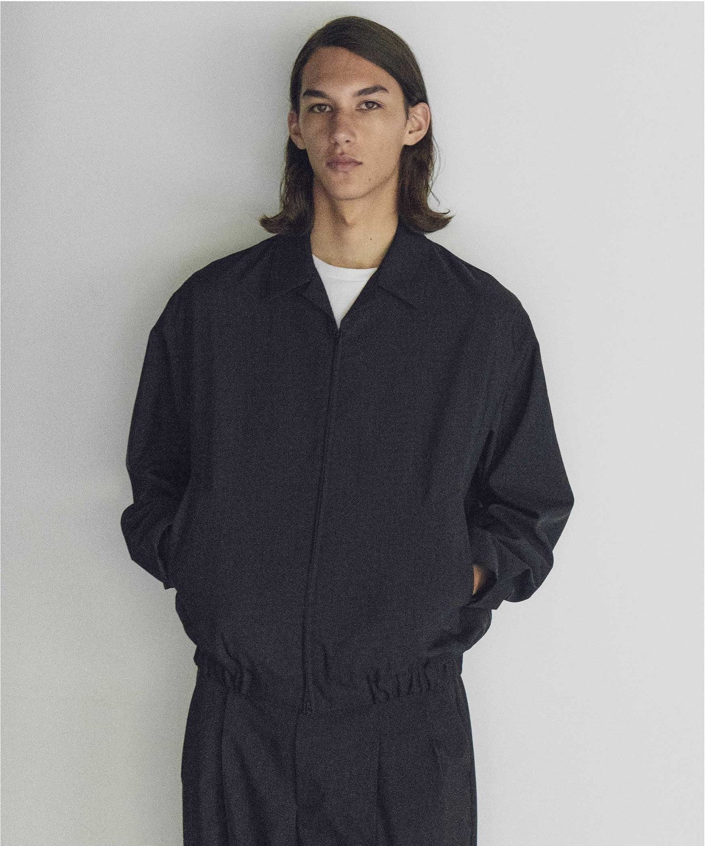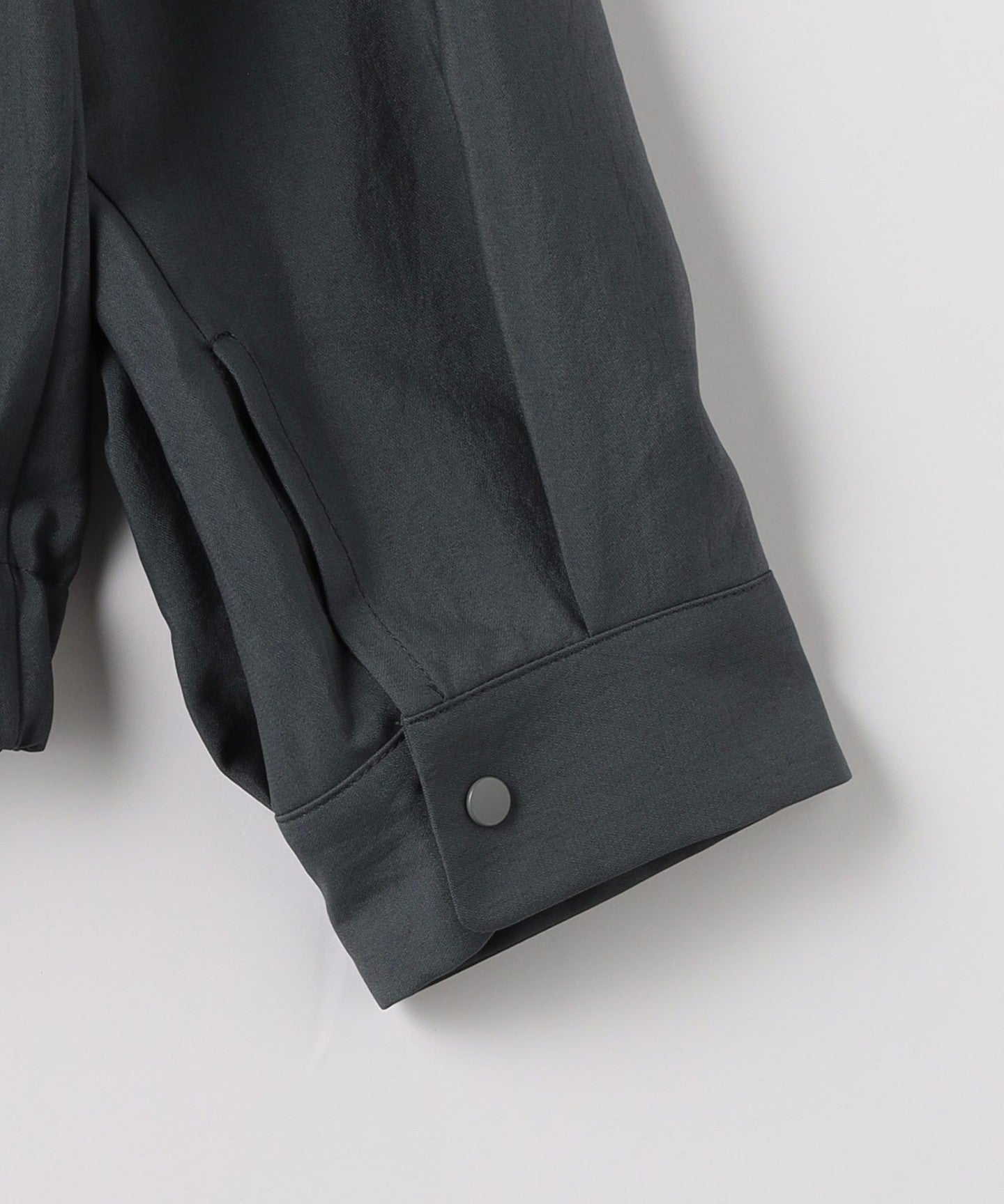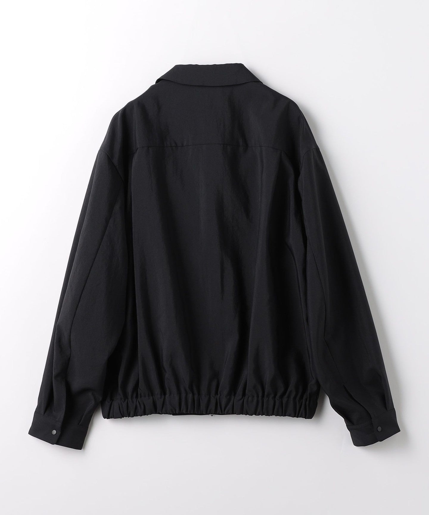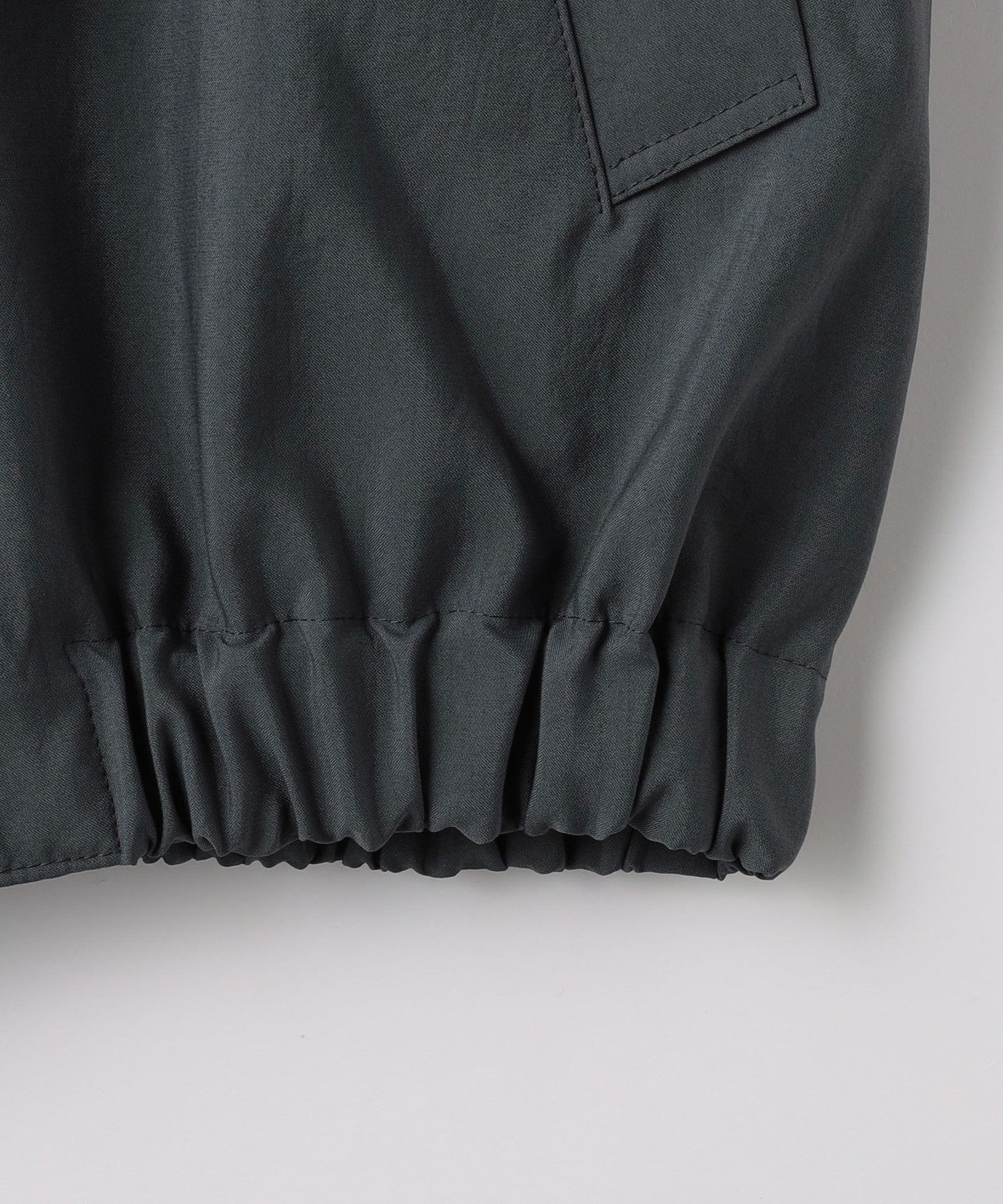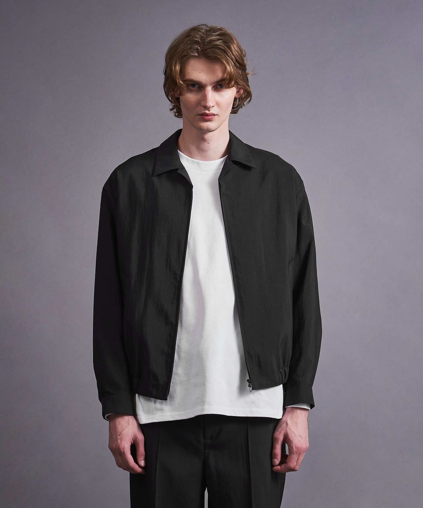 A front-zip blouson made of back satin fabric woven with polyester thread.
