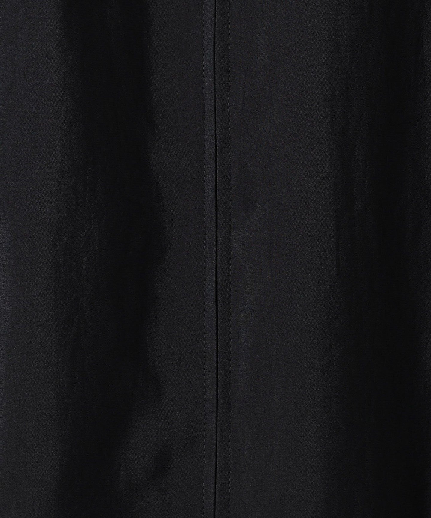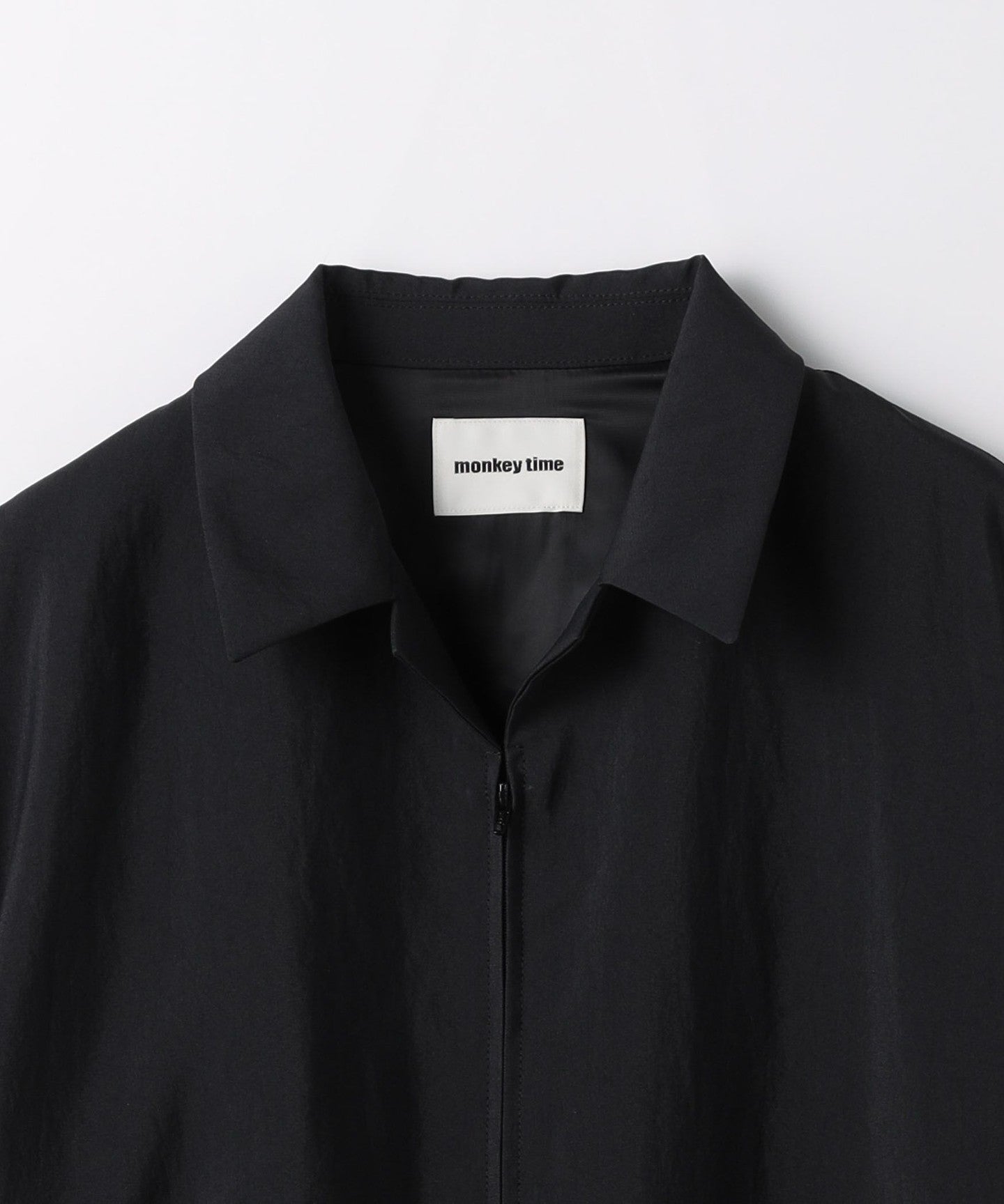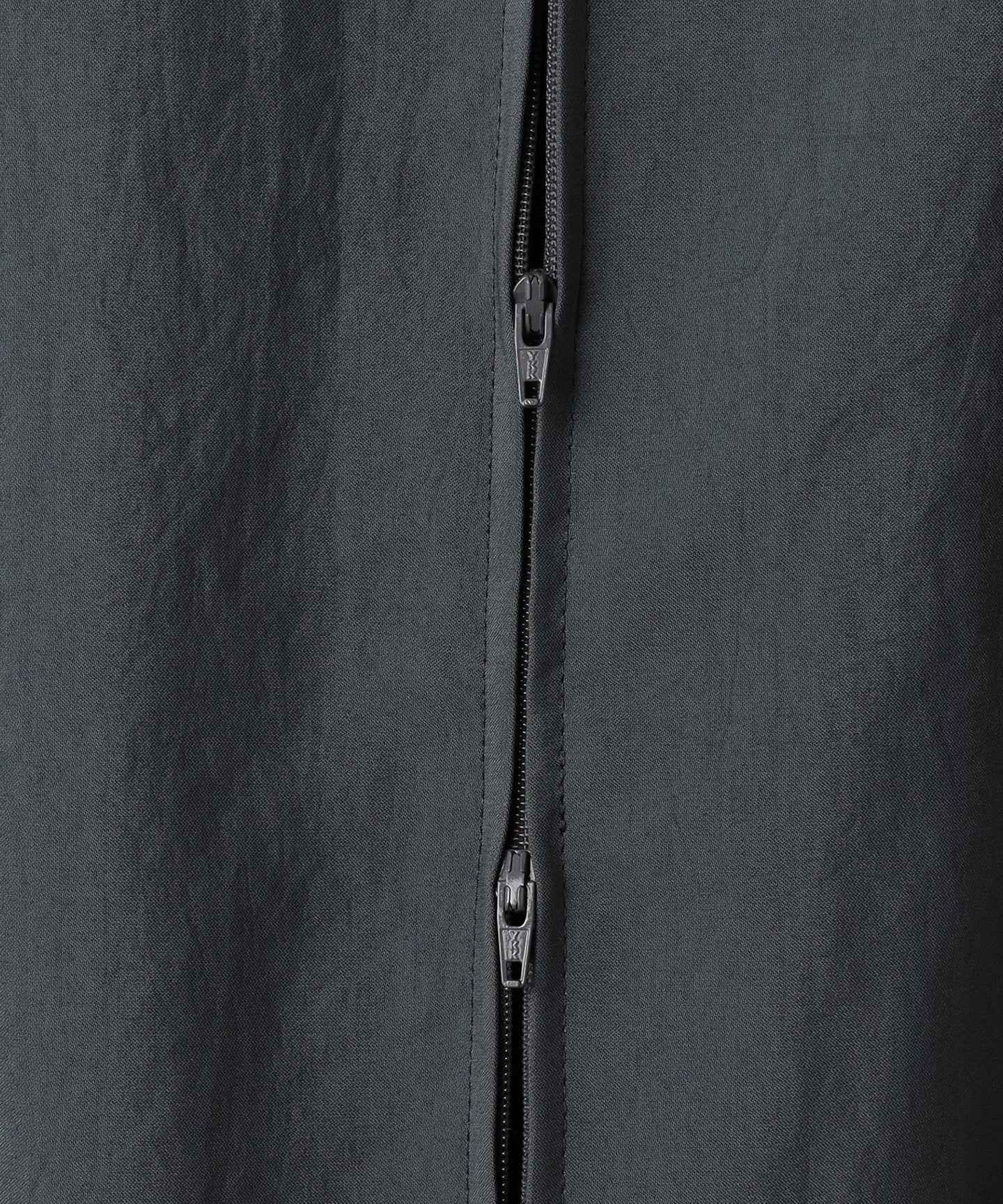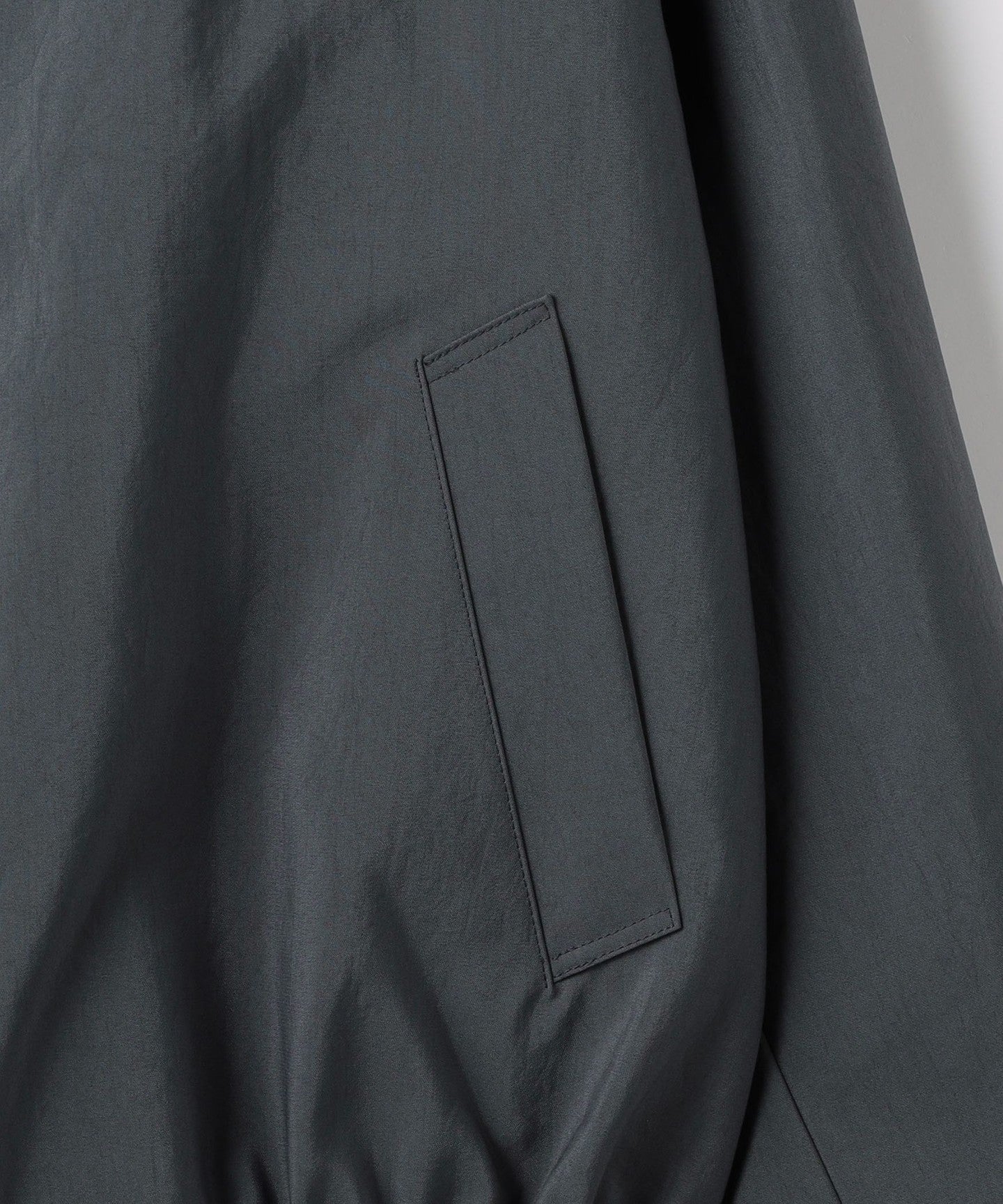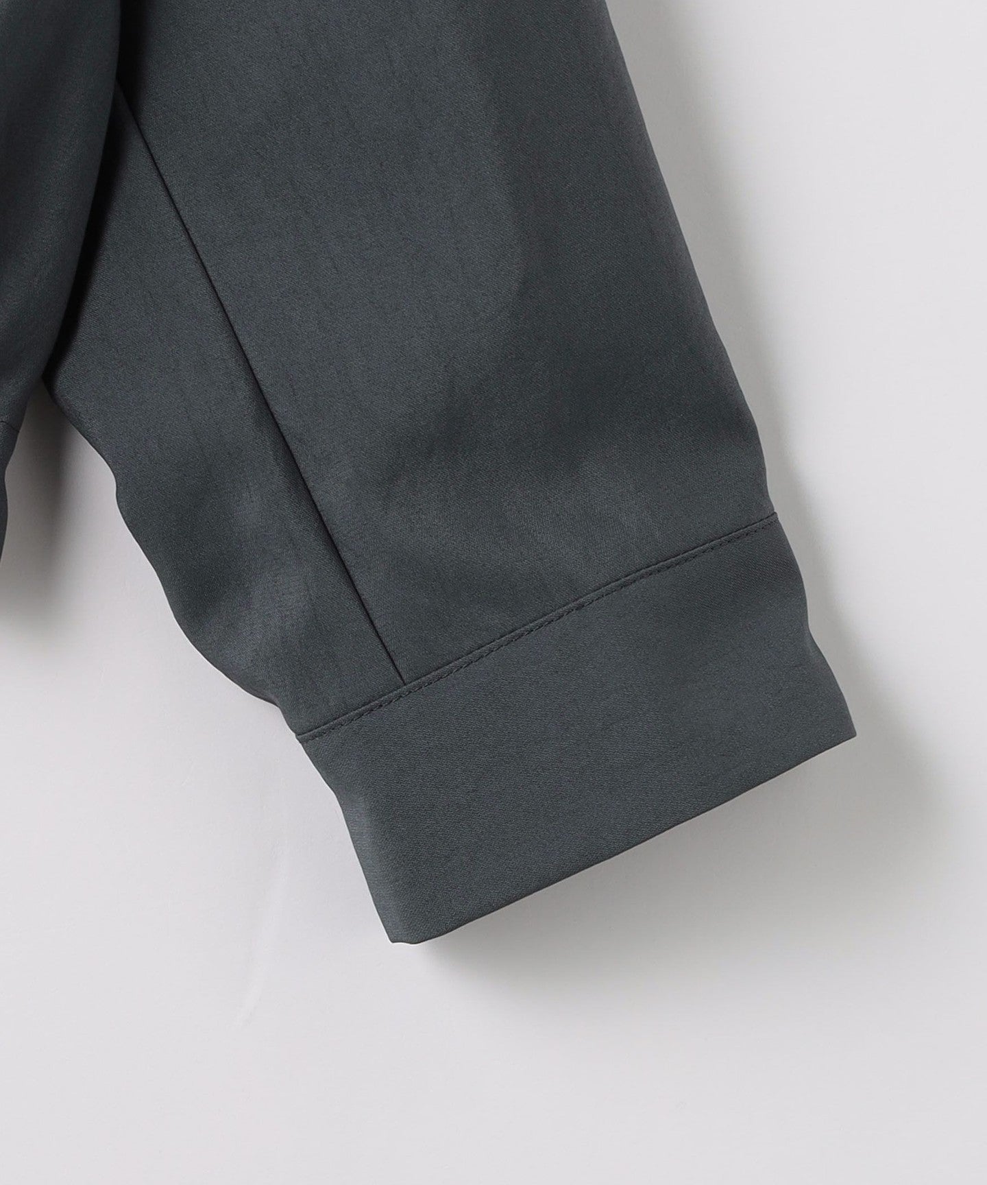 A front-zip blouson made of back satin fabric woven with polyester thread.