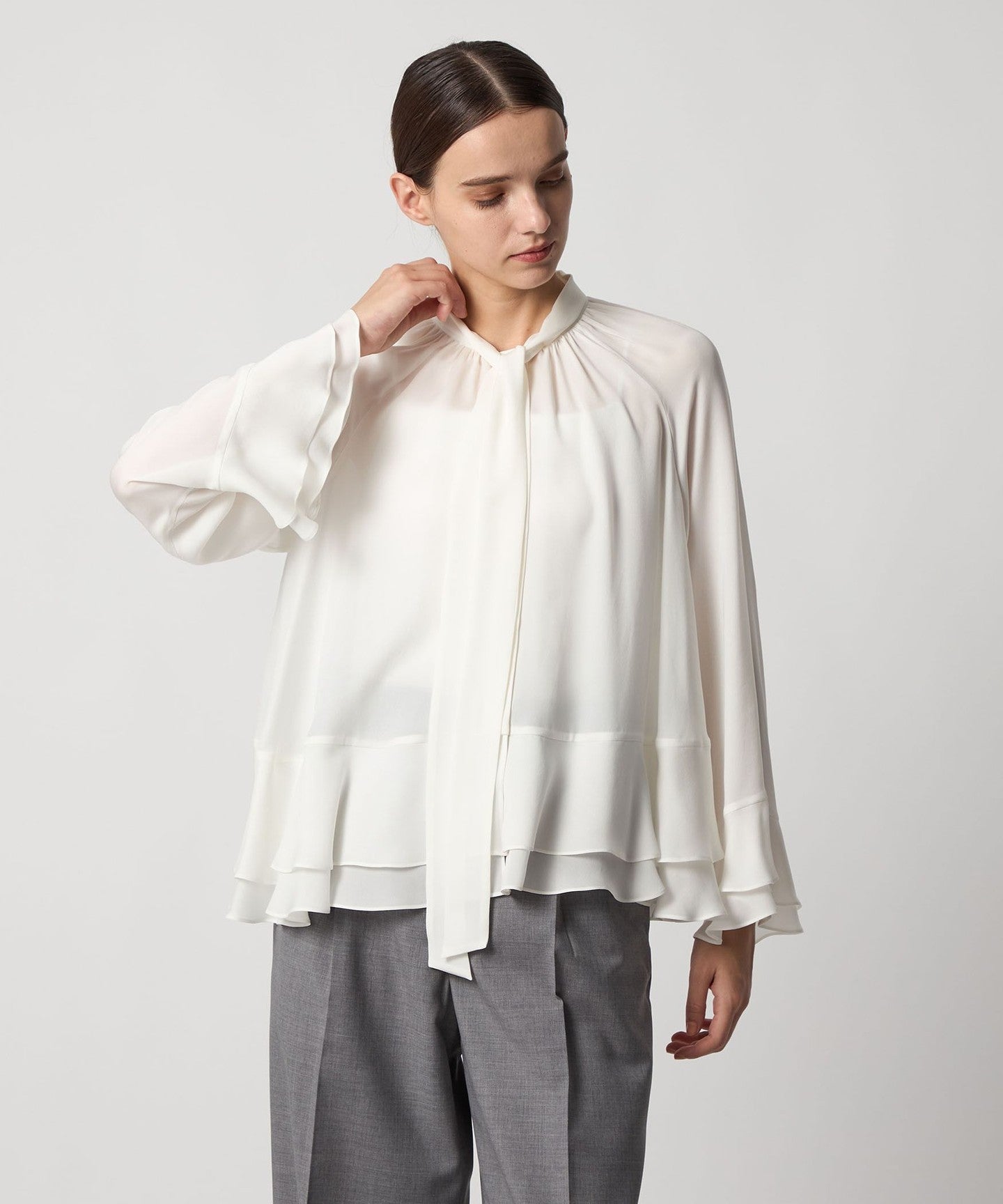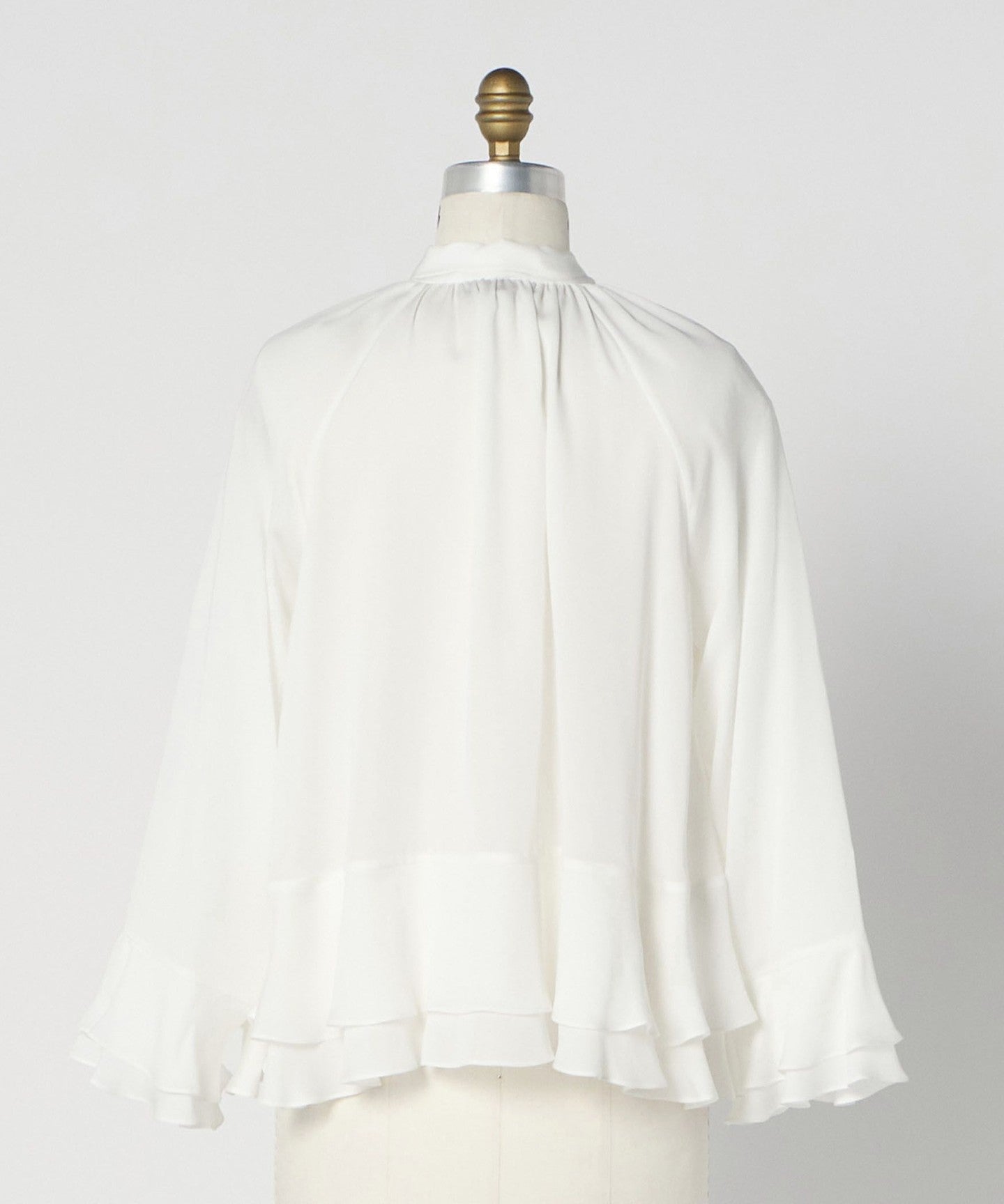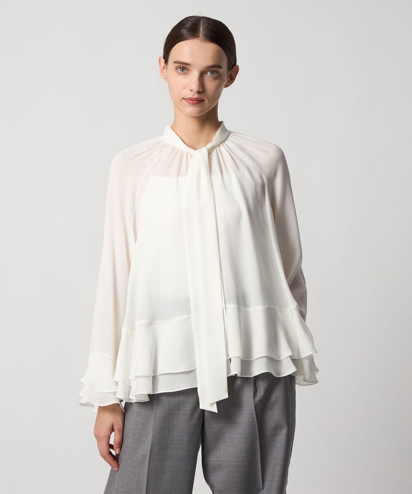 This blouse features tiered cuffs and hem that add a subtle touch of elegance.