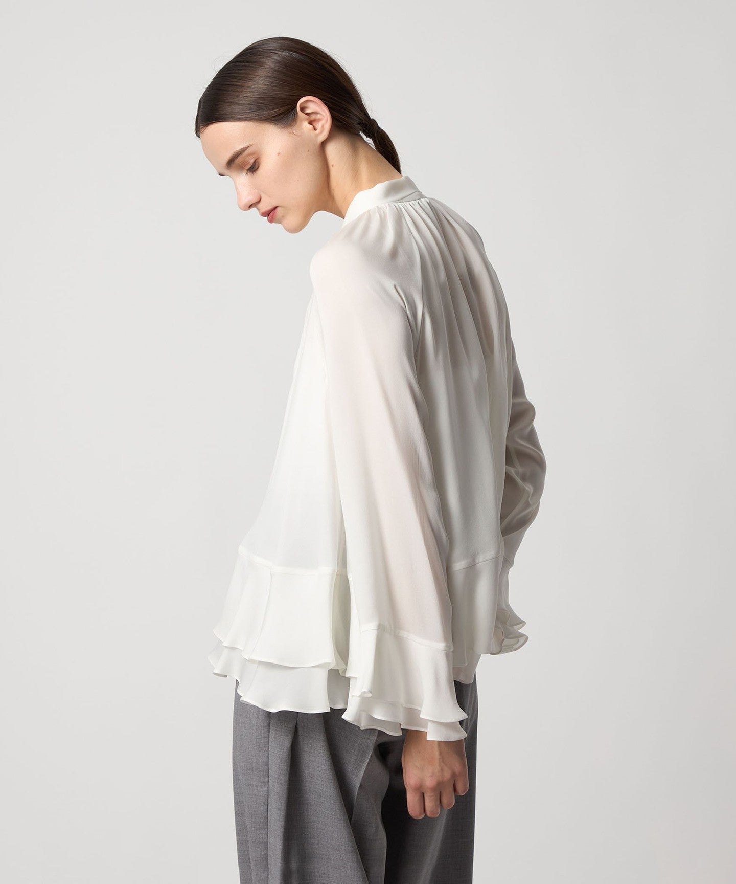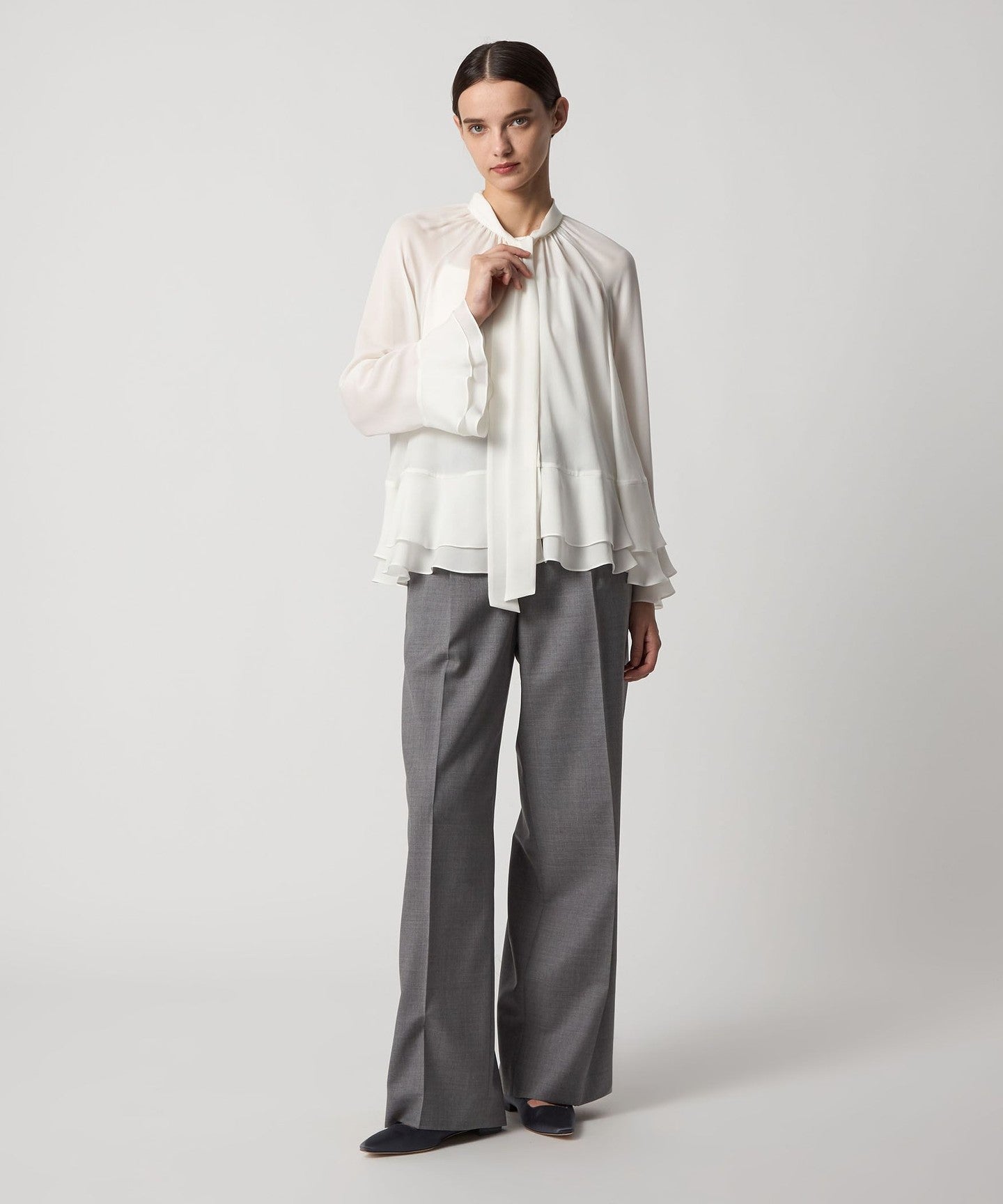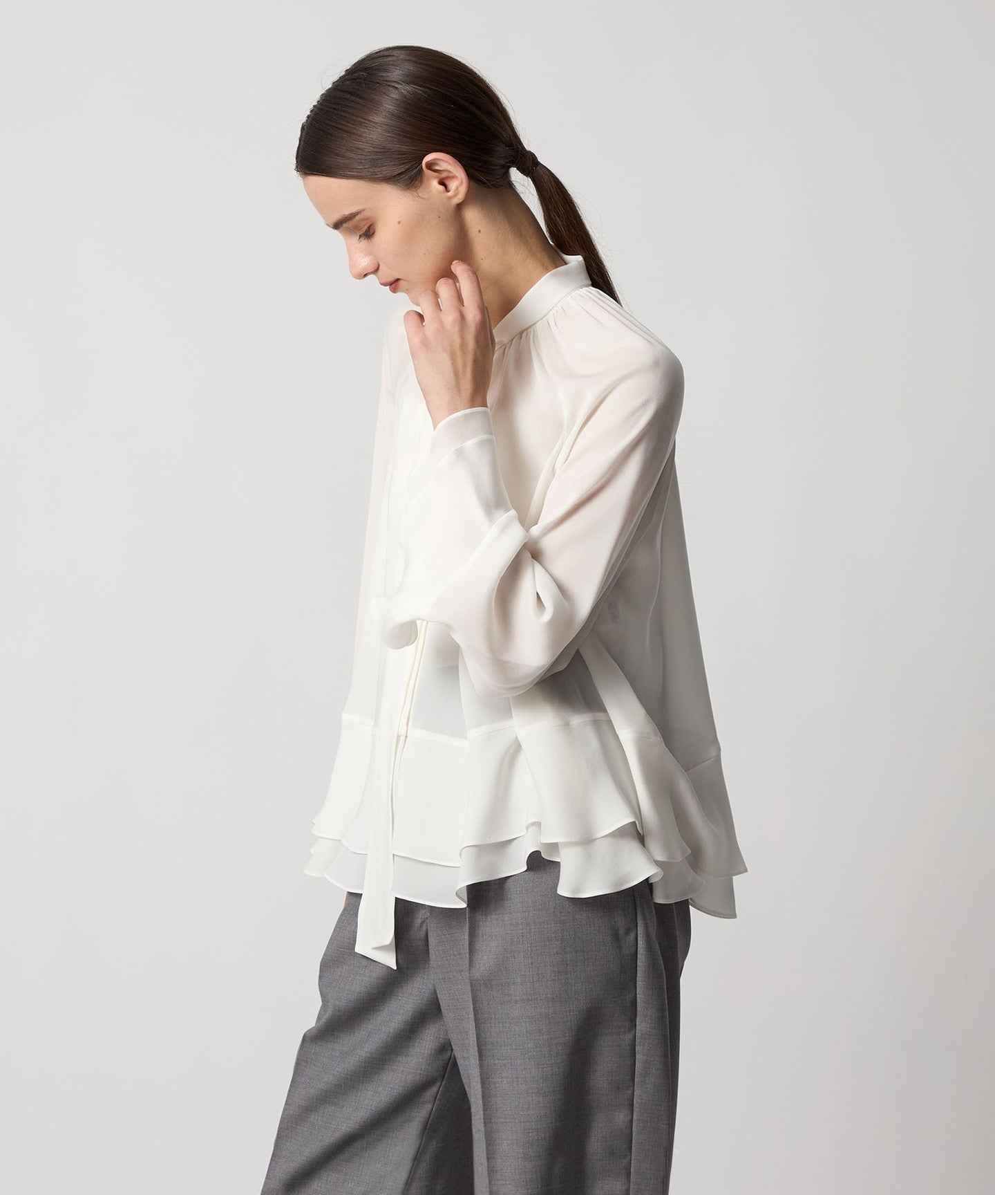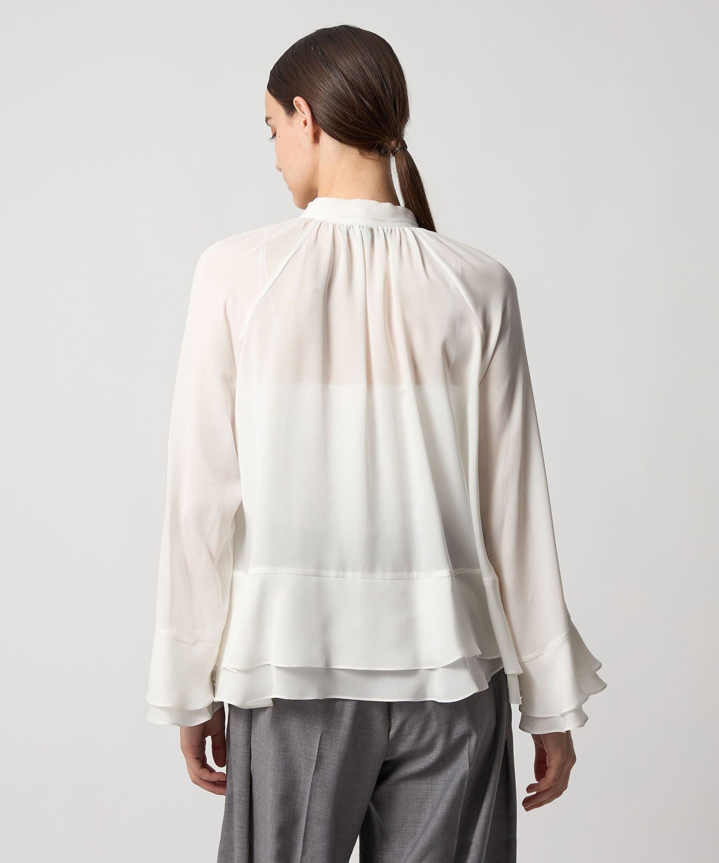This blouse features tiered cuffs and hem that add a subtle touch of elegance.