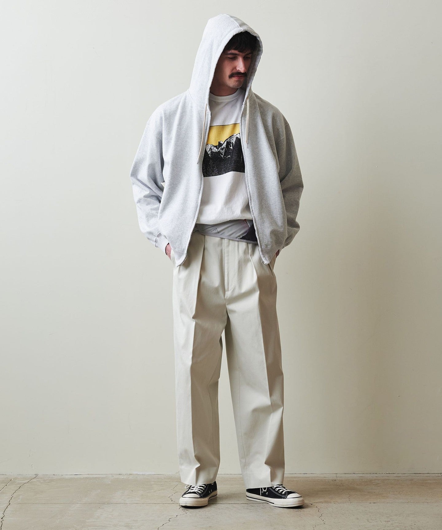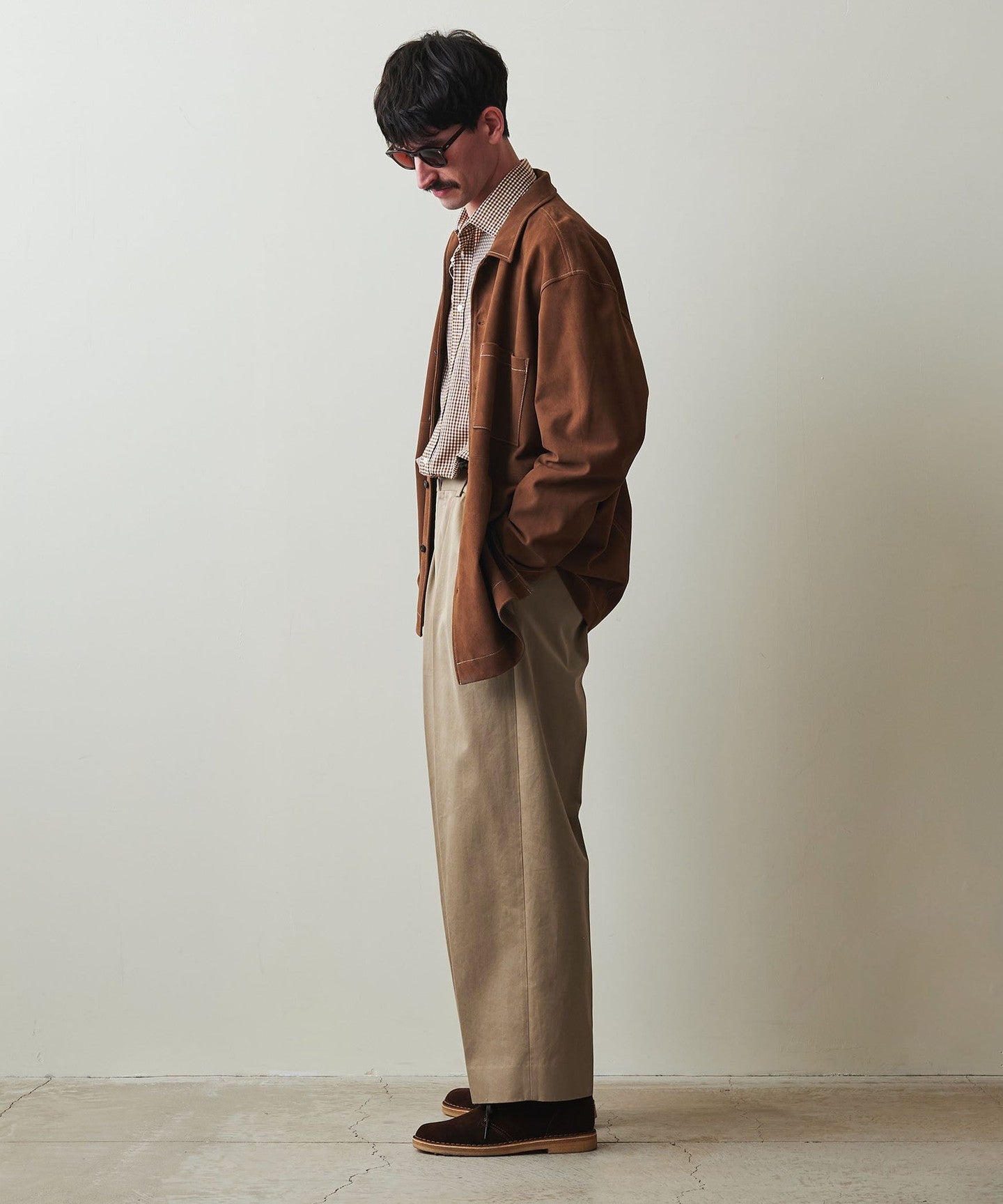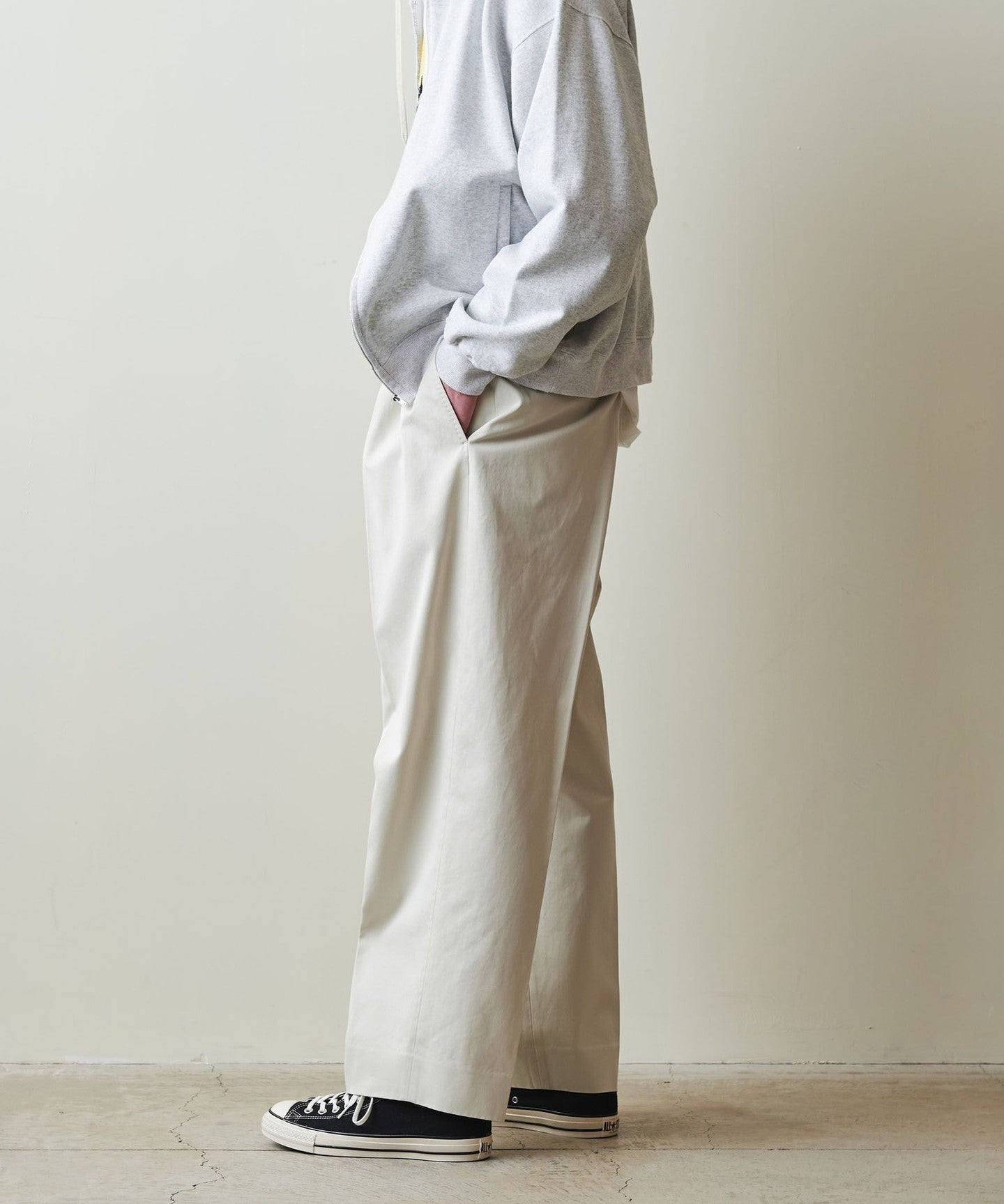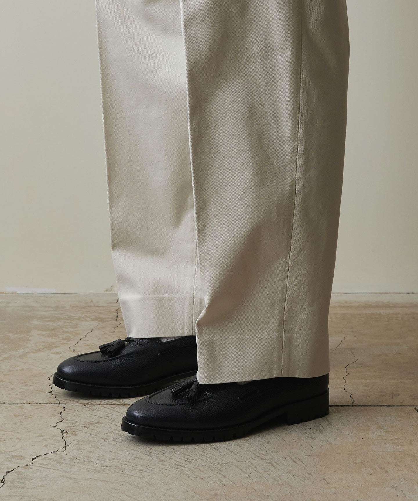 The rise is set loose and deep, with a gently tapered, wide silhouette.