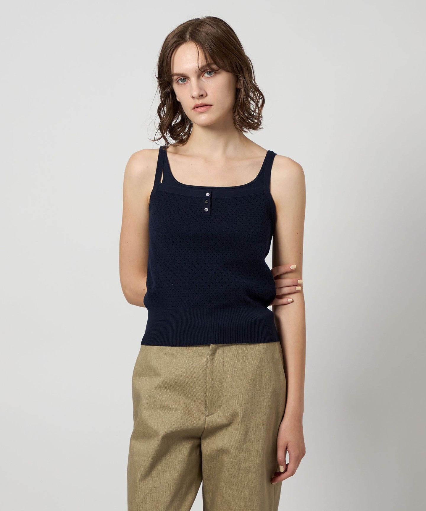 A knit camisole with a border-like eyelet pattern.