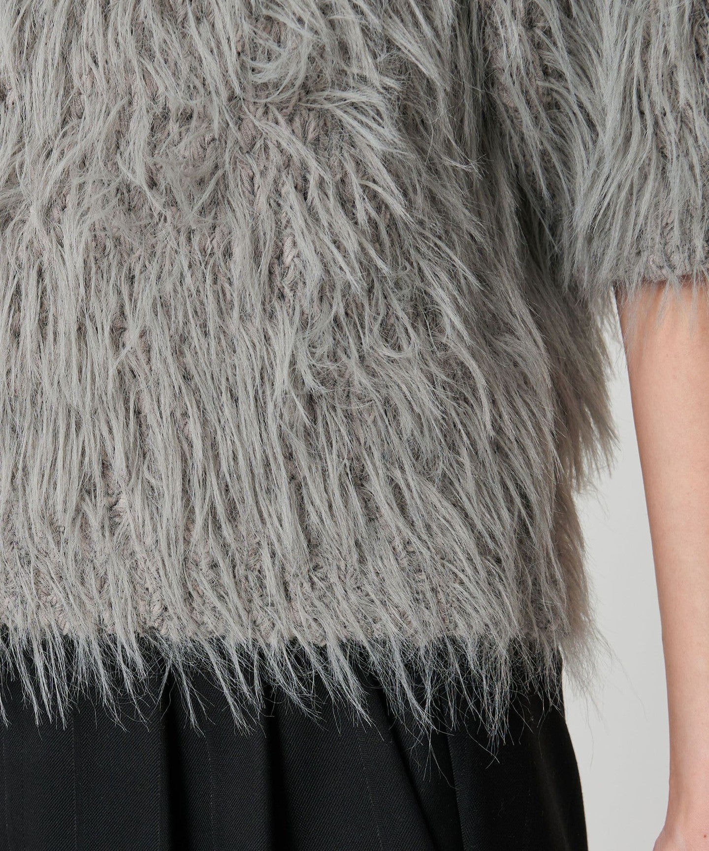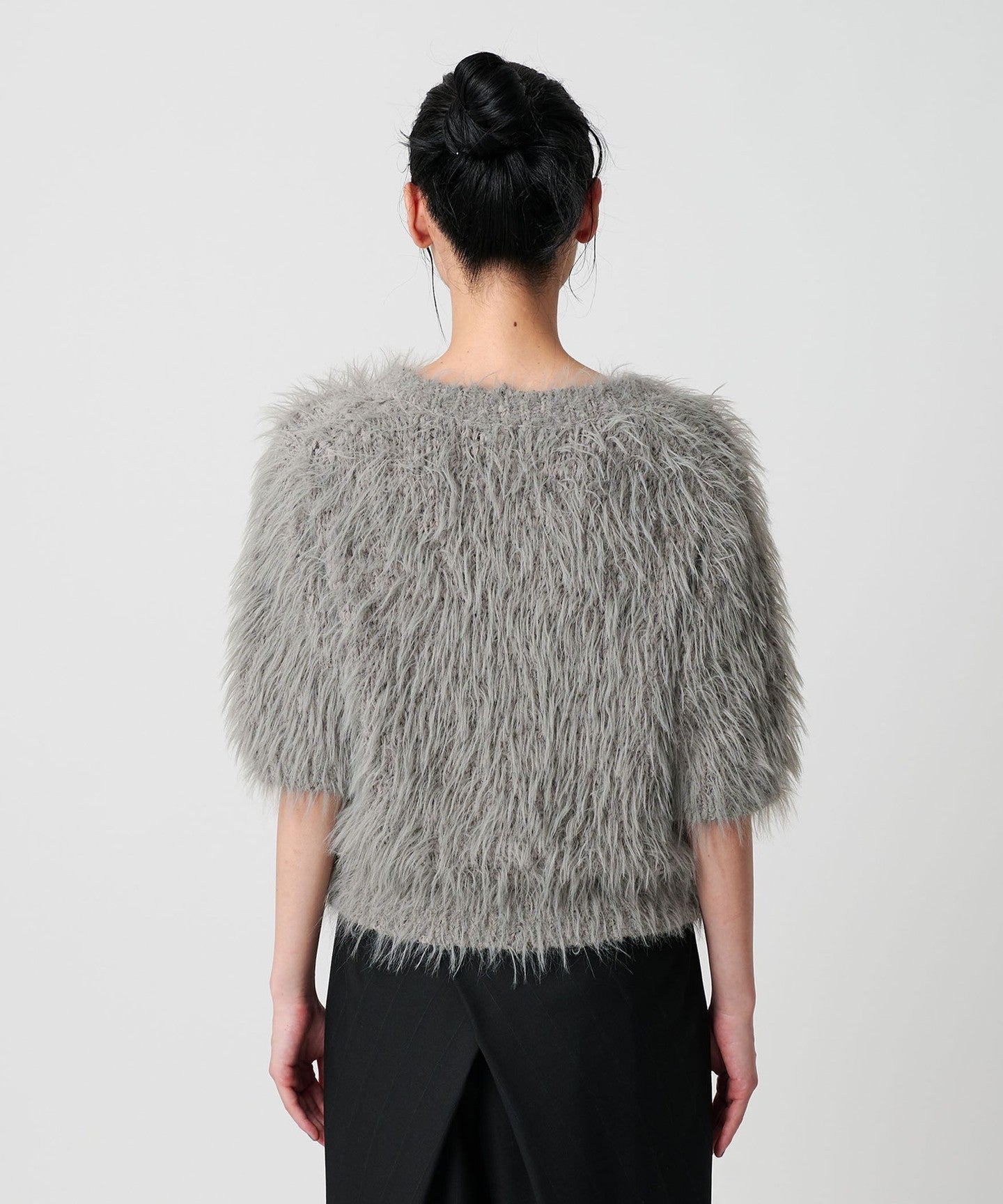 A short-sleeved knit made with feather yarn that has an adorable look.