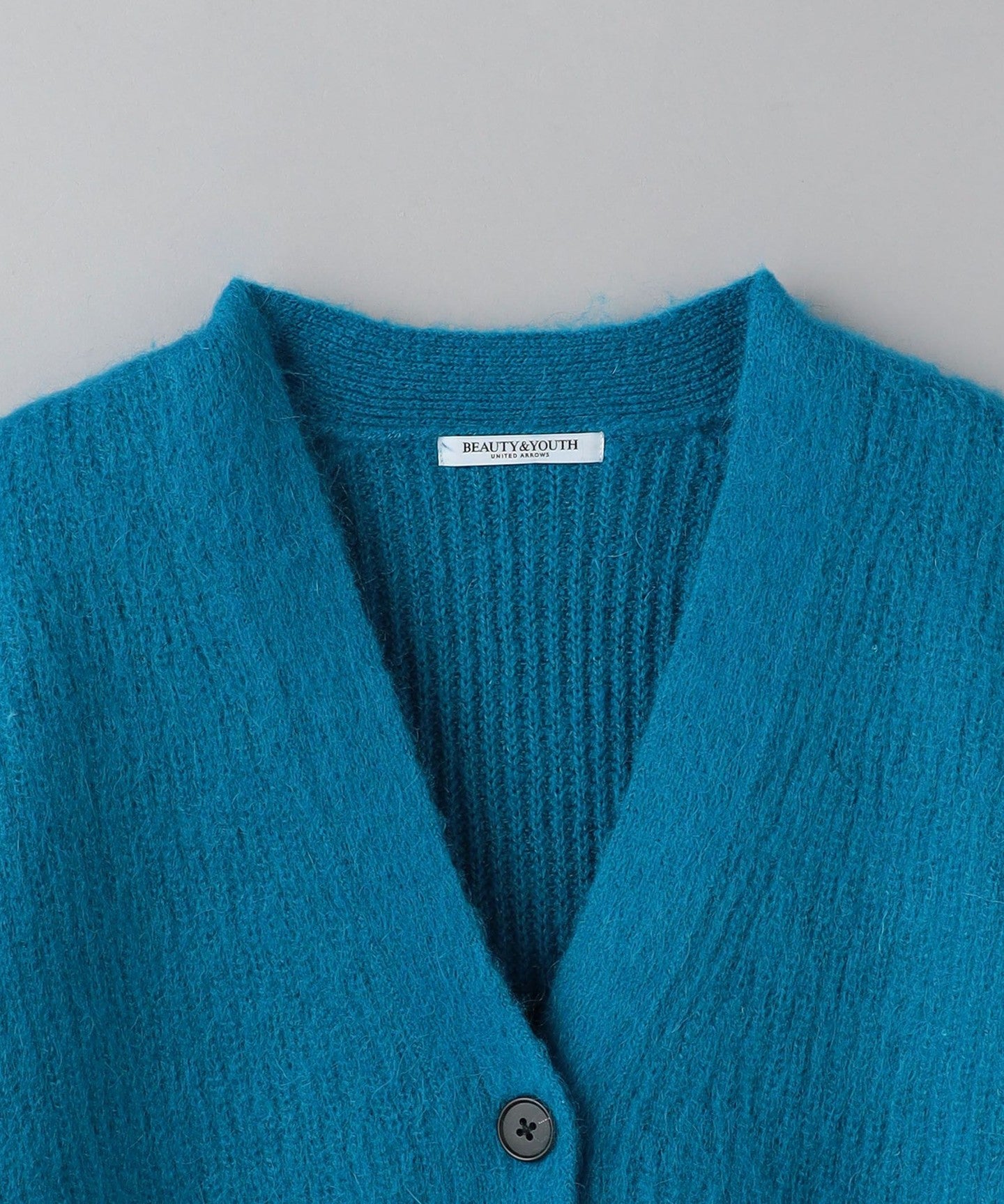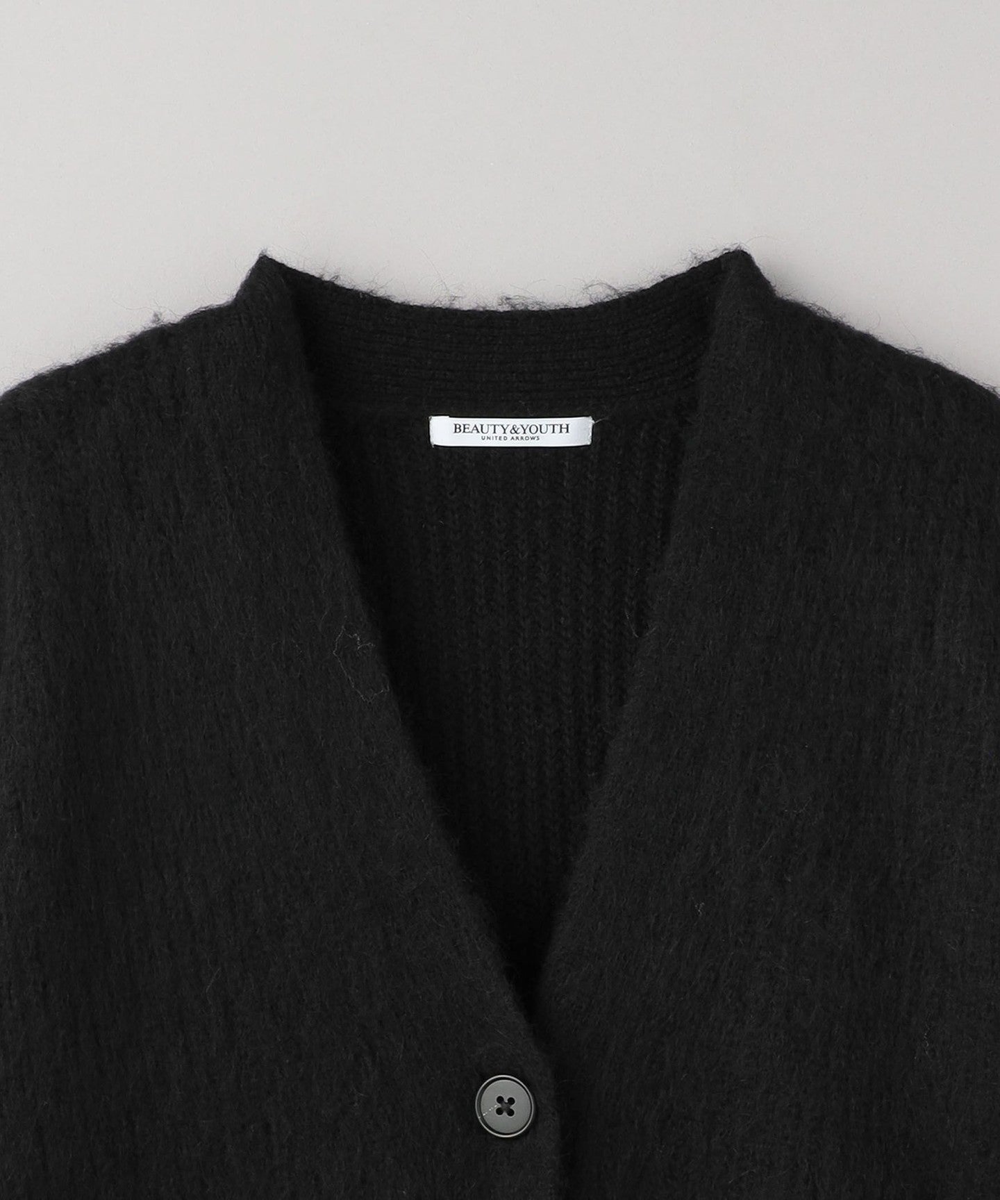 This cardigan is made from a shaggy mohair blend yarn knitted in a rib pattern.