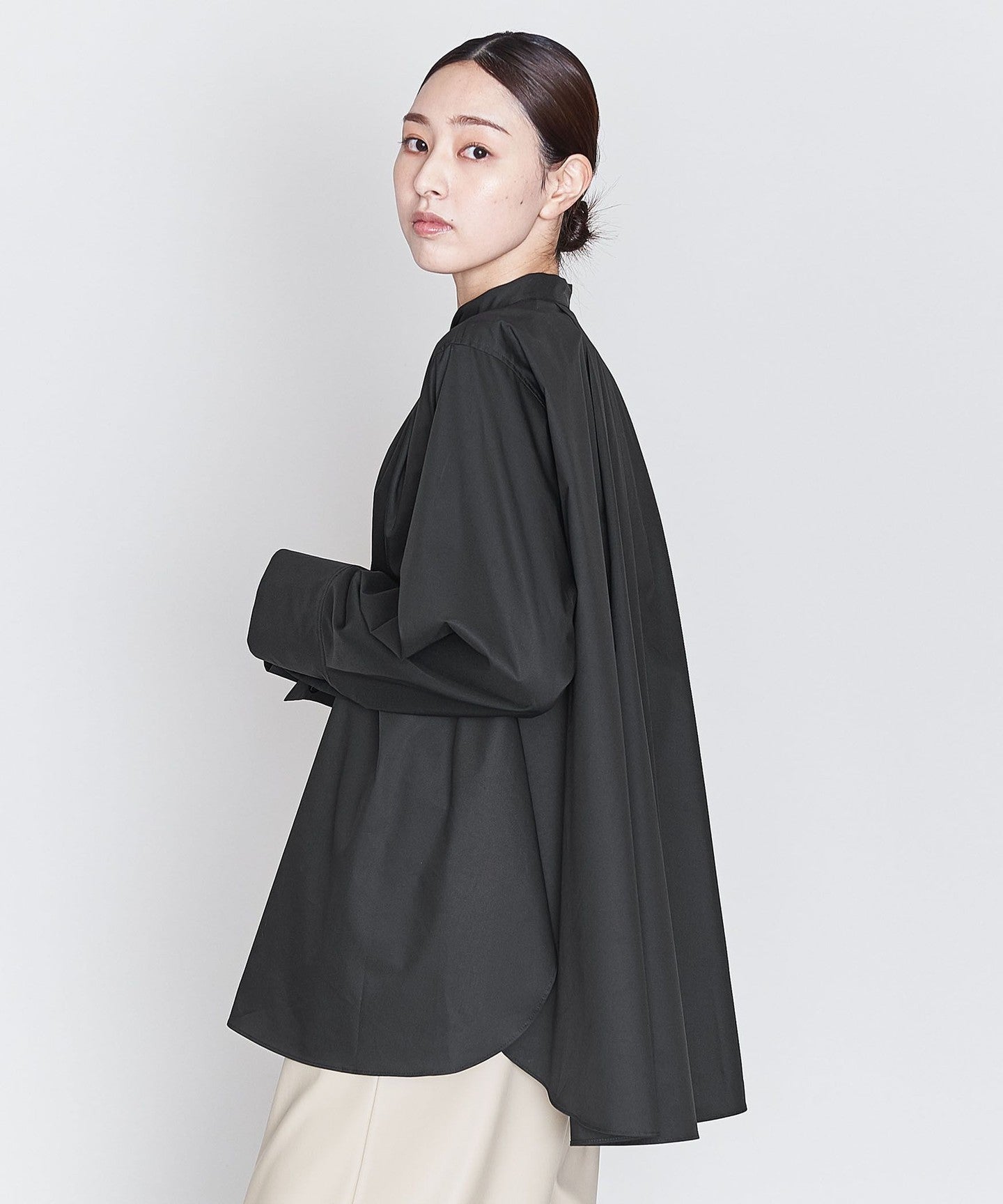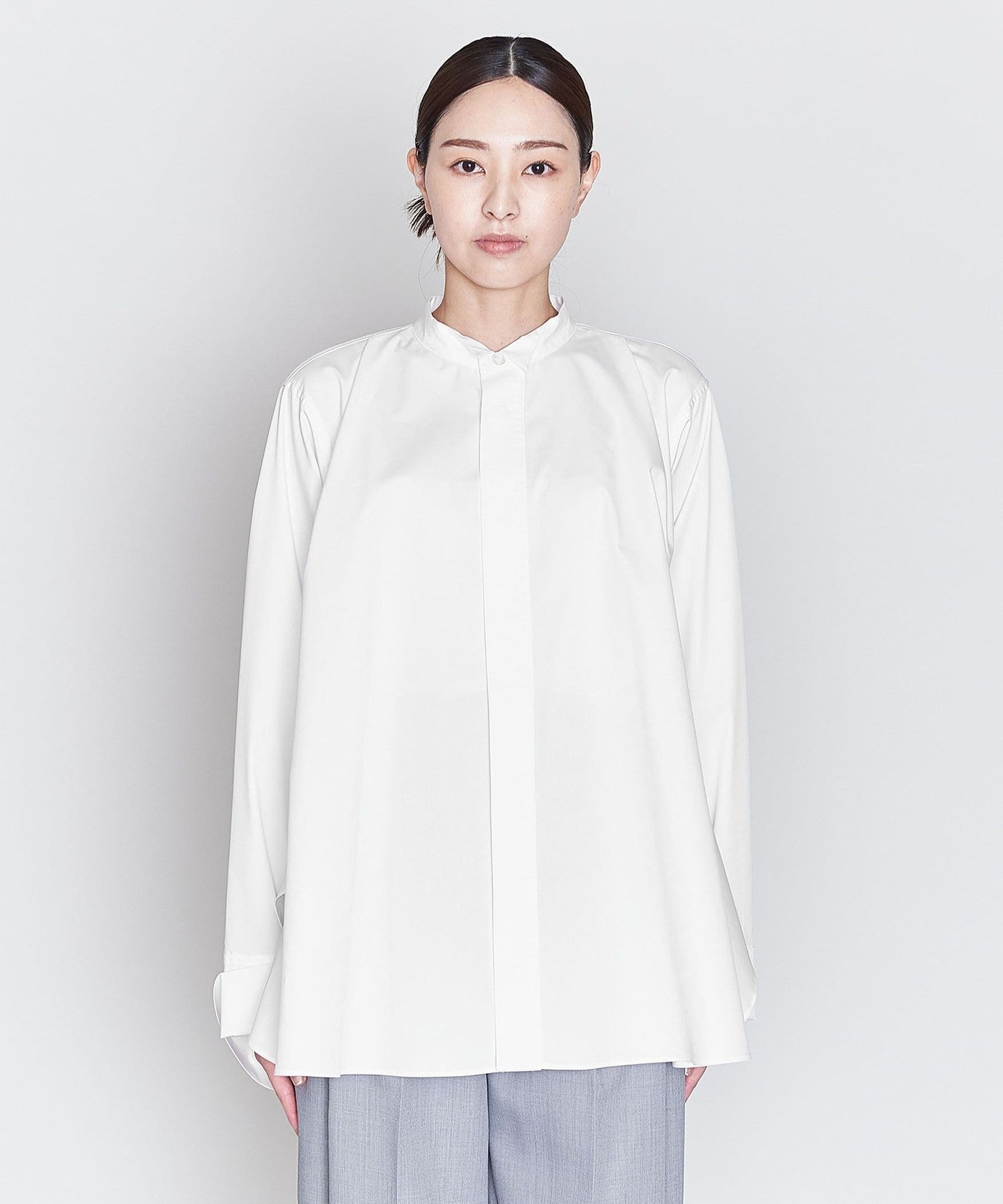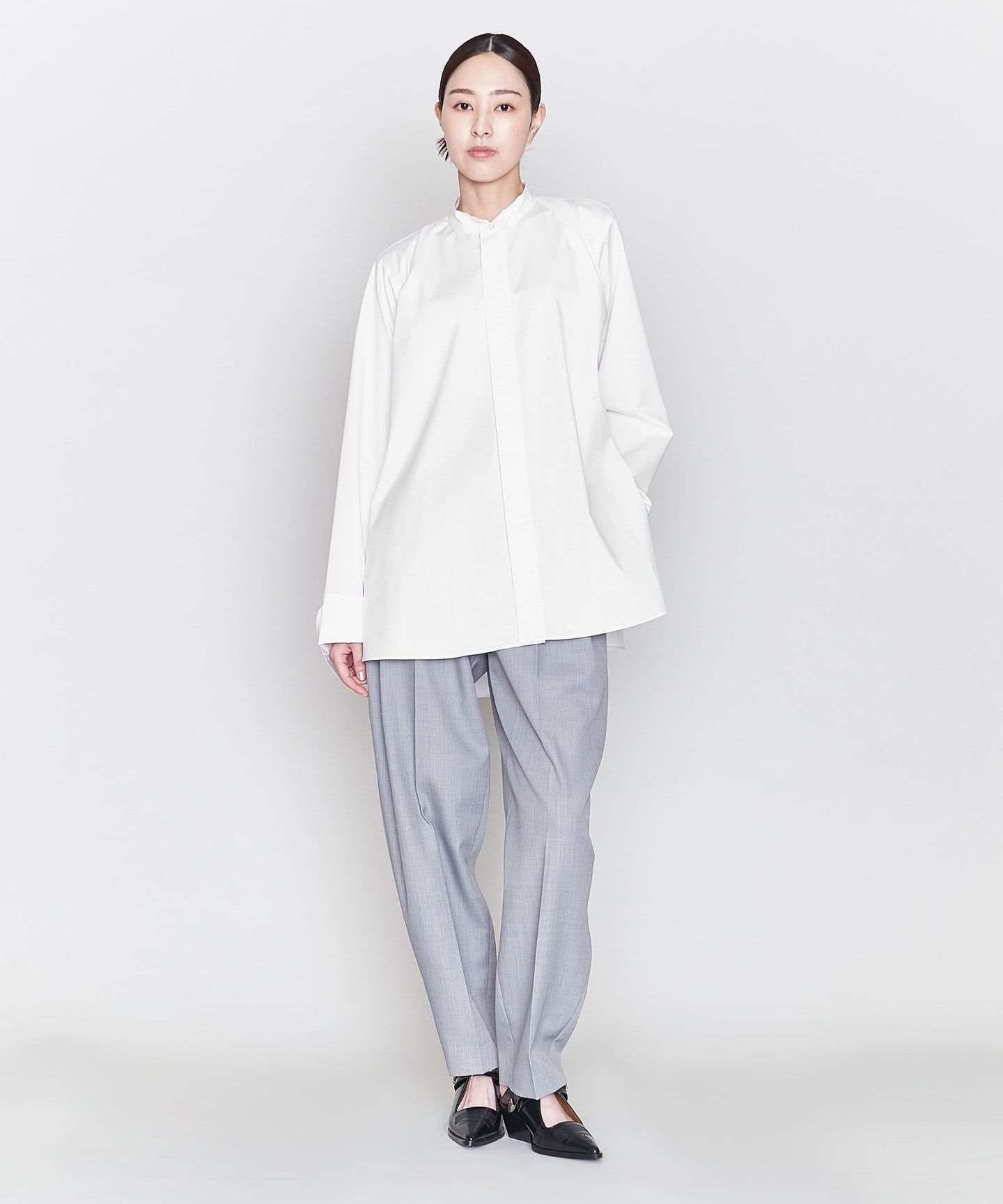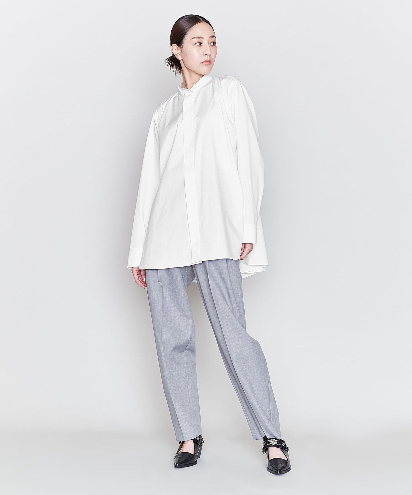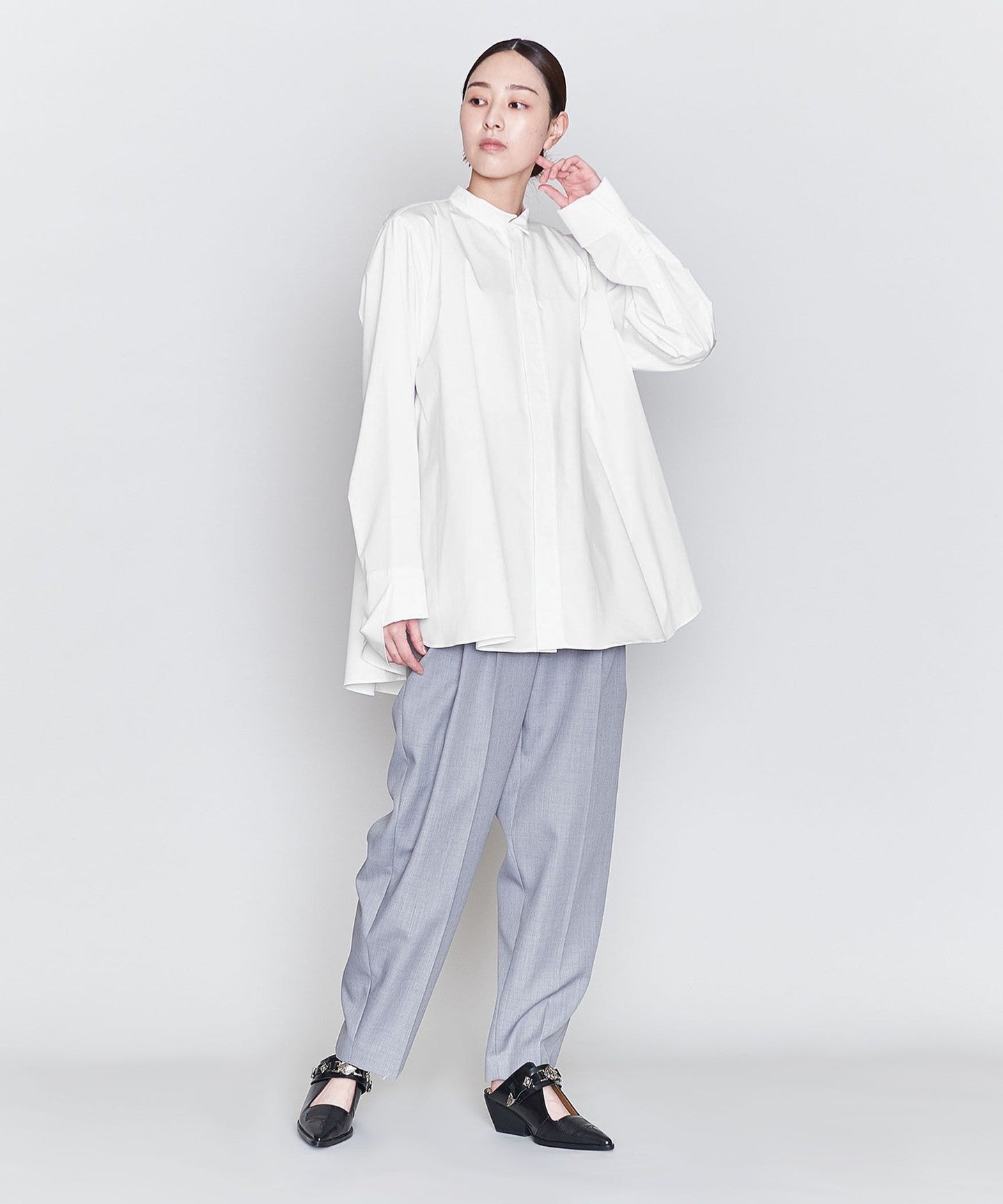 A wing collar shirt with a relaxed, flared silhouette and gorgeous draping.