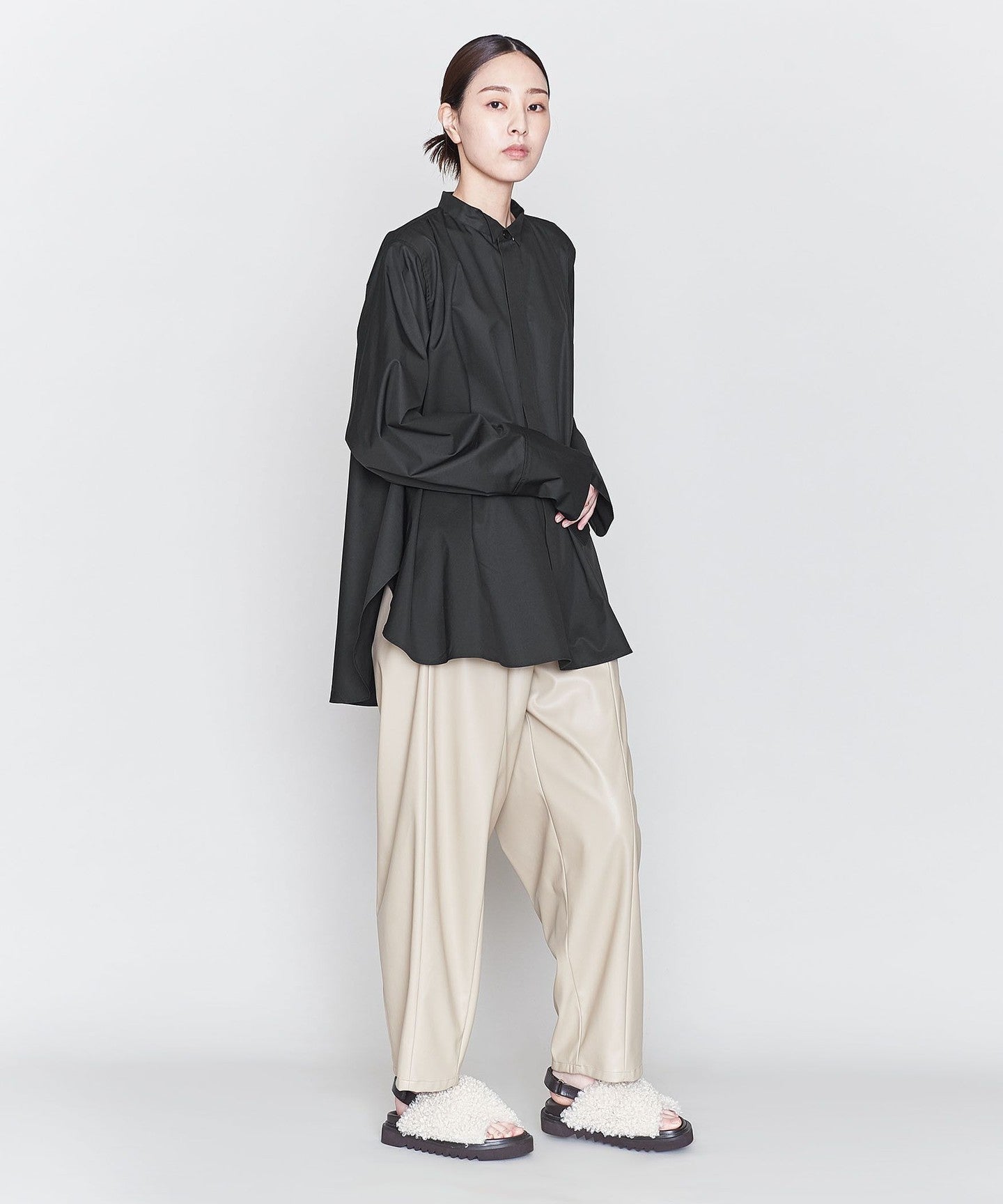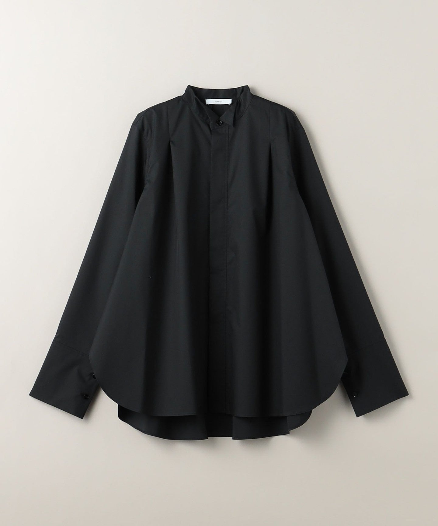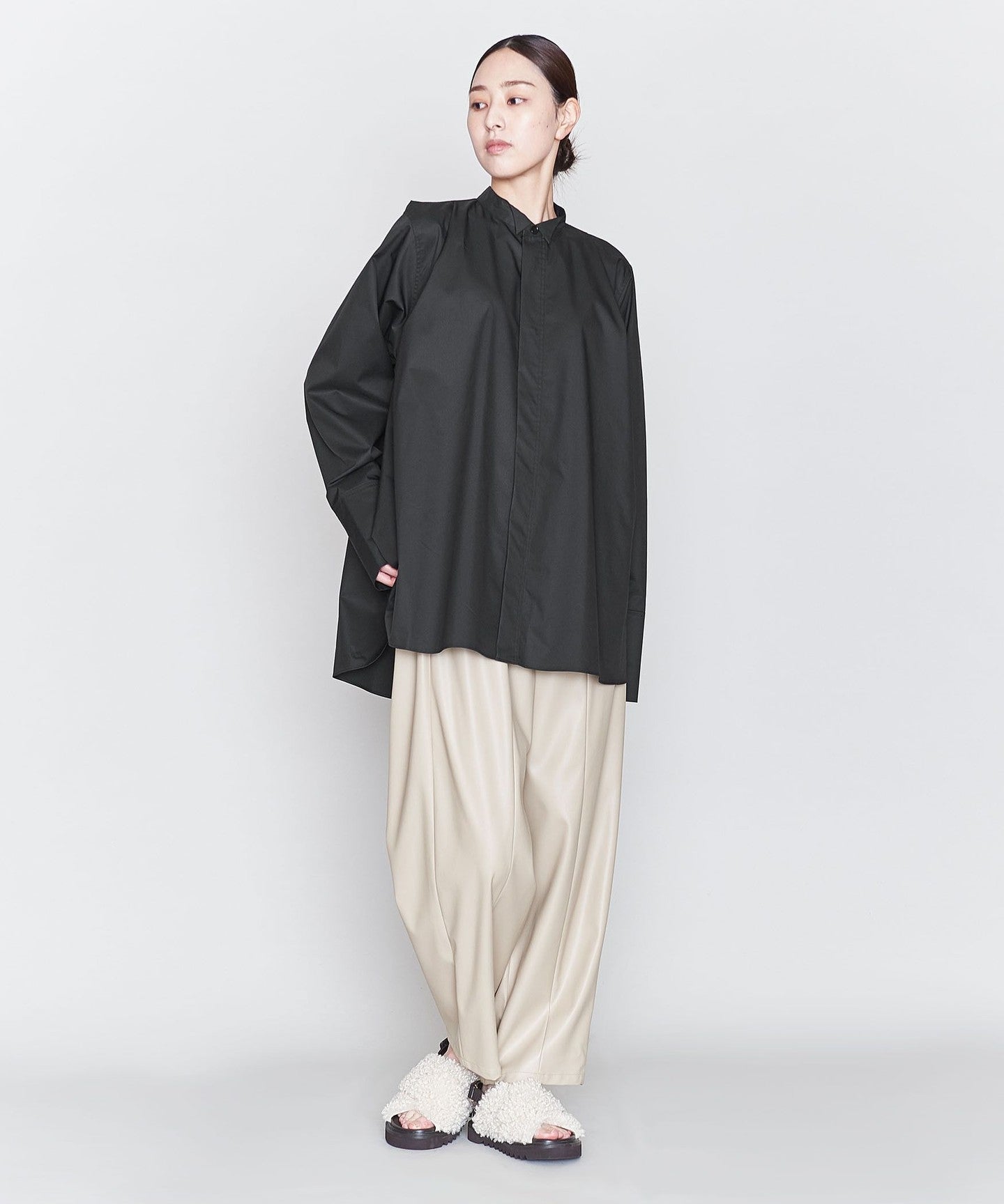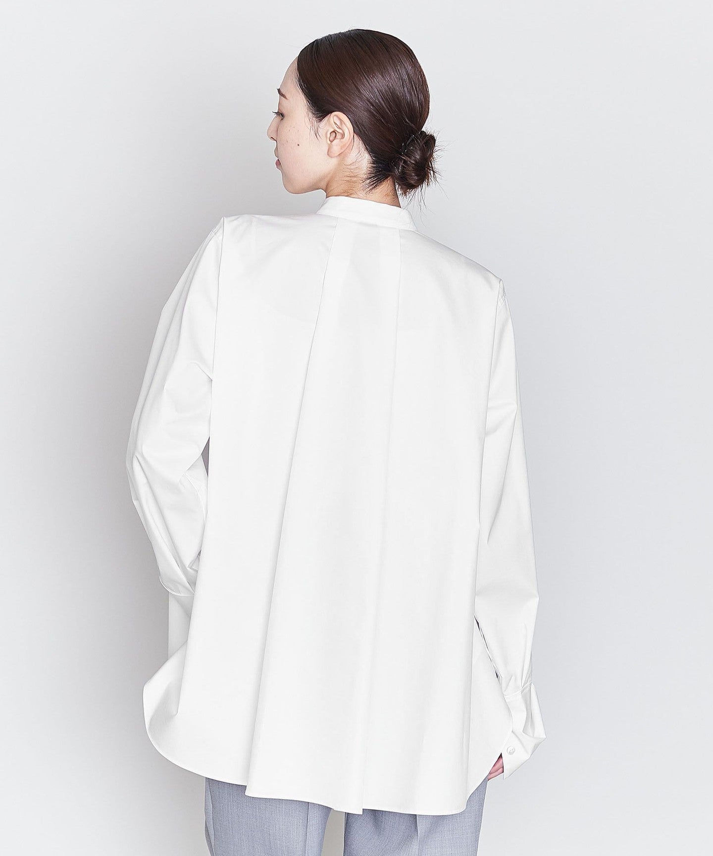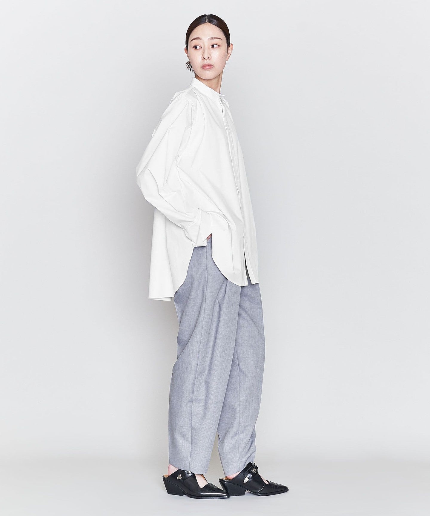 A wing collar shirt with a relaxed, flared silhouette and gorgeous draping.