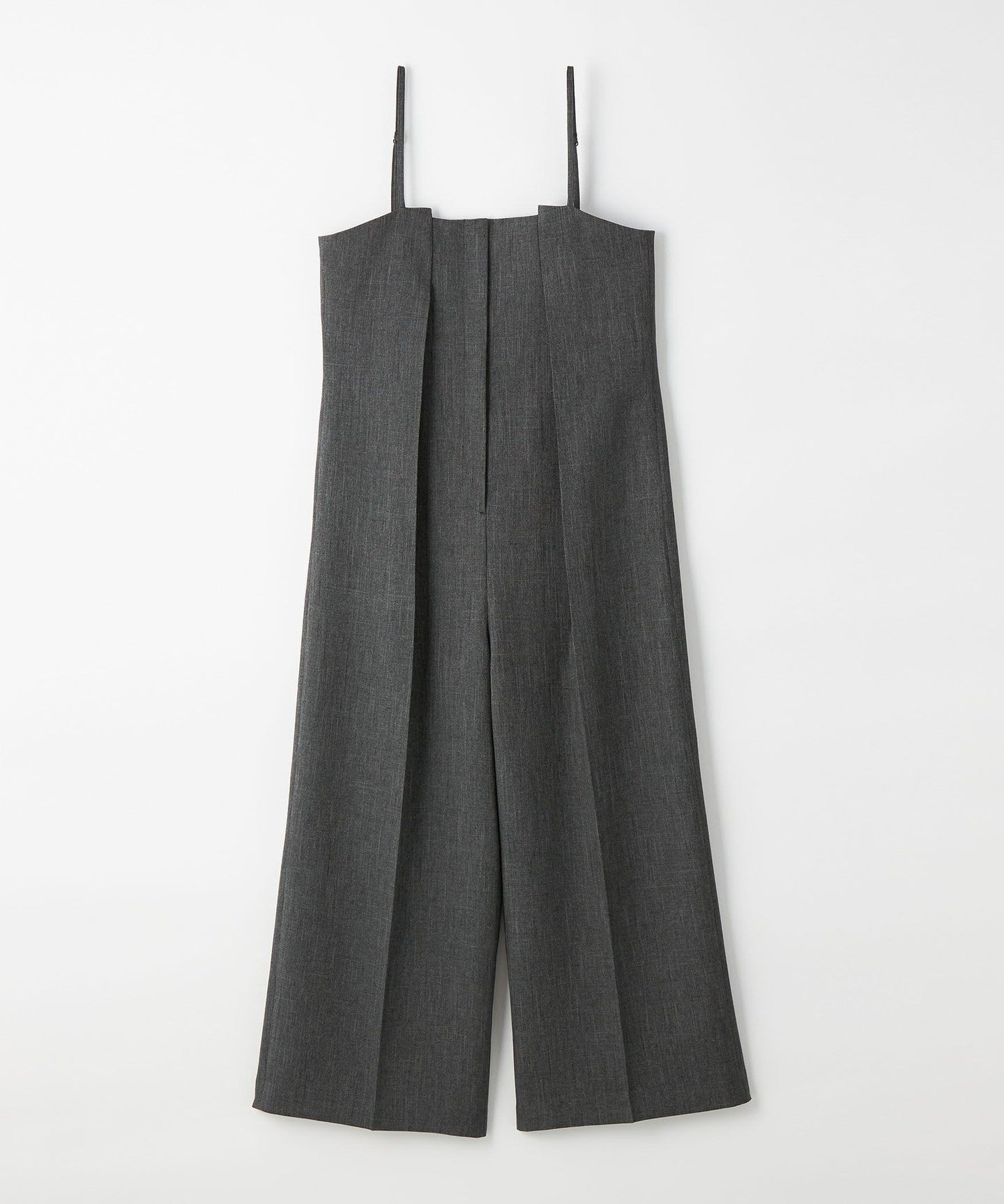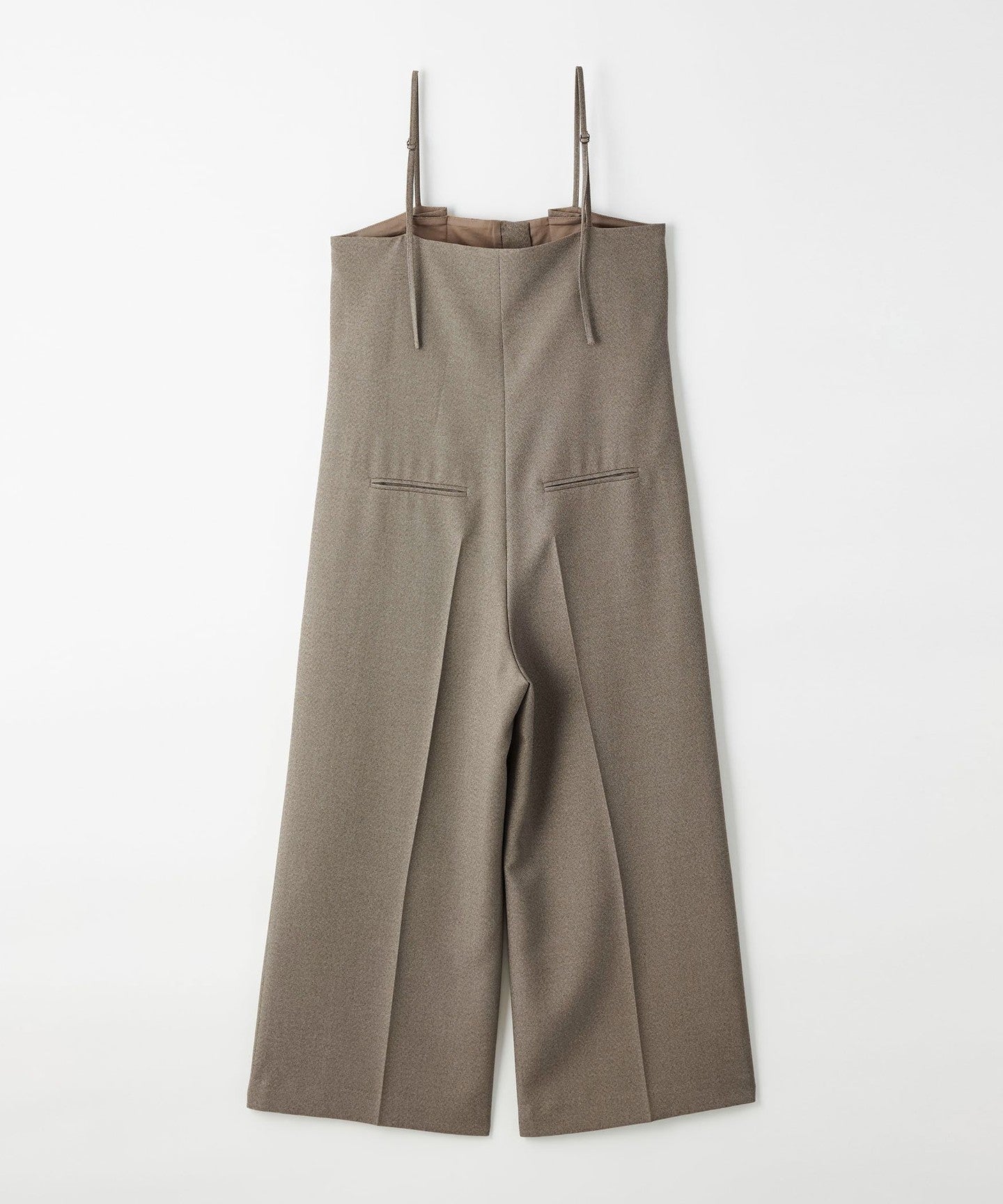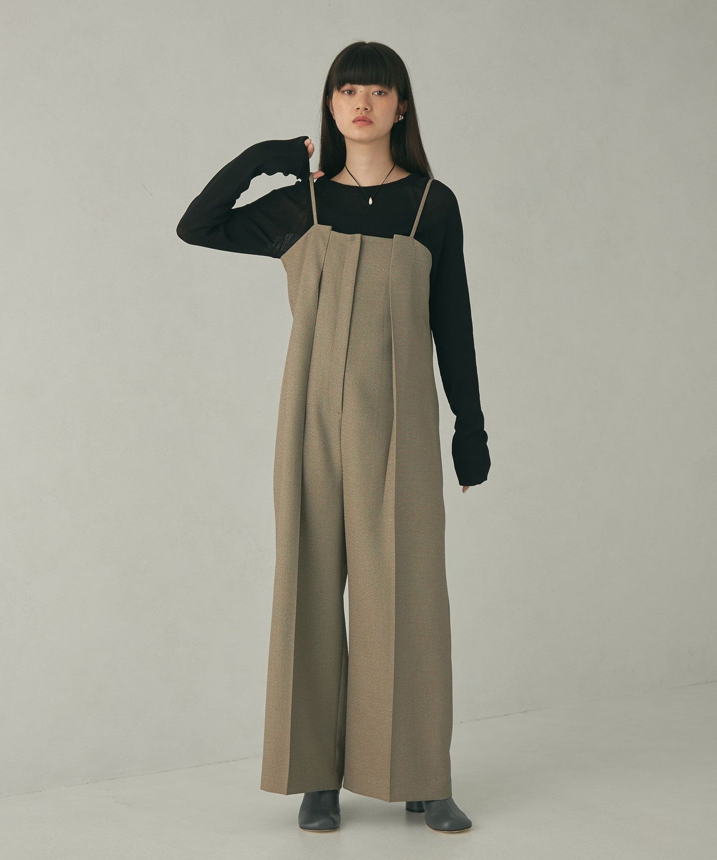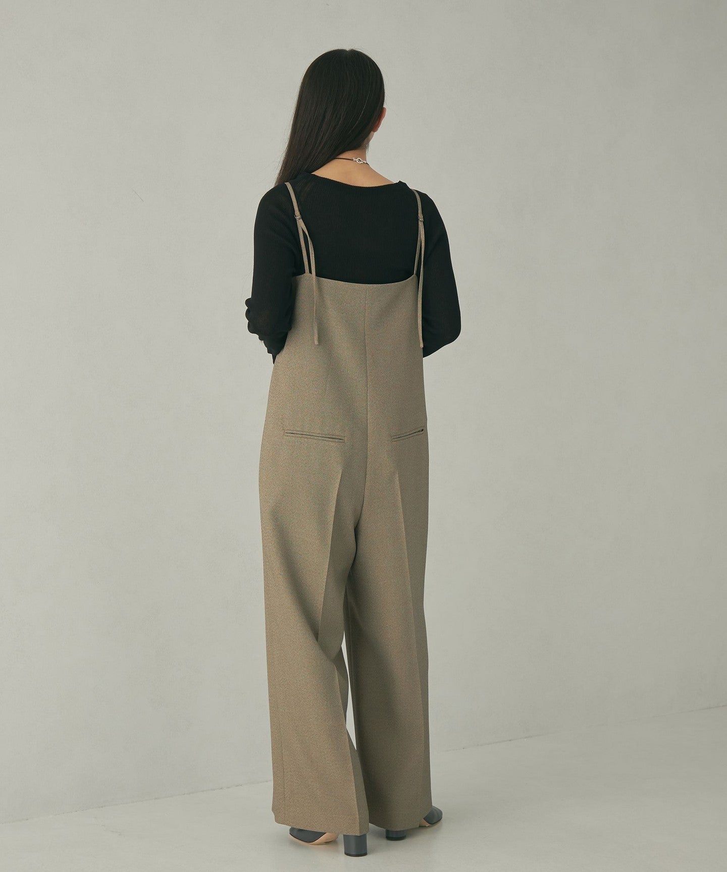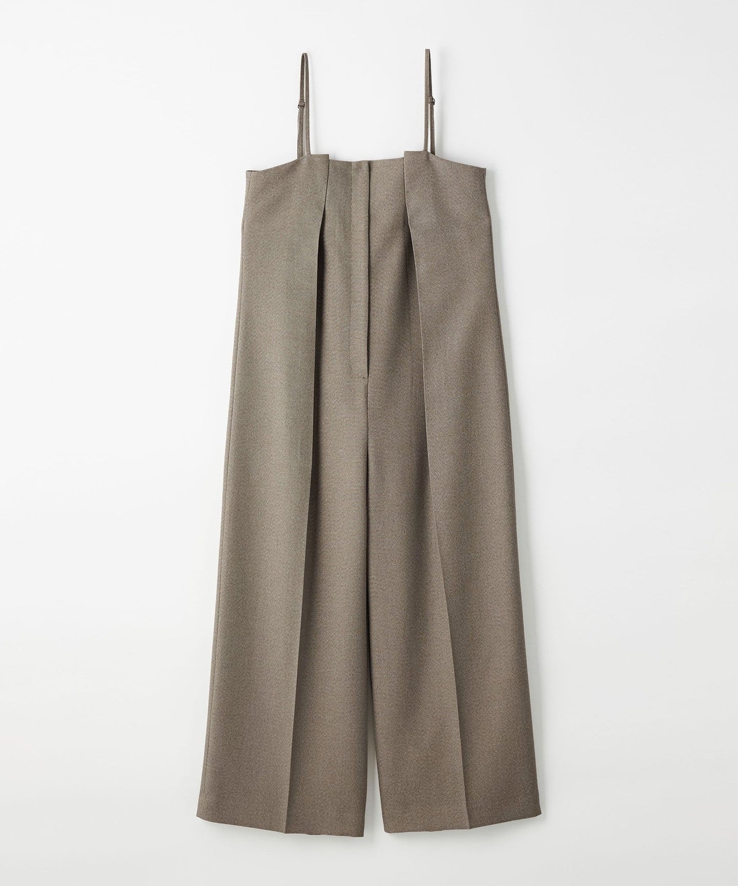 A cami-style overall with a mannish impression thanks to the tuck and center crease on the front.