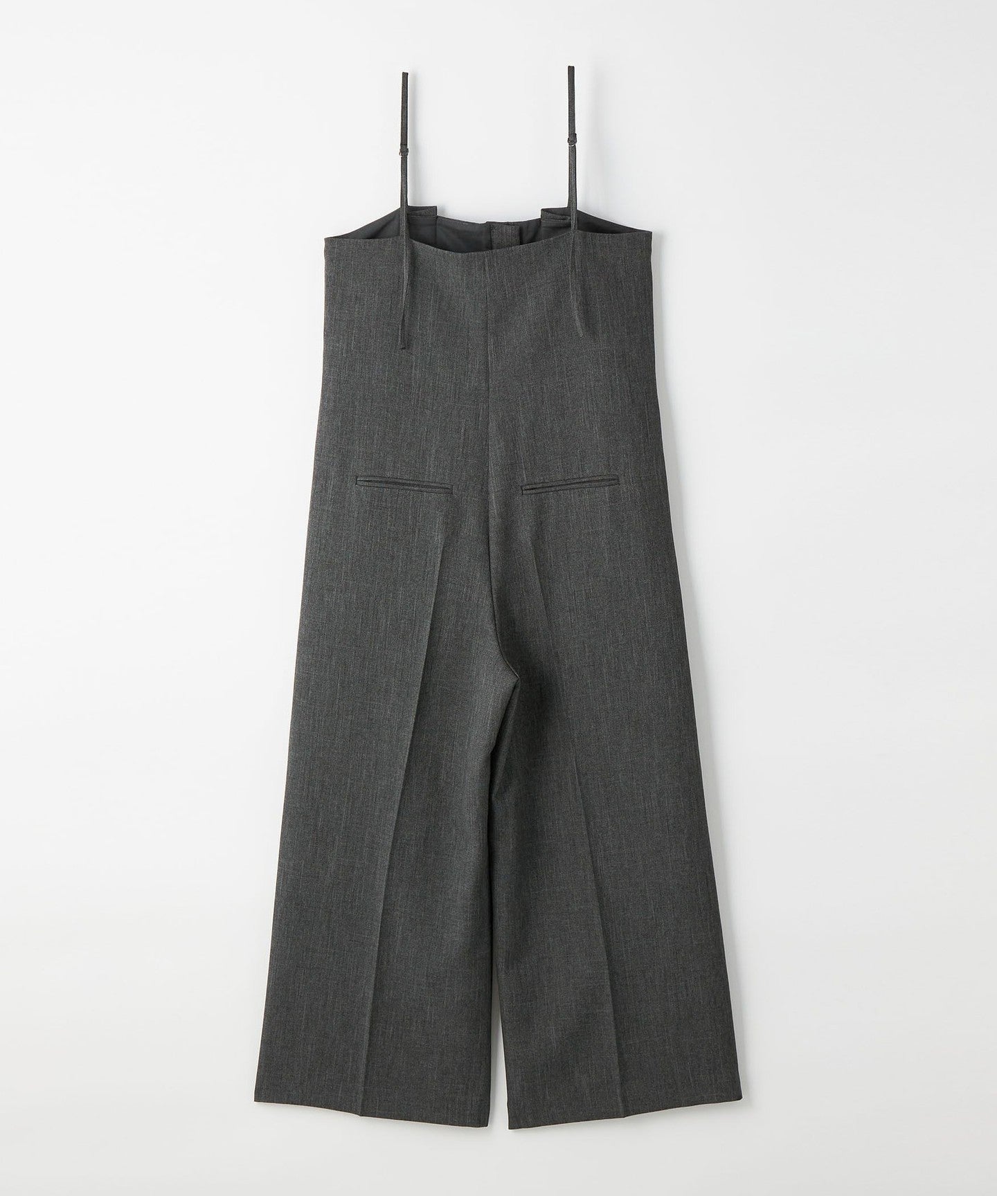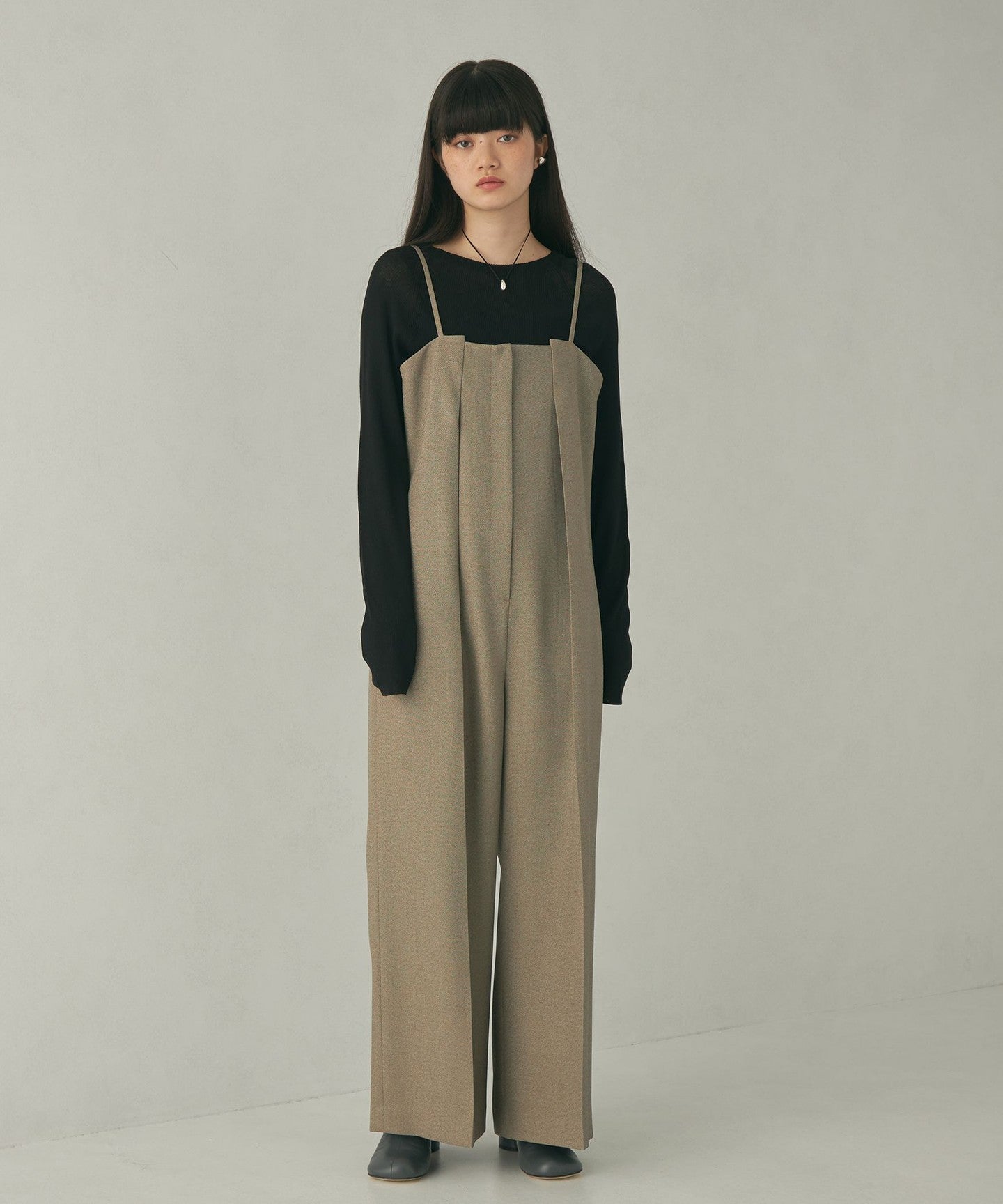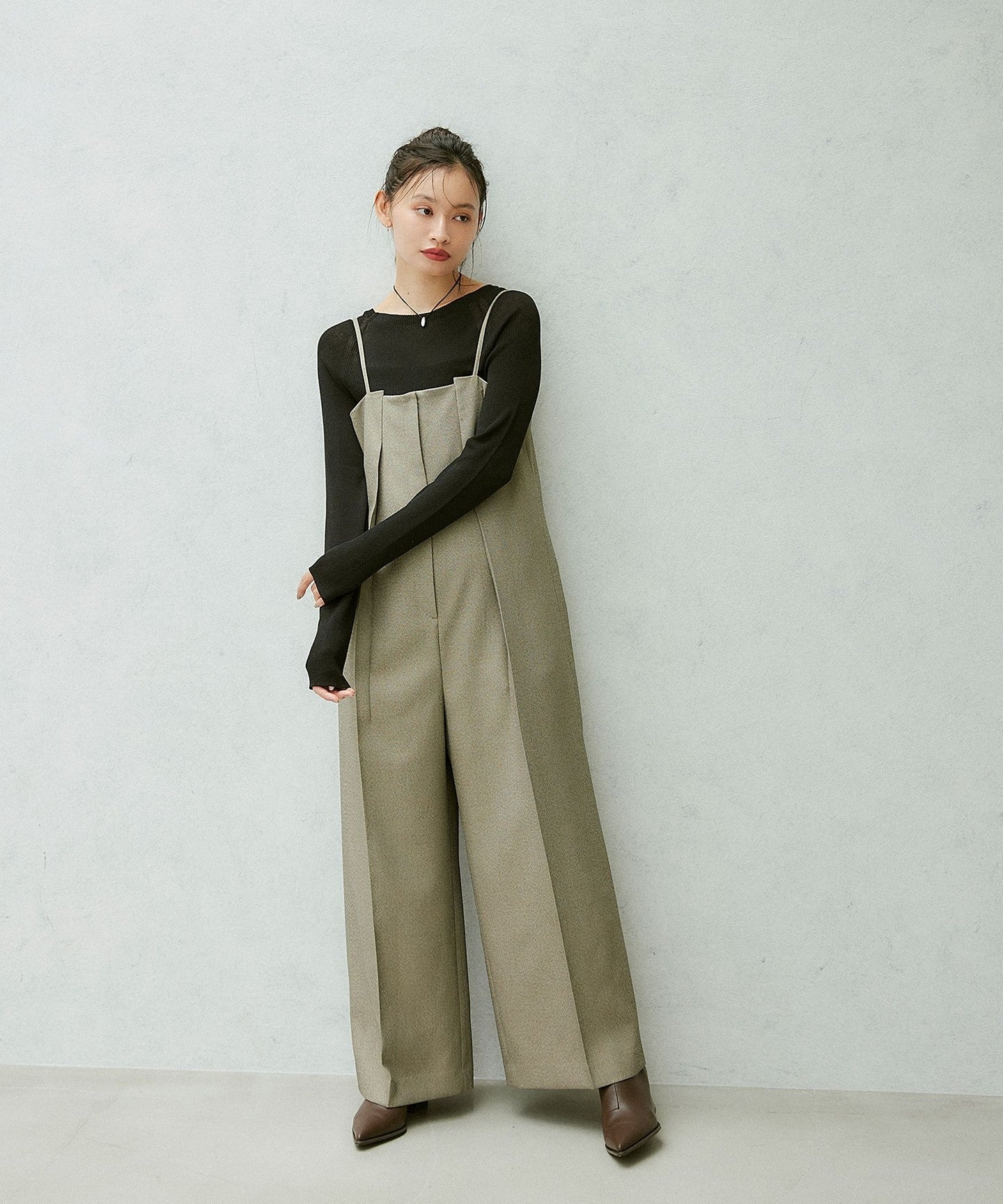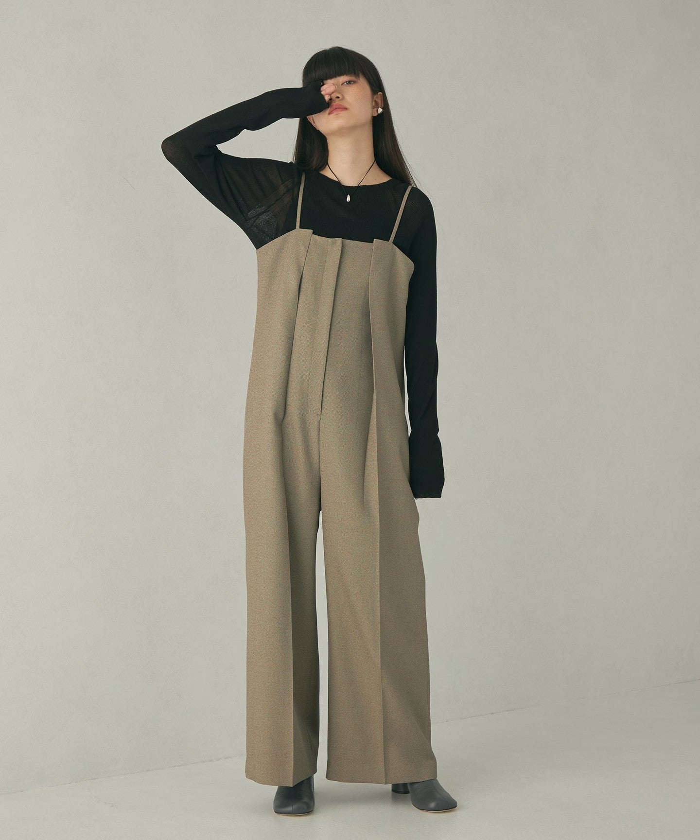 A cami-style overall with a mannish impression thanks to the tuck and center crease on the front.