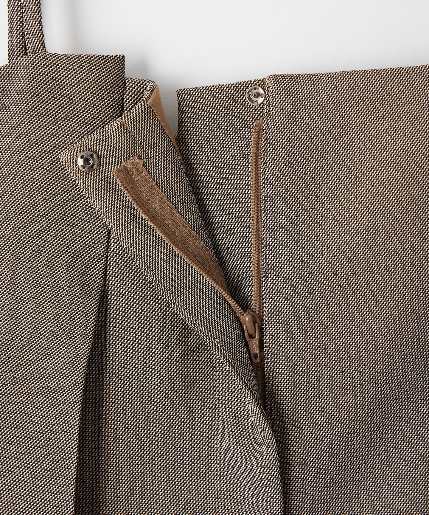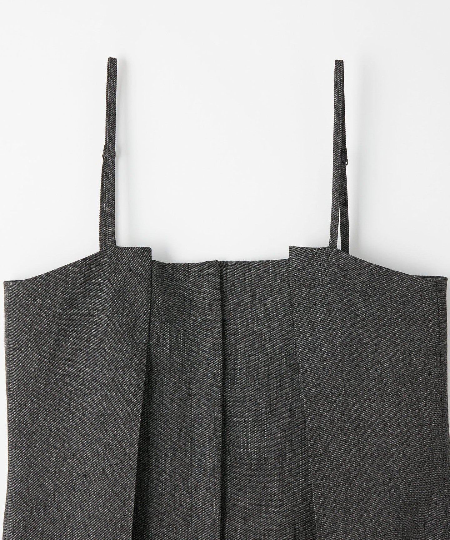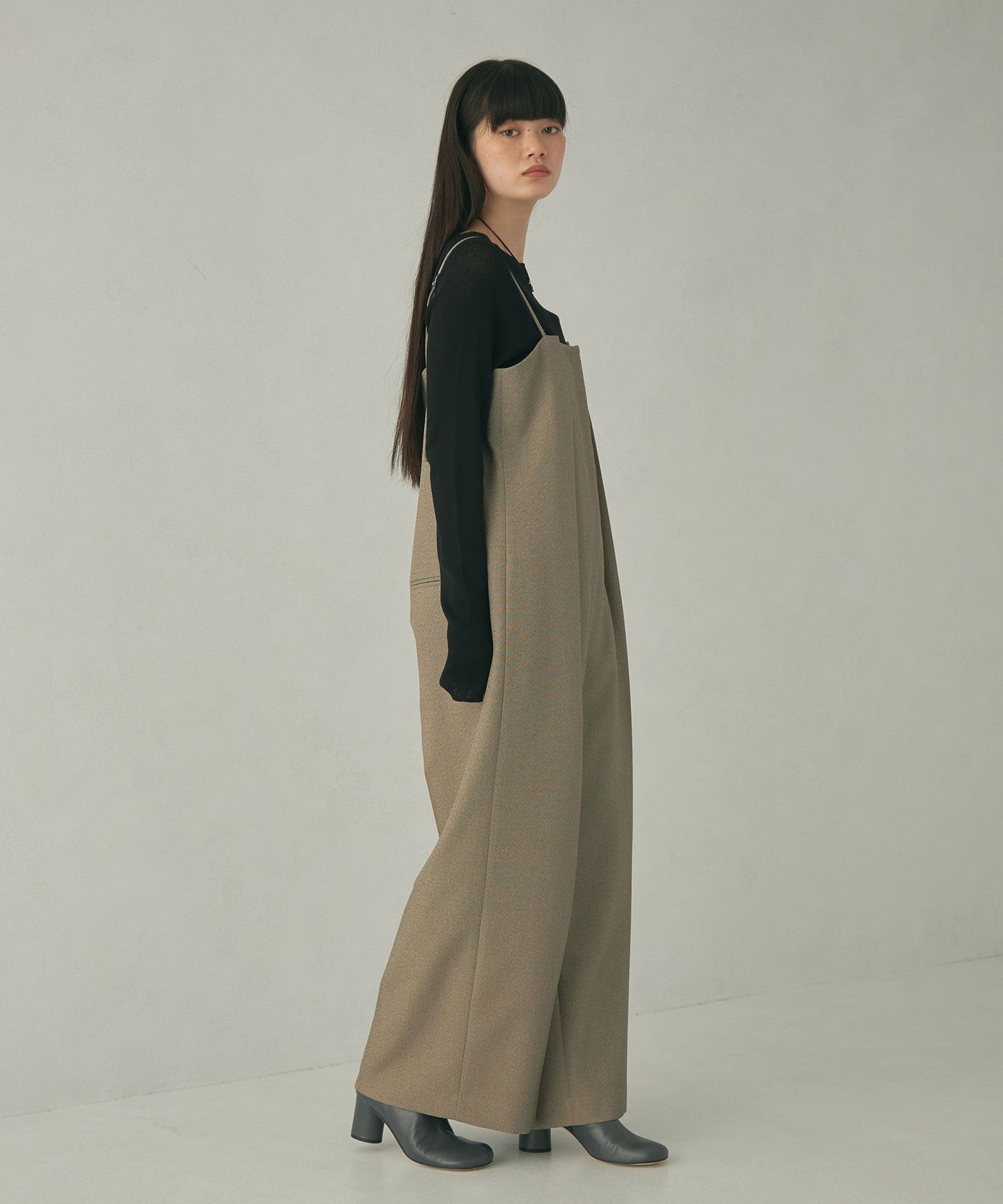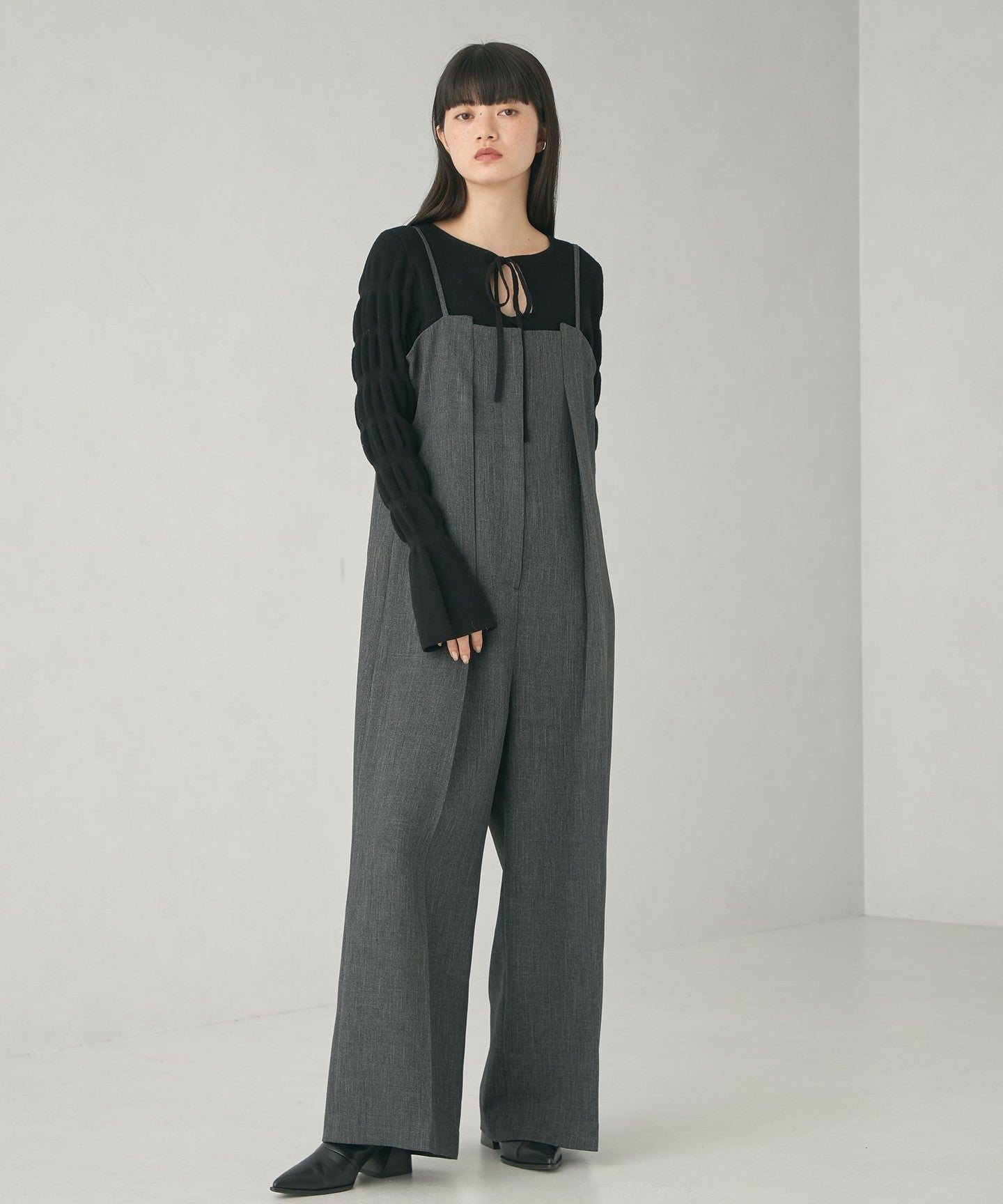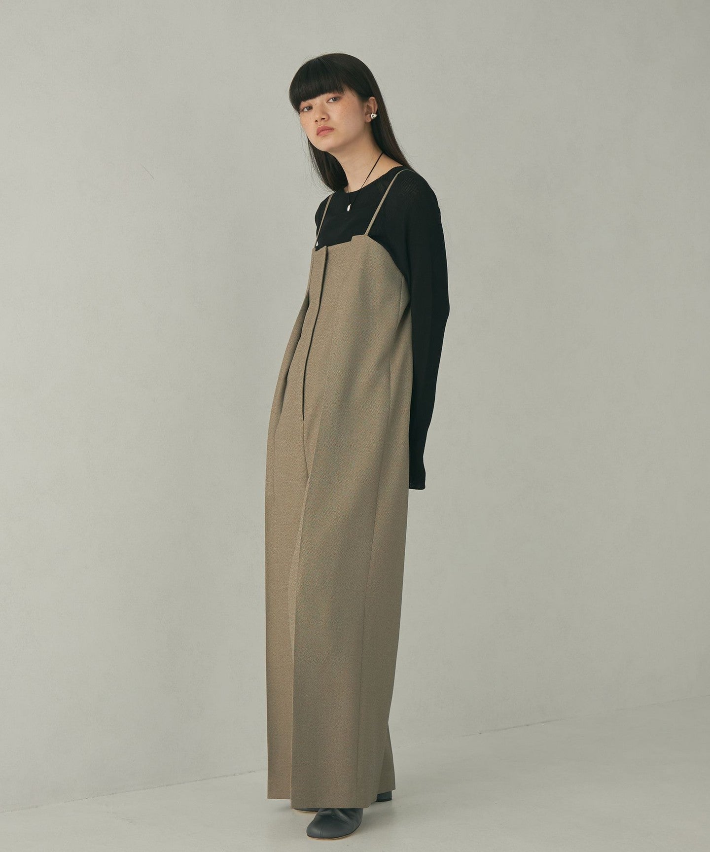 A cami-style overall with a mannish impression thanks to the tuck and center crease on the front.