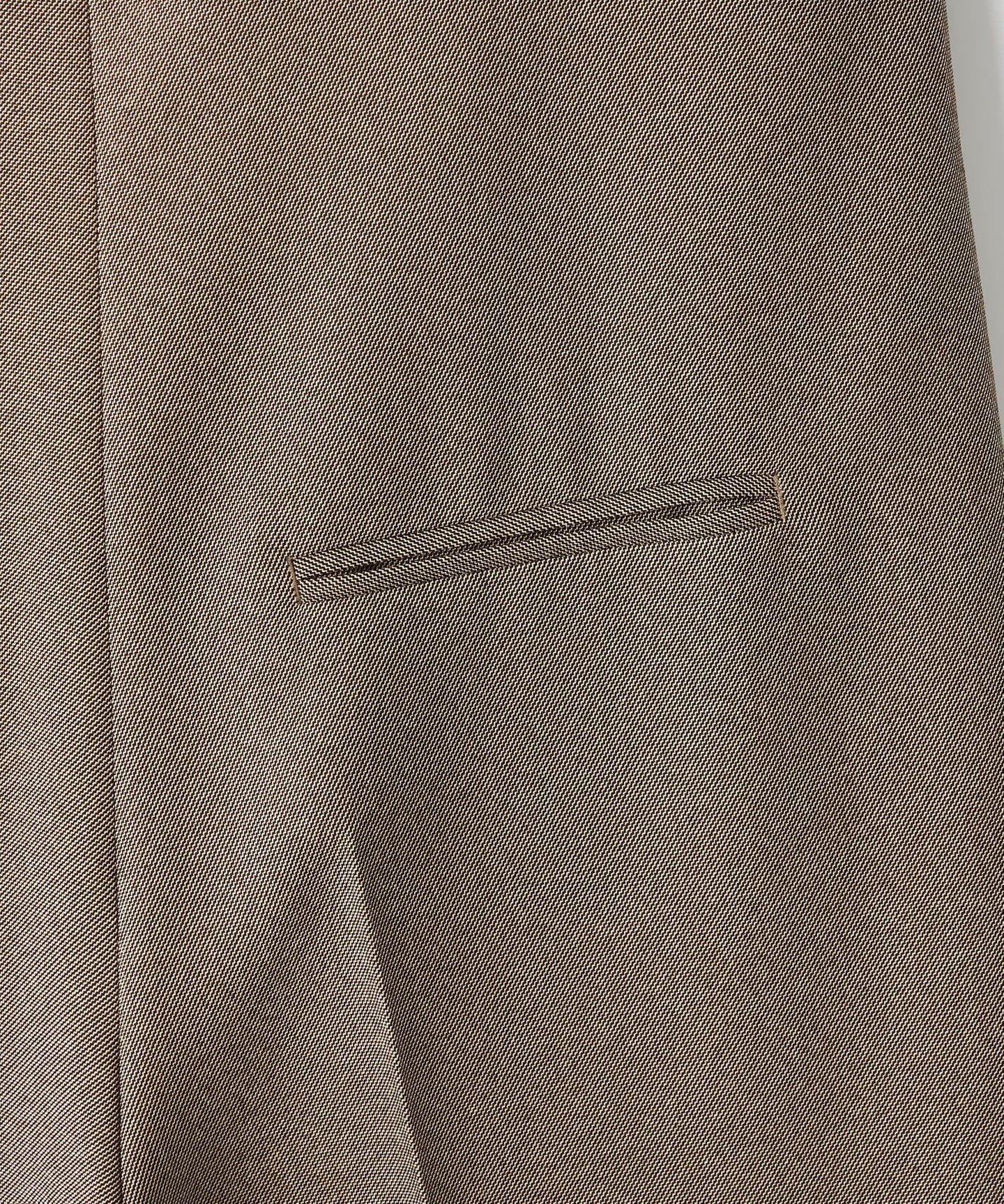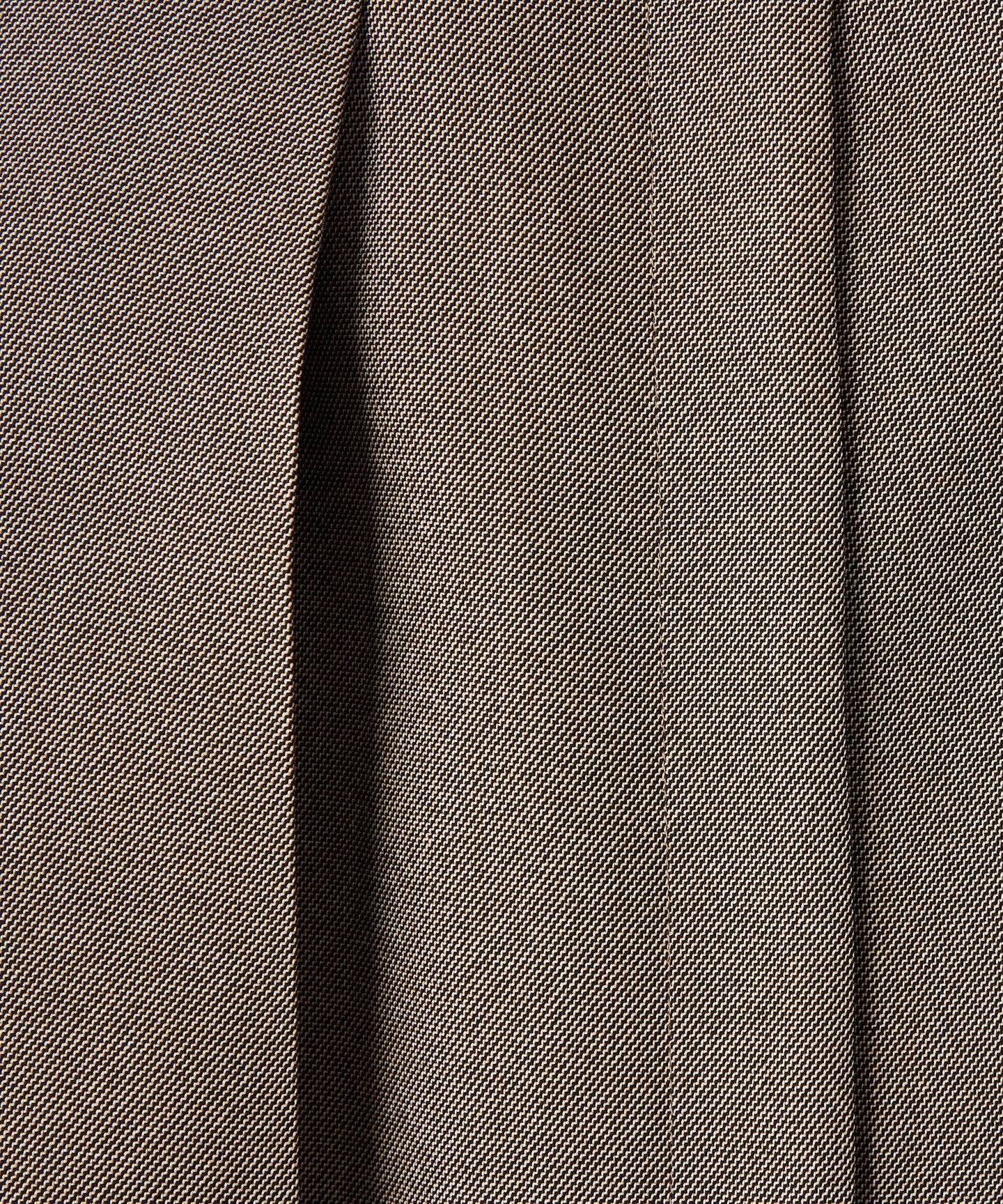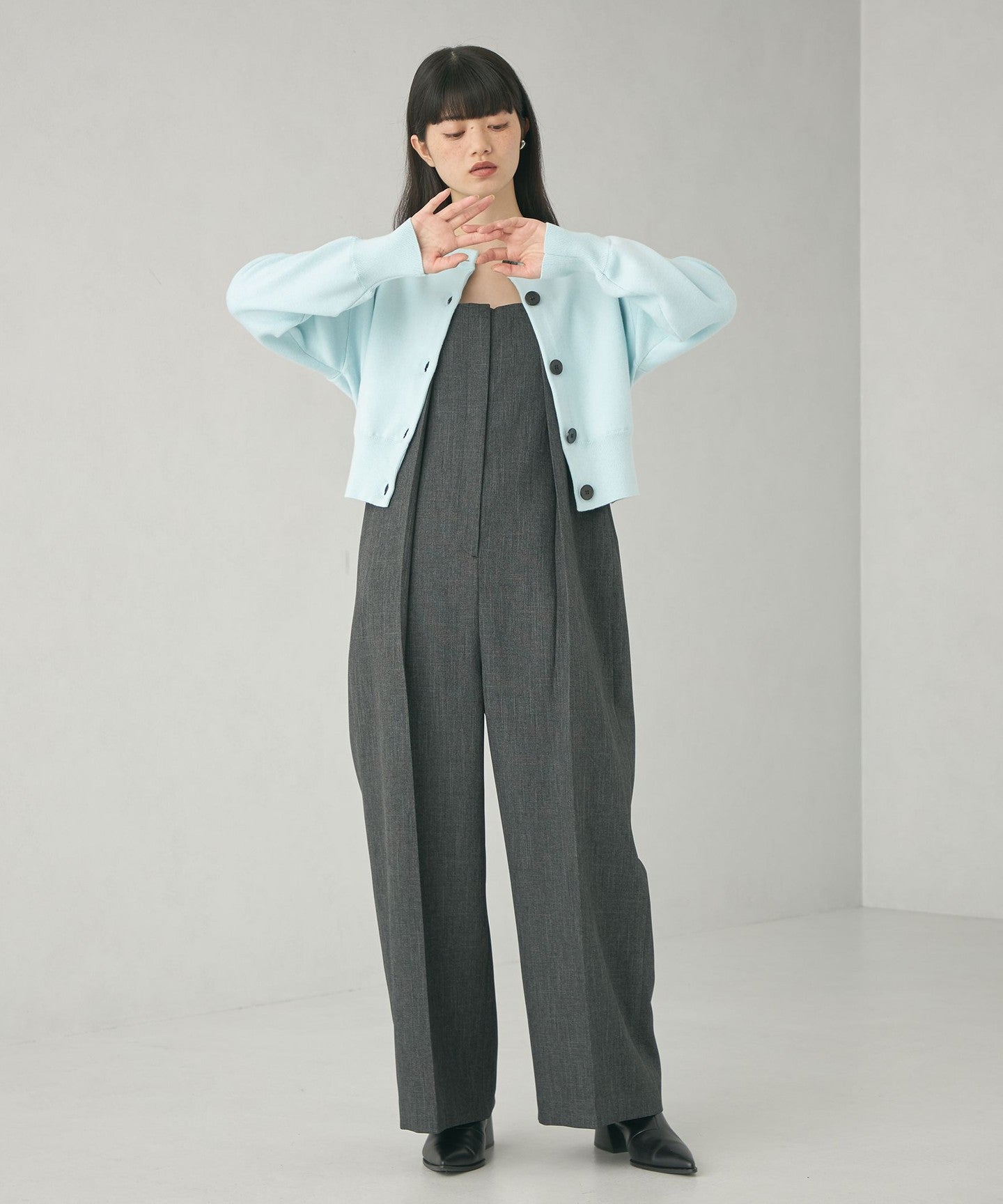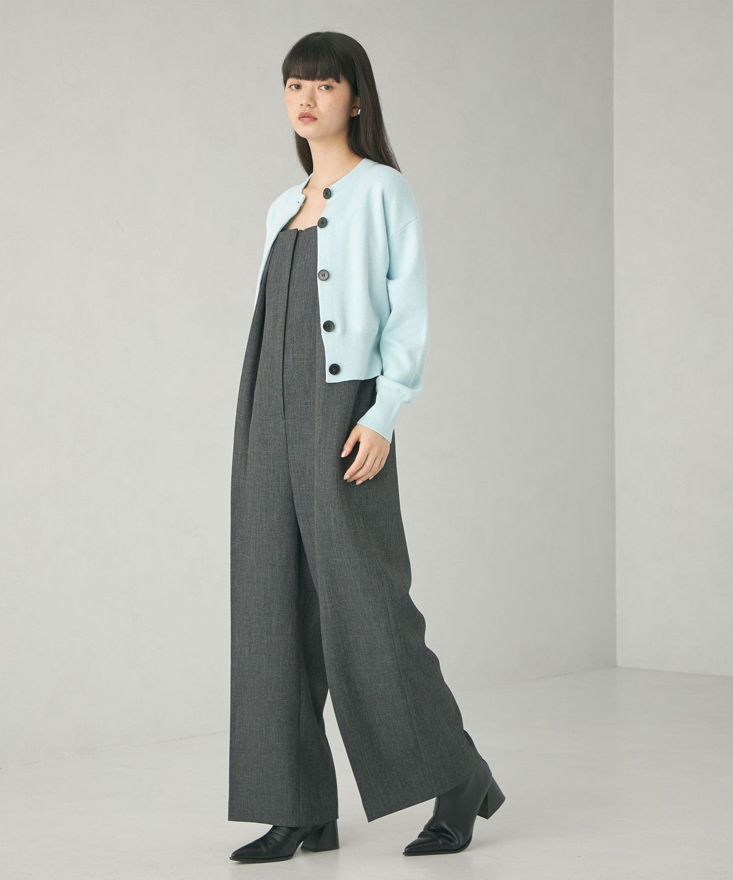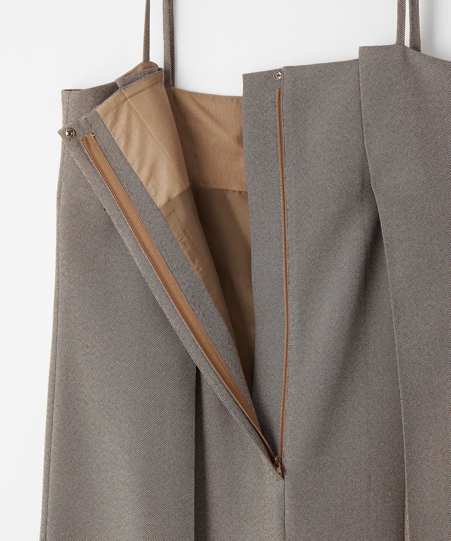 A cami-style overall with a mannish impression thanks to the tuck and center crease on the front.