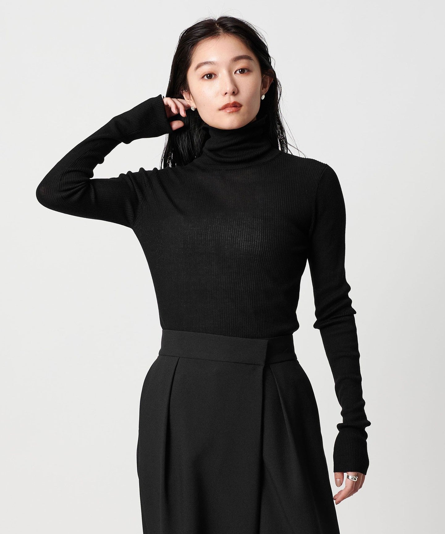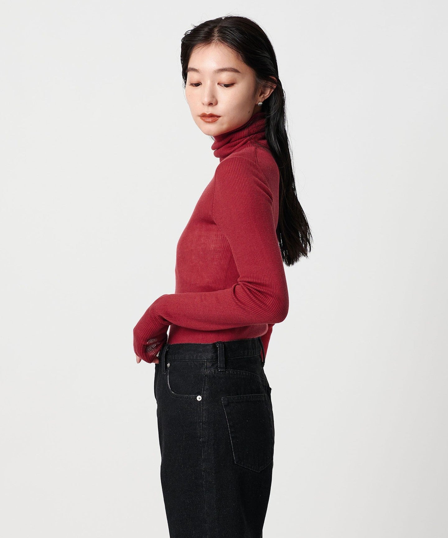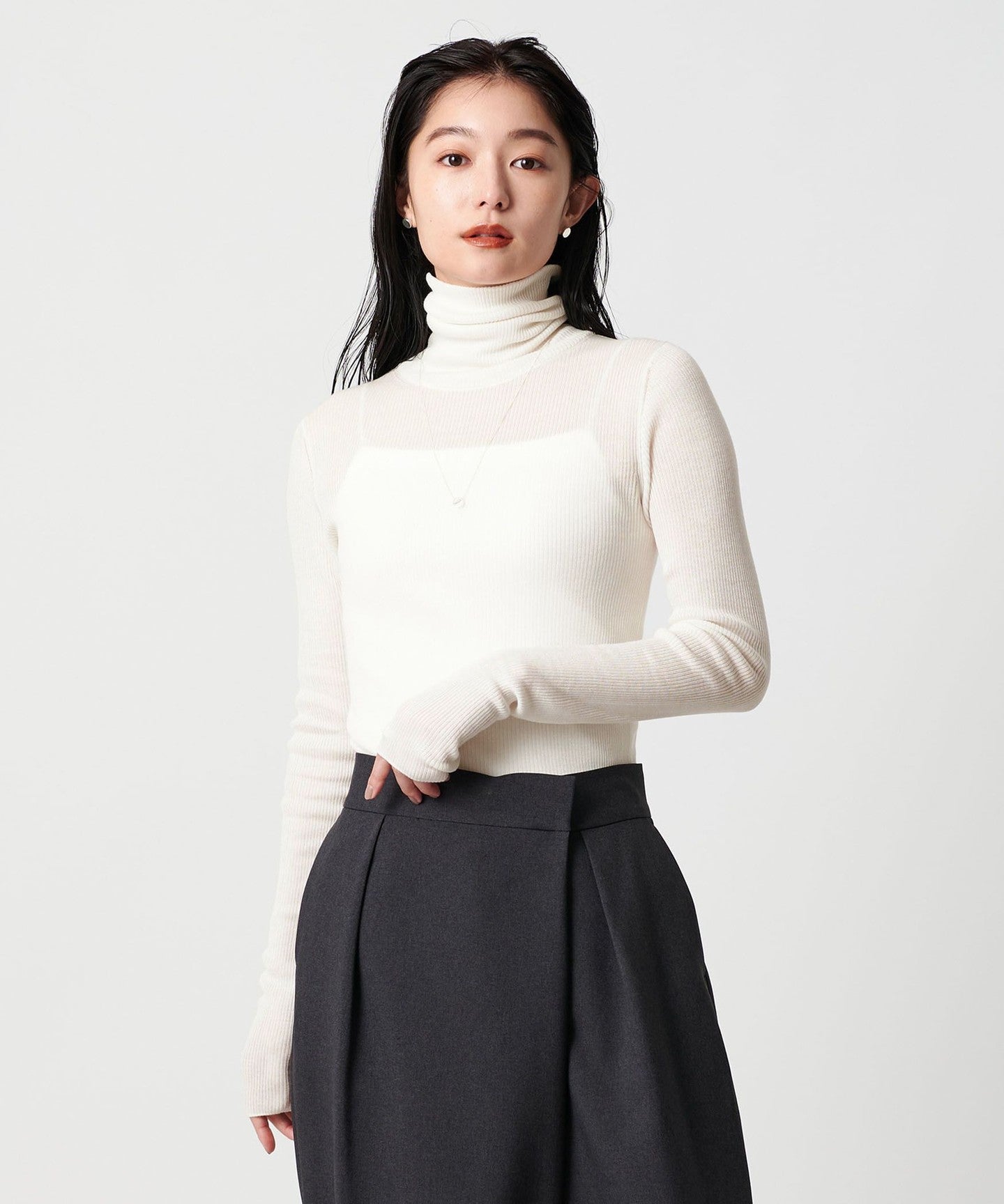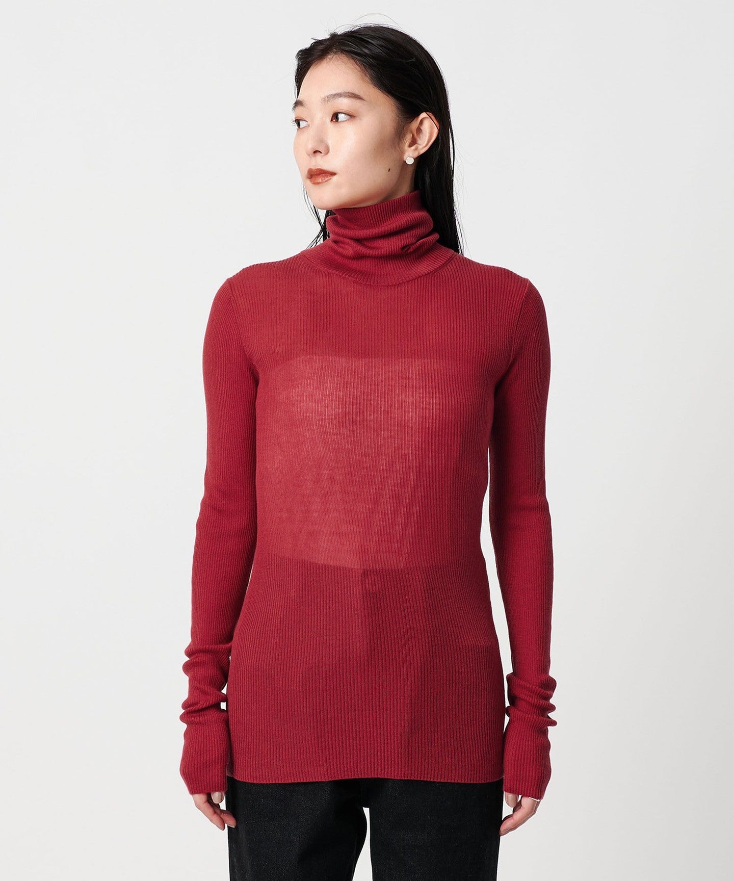 This ribbed turtleneck knit has just the right amount of transparency, adding a touch of lightness to your styling.