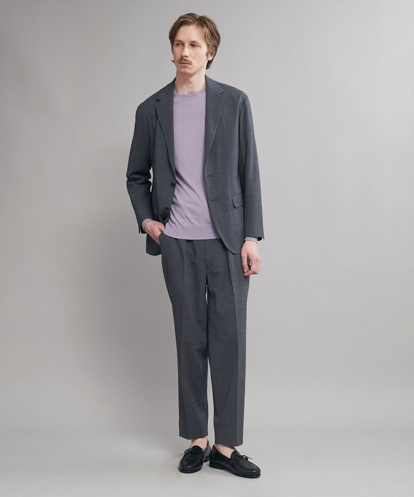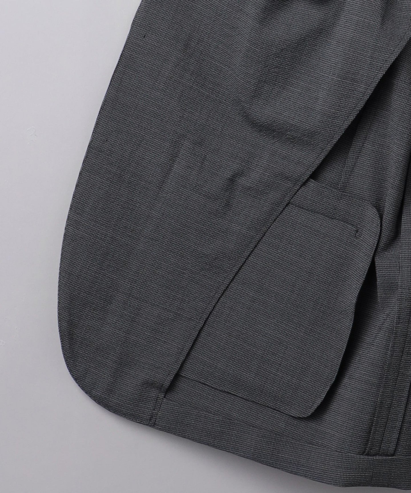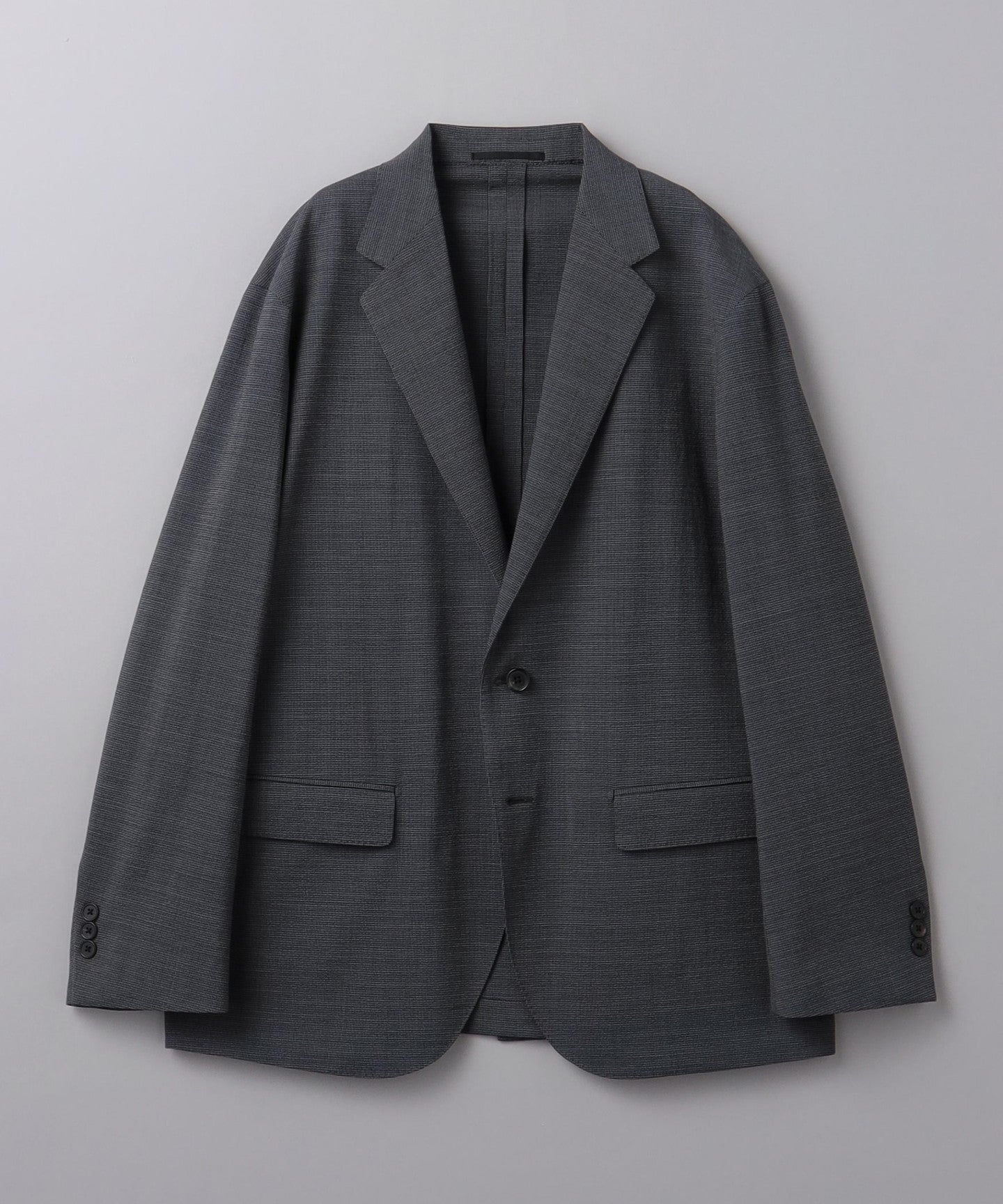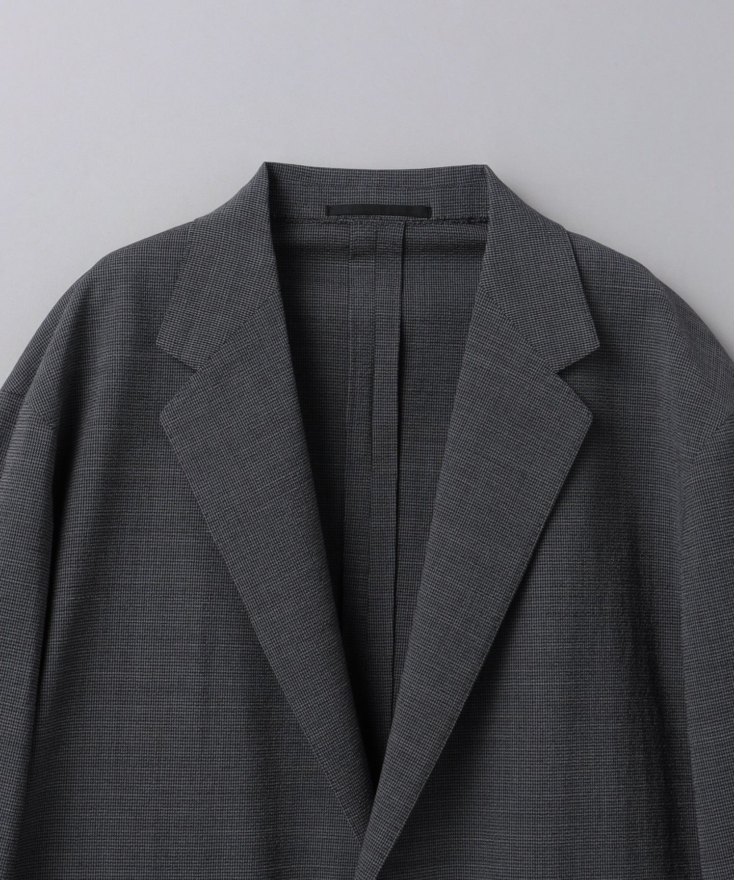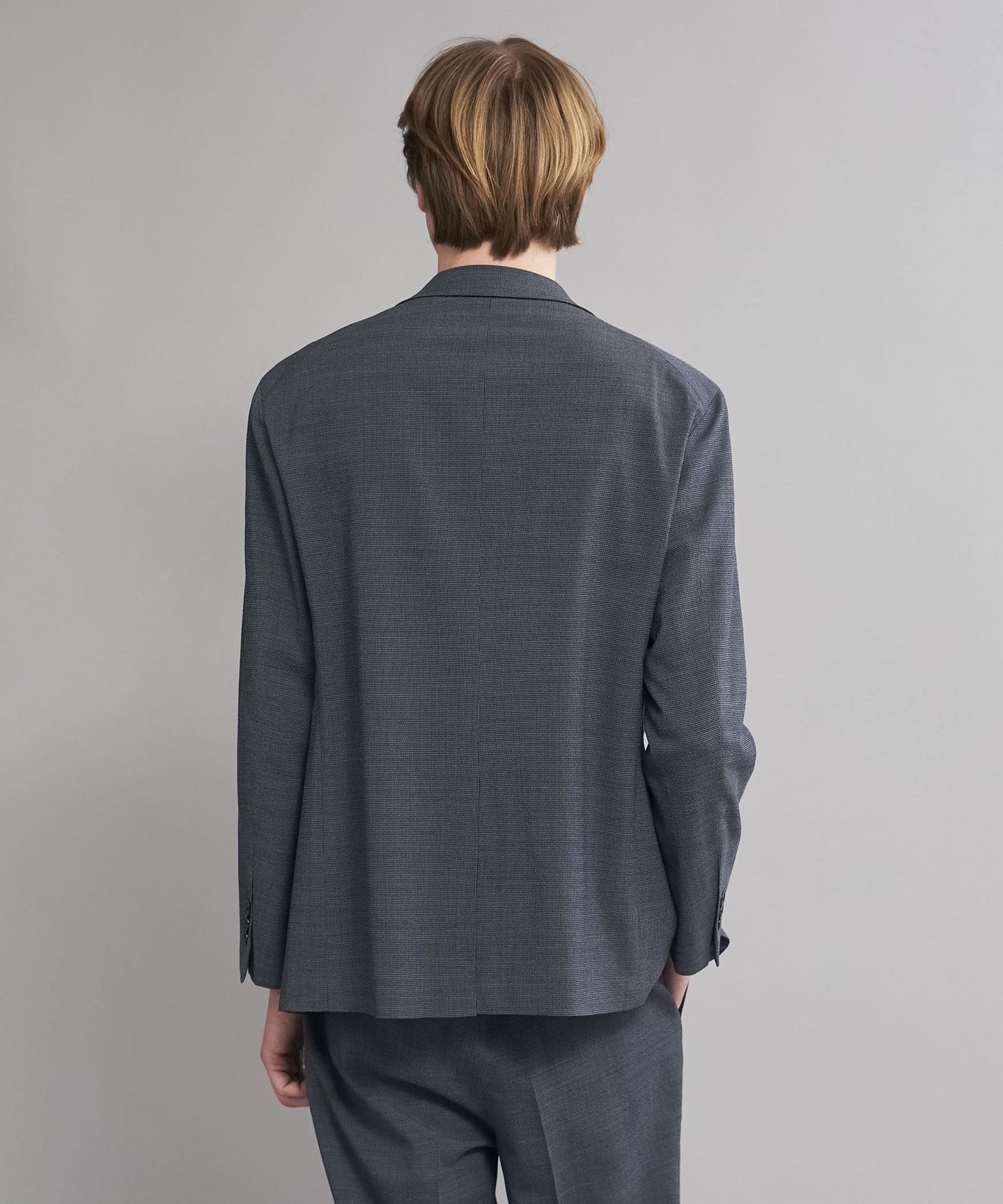 The jacket is made with adhesive interlining, which makes it lighter than suits with a structured silhouette that use wool interlining or padding.