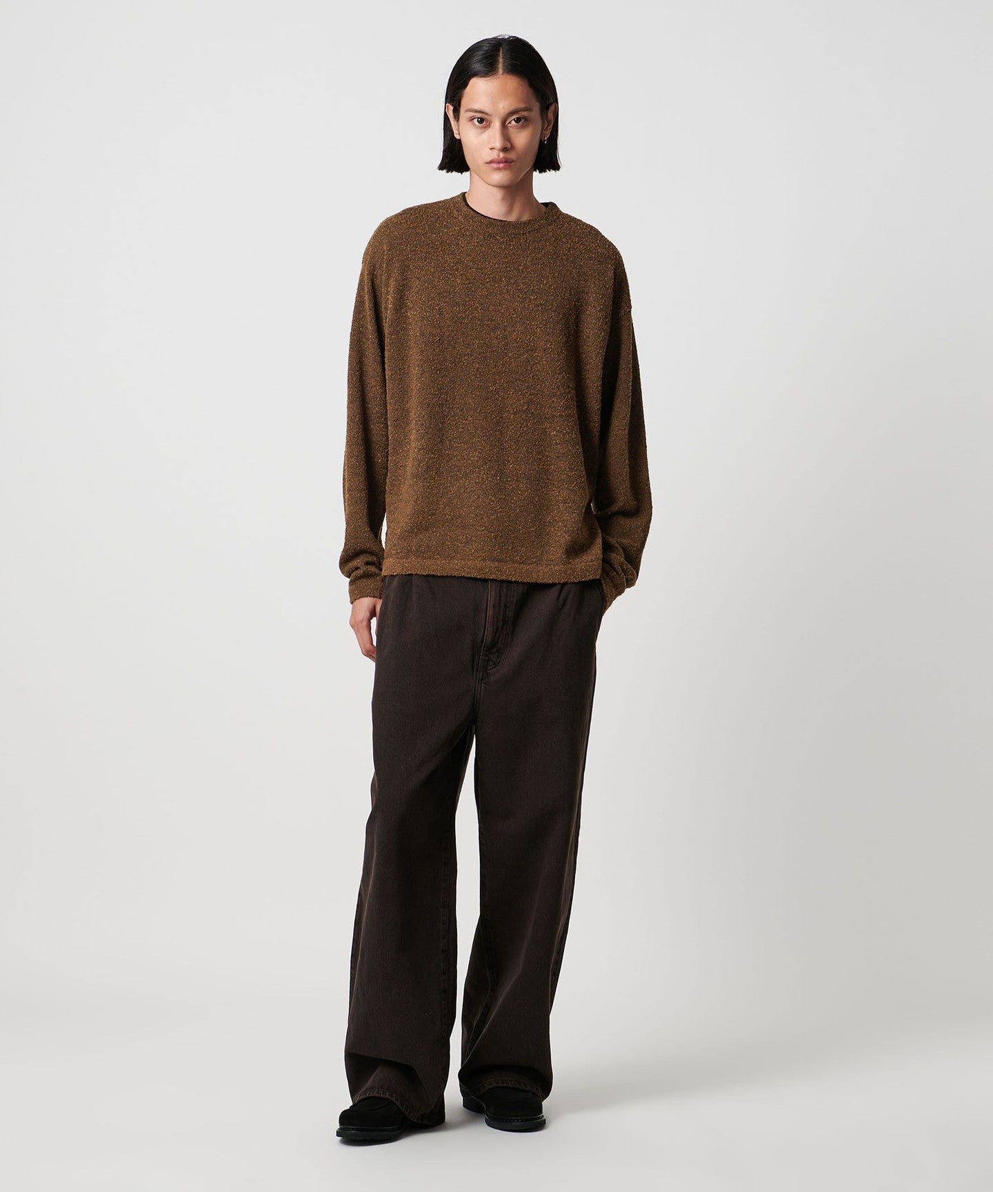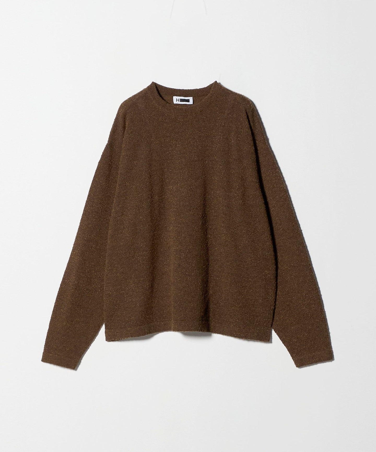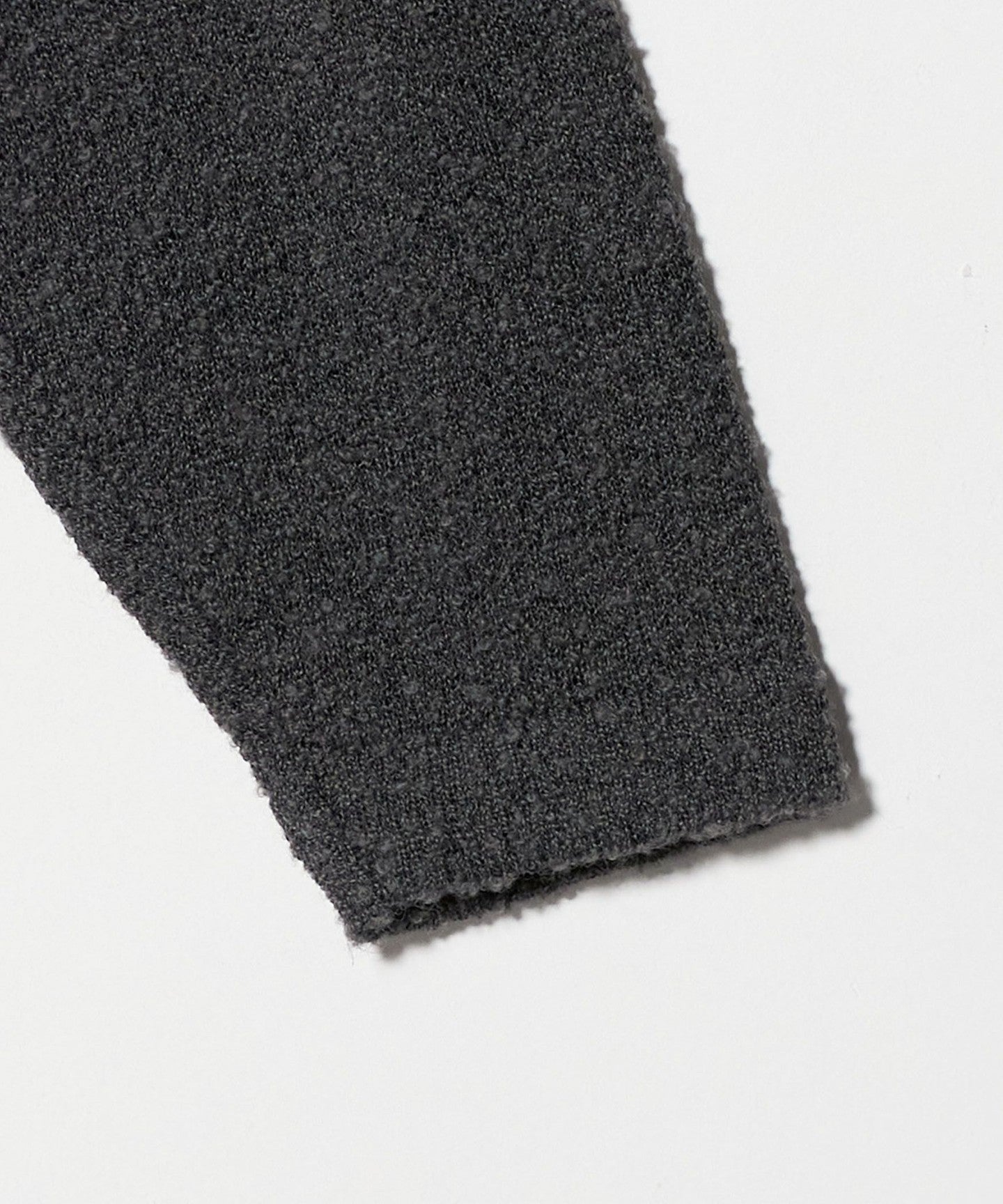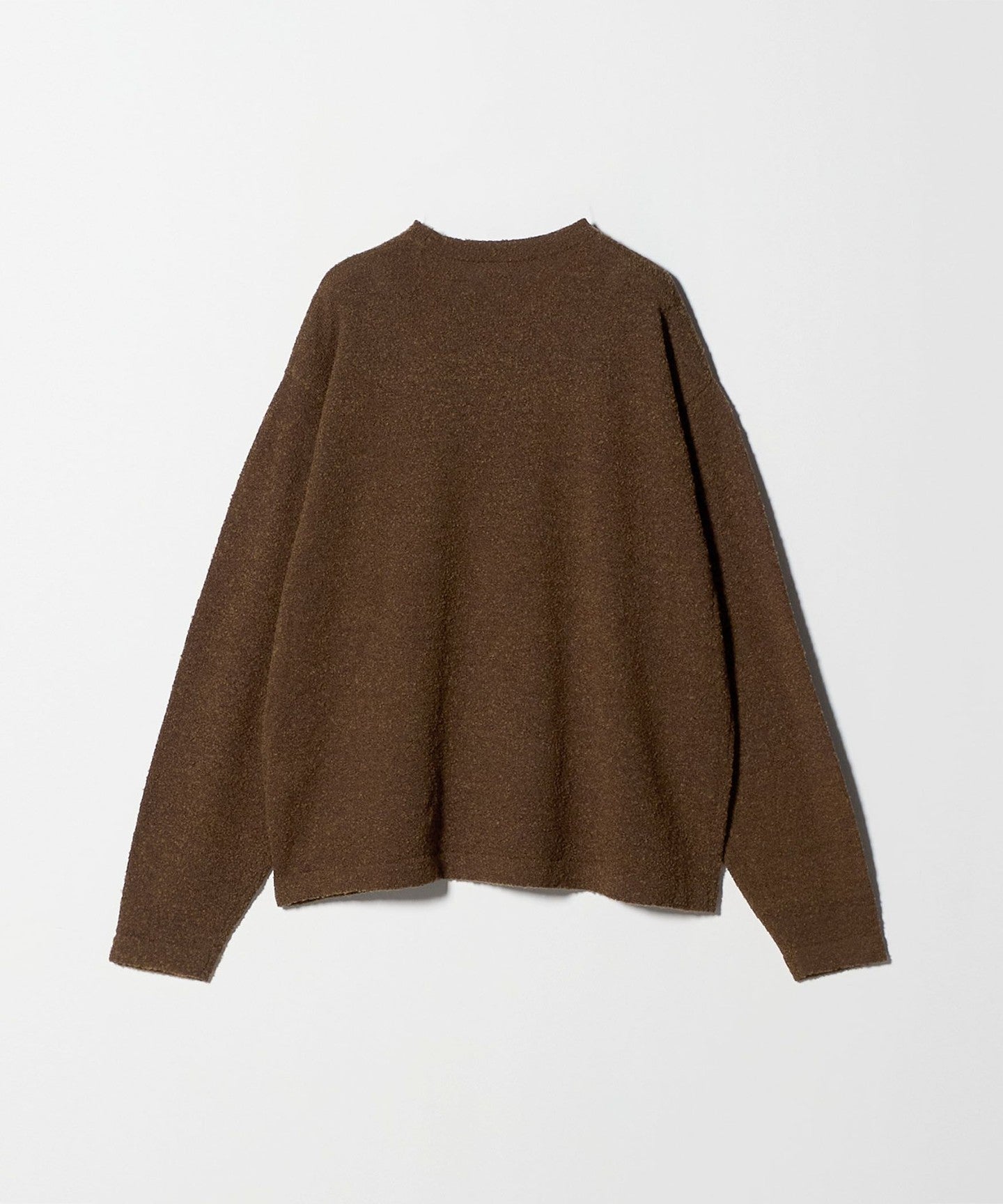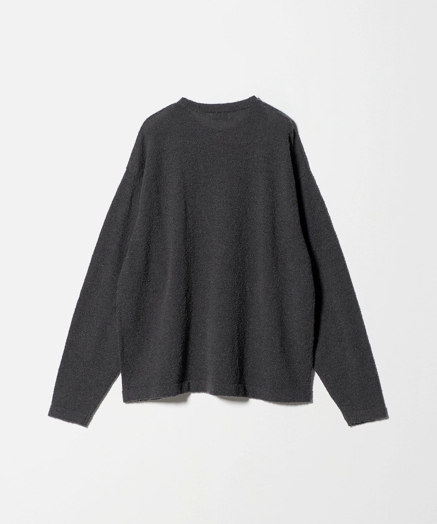 凹凸形状のある特殊な糸を使用した、ニット仕立てのロングスリーブカットソーです。ブークレを度詰めで編み上げた、表情感のあるドライな肌触りが特徴です。シルエットは、ワイドな身幅に着丈短めのクロップド丈で設定し、袖は手の甲が隠れるくらいの長めのバランスに仕上げました。固すぎない生地感で身体を通すと独特の揺れ感が生まれ、リラックス感のある衿ぐりが力の抜けた着こなしを演出。きれいめなスラックスや合繊素材のボトムと相性がよく、肩肘張らない大人のアーバンスタイルへと導きます。