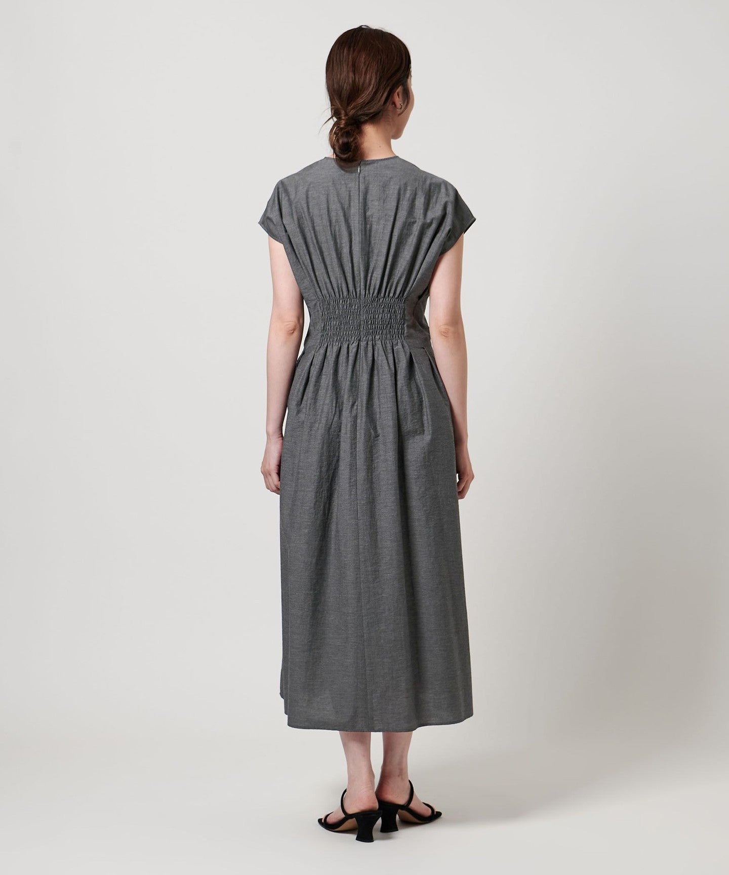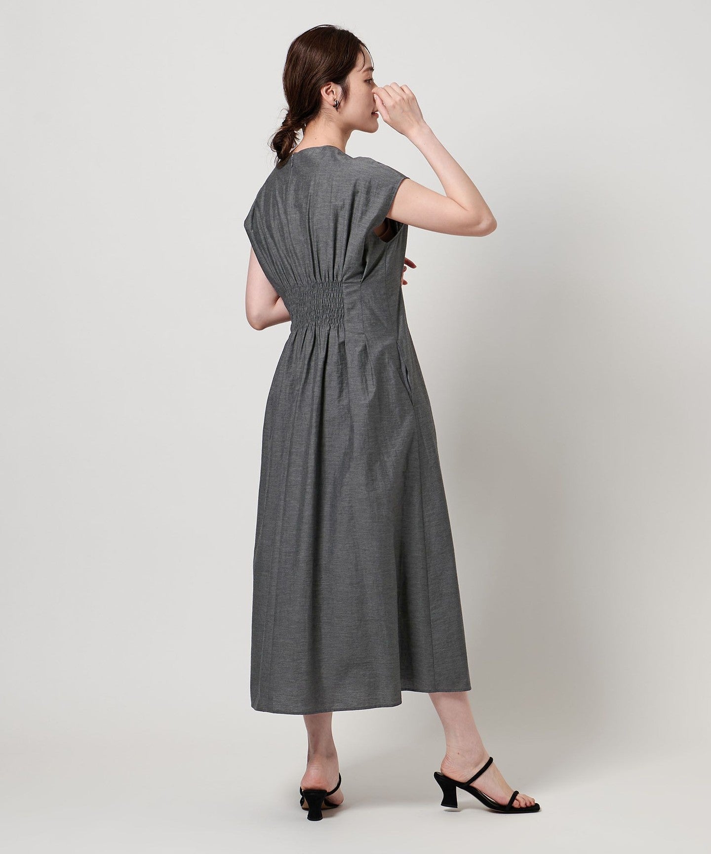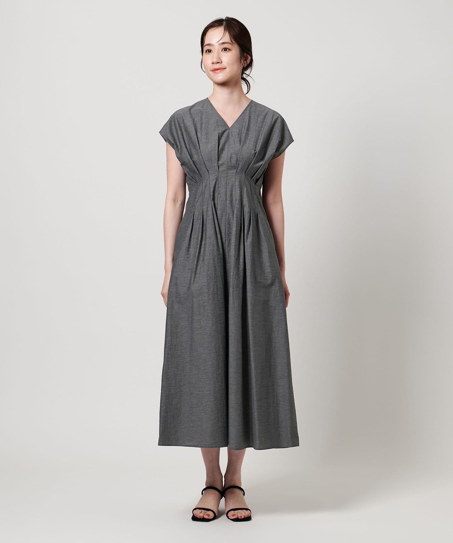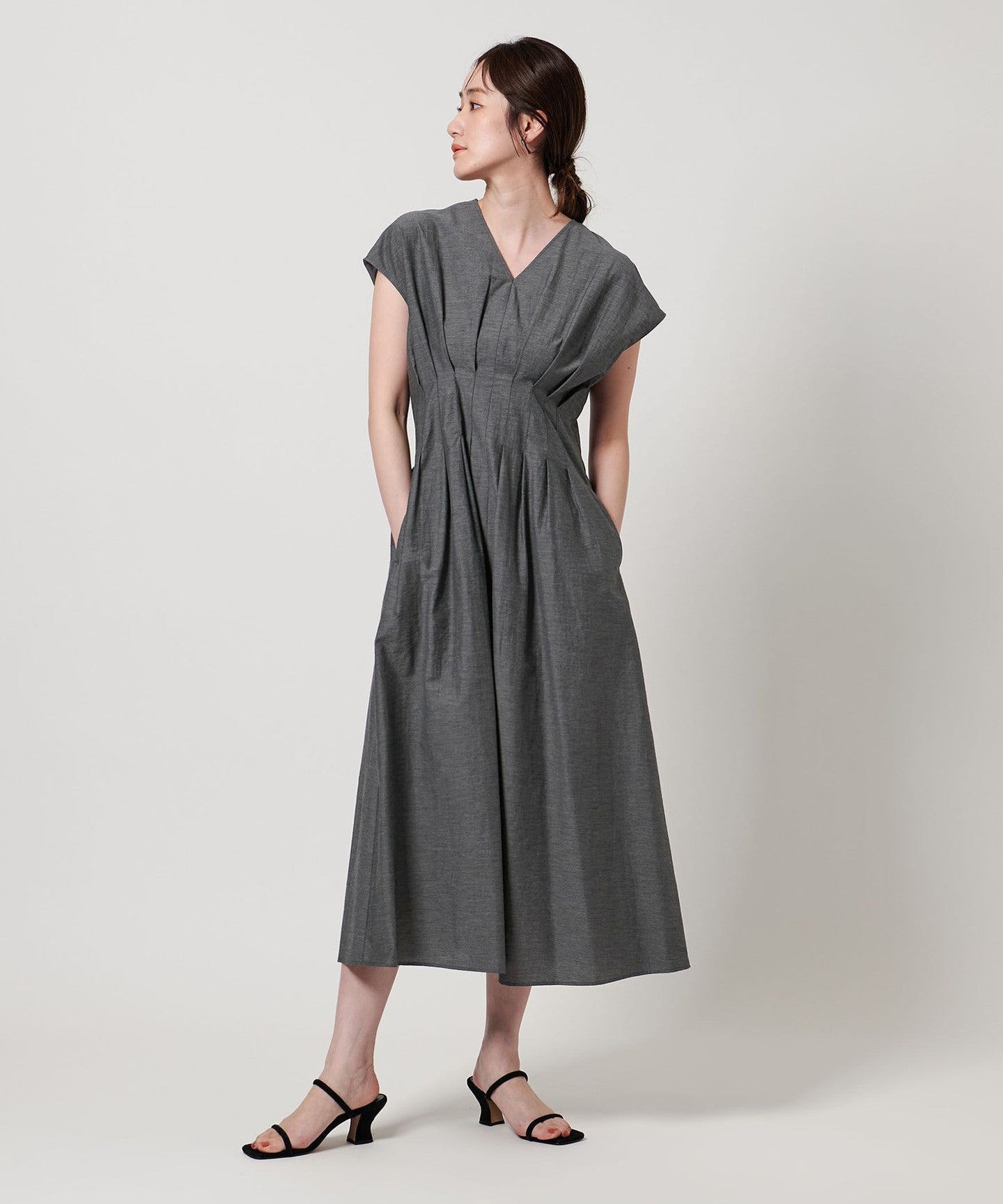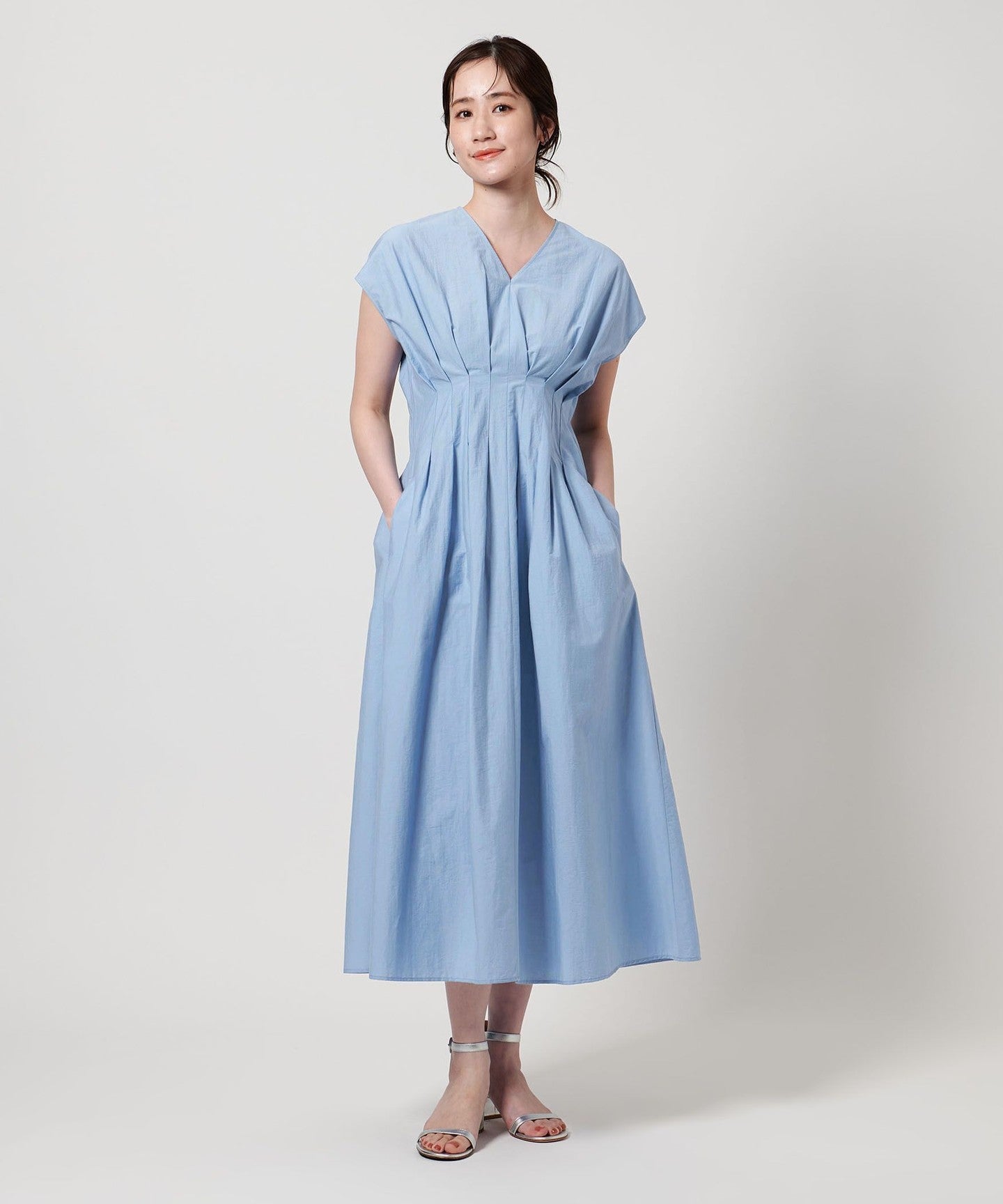 The waist is tightened with design tucks and the design widens slightly towards the hem.