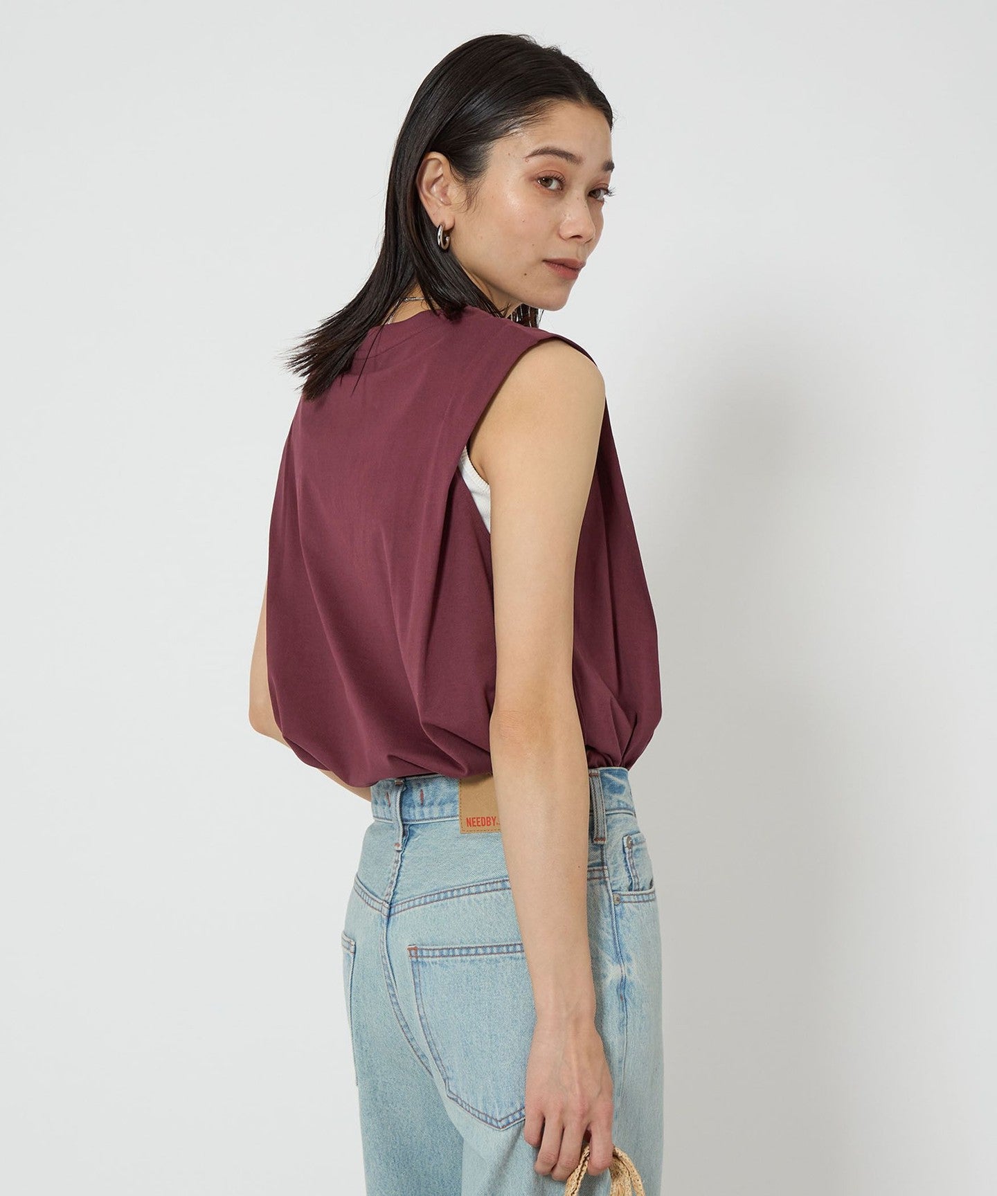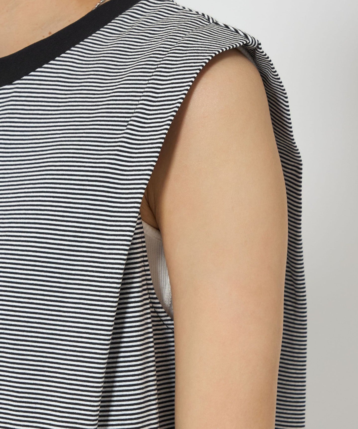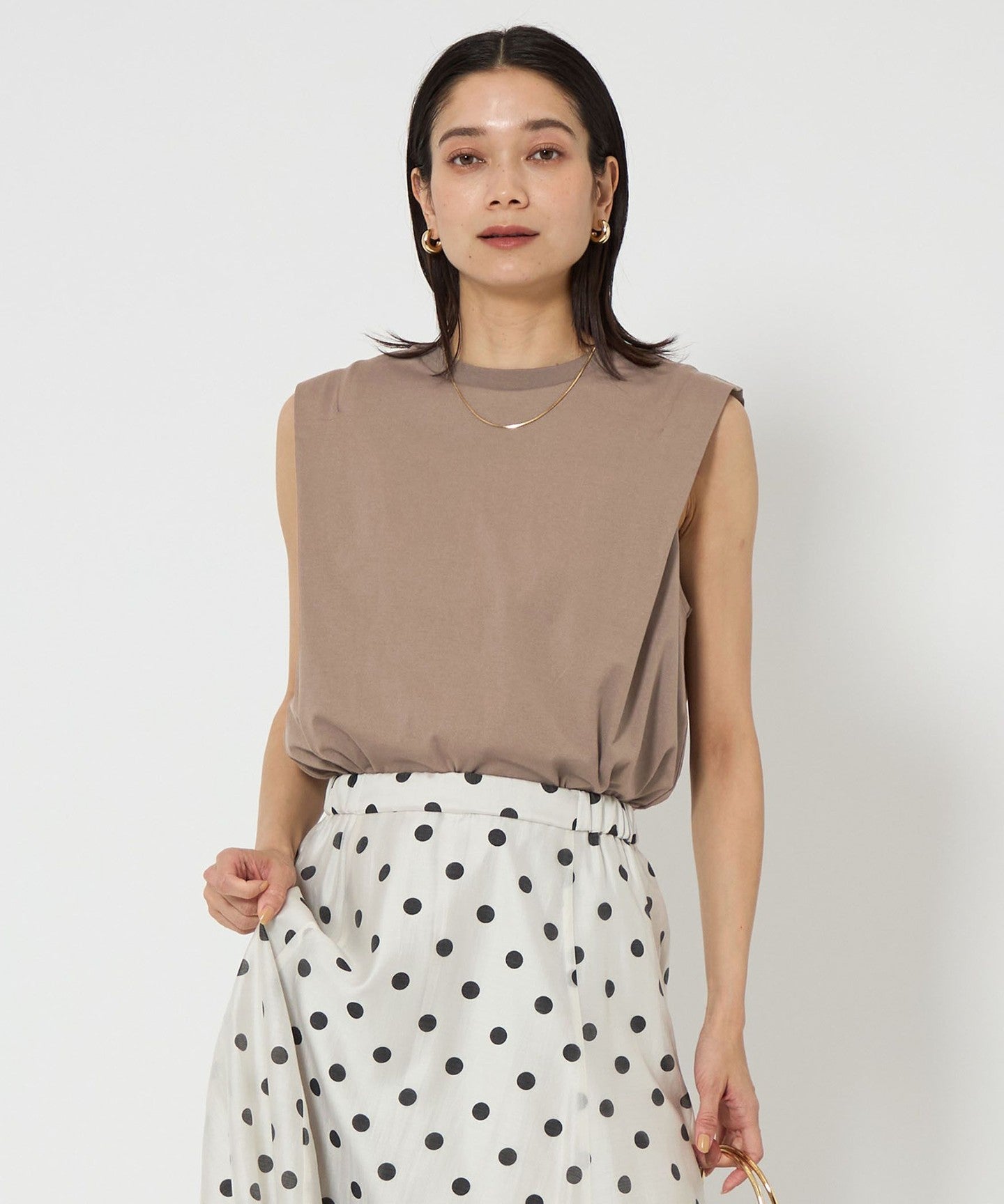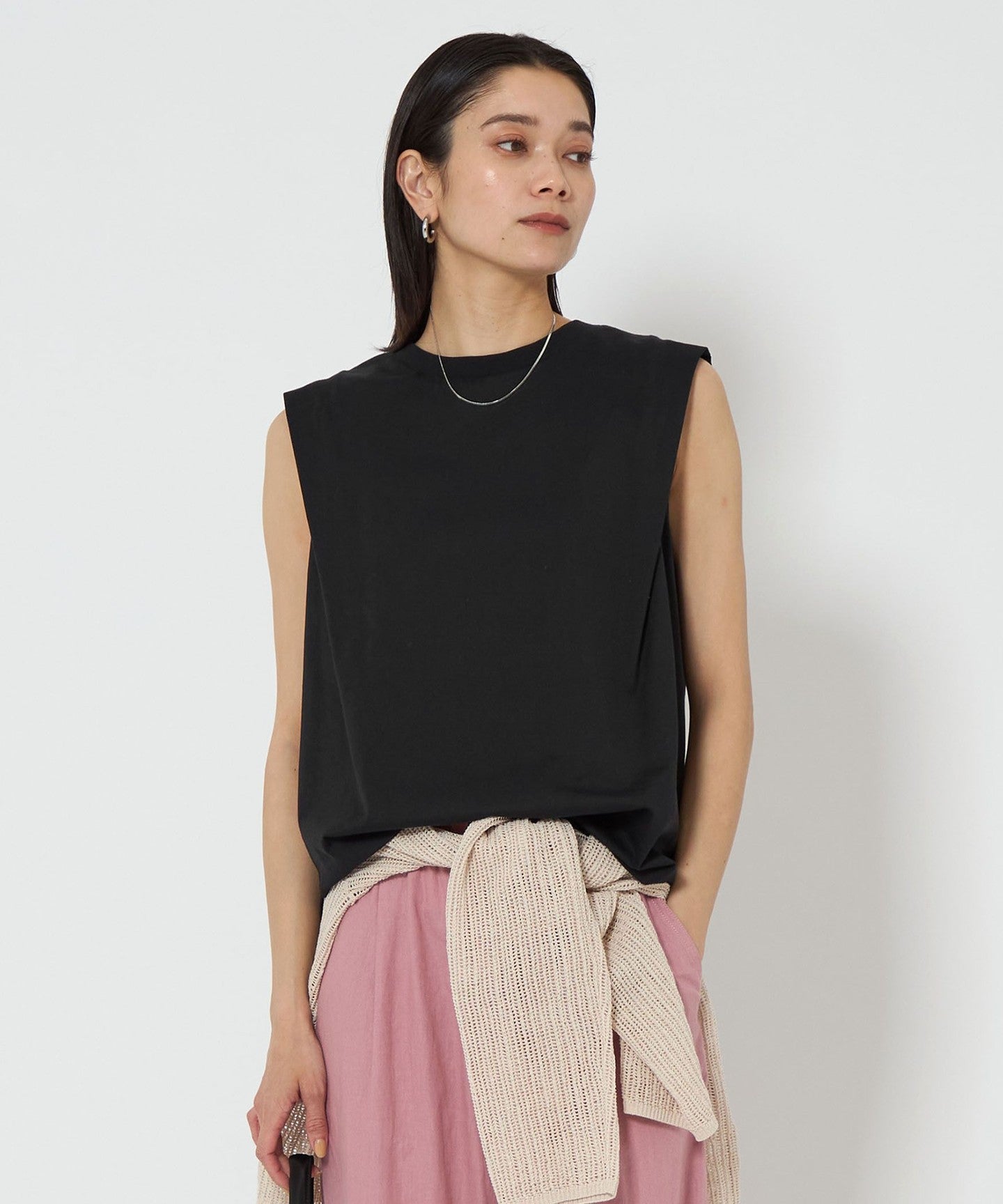 A sleeveless T-shirt with a tuck design on the shoulders.