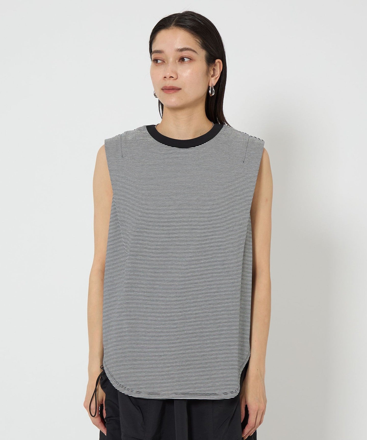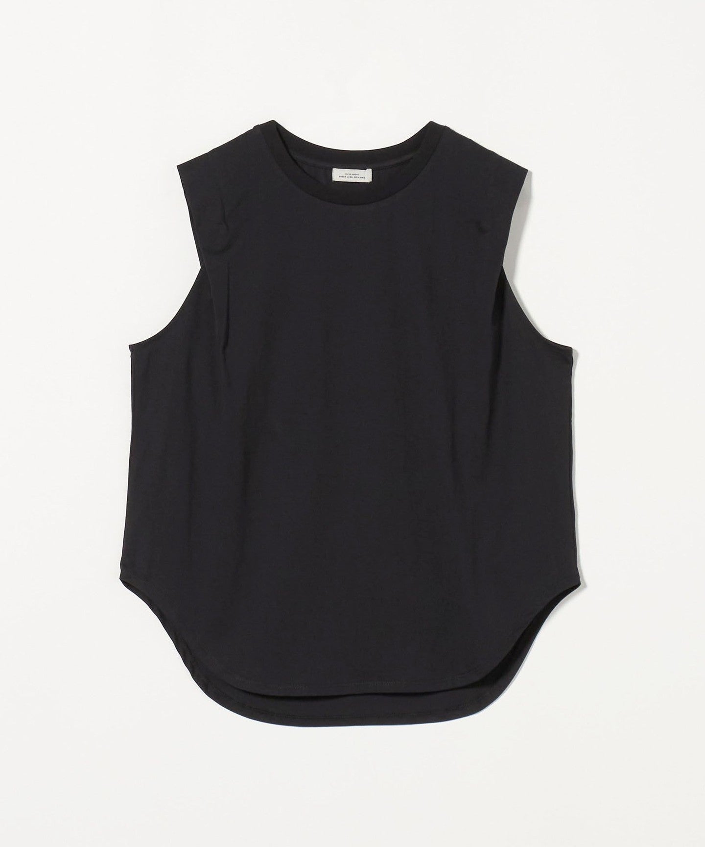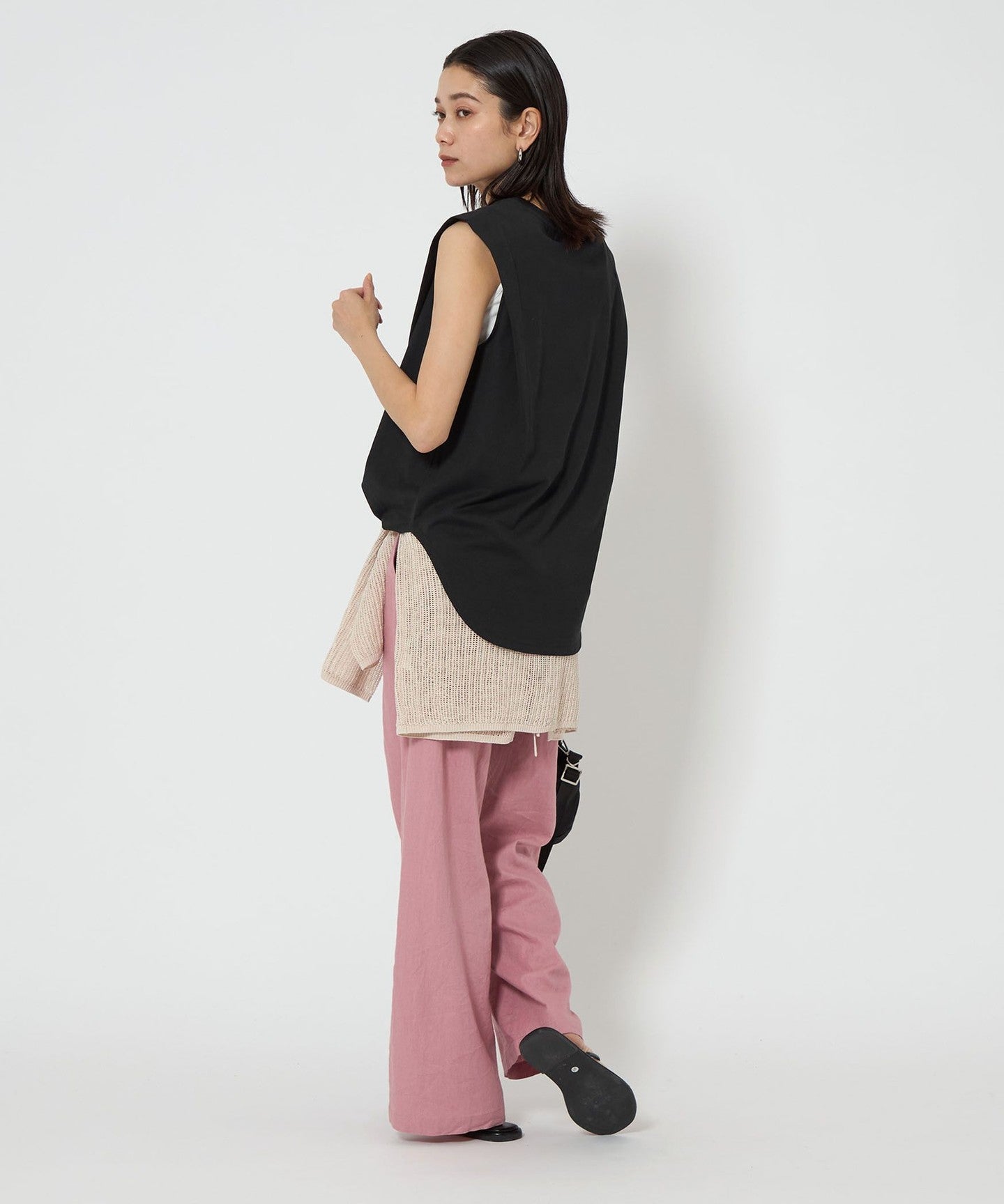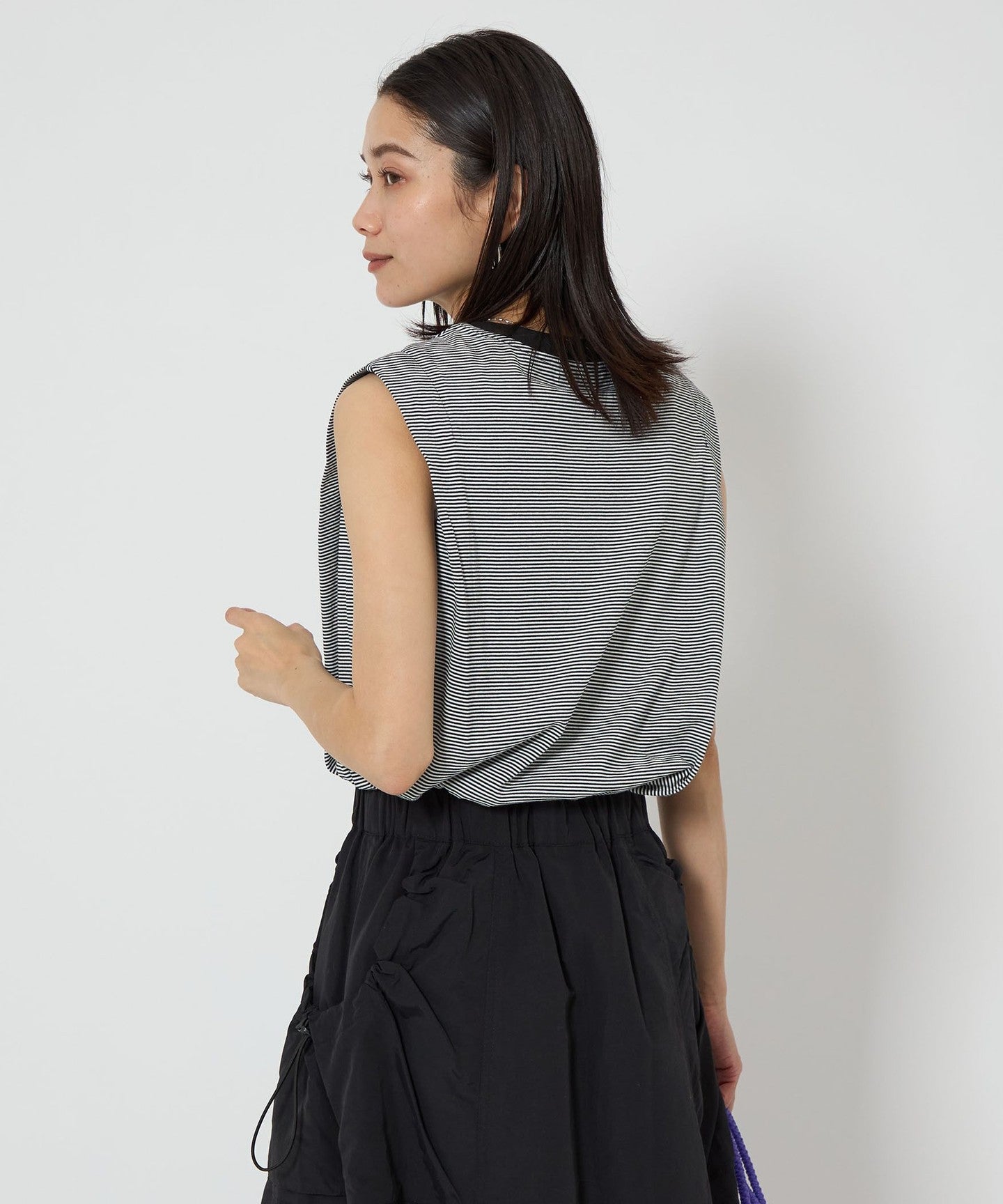 A sleeveless T-shirt with a tuck design on the shoulders.