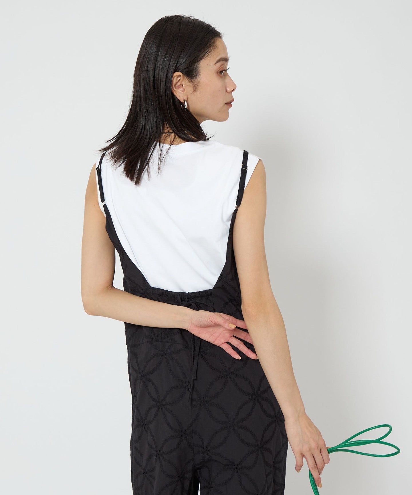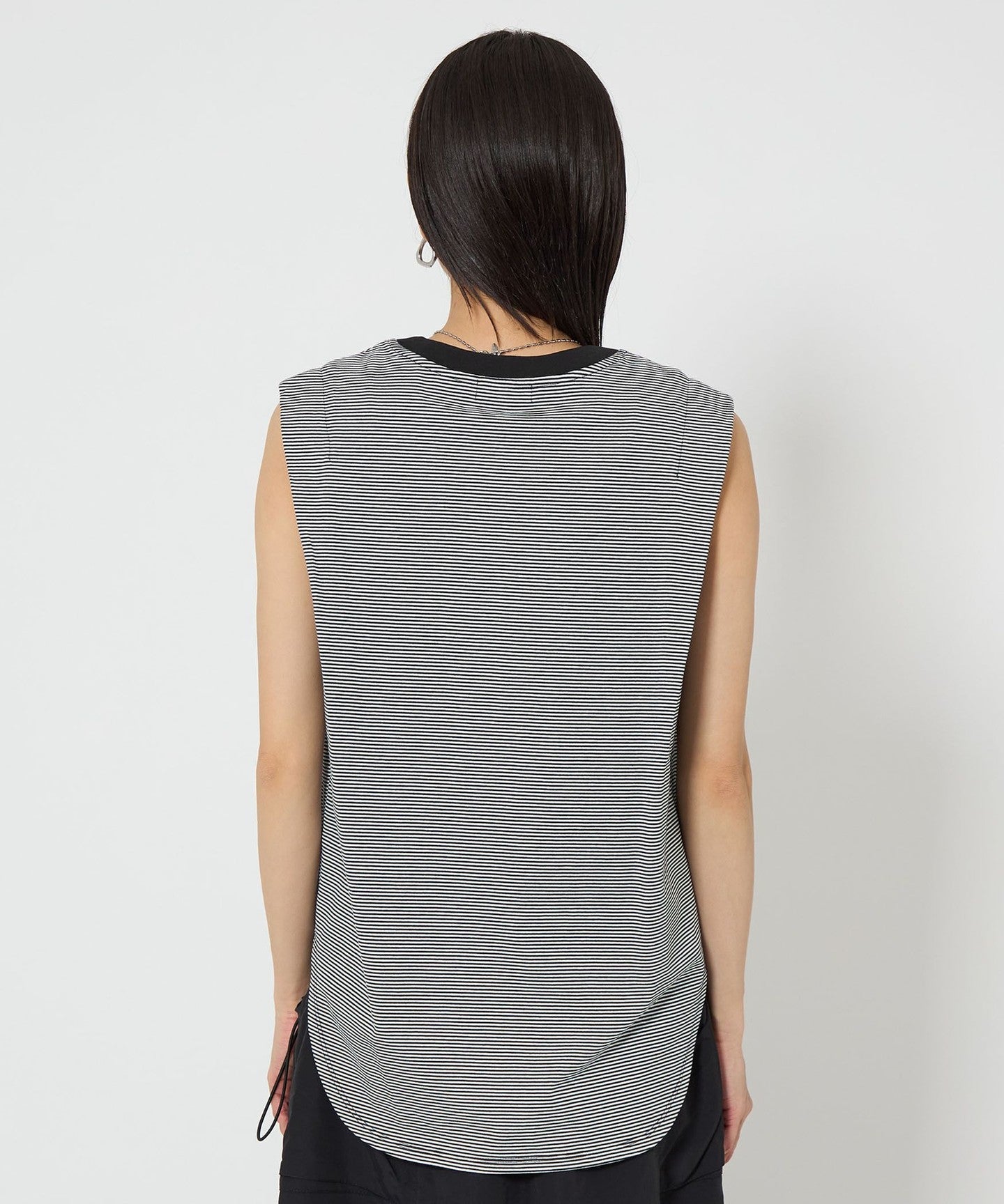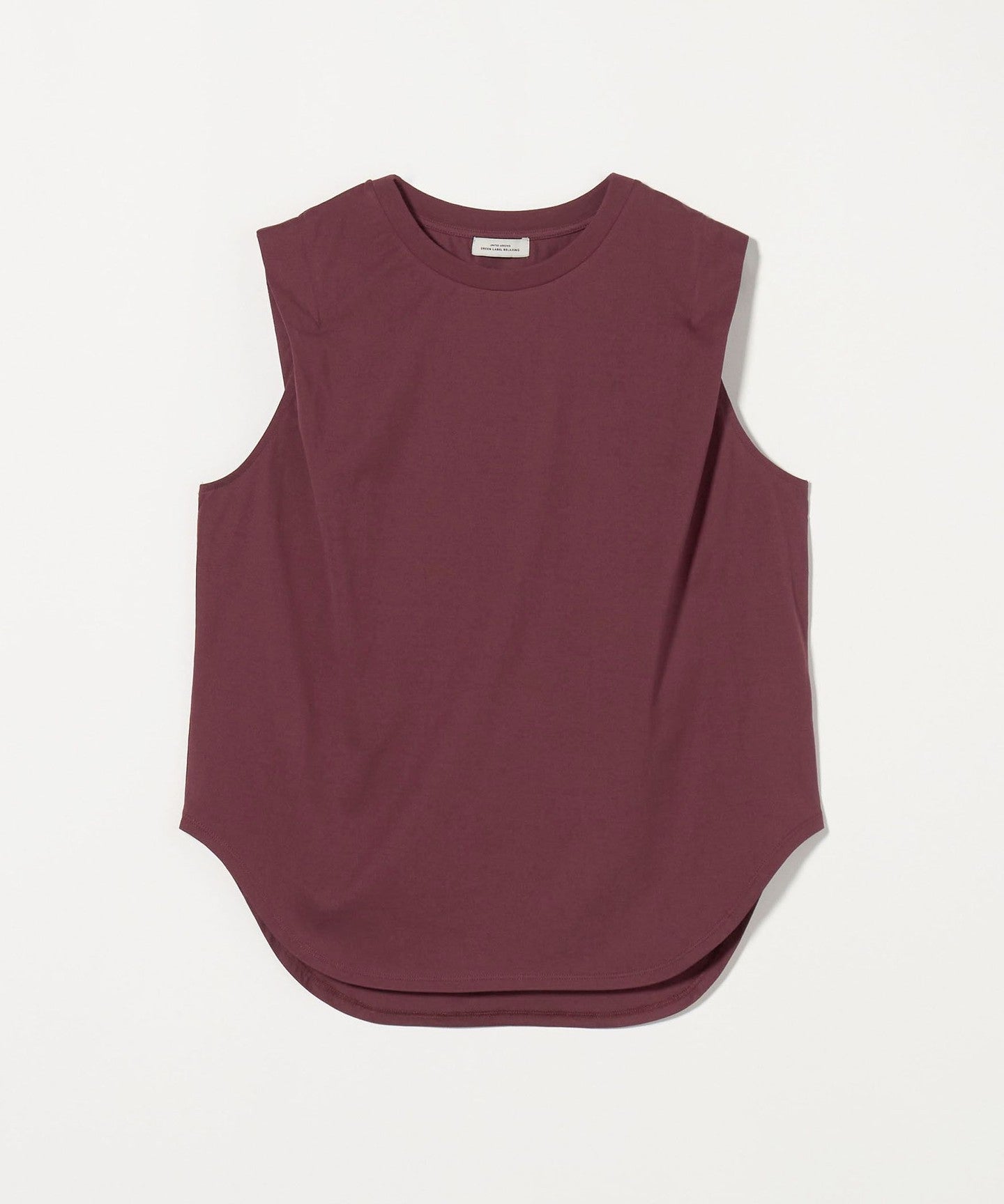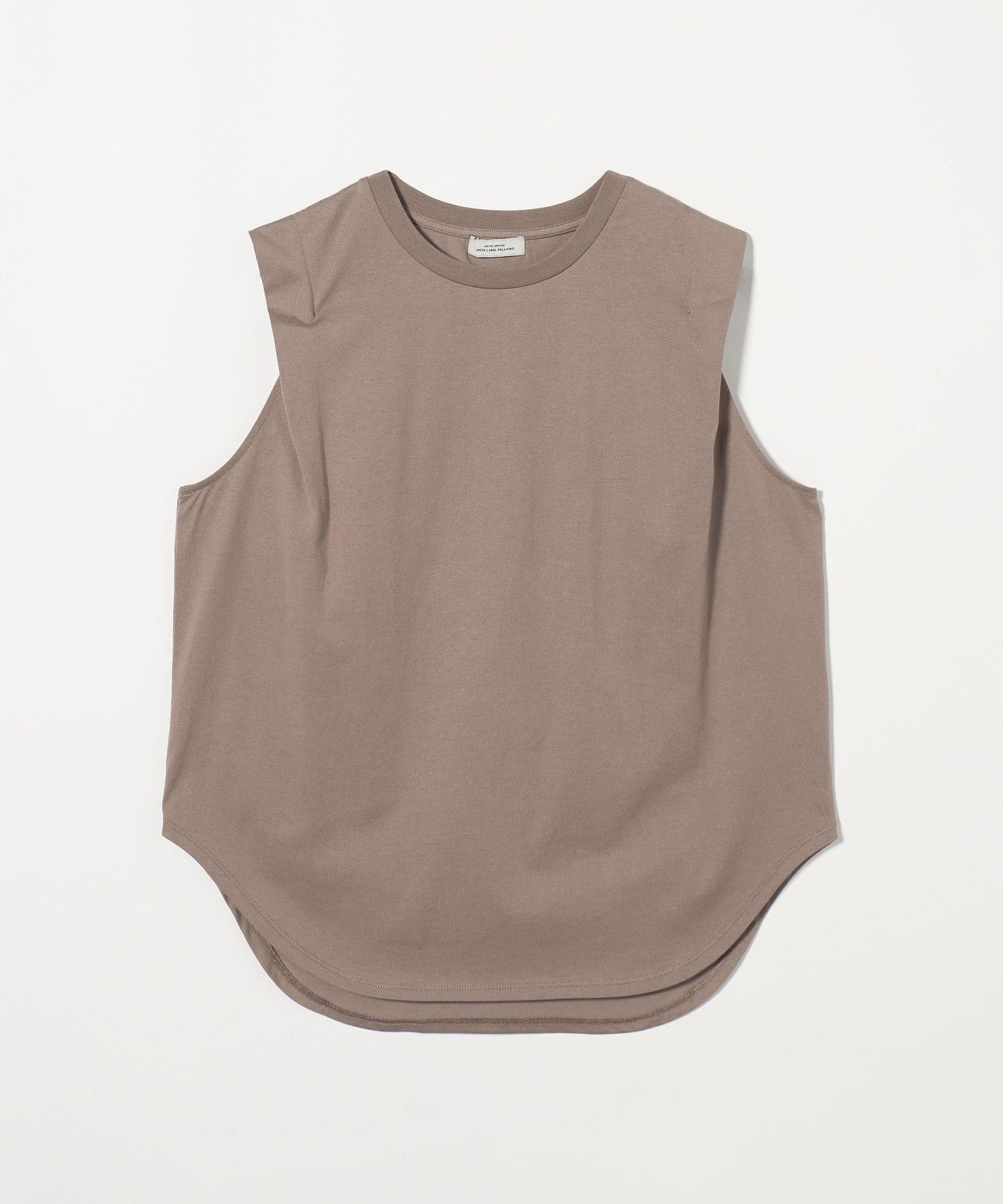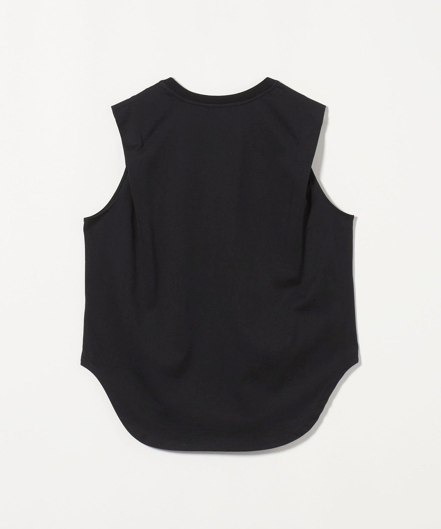 A sleeveless T-shirt with a tuck design on the shoulders.